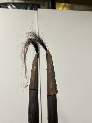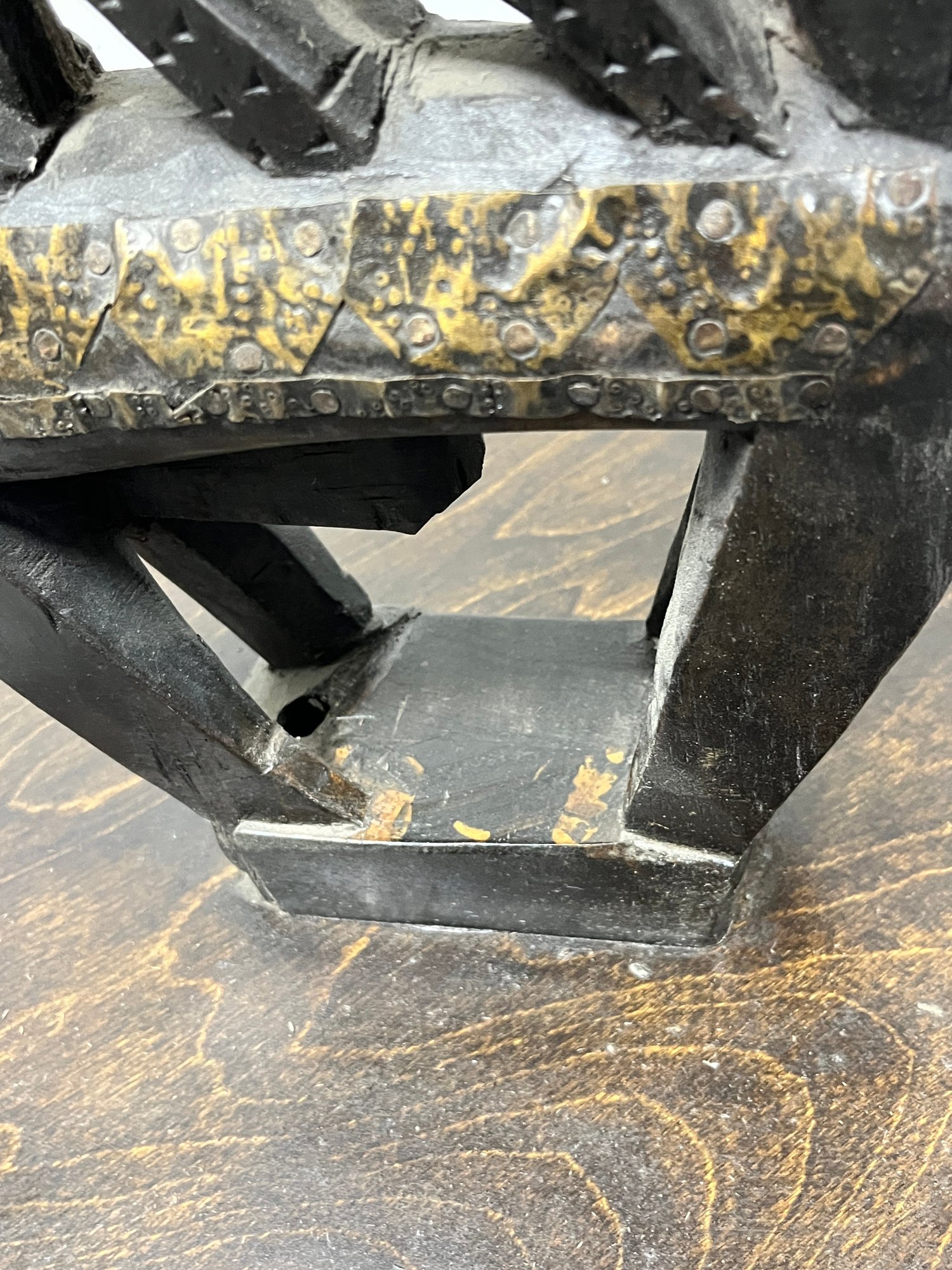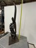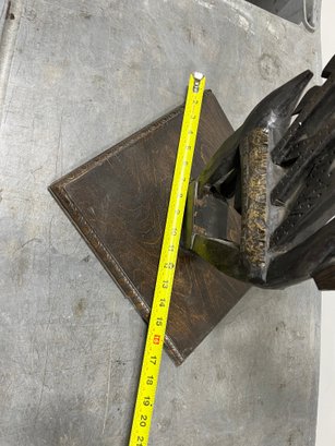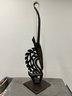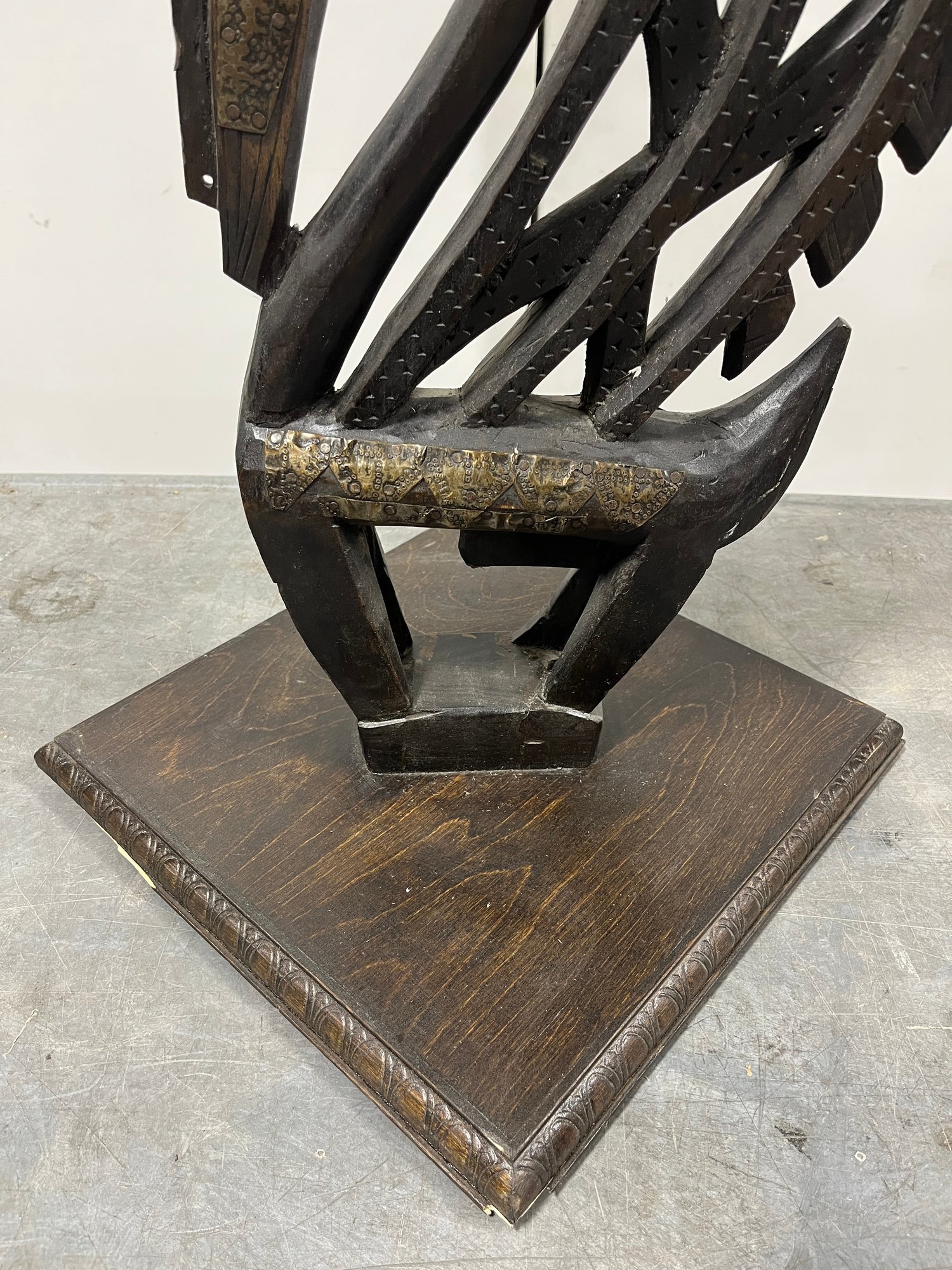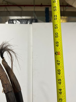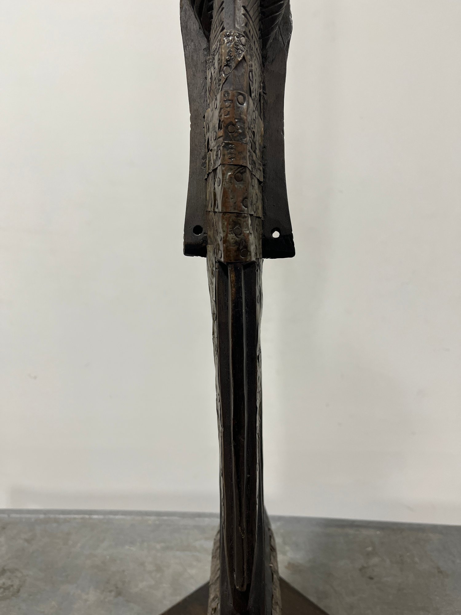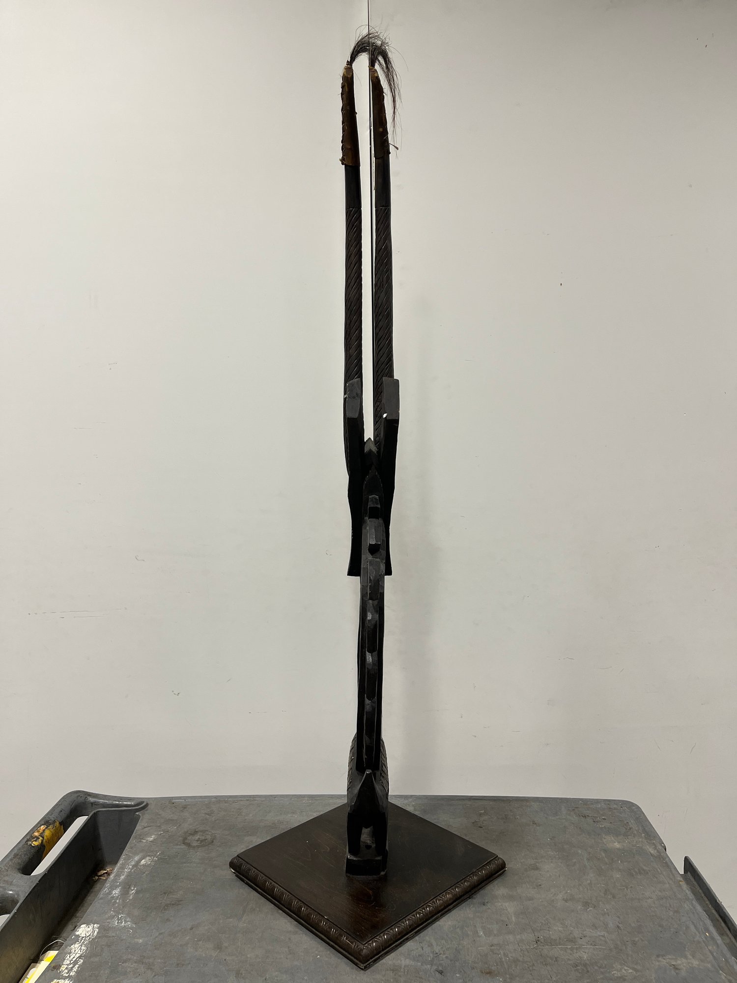 This striking vertical-style scultpure represents the mythical male antelope, Ci Wara. The figure is characterized by its elegant, elongated silhouette and rhythmic negative space. In Bamana culture, the Ci Wara is a "culture hero" who taught humanity the secrets of agriculture.