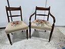 Regency Mahogany Chairs with figured paneled top rail above rope-twist horizontal splat, on ring turned tapered legs. Seats are hand embroidered