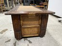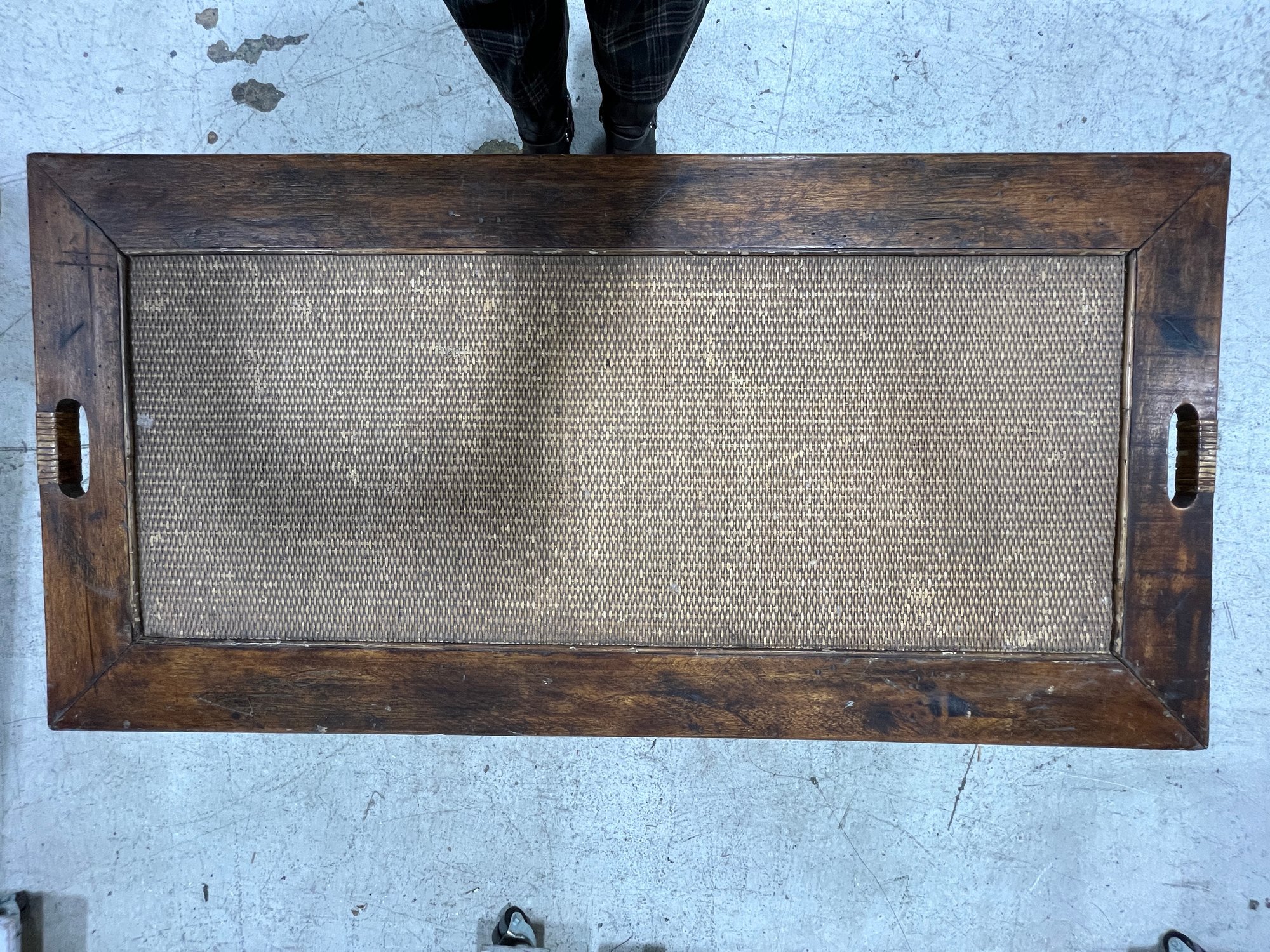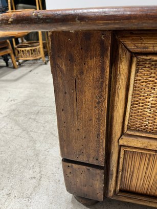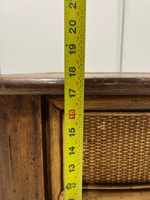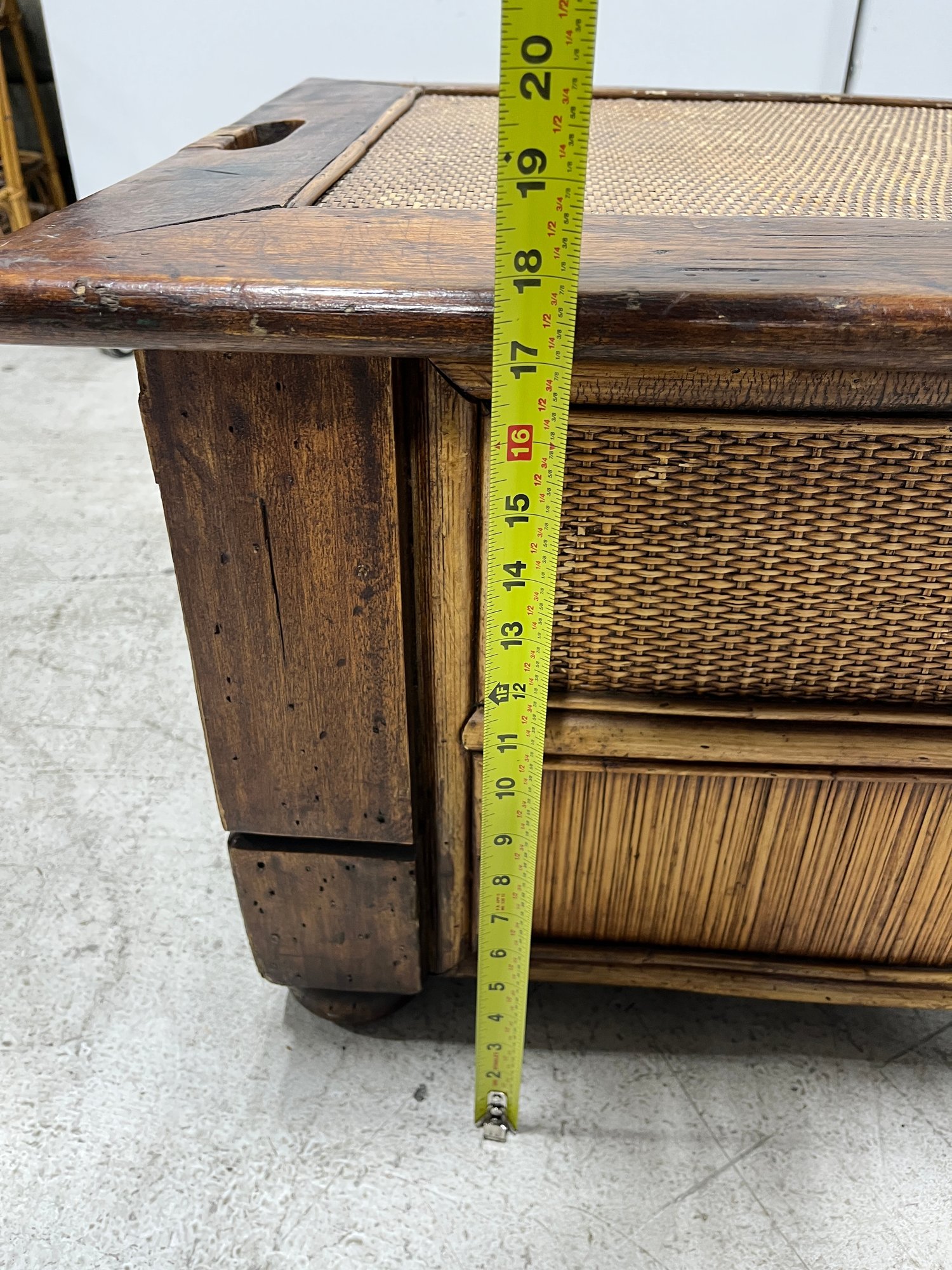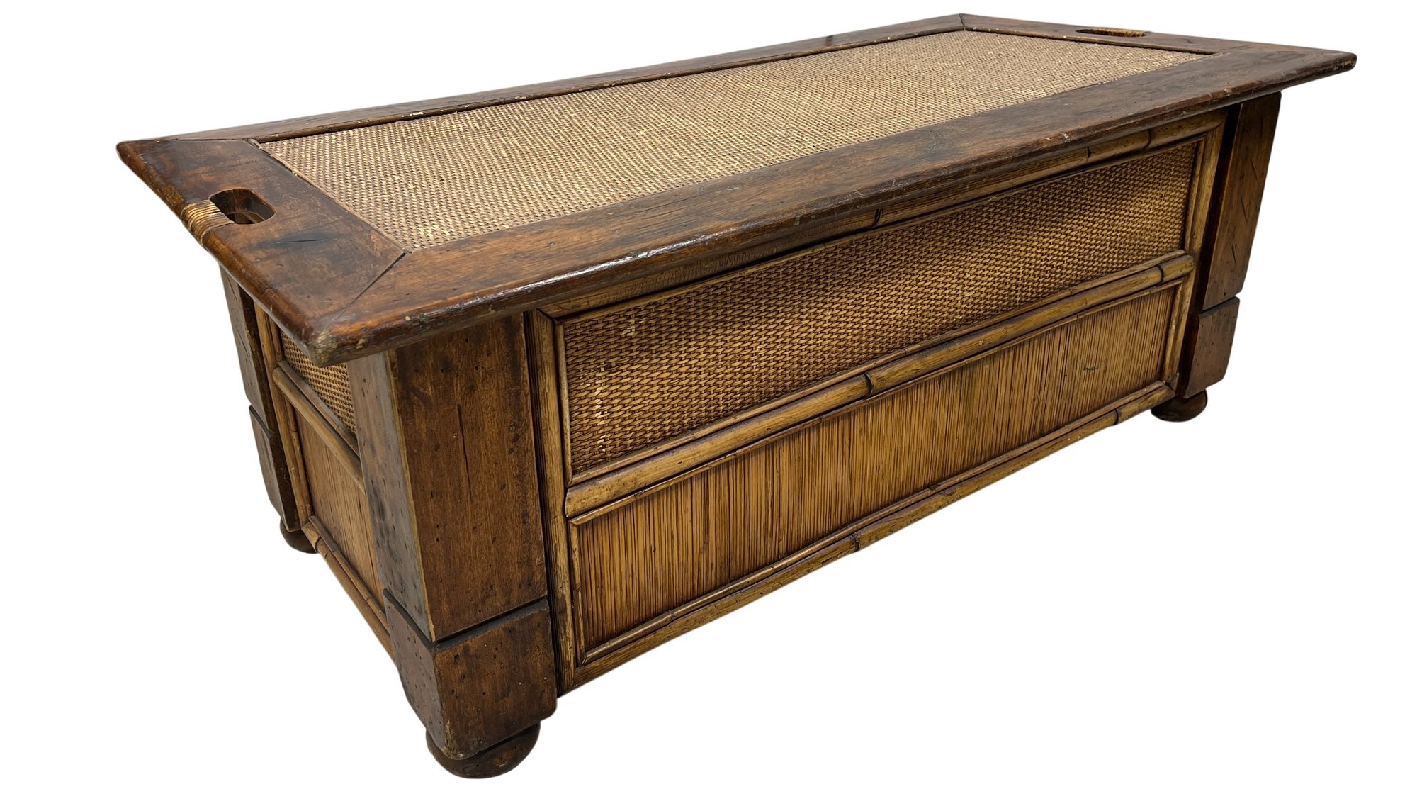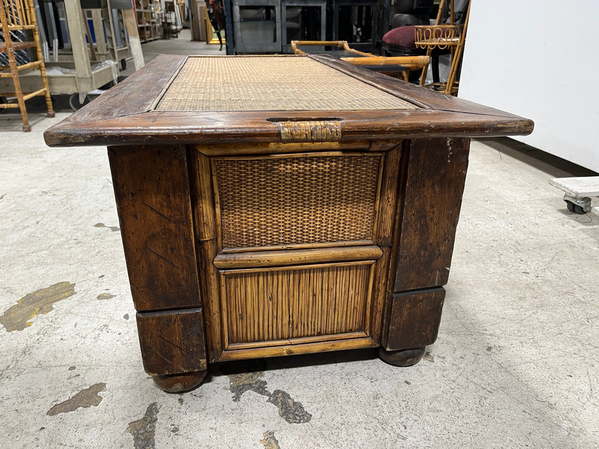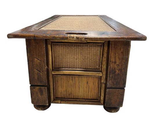 Exuding a refined, global aesthetic, this substantial storage trunk blends organic textures with classic furniture silhouettes. Its versatile design allows it to serve as a distinctive blanket chest at the foot of a bed or a rustic cocktail table in a curated living space.