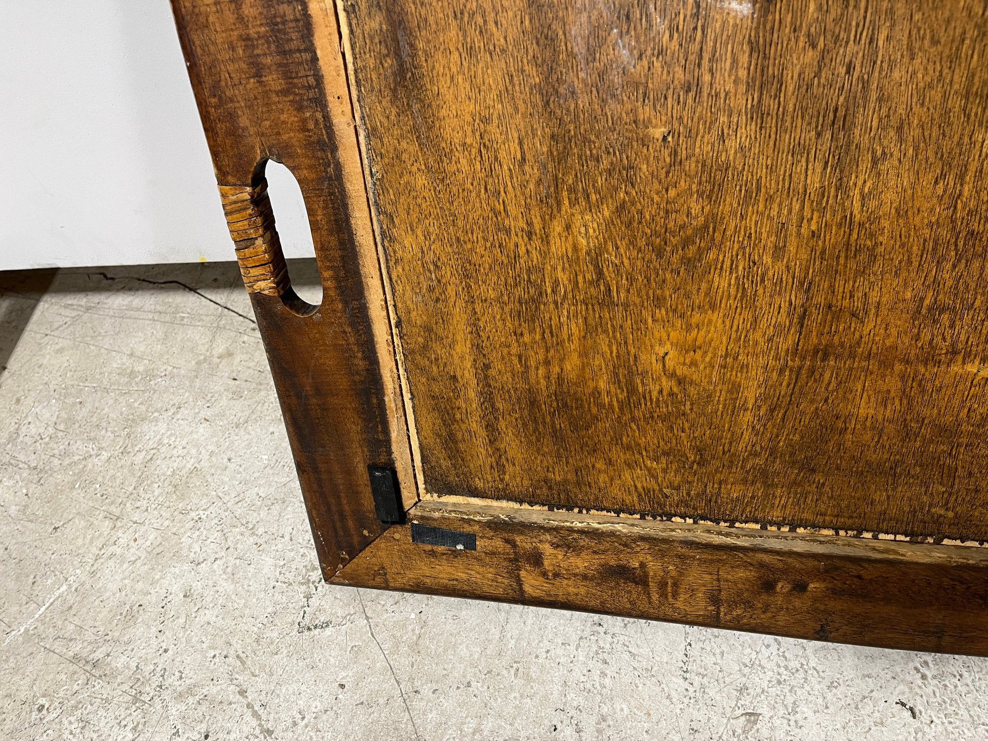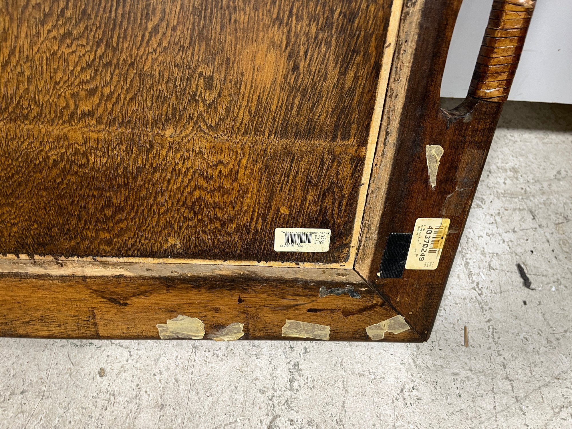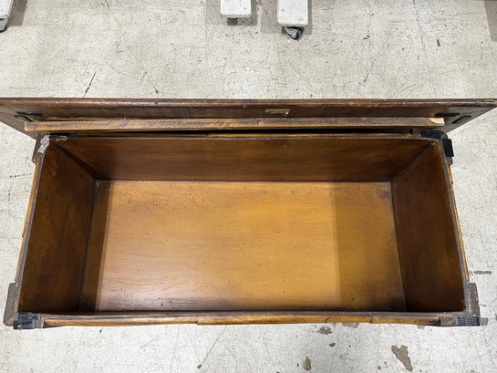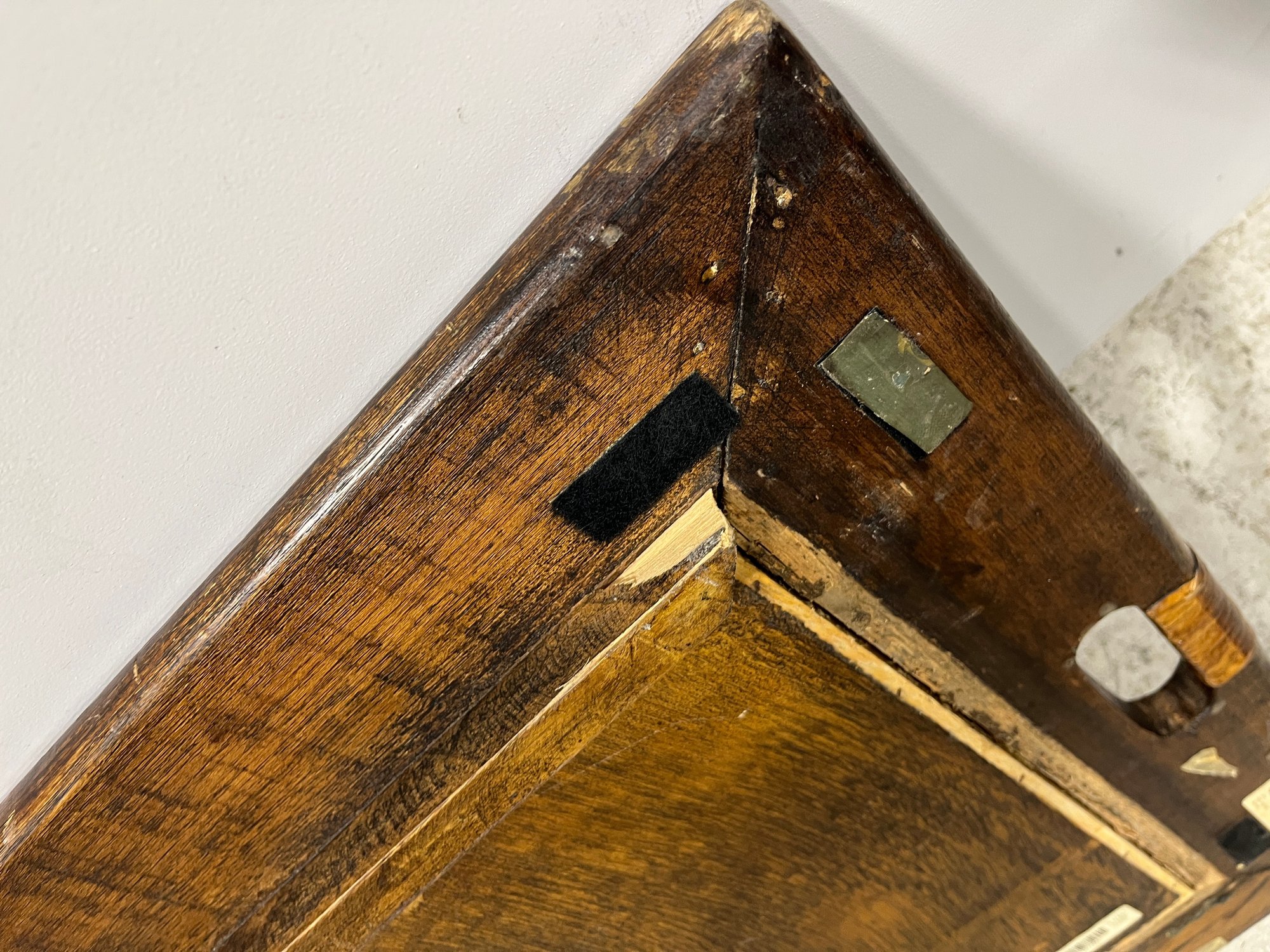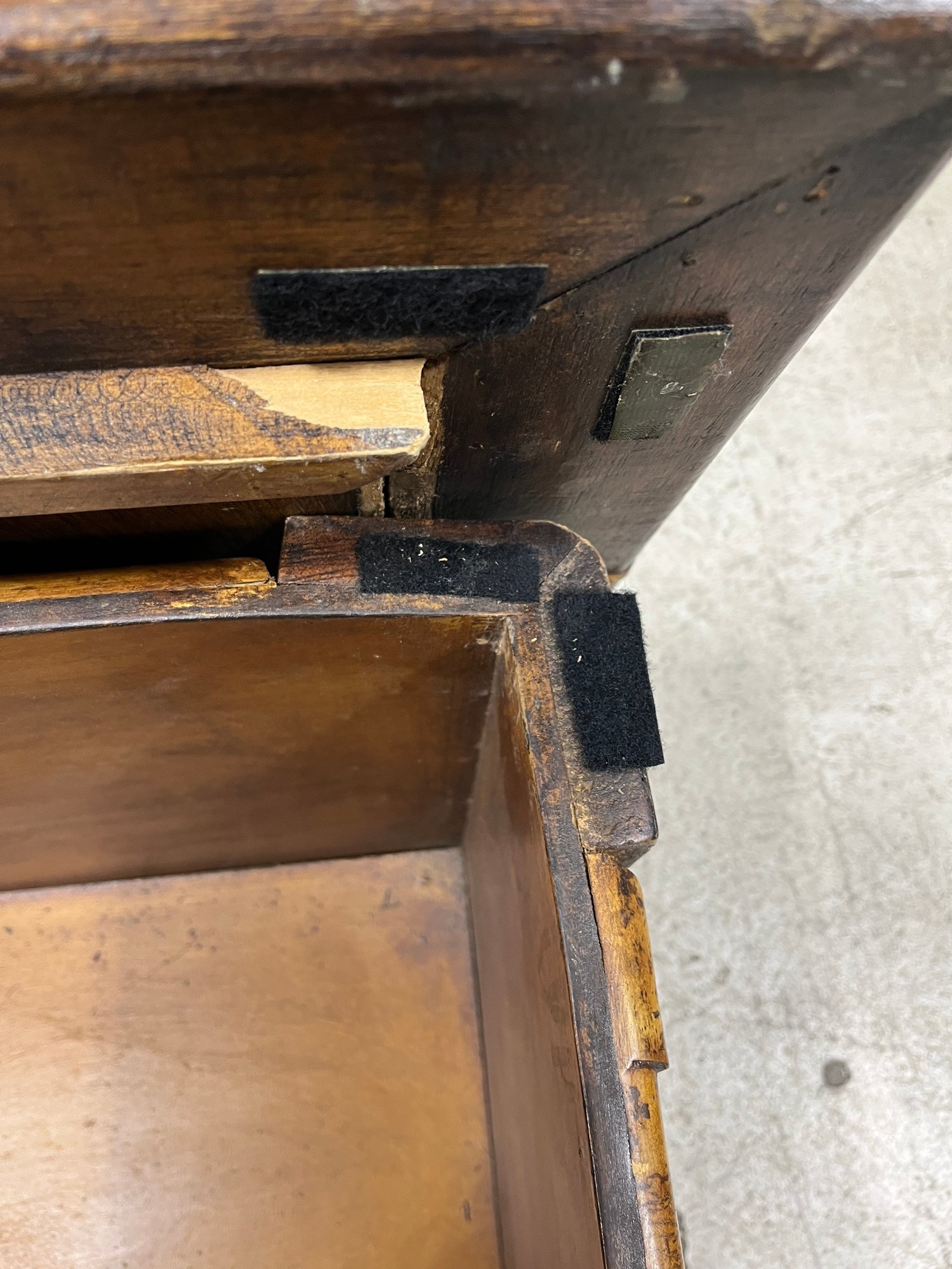Please note, there are Velcro strips attacked to all corners of both the trunk and lid. The inside portion of the wooden lip on the lid is slightly lifting off.
