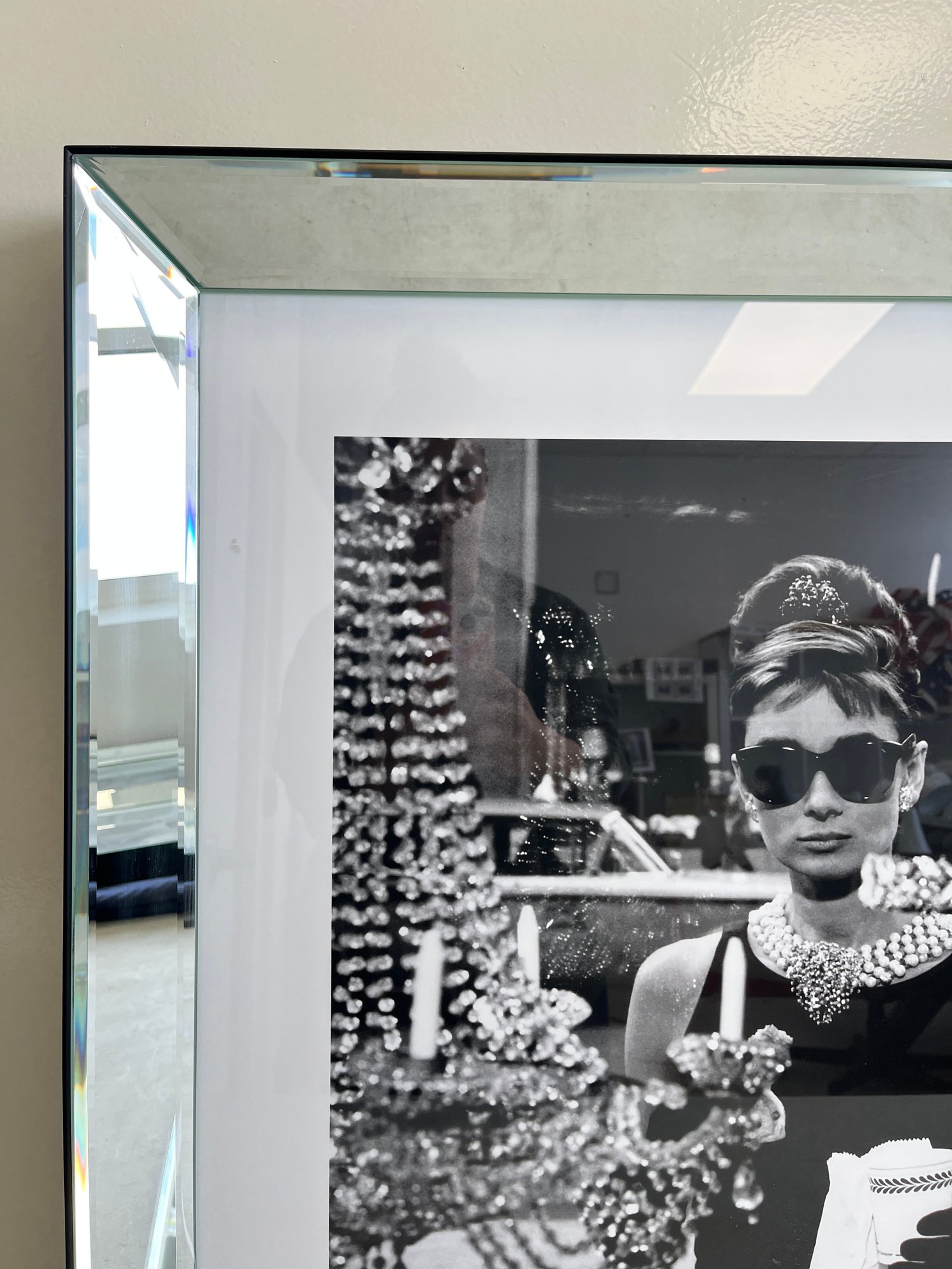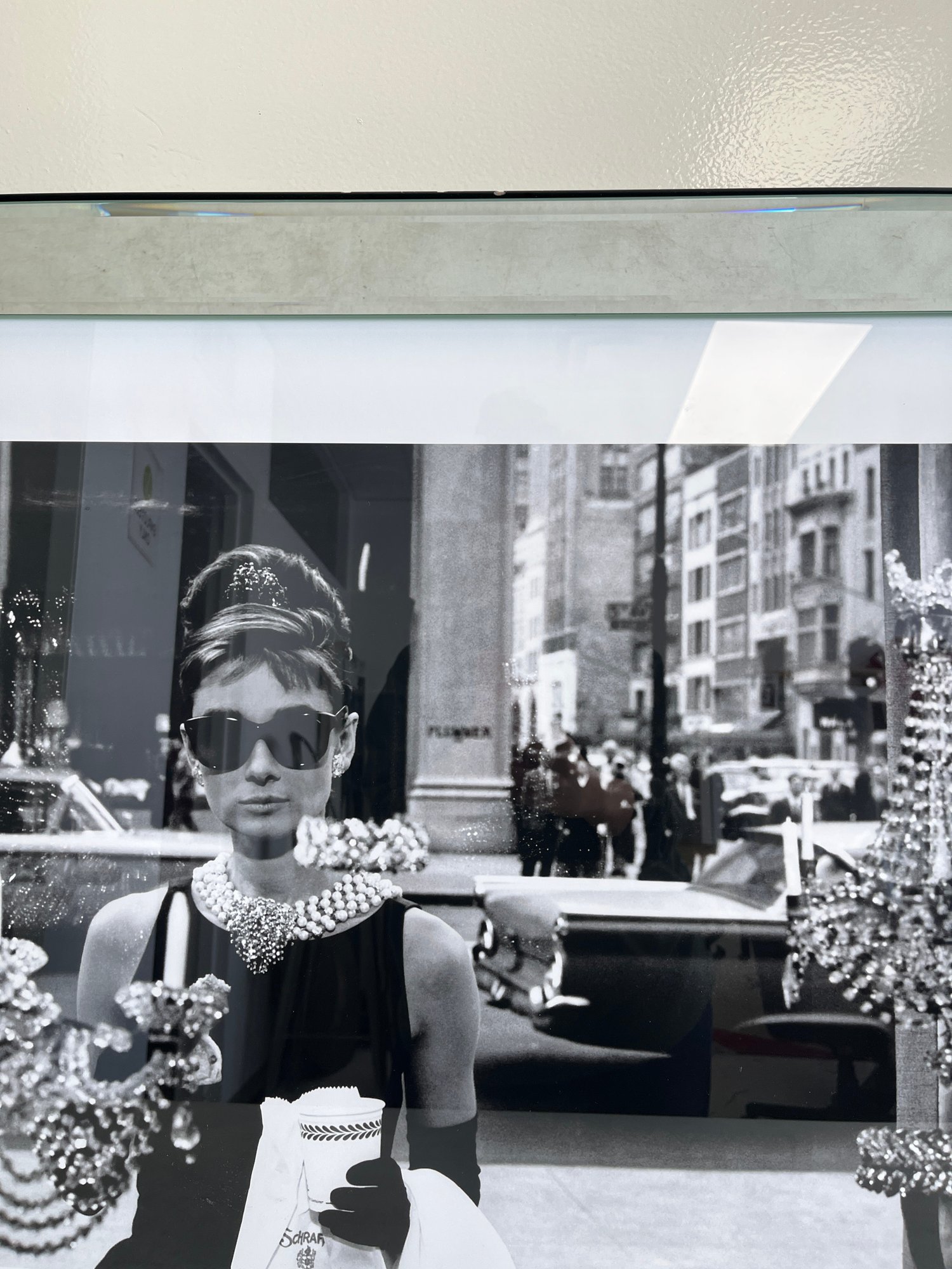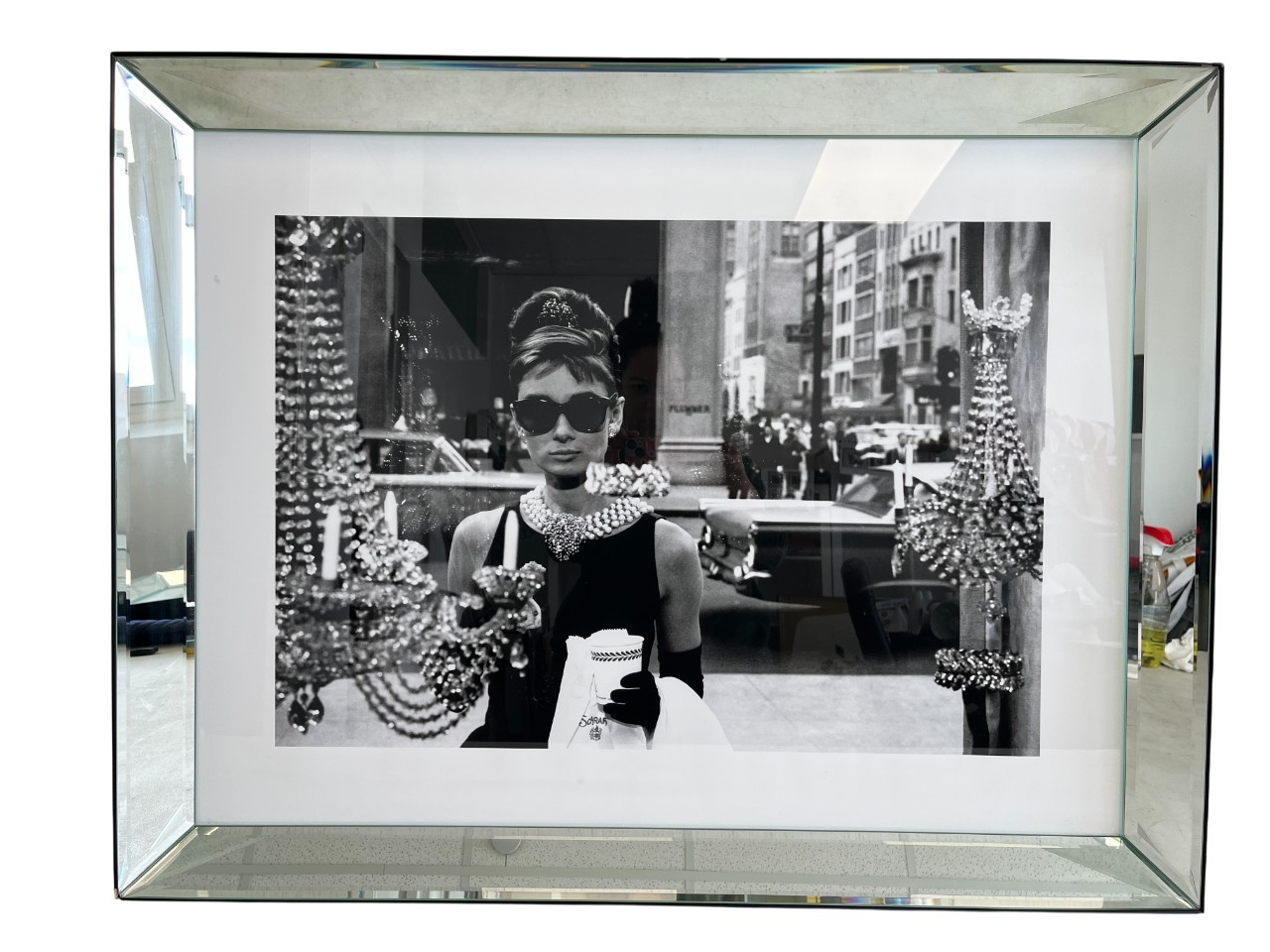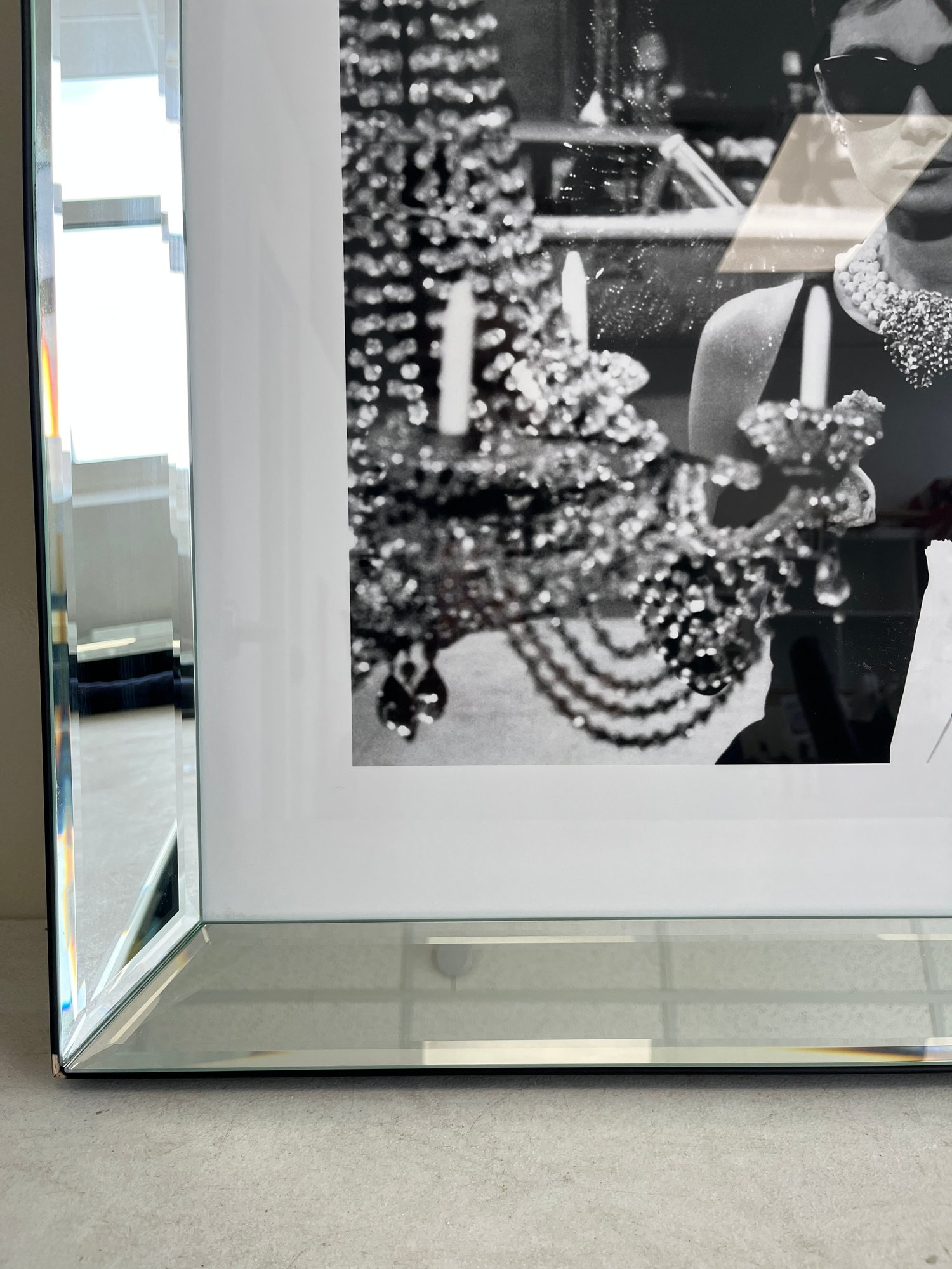 This iconic piece from the Brookpace Lascelles Manhattan Collection features the timeless image "Breakfast at Tiffany's," capturing Audrey Hepburn in her career-defining role as Holly Golightly in the 1961 film Breakfast at Tiffany's. This high-quality black-and-white print is set against a crisp white conservation mount, emphasizing the cinematic contrast of the scene. The artwork is housed in a luxury frame, characterized by an elegant beveled mirrored glass. This sophisticated combination of Hollywood glamour and contemporary craftsmanship creates a striking, light-reflecting statement piece perfect for high-end residential or commercial interiors.