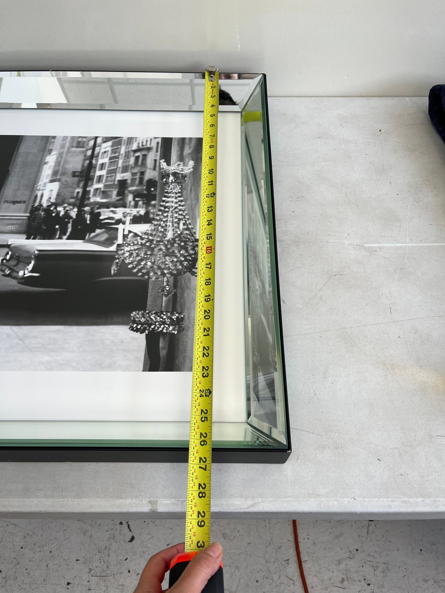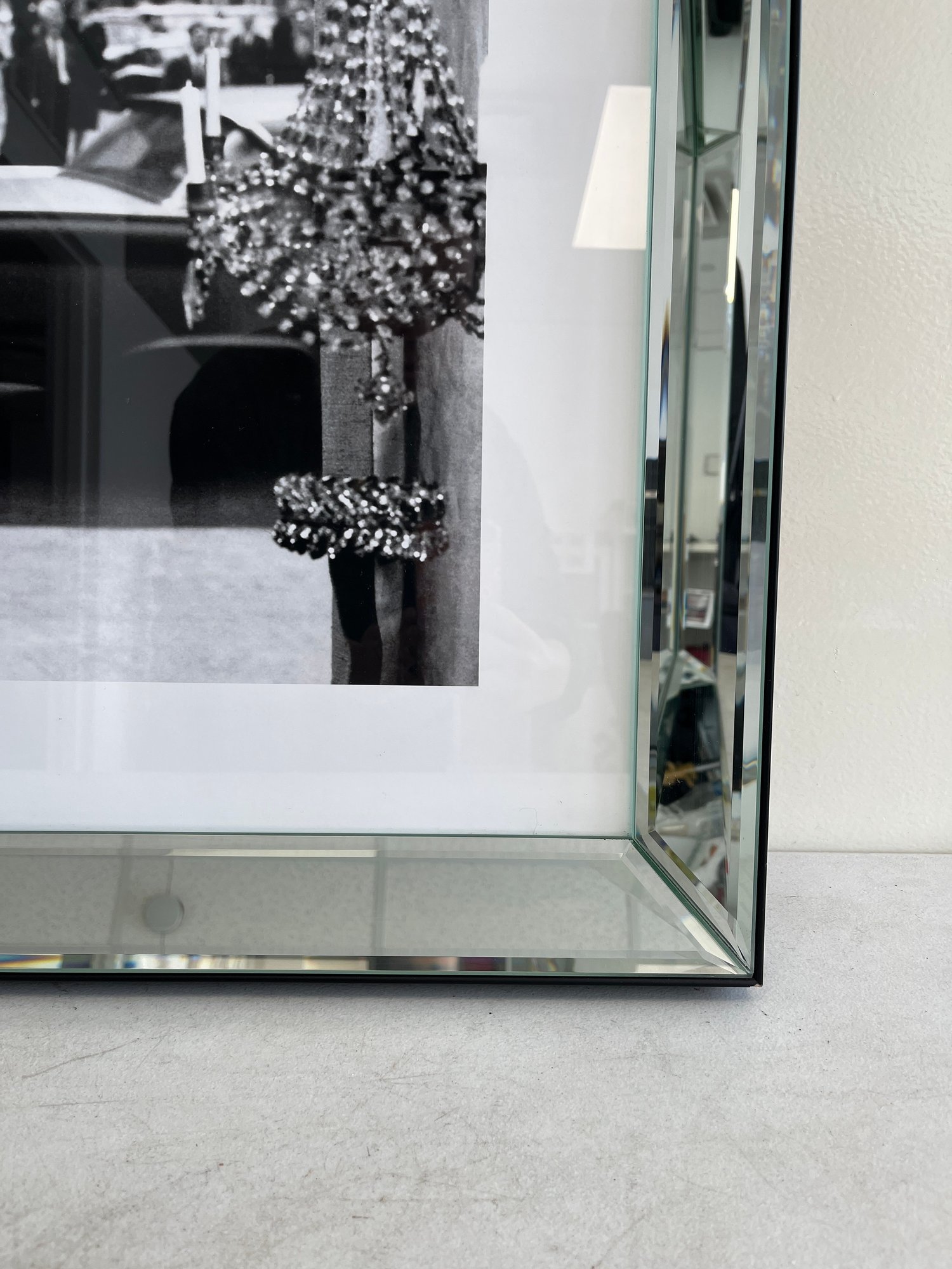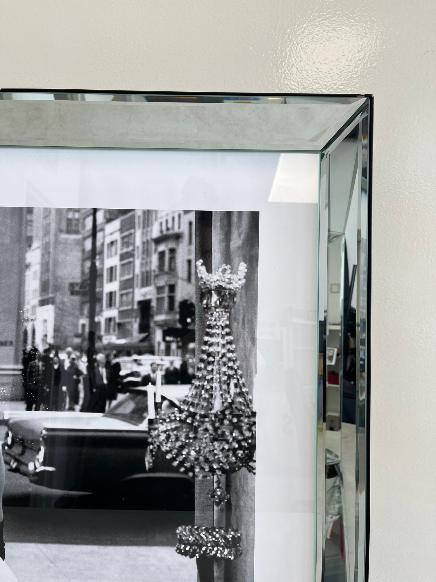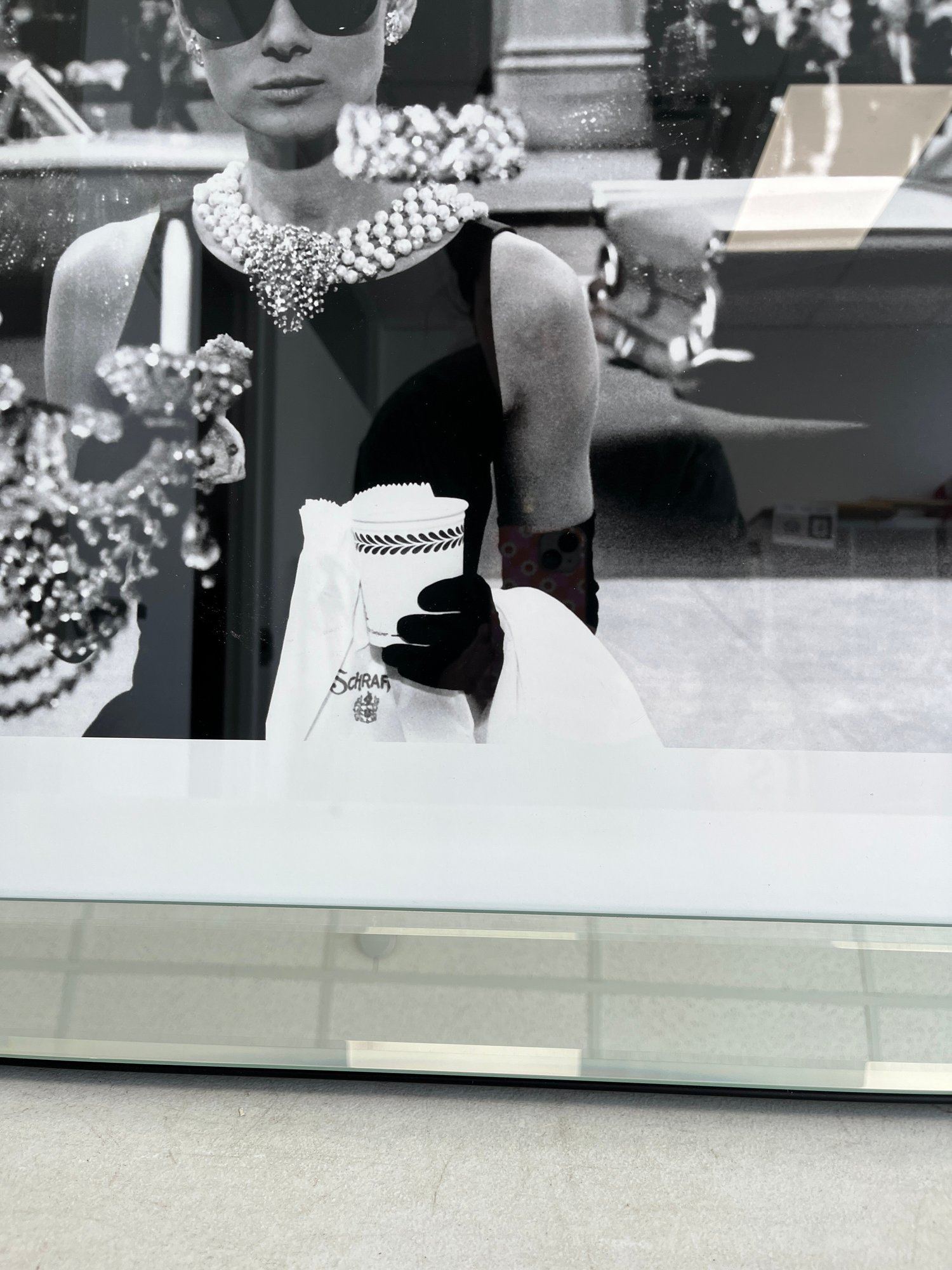 This iconic piece from the Brookpace Lascelles Manhattan Collection features the timeless image "Breakfast at Tiffany's," capturing Audrey Hepburn in her career-defining role as Holly Golightly in the 1961 film Breakfast at Tiffany's. This high-quality black-and-white print is set against a crisp white conservation mount, emphasizing the cinematic contrast of the scene. The artwork is housed in a luxury frame, characterized by an elegant beveled mirrored glass. This sophisticated combination of Hollywood glamour and contemporary craftsmanship creates a striking, light-reflecting statement piece perfect for high-end residential or commercial interiors.
