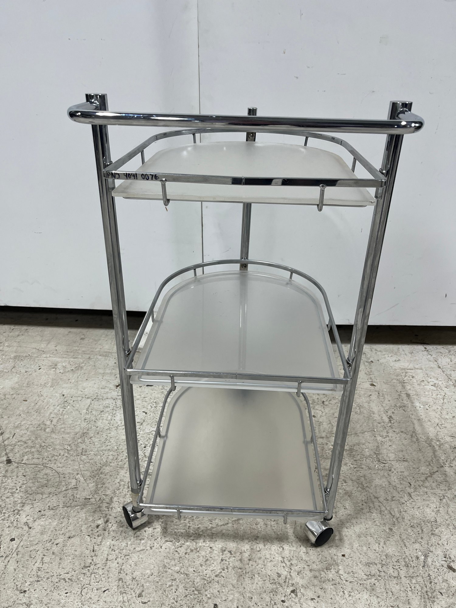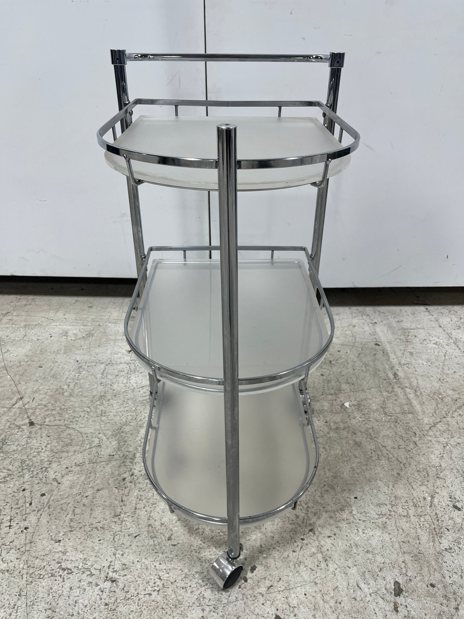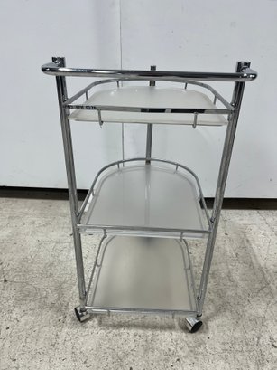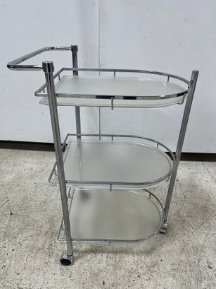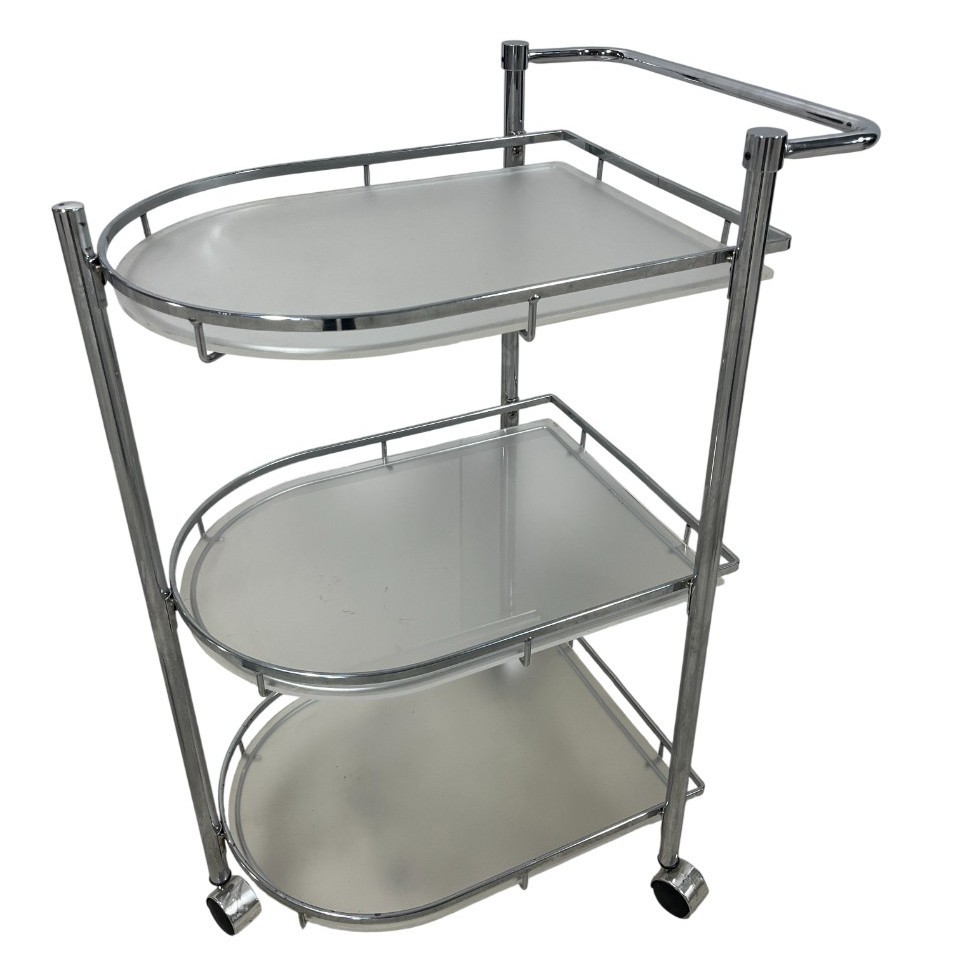 Elevate your hosting game with this sleek, Mid-Century inspired serving cart. Defined by its minimalist silhouette and industrial materials, this three-tier trolley seamlessly blends 1970s Italian modernism with contemporary utility. Each tier features a frosted plexiglass pane.