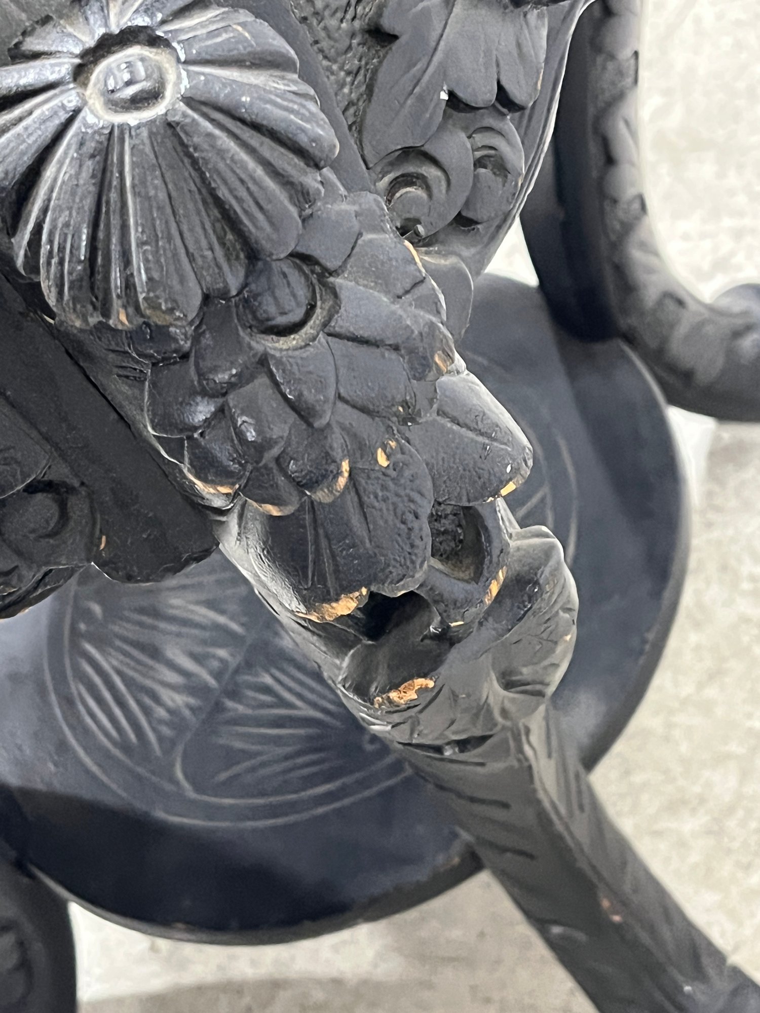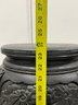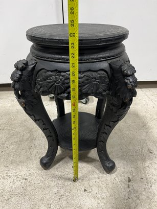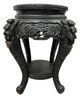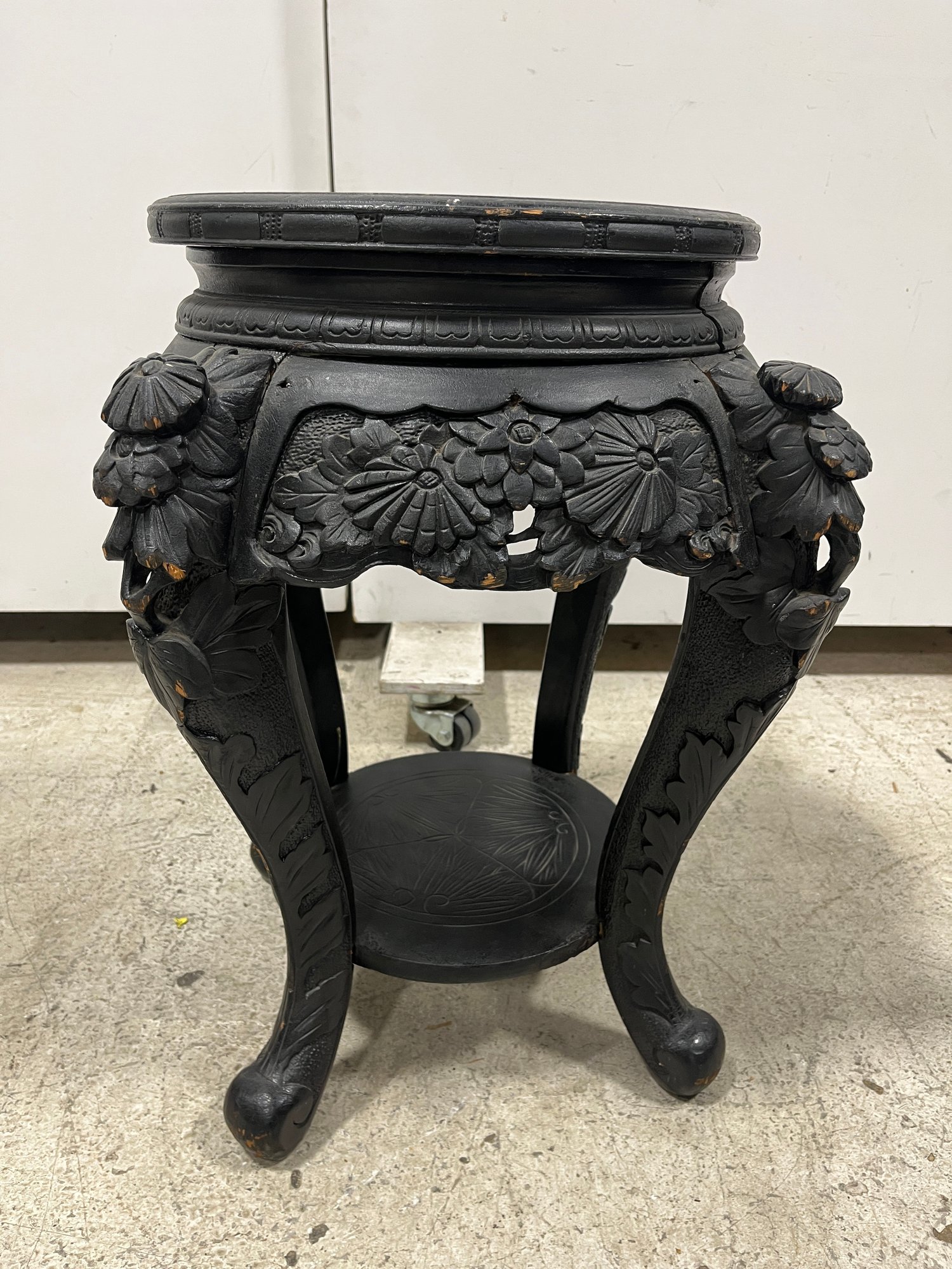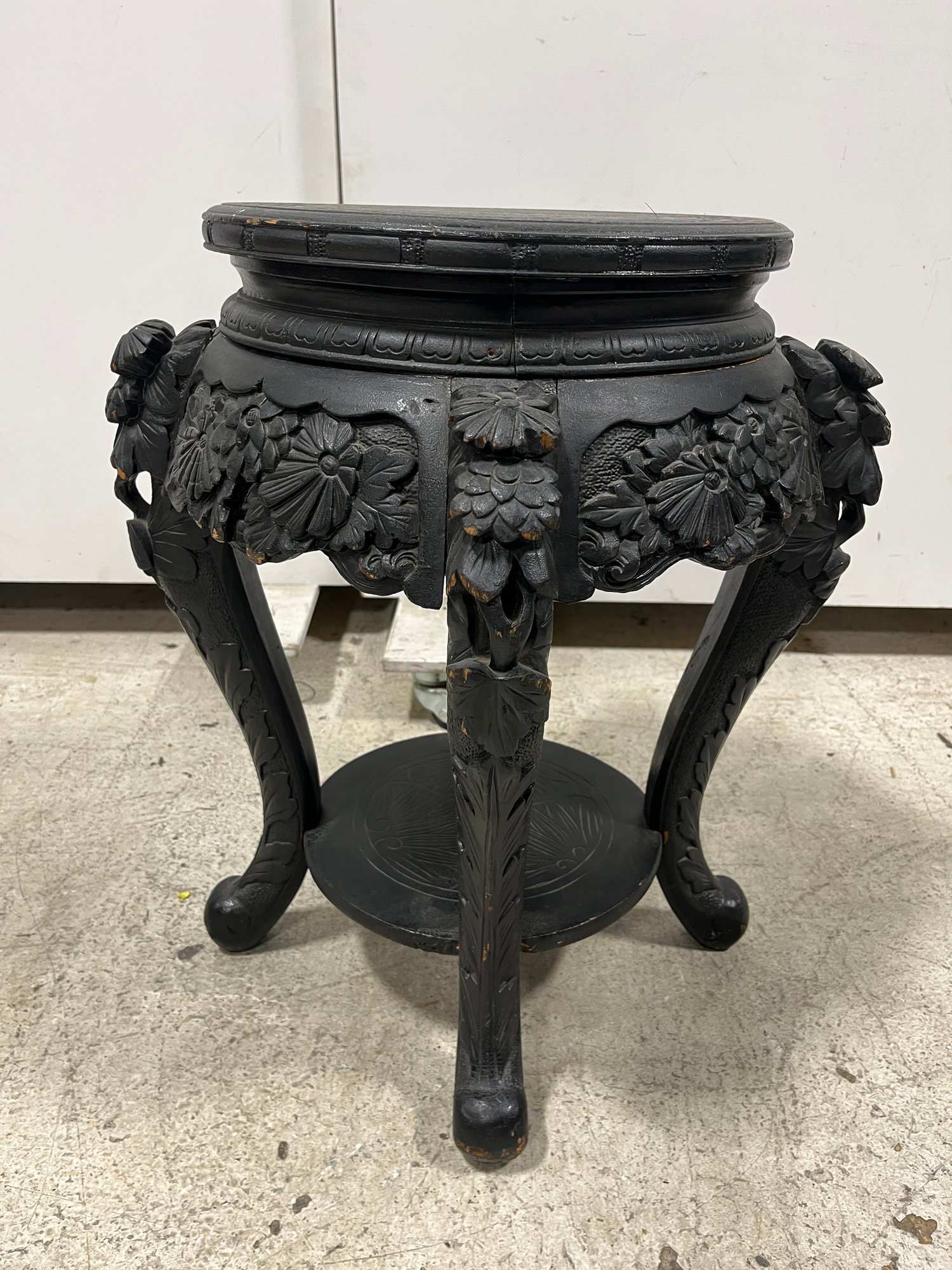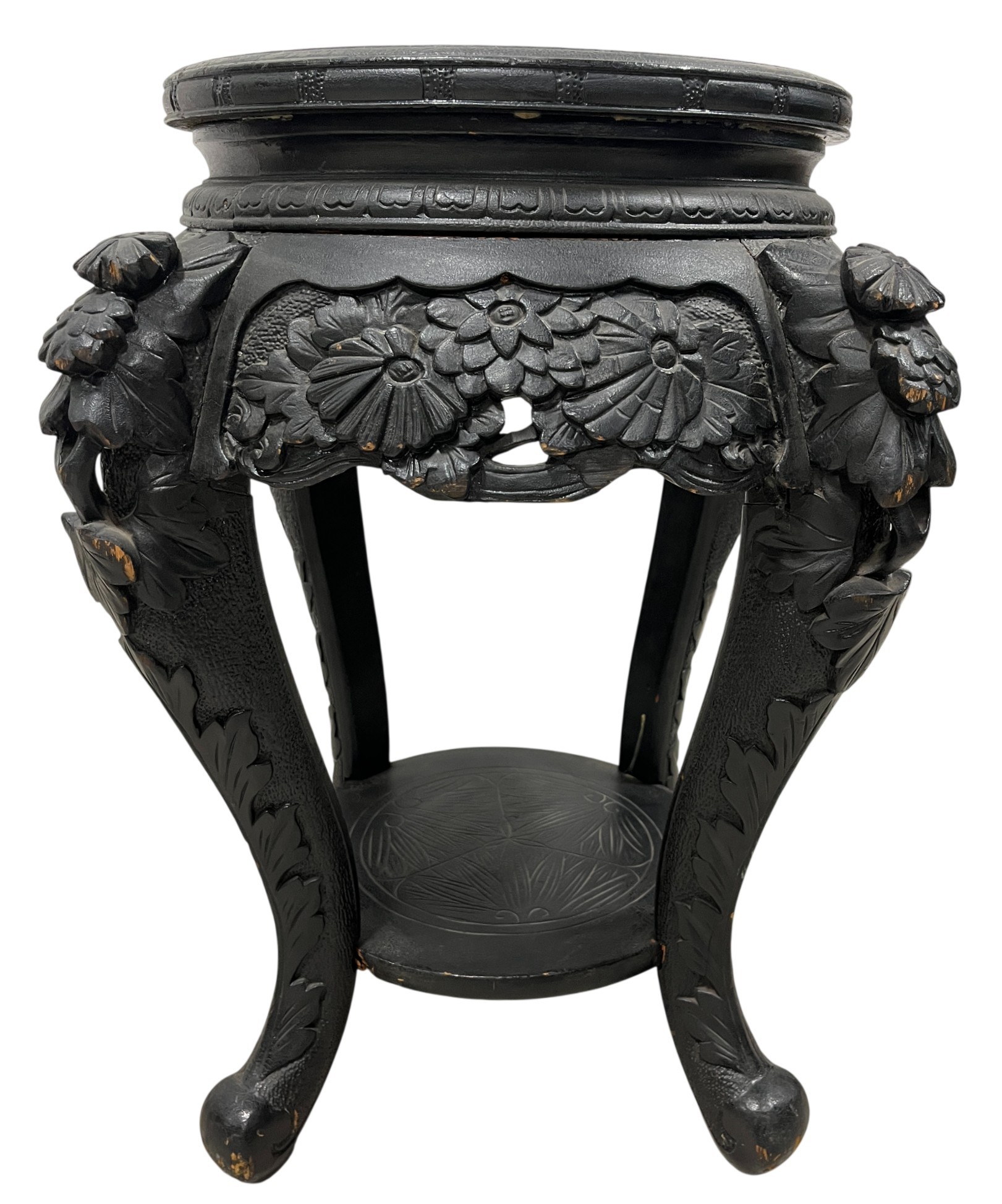 This antique-style Chinese plant stand is a striking example of ebonized wood craftsmanship, likely dating from the late 19th to early 20th century. This type of furniture, often called a jardinière stand or tabouret, was traditionally used to display fine porcelain vases or decorative plants.