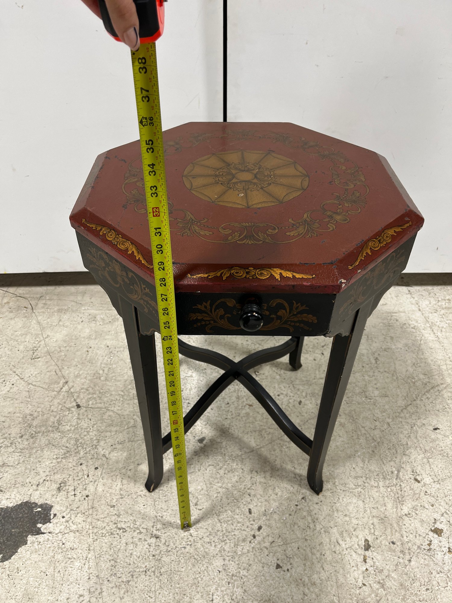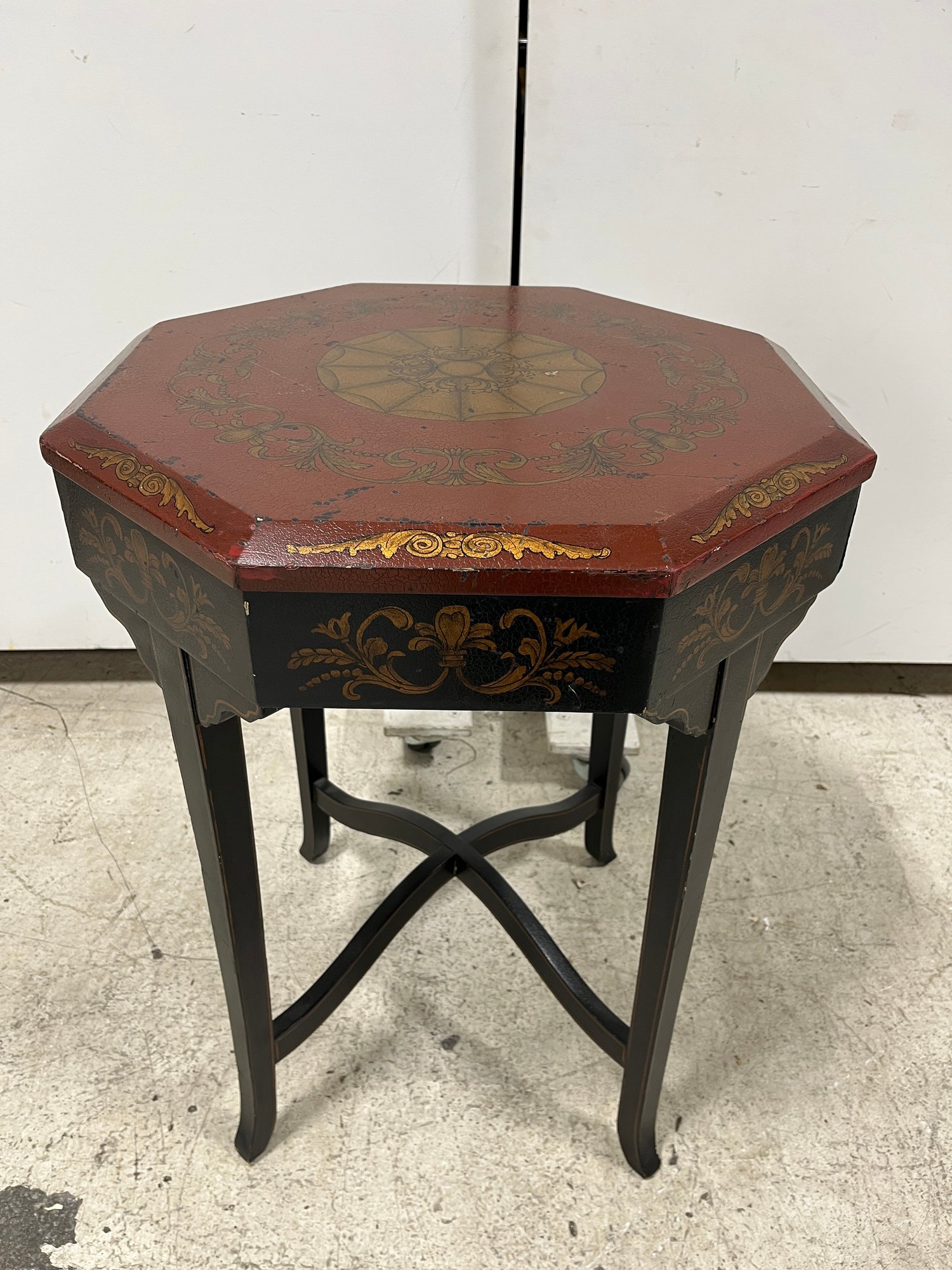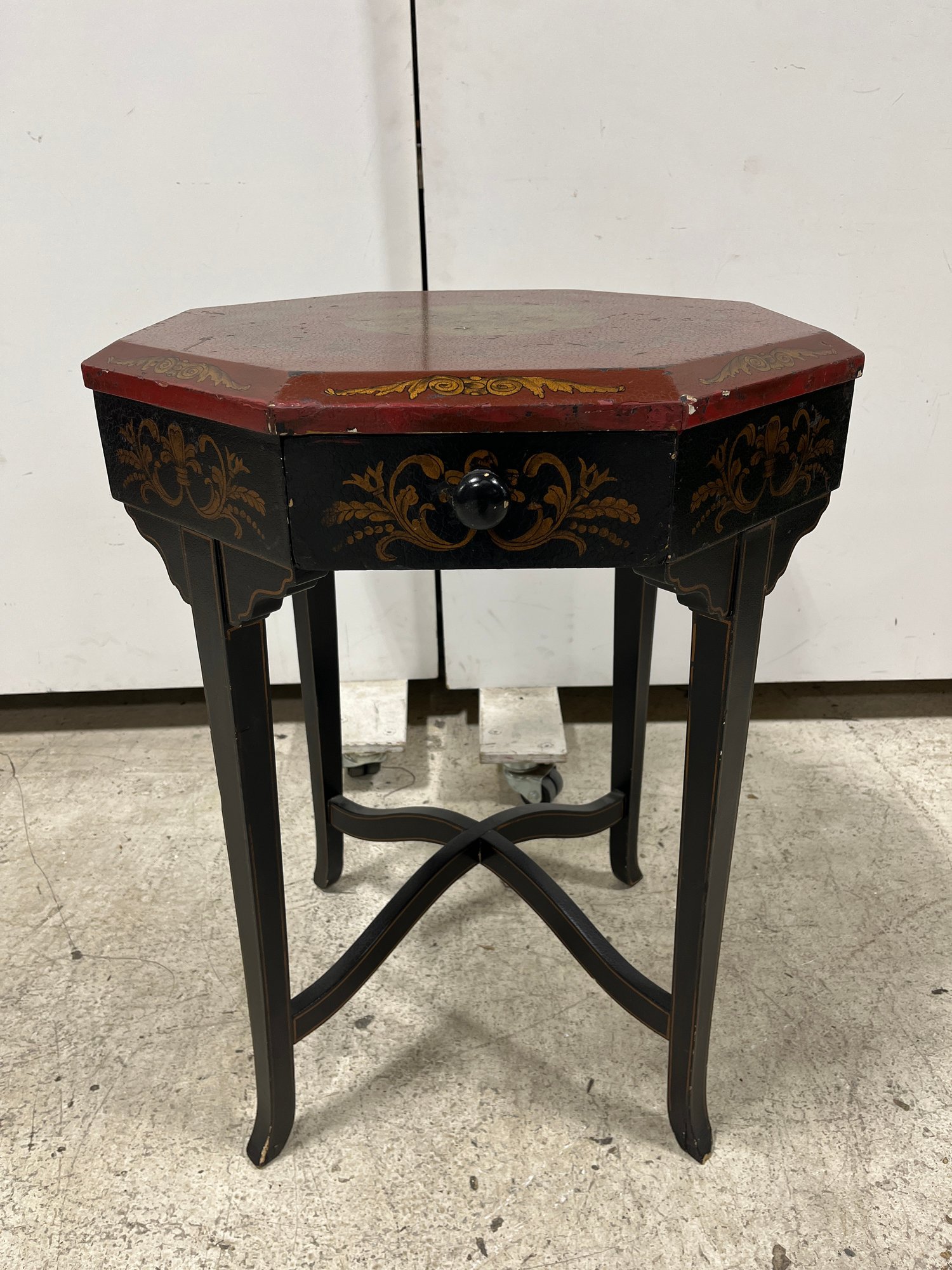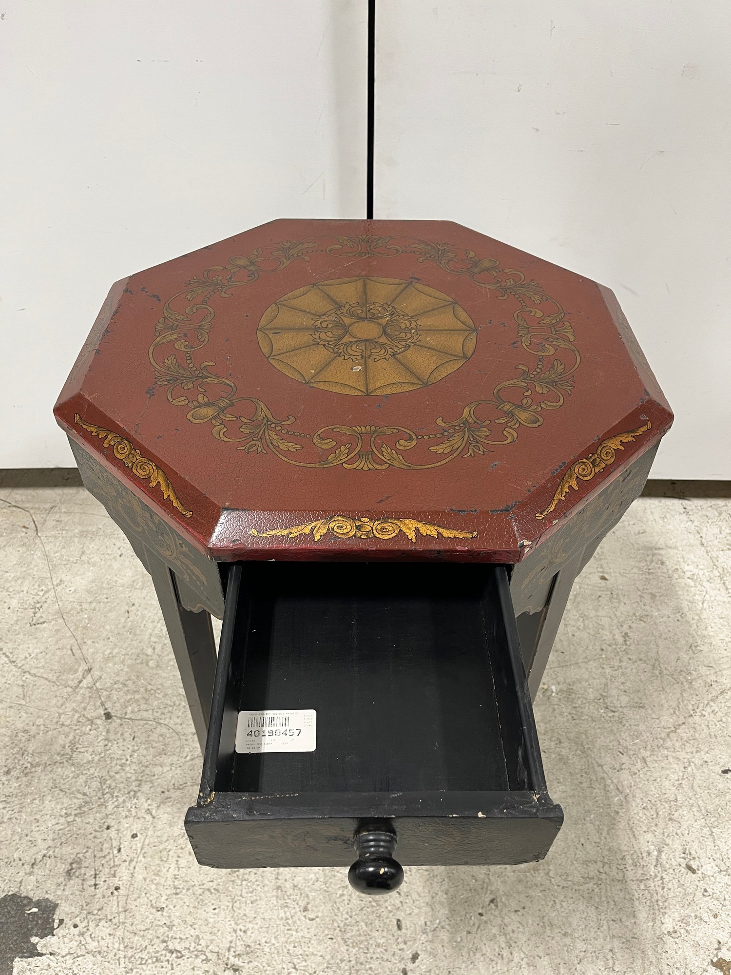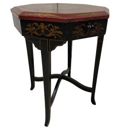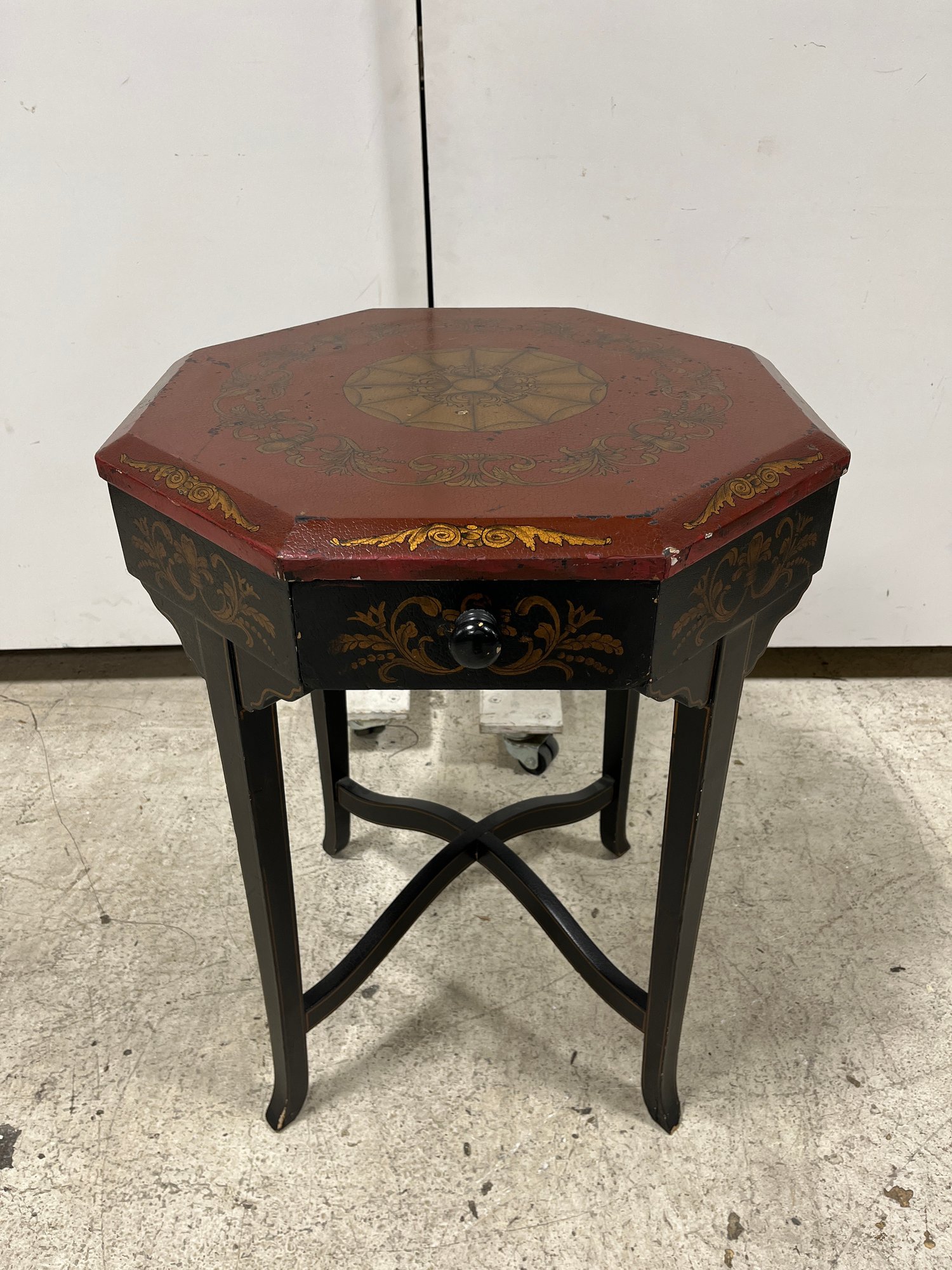 A sophisticated 19th-century-style accent table featuring a distinctive octagonal silhouette. This piece blends European form with Eastern-inspired artistry, making it a striking addition to any traditional or eclectic interior. This piece also features a center drawer.