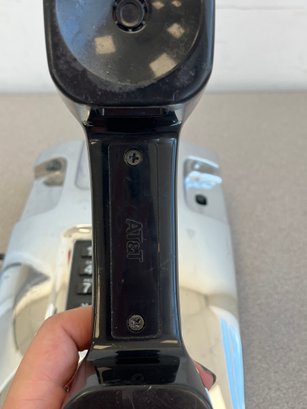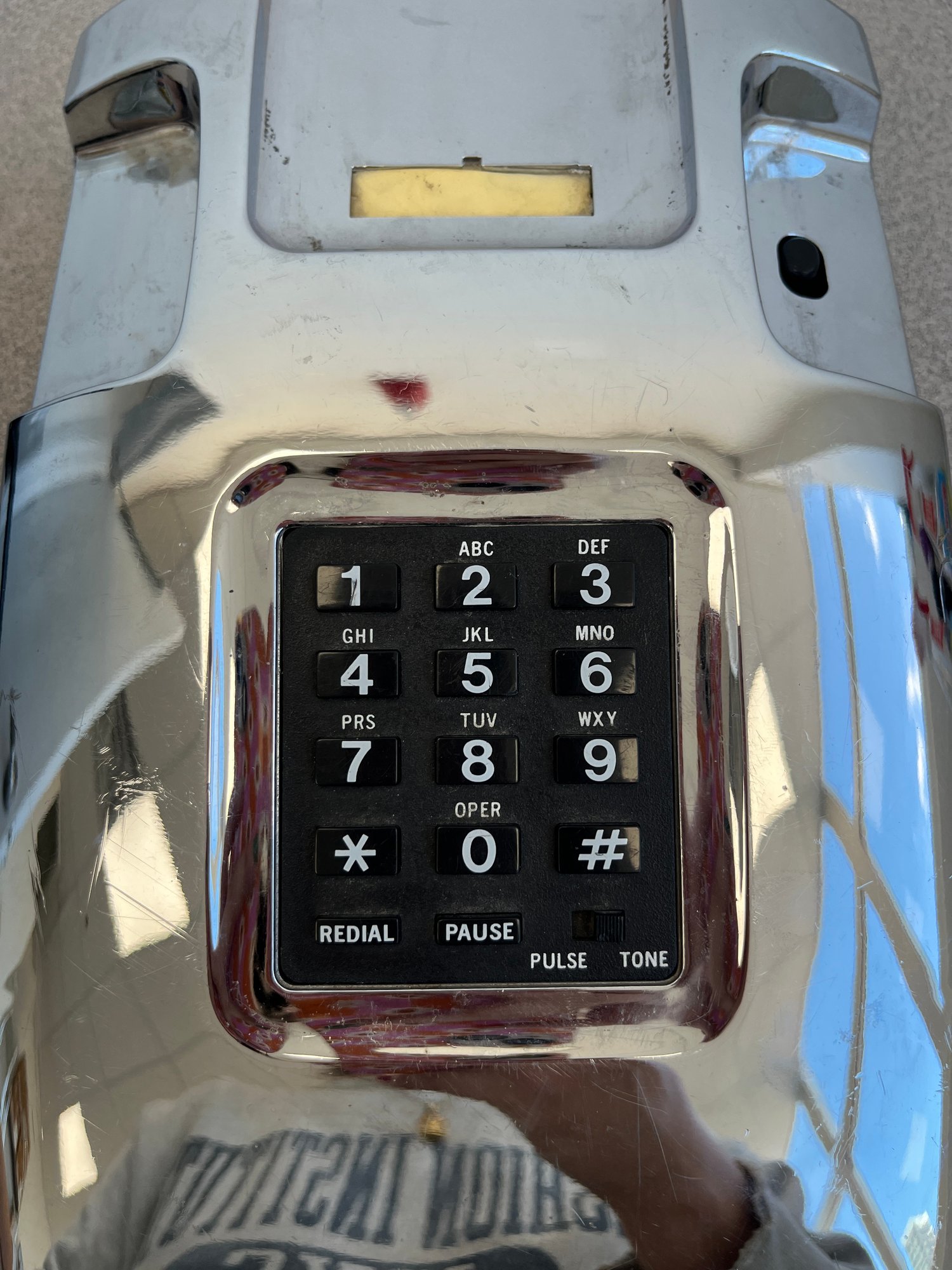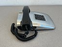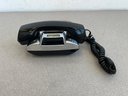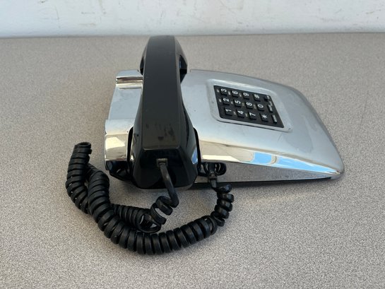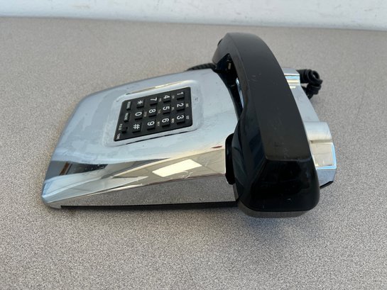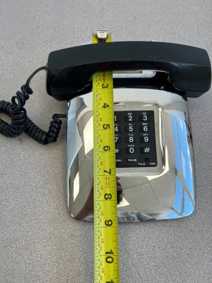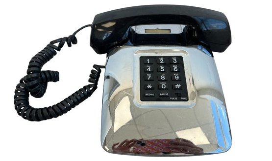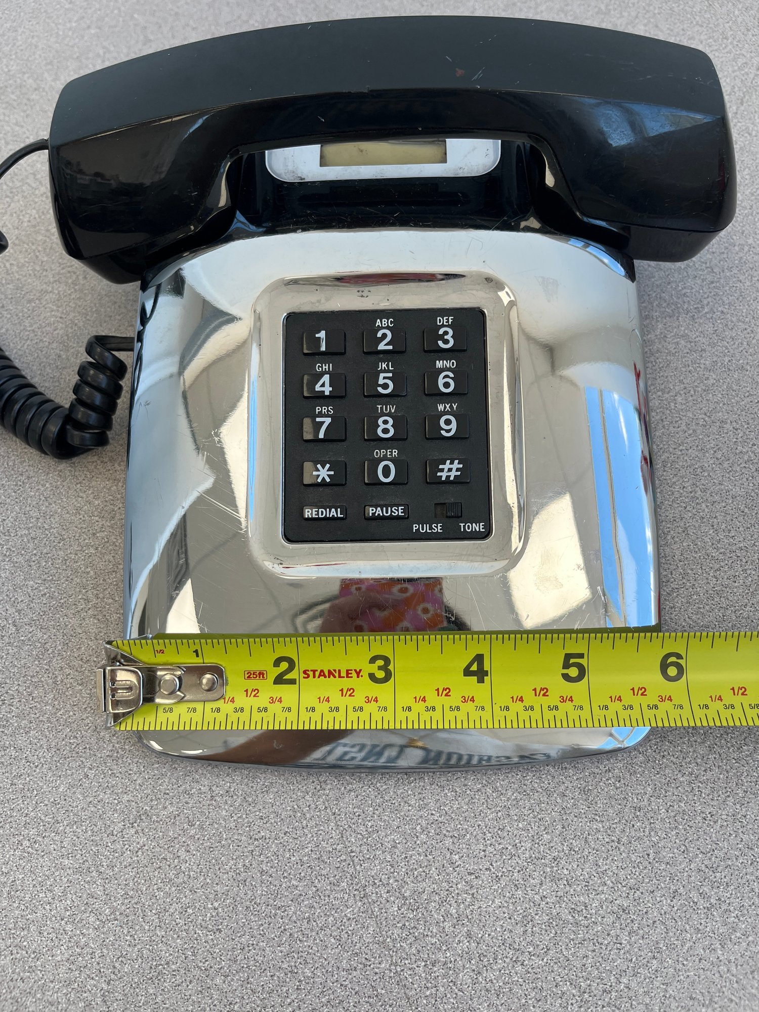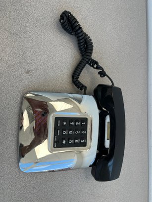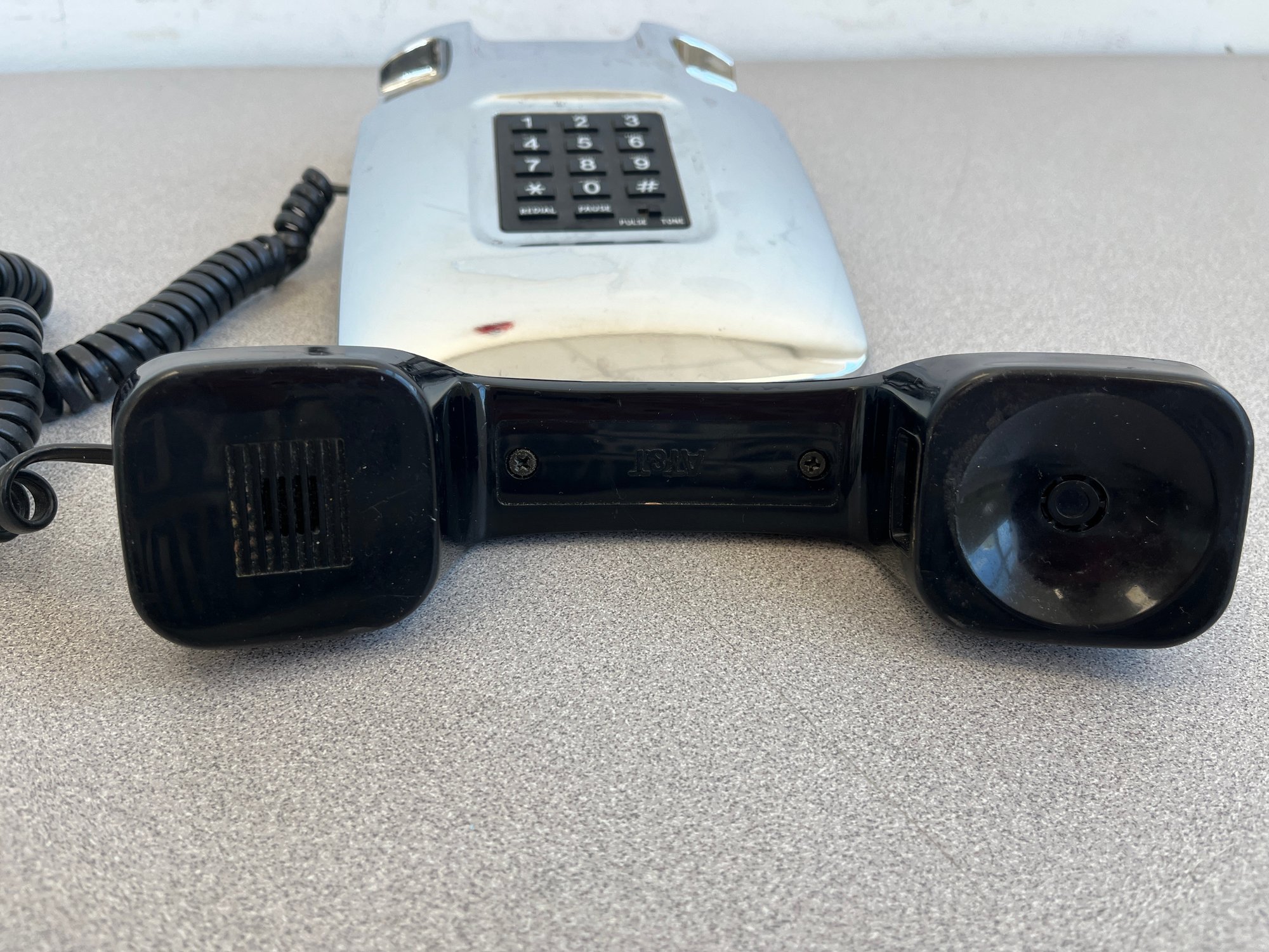 Experience a blend of classic design and modern convenience with this stylish retro corded phone. This desk telephone captures the essence of mid-century aesthetics with its sleek, reflective chrome body and timeless black handset. Crafted primarily from a high-quality, lightweight plastic material with a polished chrome-effect finish, this item combines classic looks with contemporary durability.