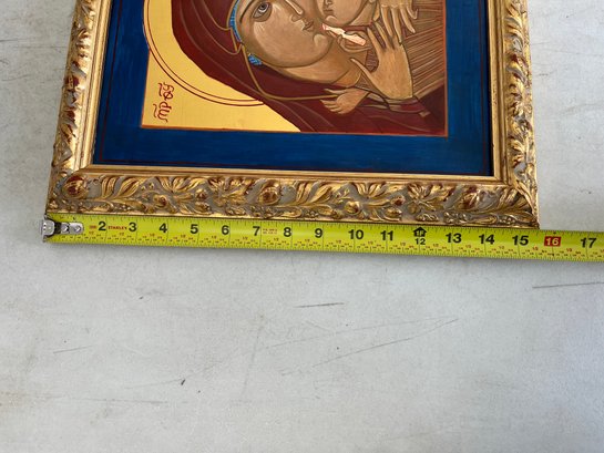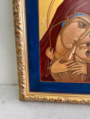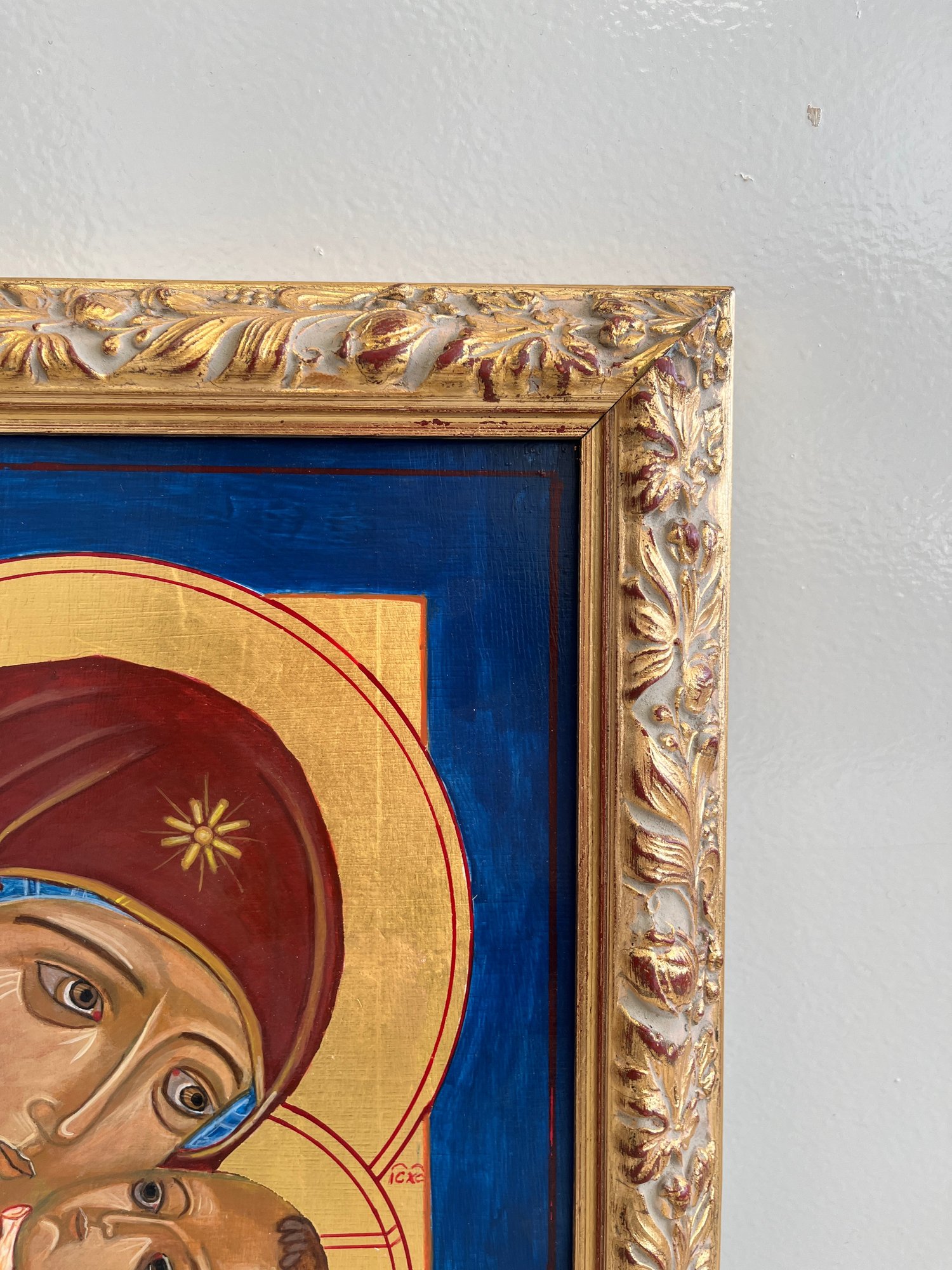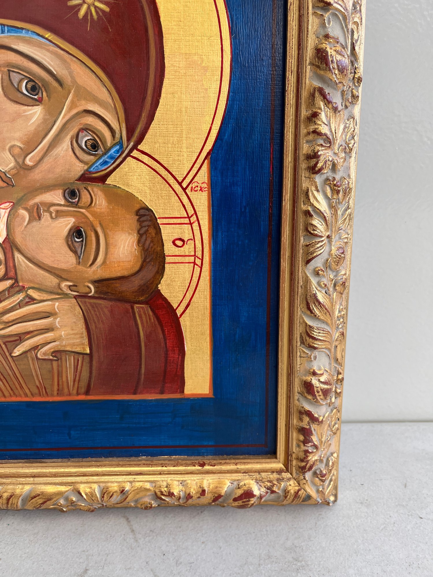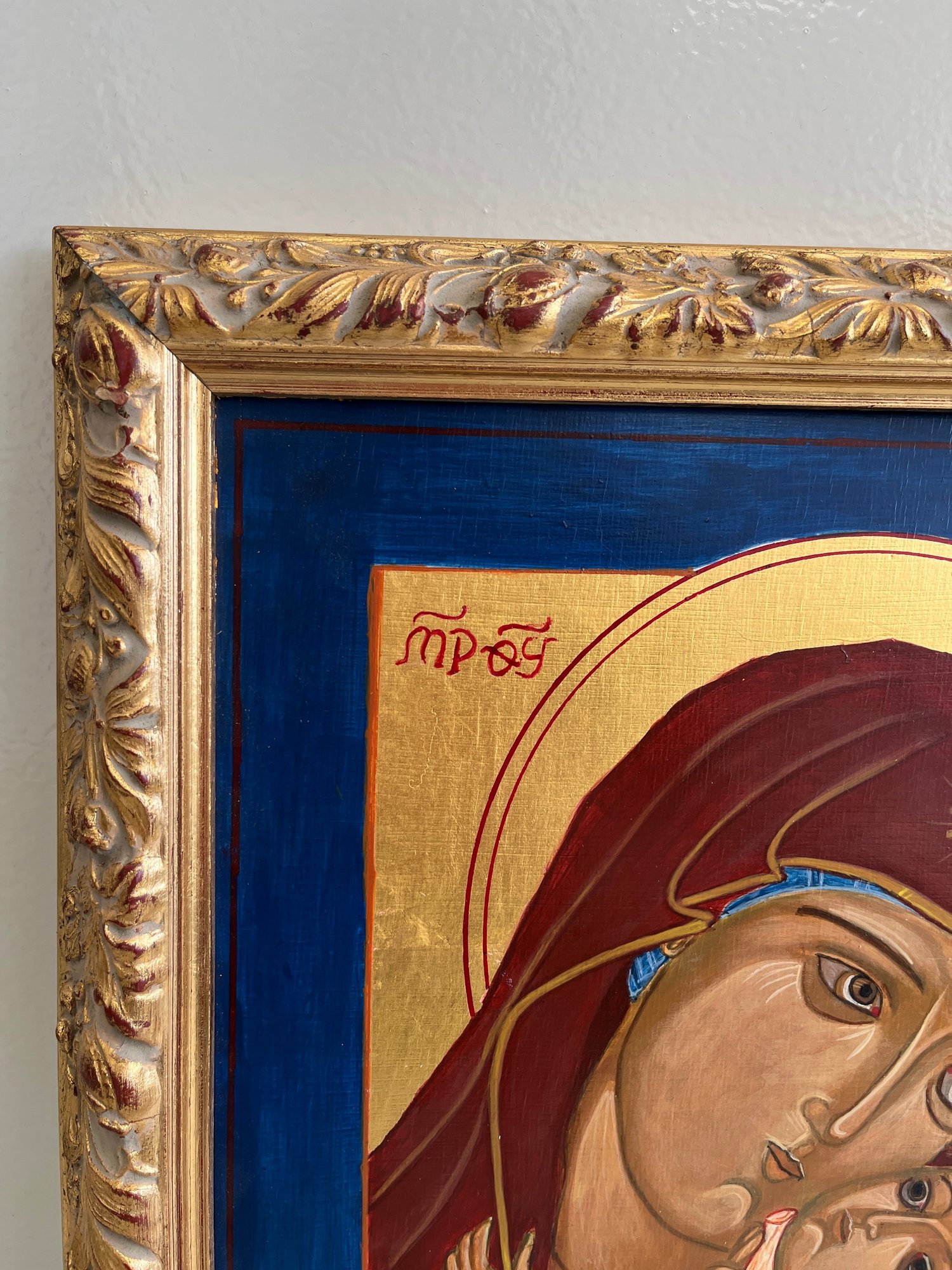 This Mother of God of Korsun icon painting is a distinguished example of the Eleusa iconographic type, characterized by the intimate cheek-to-cheek embrace between the Virgin Mary and the Infant Christ.
