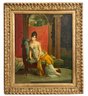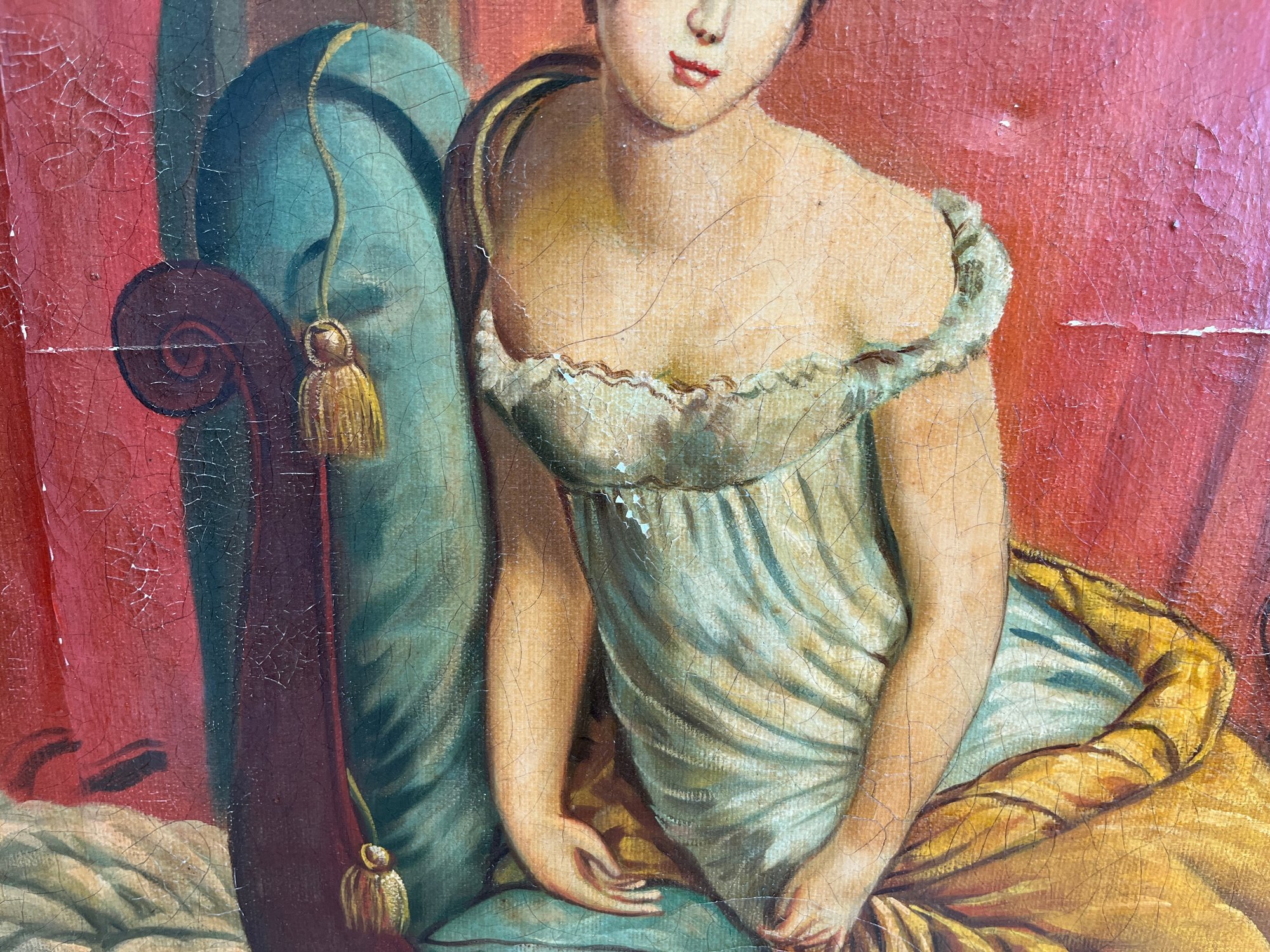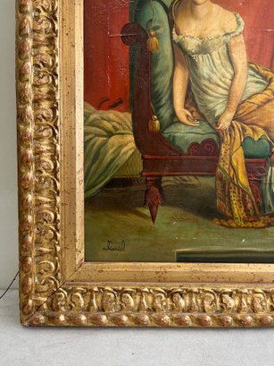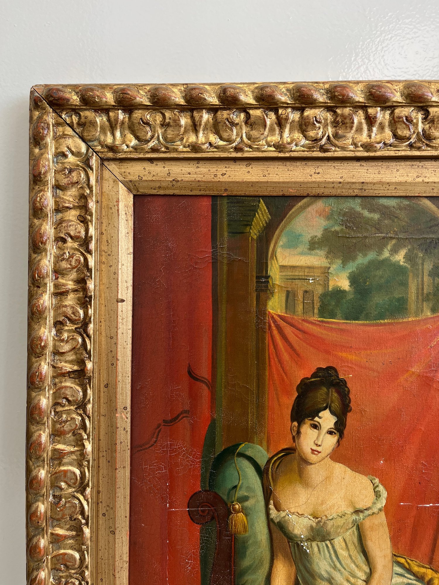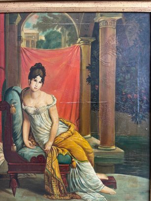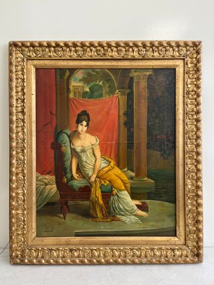 This reproduction depicts the celebrated Parisian socialite Juliette Récamier, after the original 1802 masterpiece by François Gérard. The subject is captured in a quintessentially Neoclassical pose, reclining on a lush green chaise longue while draped in a vibrant saffron-yellow shawl over a white Empire-waist gown. Set against a dramatic backdrop of a deep rose curtain and classical architecture, the work maintains the serene idealized elegance of the French Consulate period. The painting is framed in an ornate, gilt-wood frame featuring a relief pattern.