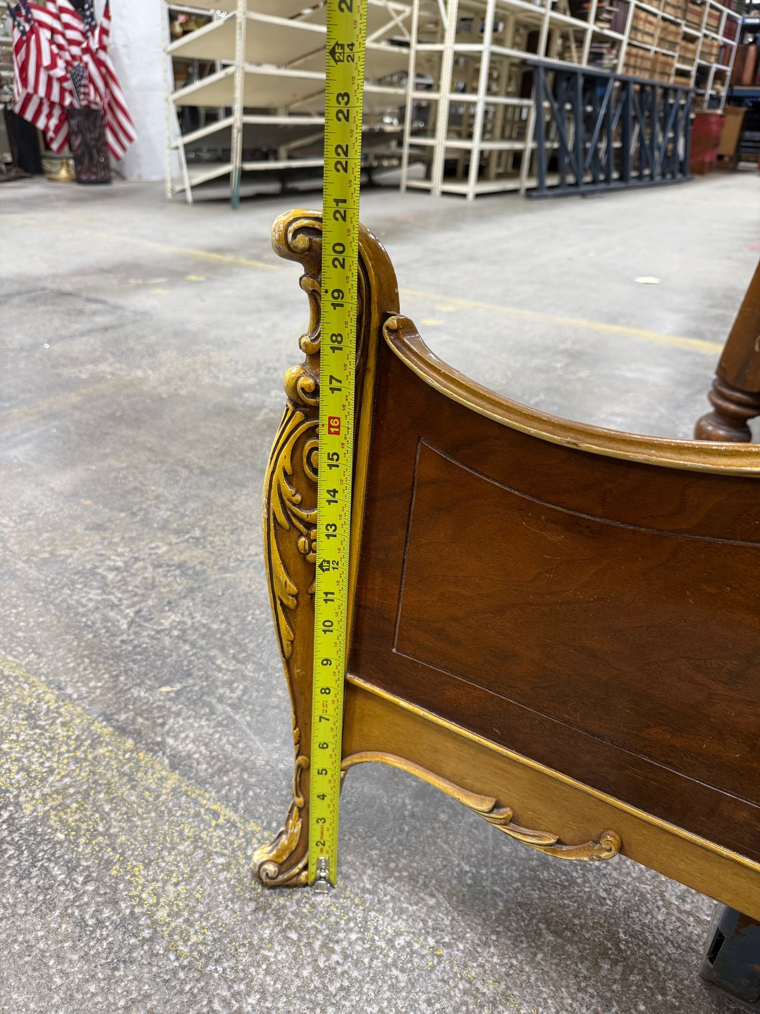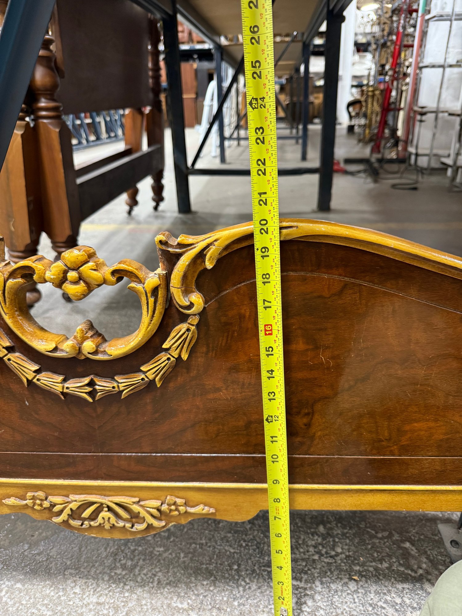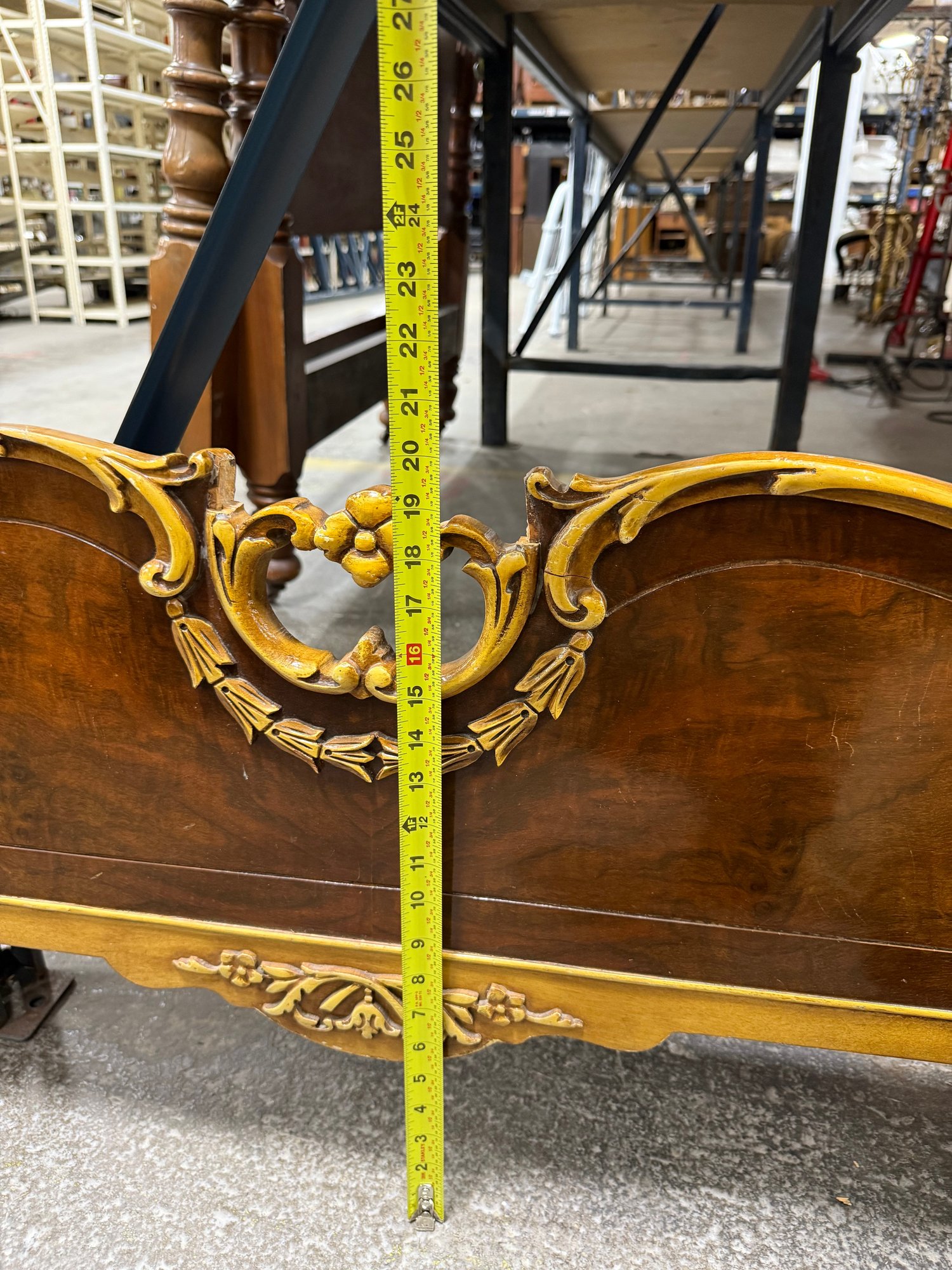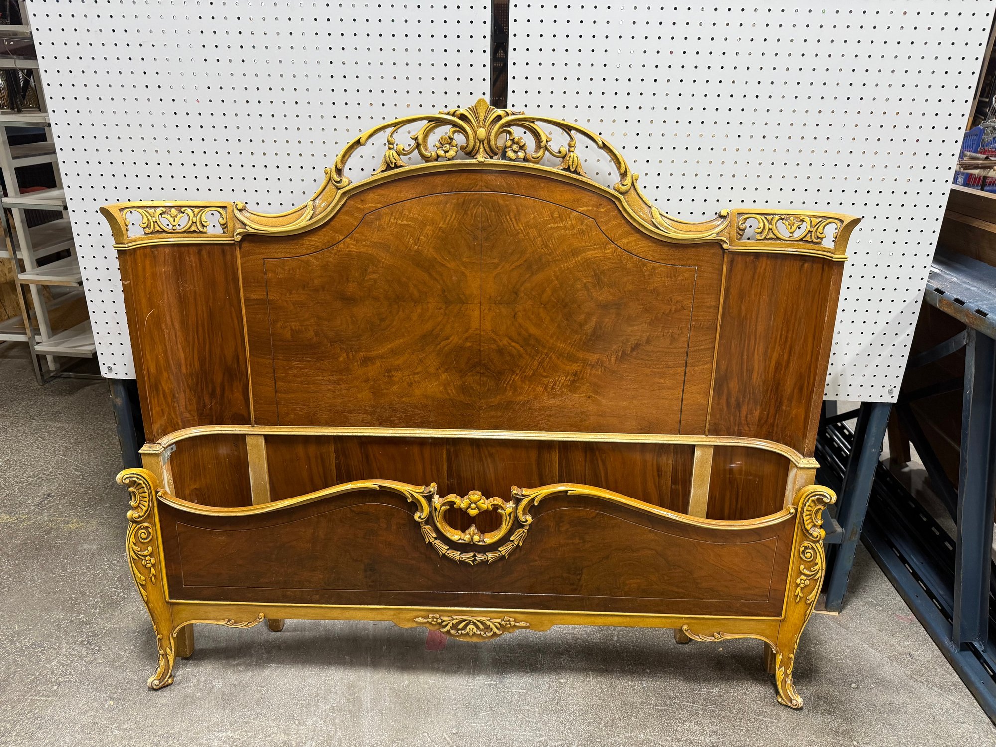 This exquisite bed frame captures the essence of the Rococo Revival, a style popular in America during the early-to-mid 20th century. The design showcases classic Louis XV elements such as flowing curves, ornate crests, and detailed carvings.