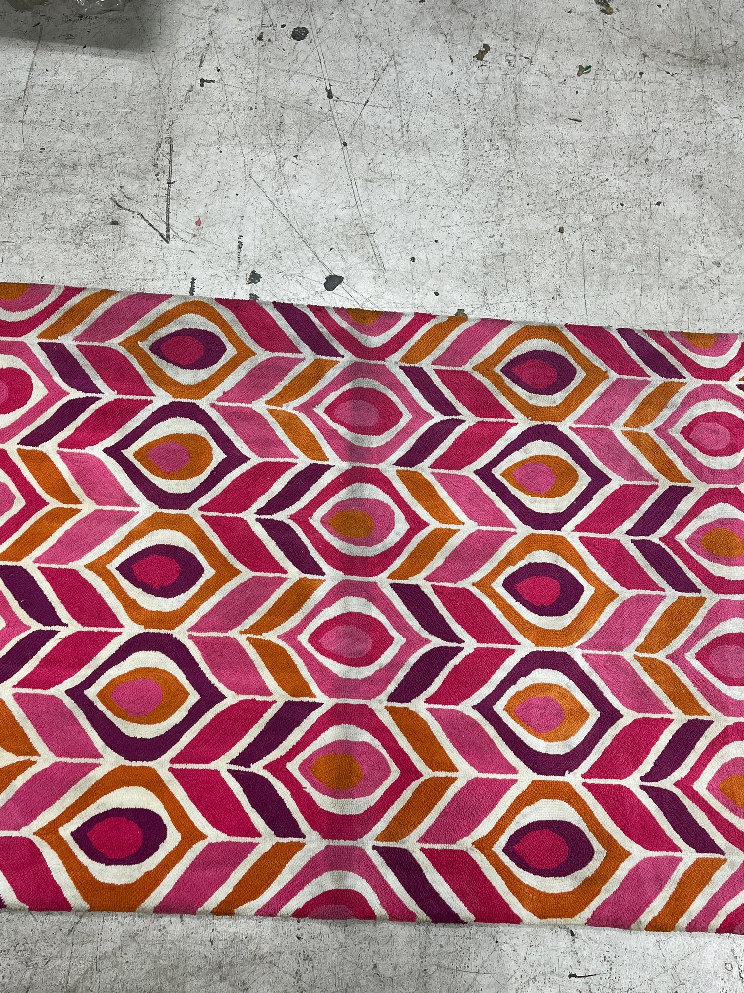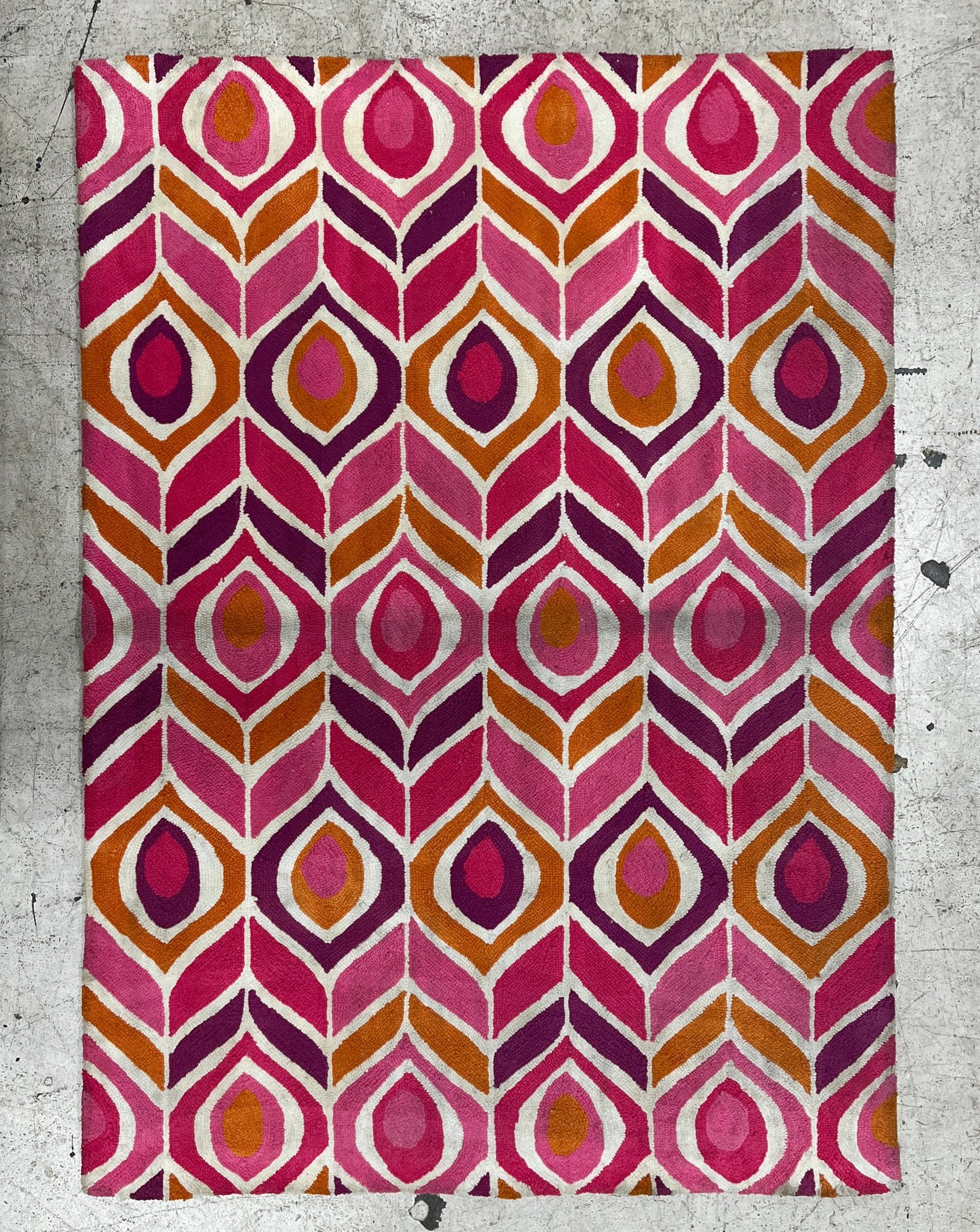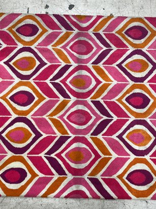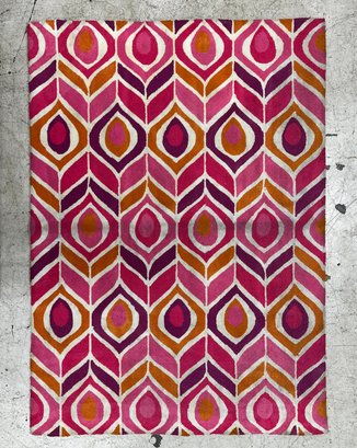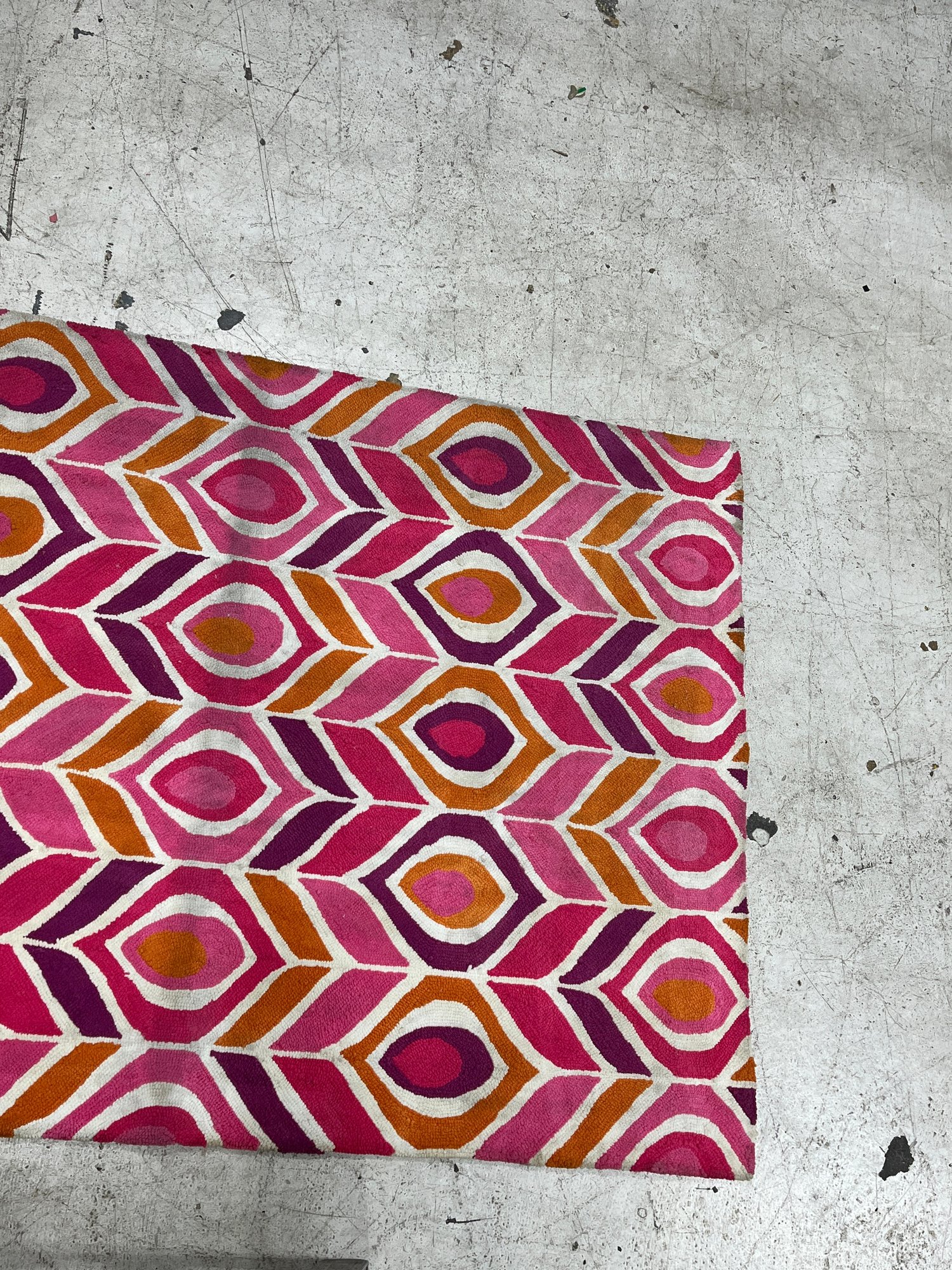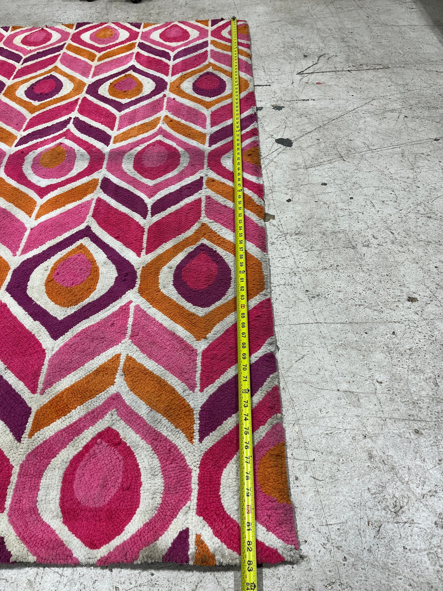 This is a striking area rug that anchors any room with its vibrant, mid-century-inspired geometric design. Featuring a rhythmic motif in a bold palette of fuchsia, sunset orange, and deep plum, this statement piece is a perfect fusion of retro 70s energy and modern luxury for maximalist or bohemian-style interiors.