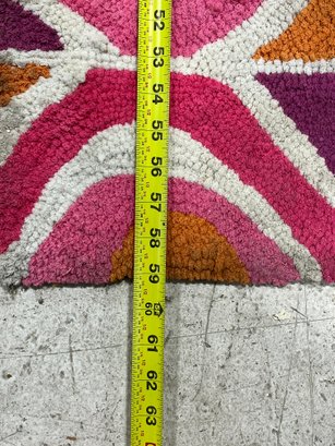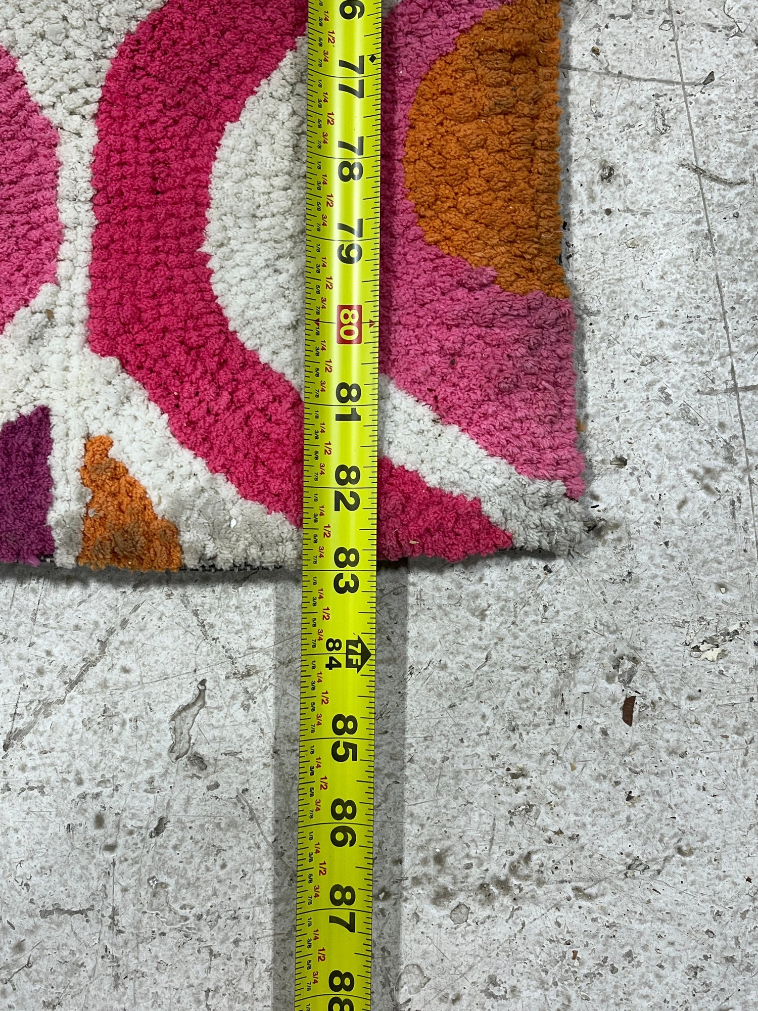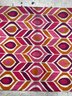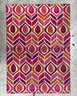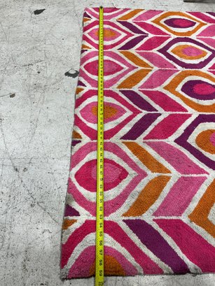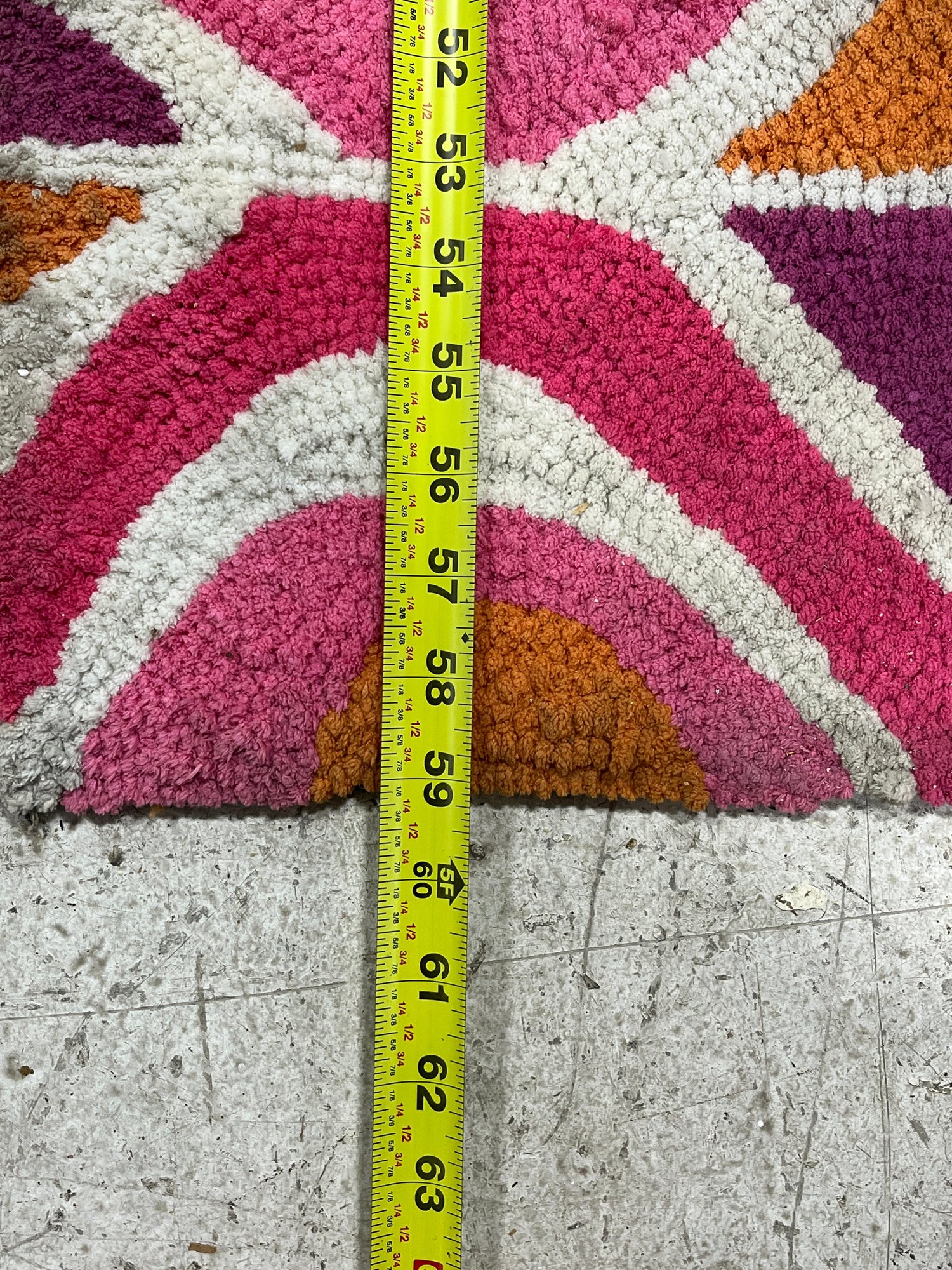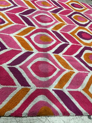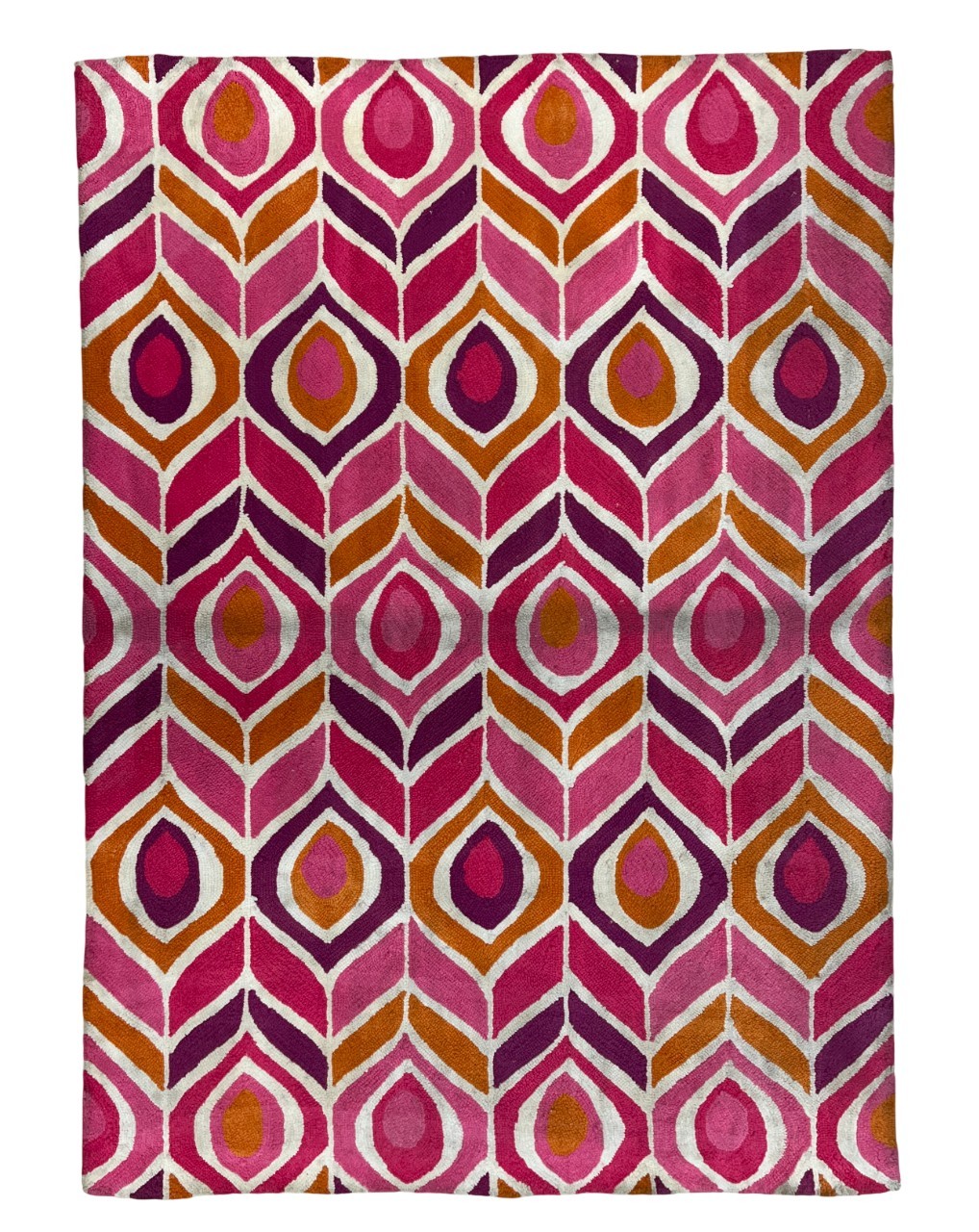 This is a striking area rug that anchors any room with its vibrant, mid-century-inspired geometric design. Featuring a rhythmic motif in a bold palette of fuchsia, sunset orange, and deep plum, this statement piece is a perfect fusion of retro 70s energy and modern luxury for maximalist or bohemian-style interiors.