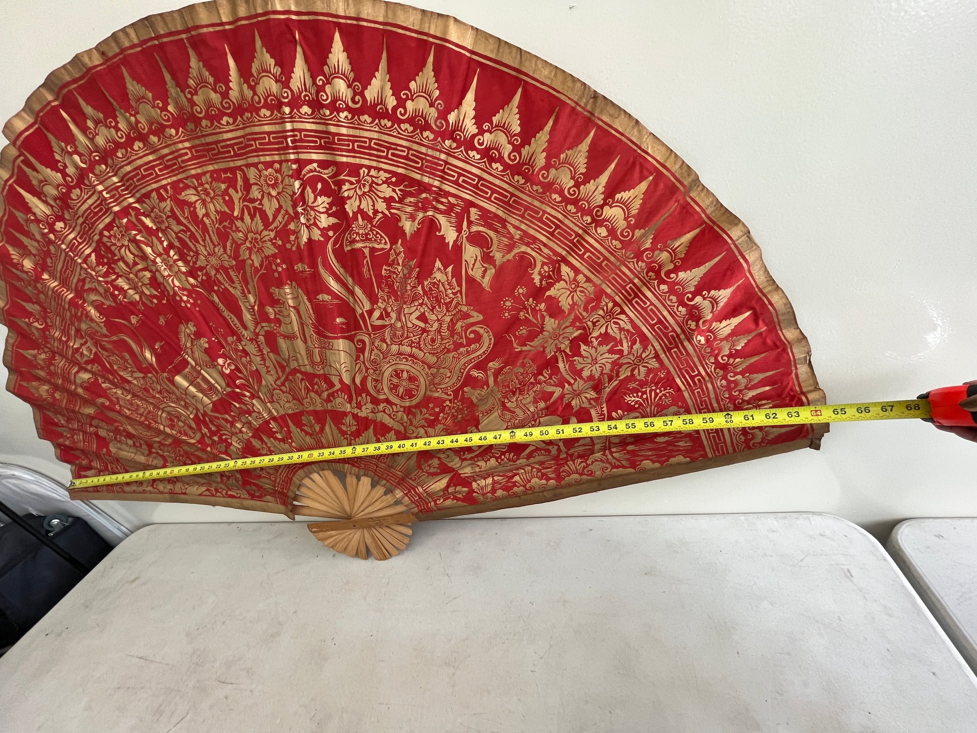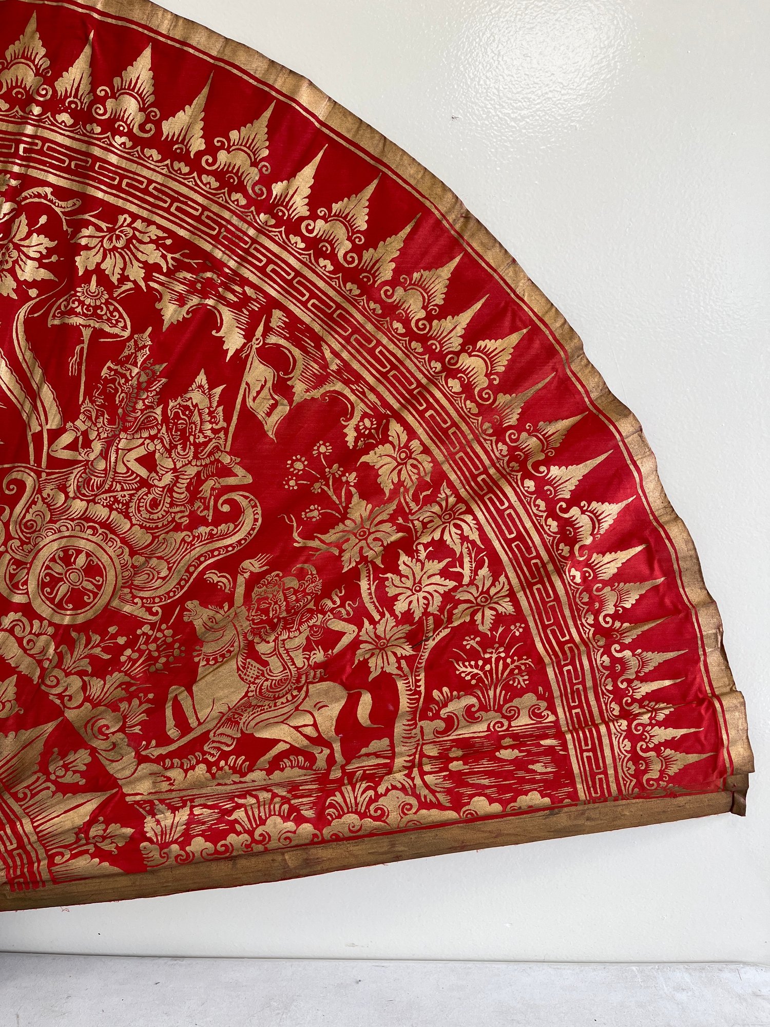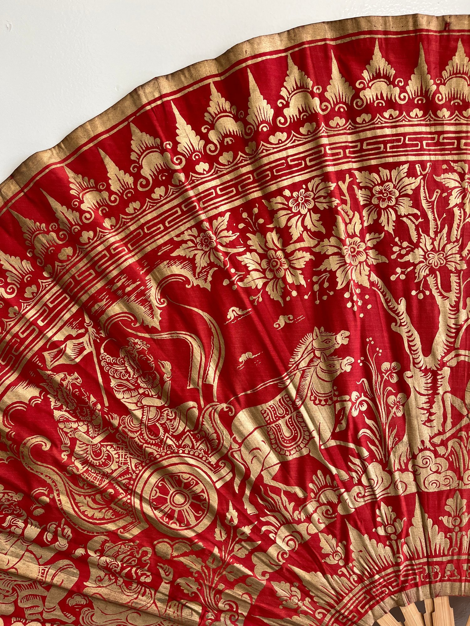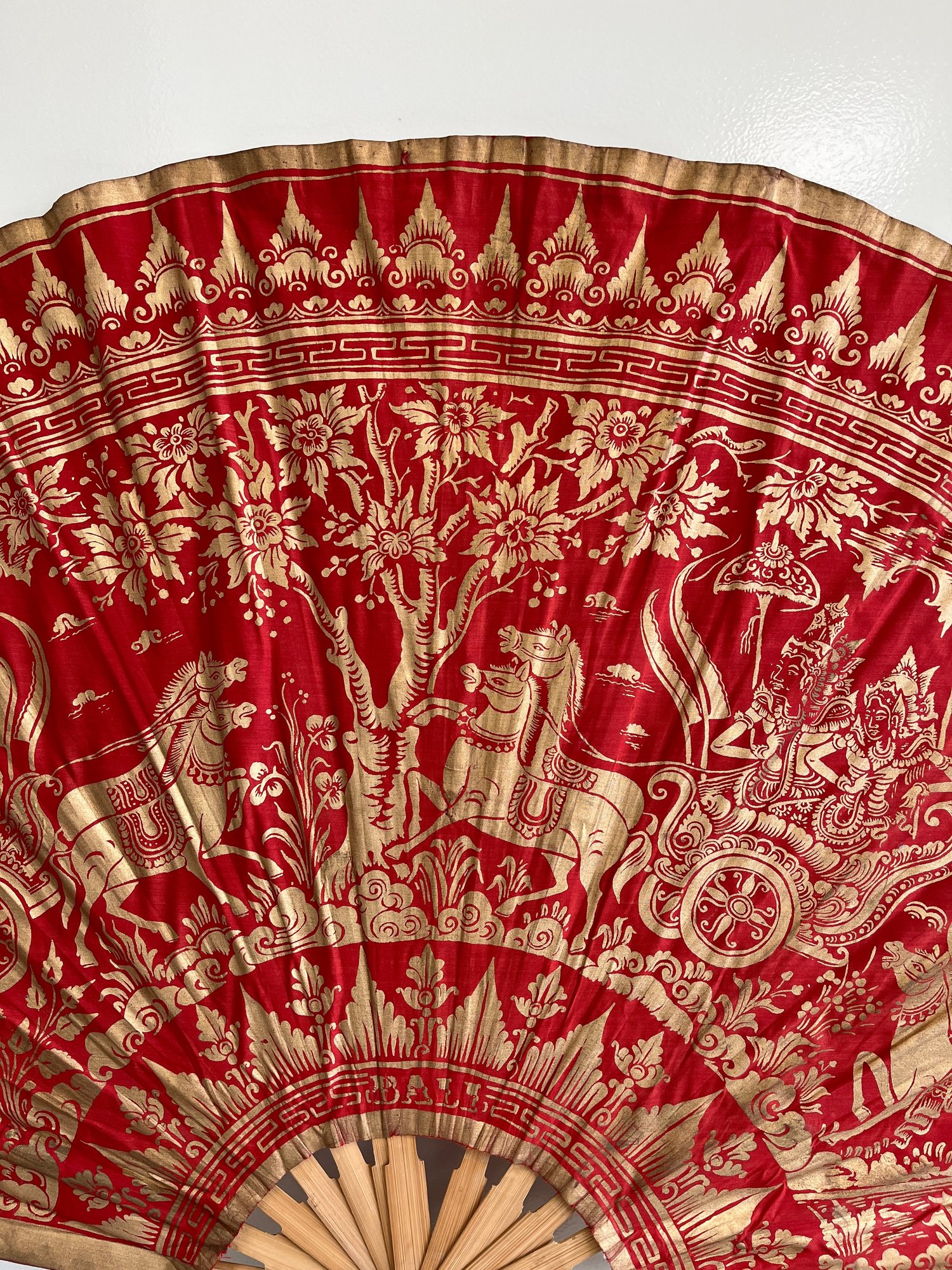 This striking, large-scale folding fan is an elaborate decorative piece, likely originating from Bali, Indonesia. It is designed primarily for wall display. A rich red background serves as the canvas for intricate gilt decoration, applied using gold paint or leaf. The detailed artwork is executed in a traditional Balinese style, reminiscent of Wayang (shadow puppet) theatre characters. The dynamic scene depicts mythological figures, possibly from the Ramayana epic, interspersed with stylized foliage and architectural elements.