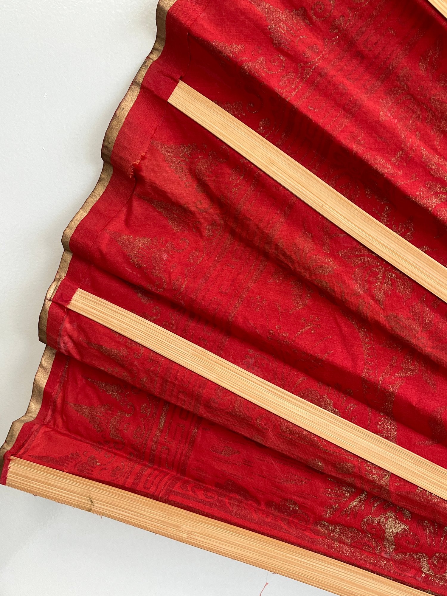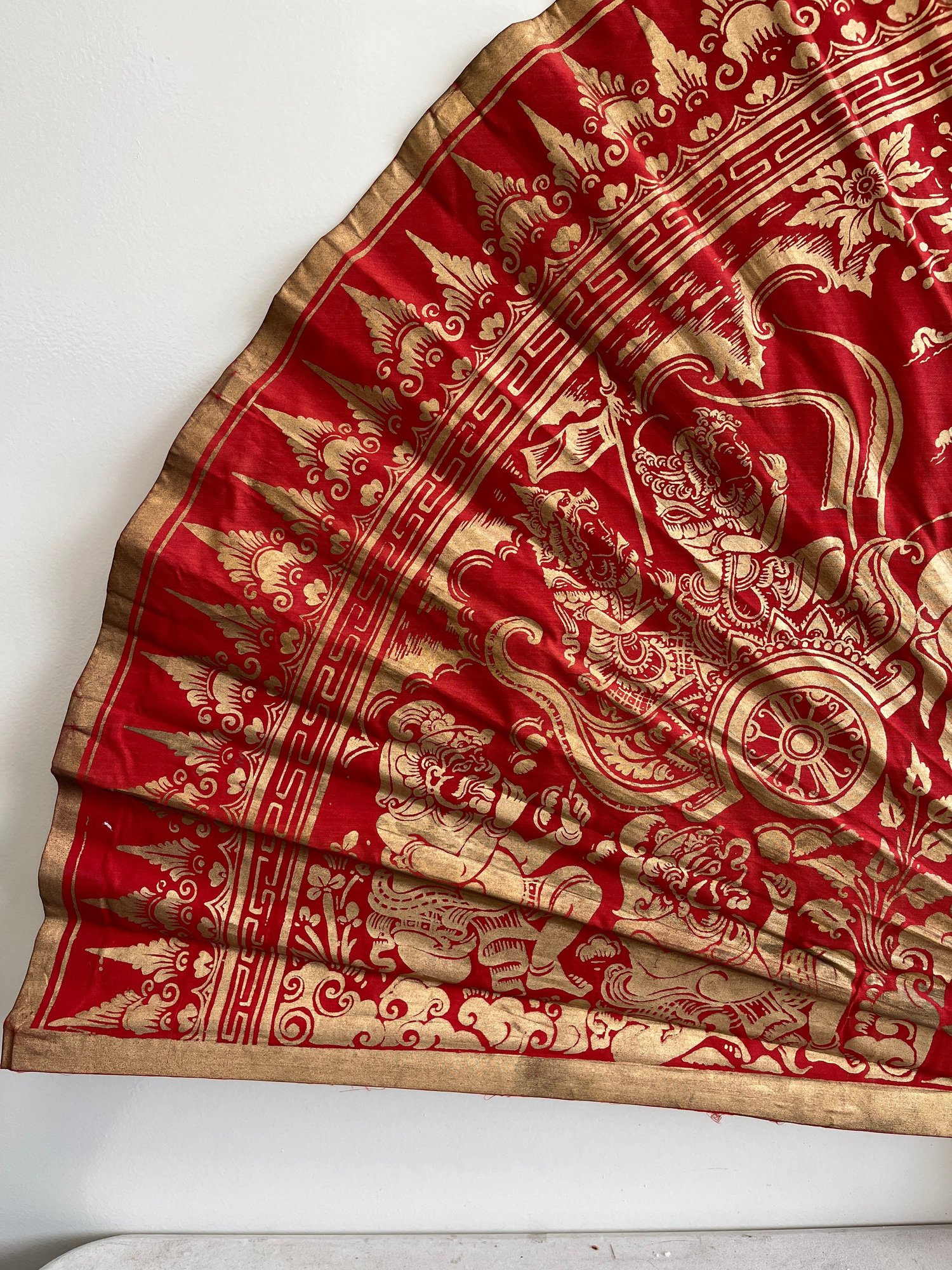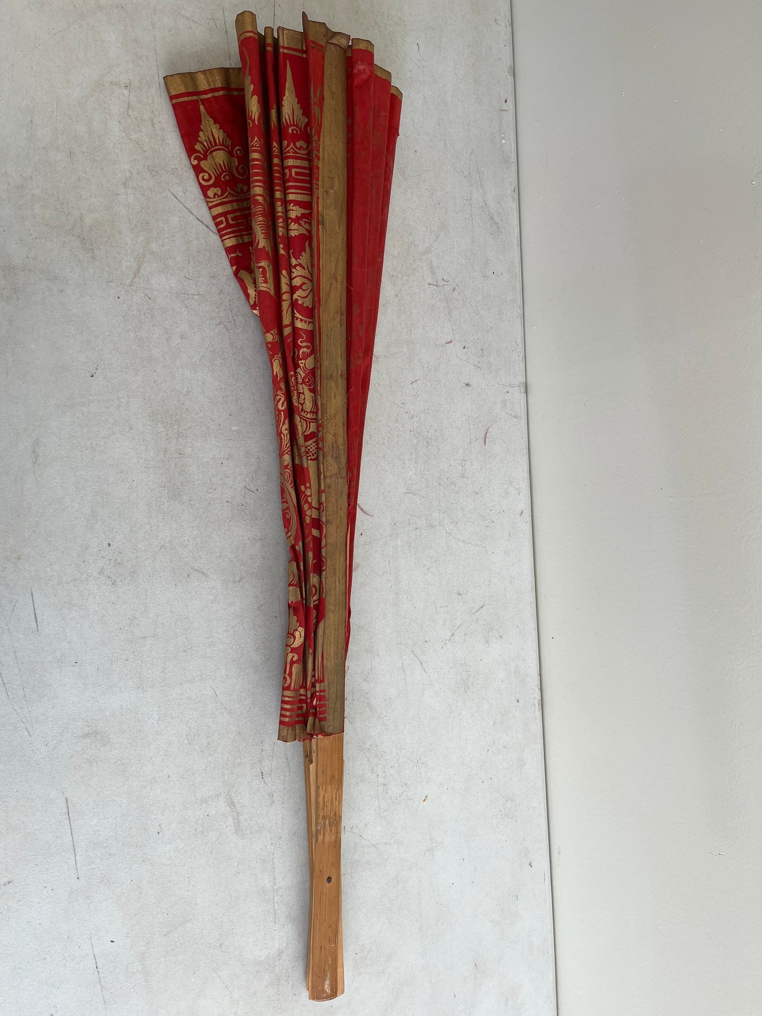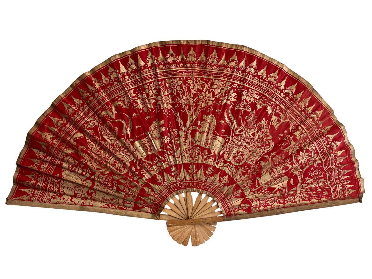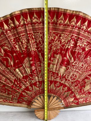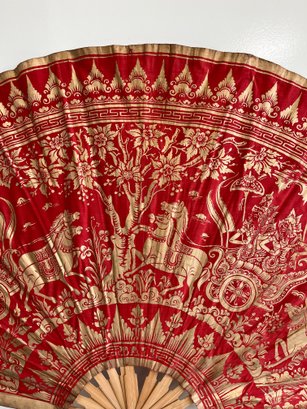 This striking, large-scale folding fan is an elaborate decorative piece, likely originating from Bali, Indonesia. It is designed primarily for wall display. A rich red background serves as the canvas for intricate gilt decoration, applied using gold paint or leaf. The detailed artwork is executed in a traditional Balinese style, reminiscent of Wayang (shadow puppet) theatre characters. The dynamic scene depicts mythological figures, possibly from the Ramayana epic, interspersed with stylized foliage and architectural elements.