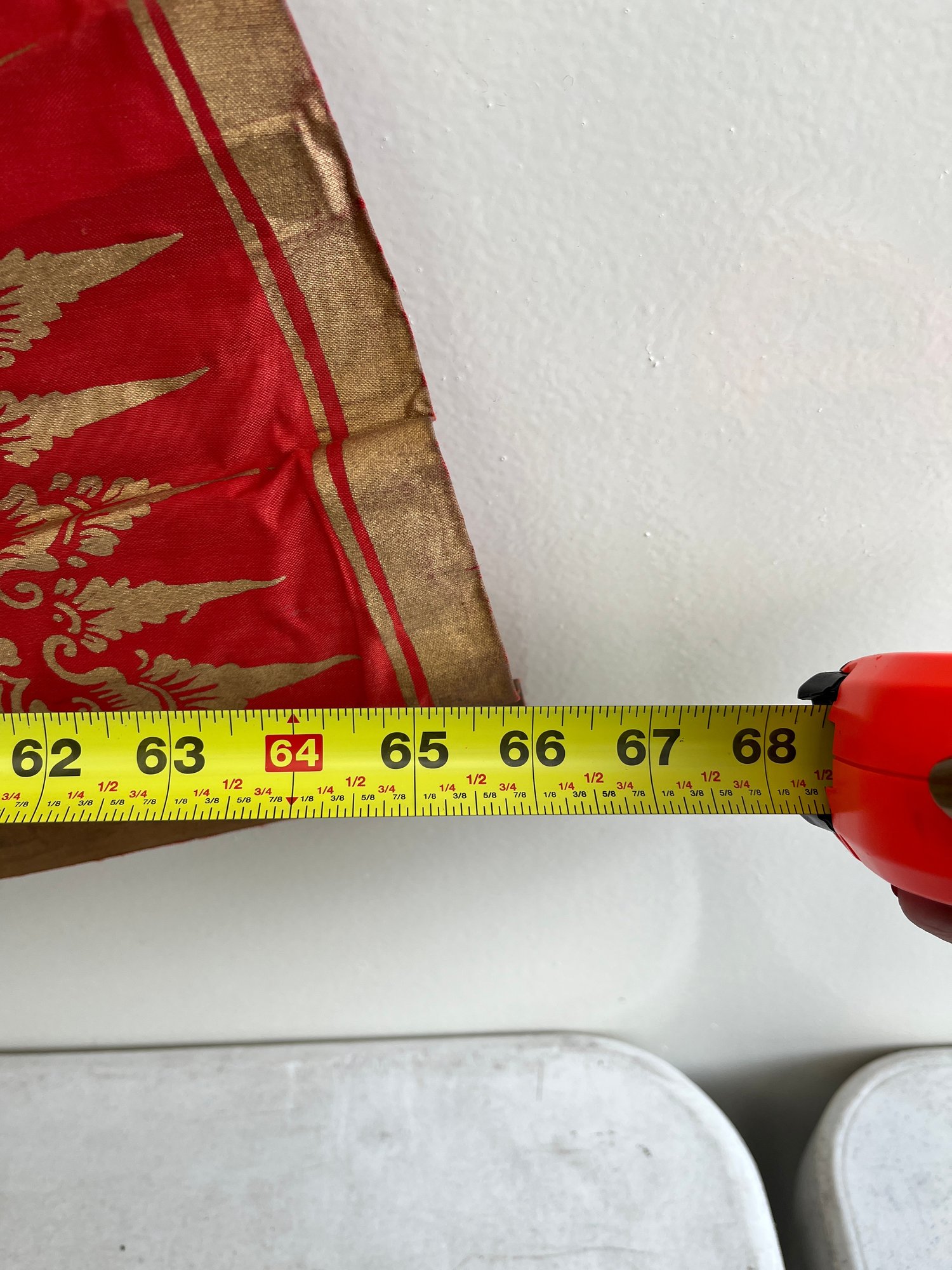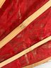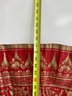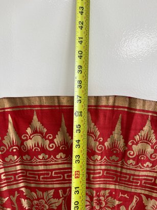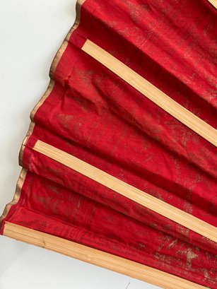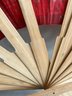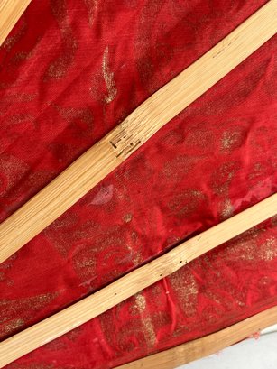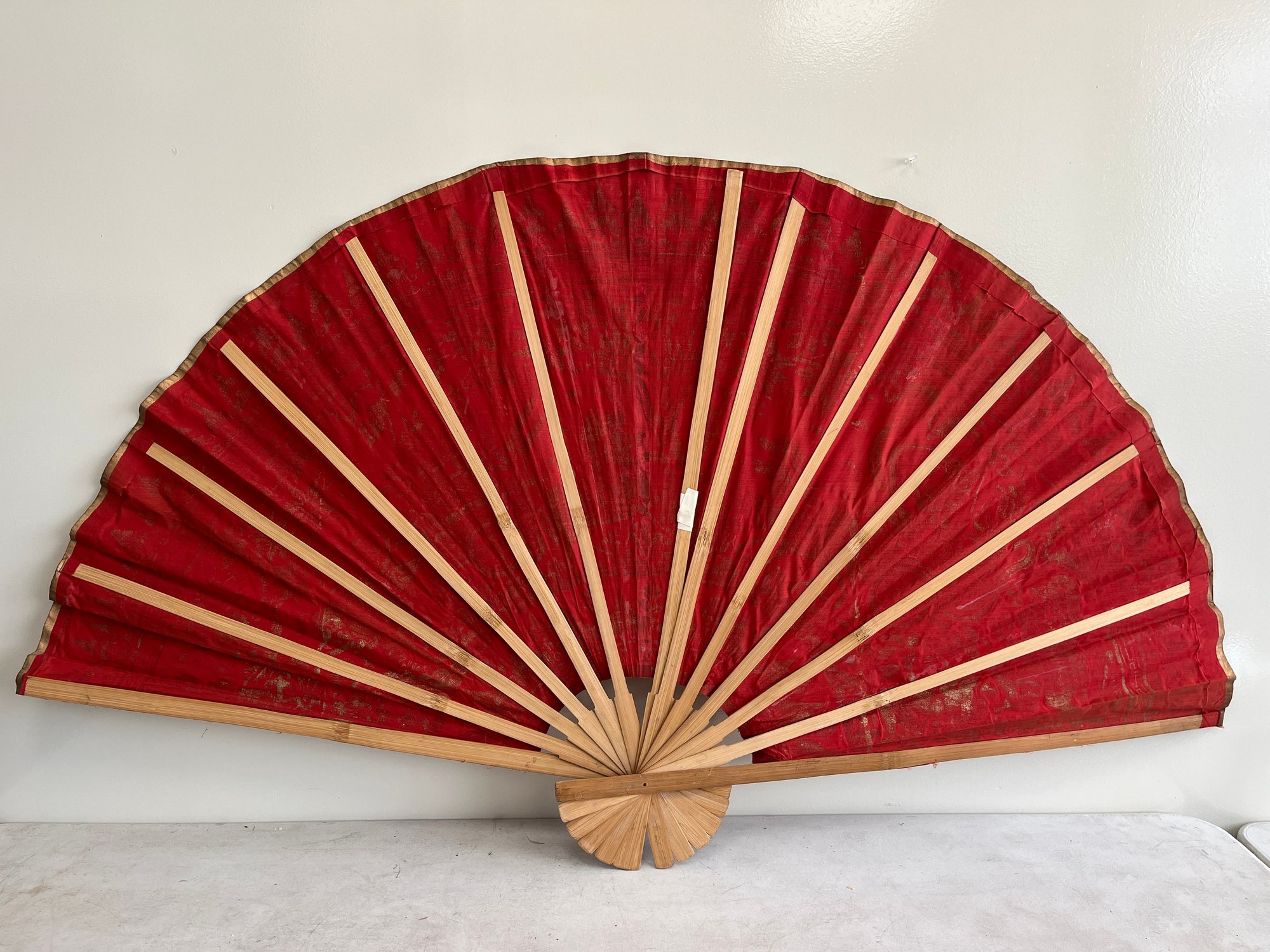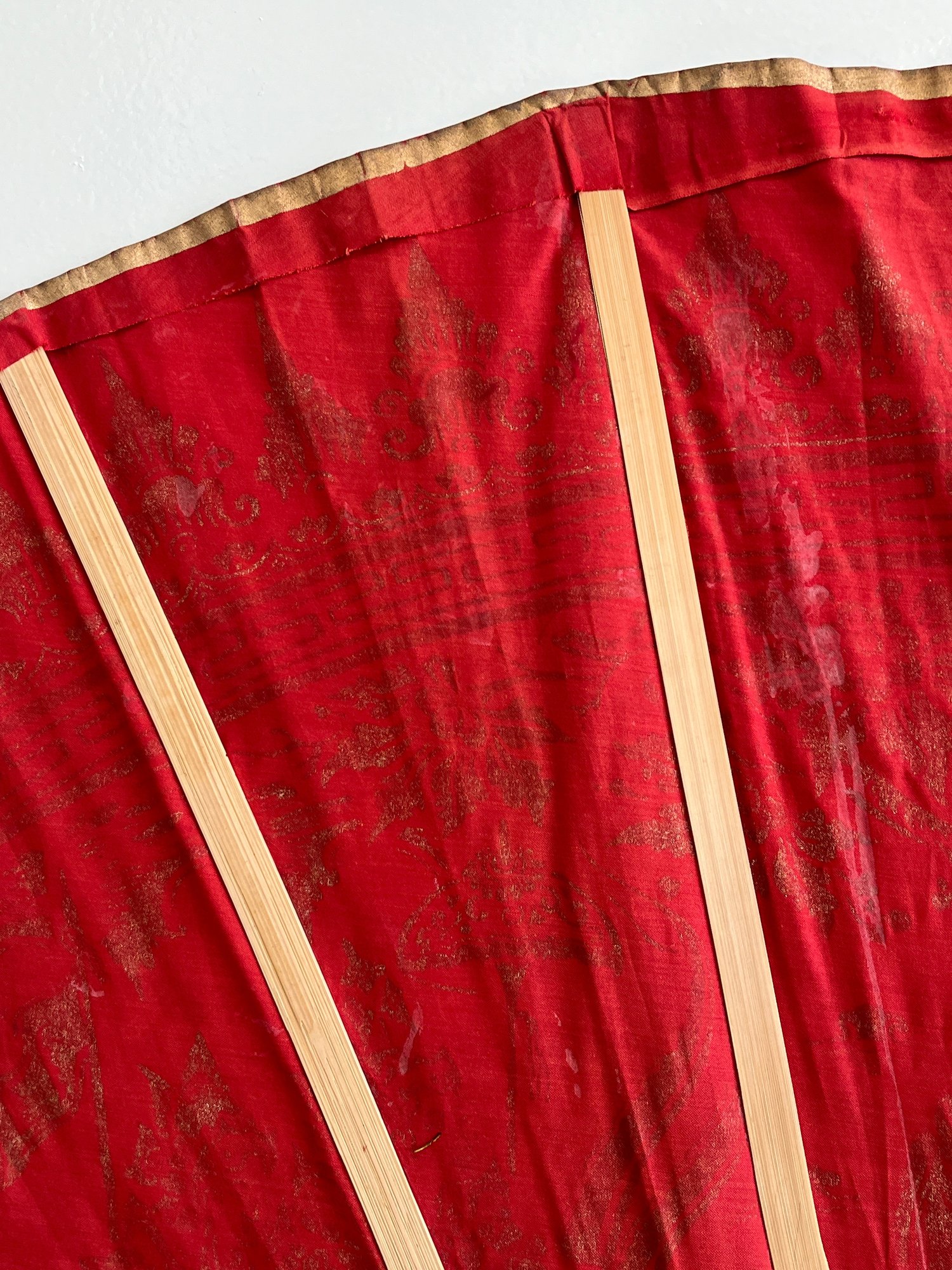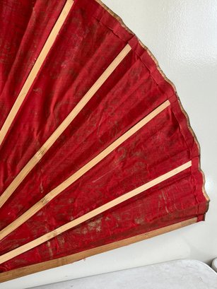 This striking, large-scale folding fan is an elaborate decorative piece, likely originating from Bali, Indonesia. It is designed primarily for wall display. A rich red background serves as the canvas for intricate gilt decoration, applied using gold paint or leaf. The detailed artwork is executed in a traditional Balinese style, reminiscent of Wayang (shadow puppet) theatre characters. The dynamic scene depicts mythological figures, possibly from the Ramayana epic, interspersed with stylized foliage and architectural elements.
