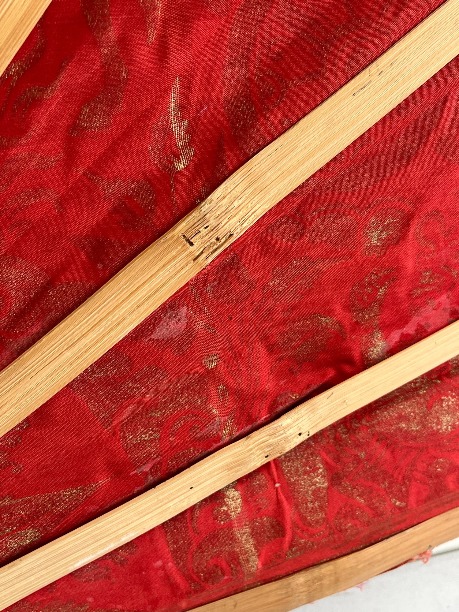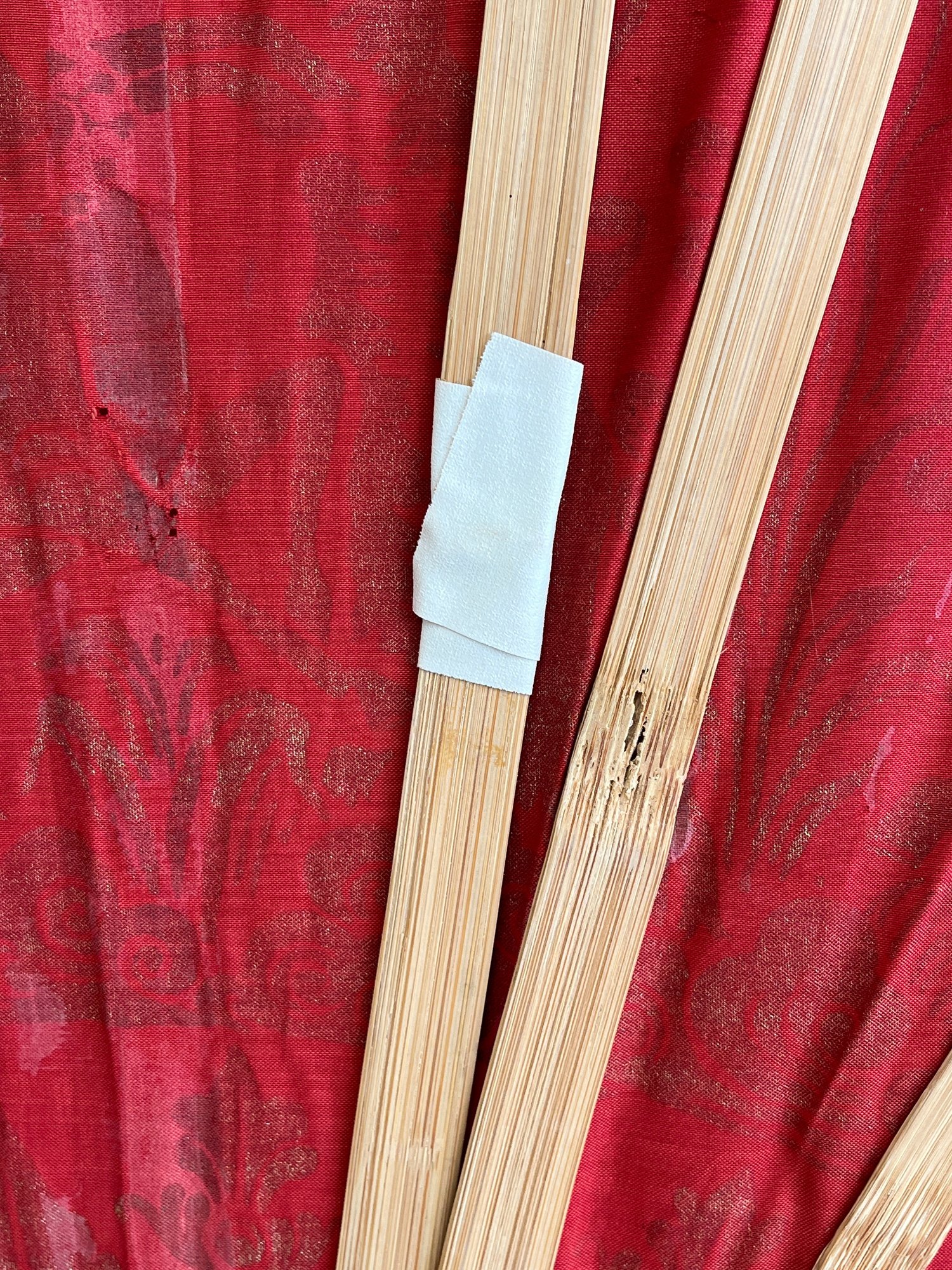 There is some minor splintering of the wooden portion in some areas which have been documented. Some temporary repairs have been made previously to this item with tape, as pictured.