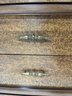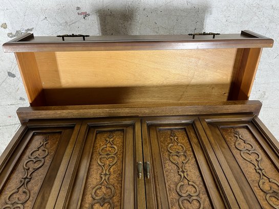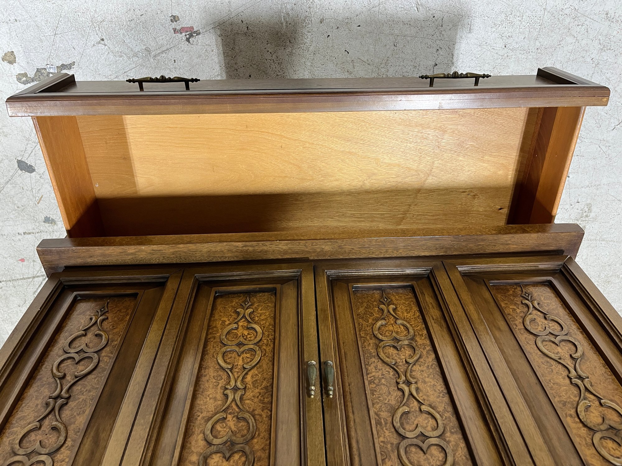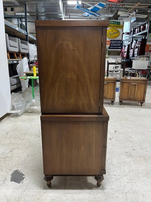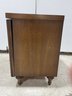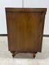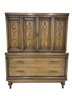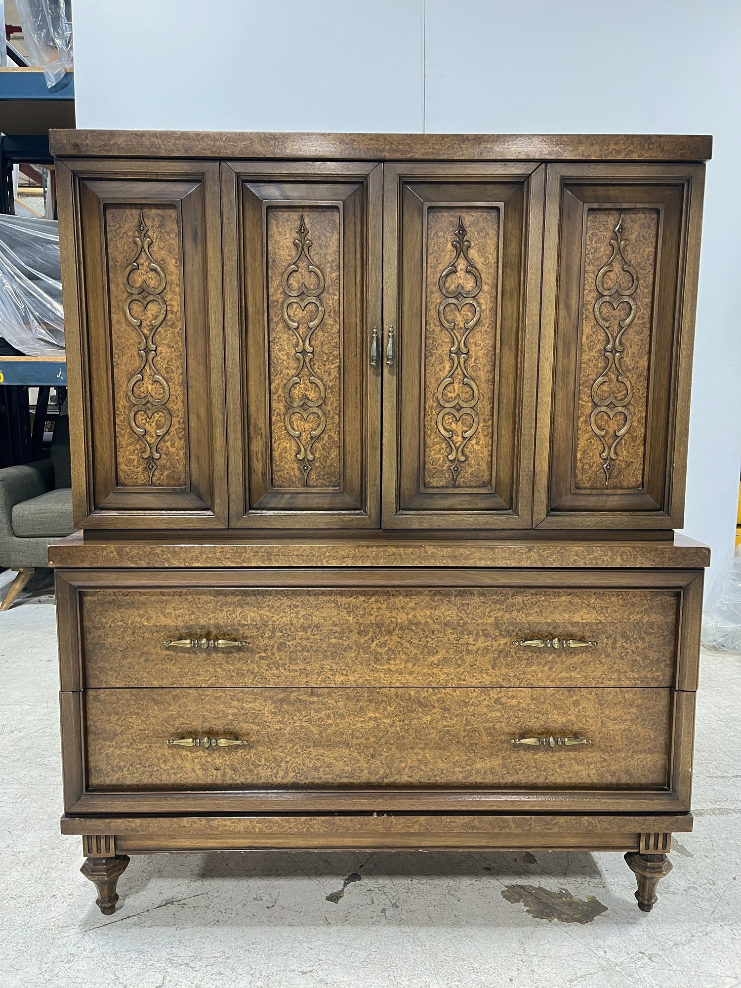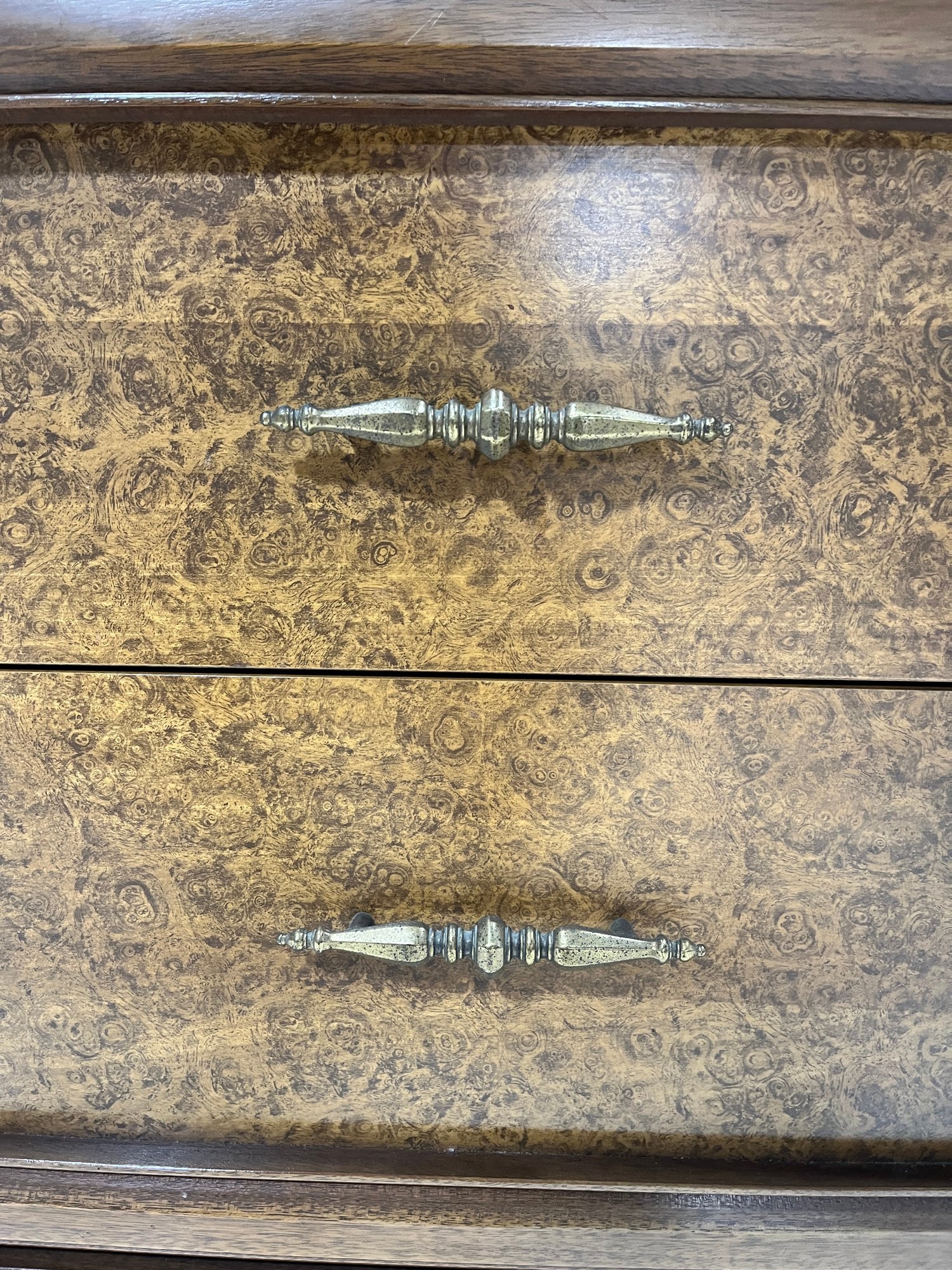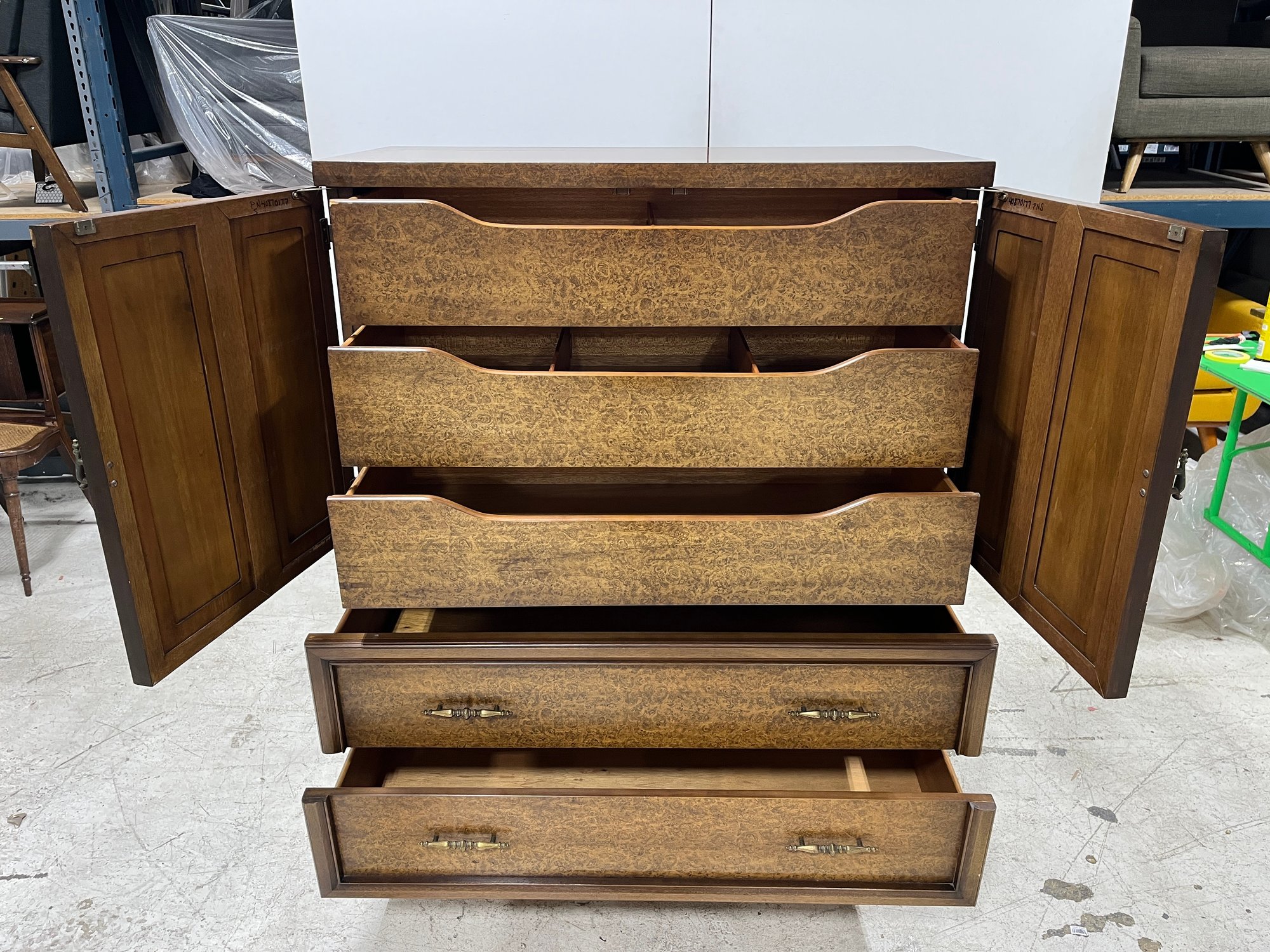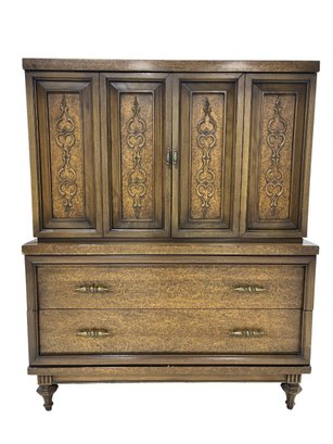 This sophisticated three-piece Mid-Century Mediterranean Revival bedroom suite features a commanding gentleman’s chest and two matching nightstands. The upper cabinet of the chest opens to reveal tiered storage, while the lower section offers two expansive drawers accented by antiqued brass-finish pulls. Each piece is grounded by elegant, tapered spade feet, providing a lightened silhouette to the substantial, rich-toned construction. Perfectly blending 1960s craftsmanship with Old World elegance, this set serves as a timeless focal point for the curated vintage interior.