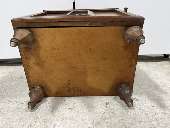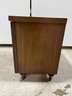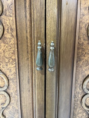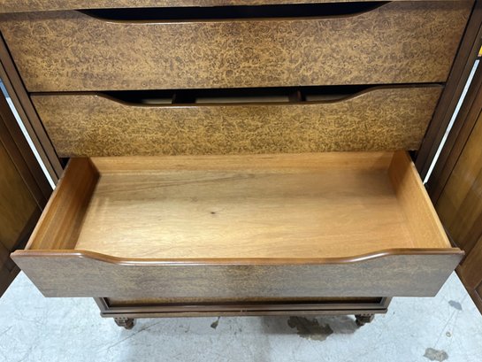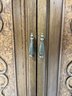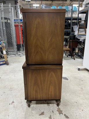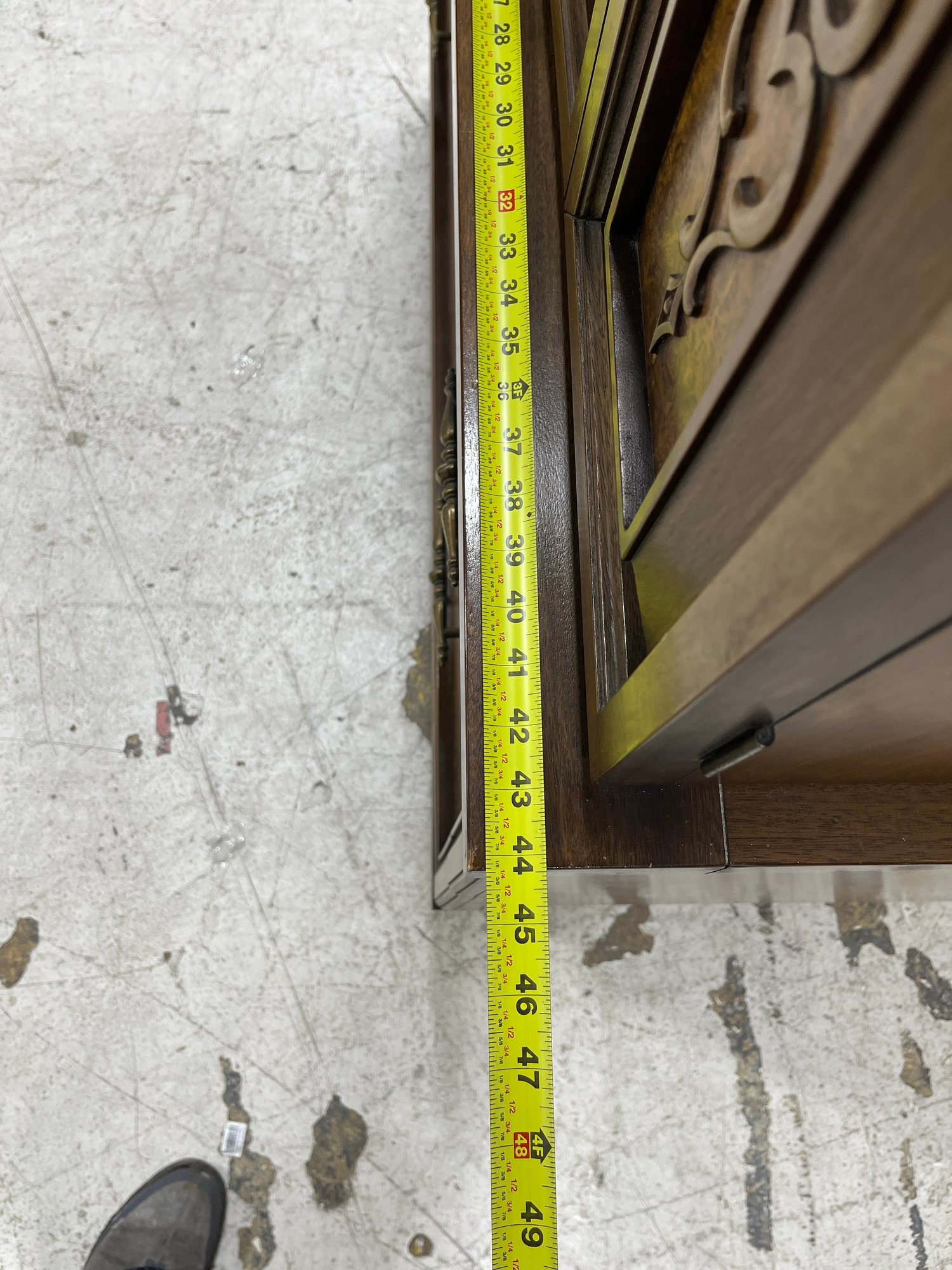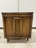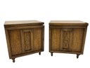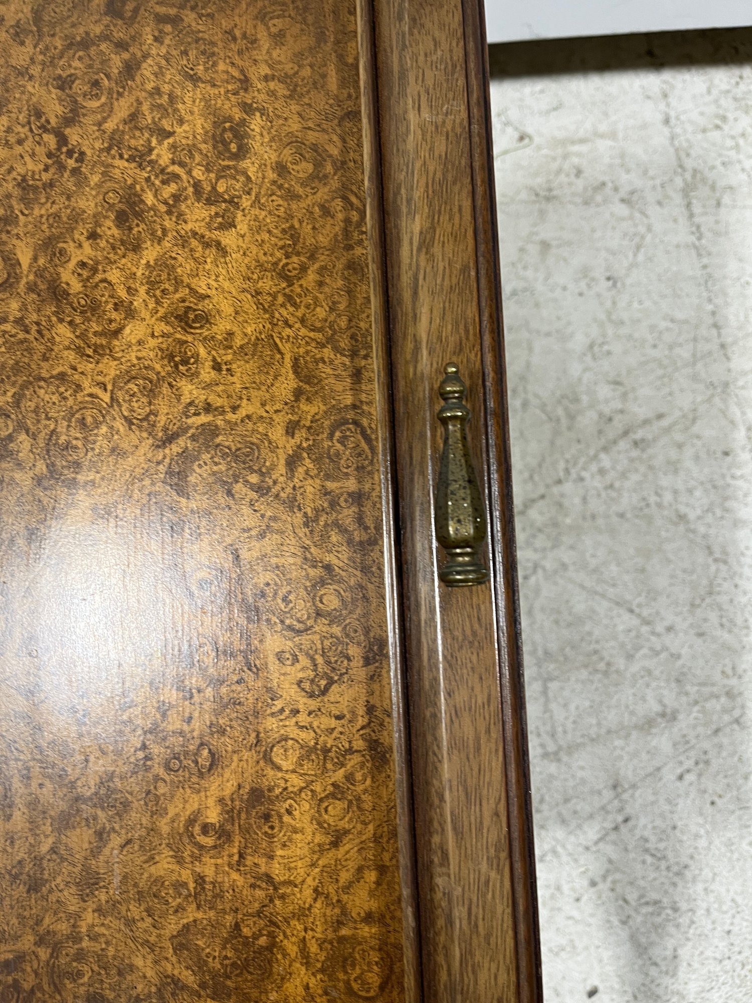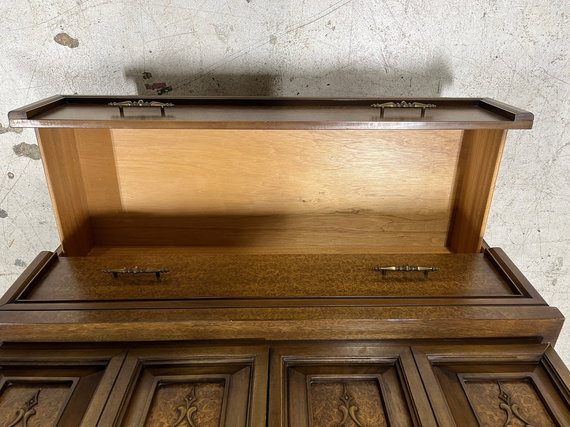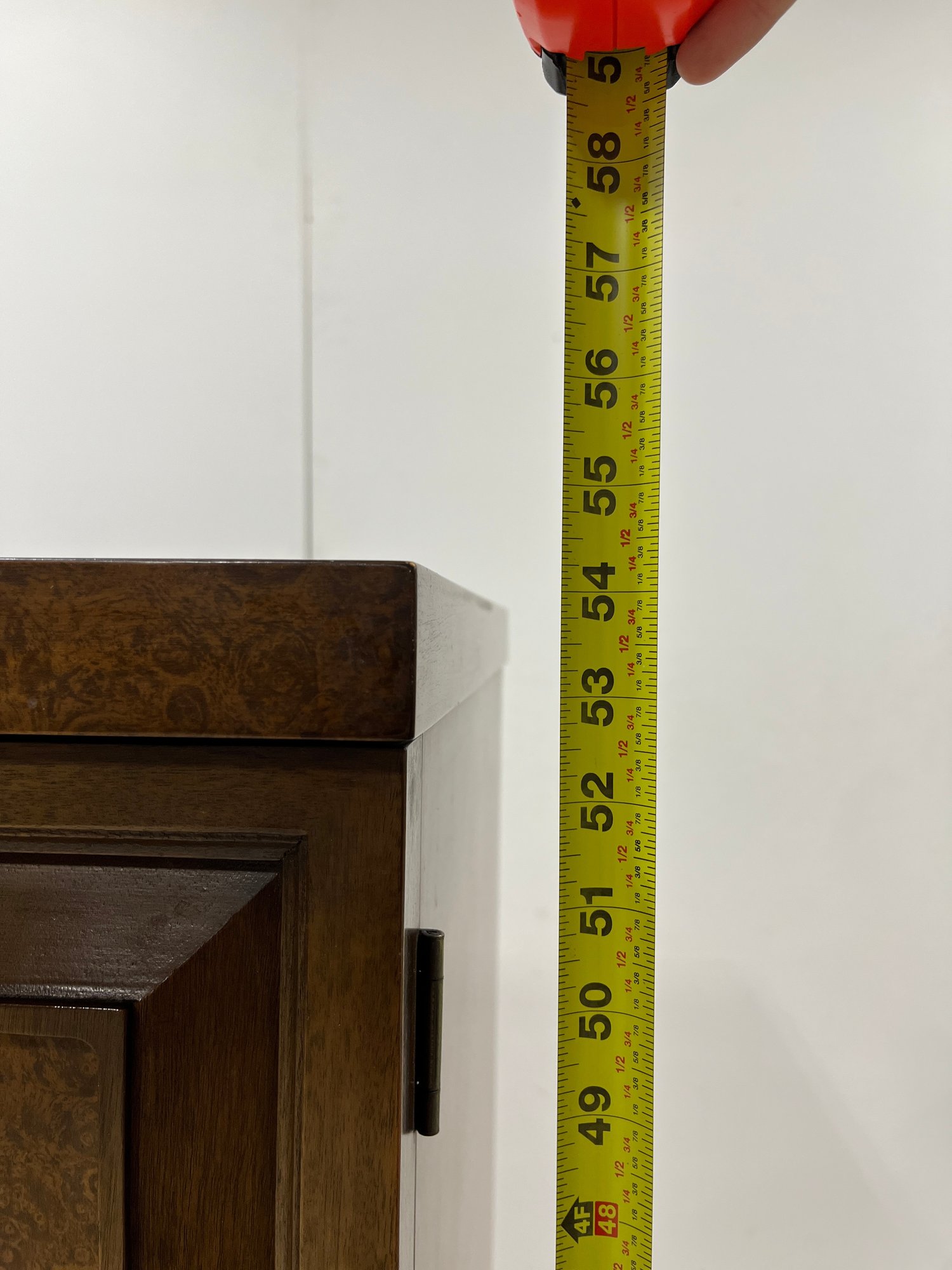 This sophisticated three-piece Mid-Century Mediterranean Revival bedroom suite features a commanding gentleman’s chest and two matching nightstands. The upper cabinet of the chest opens to reveal tiered storage, while the lower section offers two expansive drawers accented by antiqued brass-finish pulls. Each piece is grounded by elegant, tapered spade feet, providing a lightened silhouette to the substantial, rich-toned construction. Perfectly blending 1960s craftsmanship with Old World elegance, this set serves as a timeless focal point for the curated vintage interior.