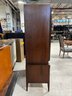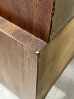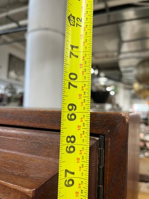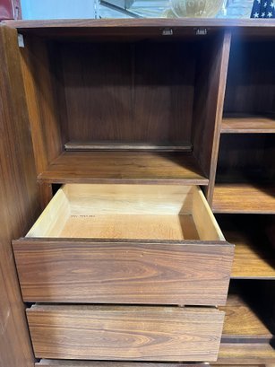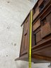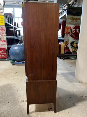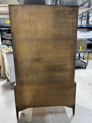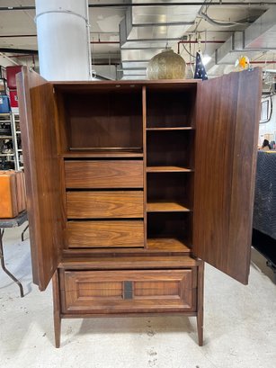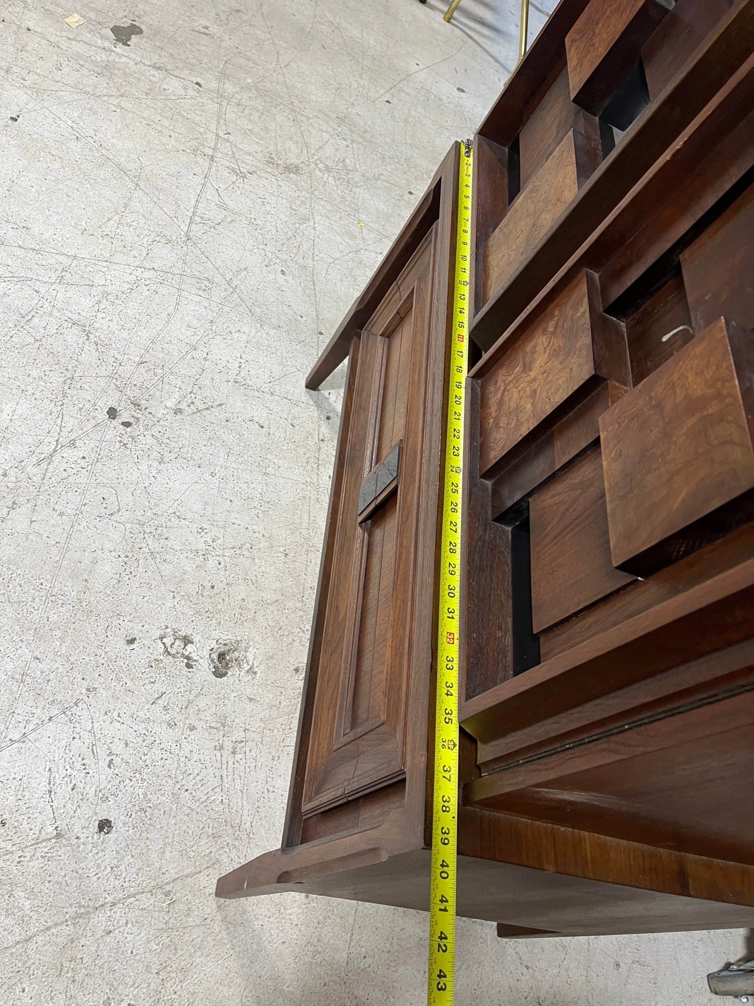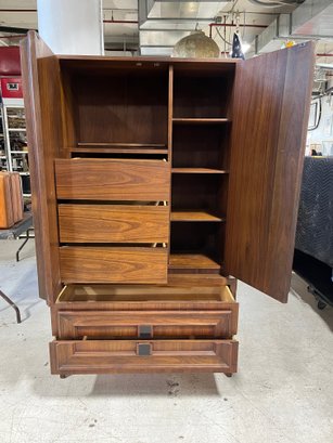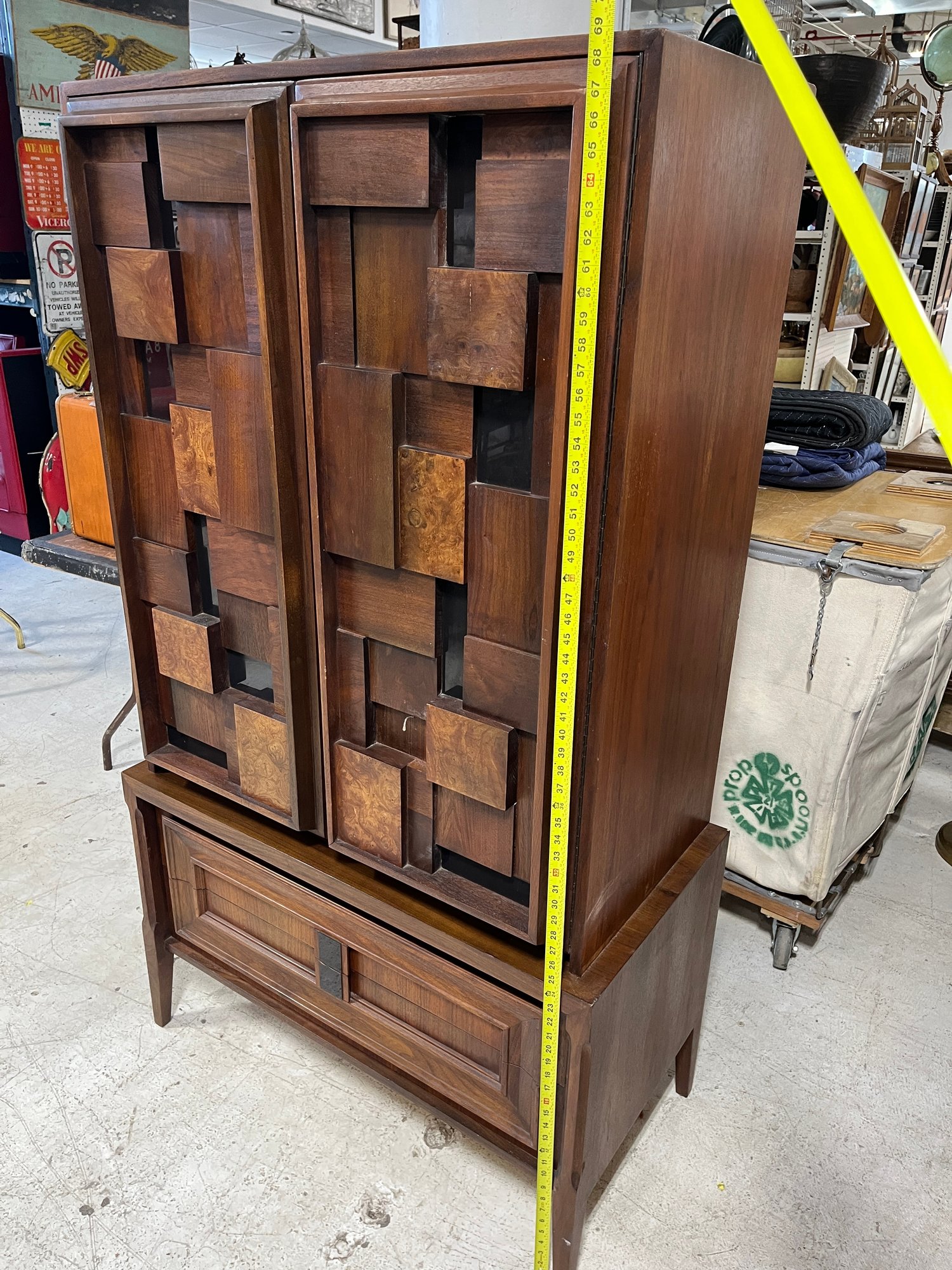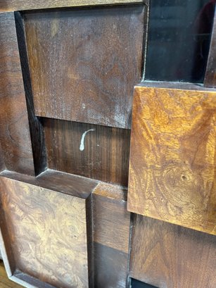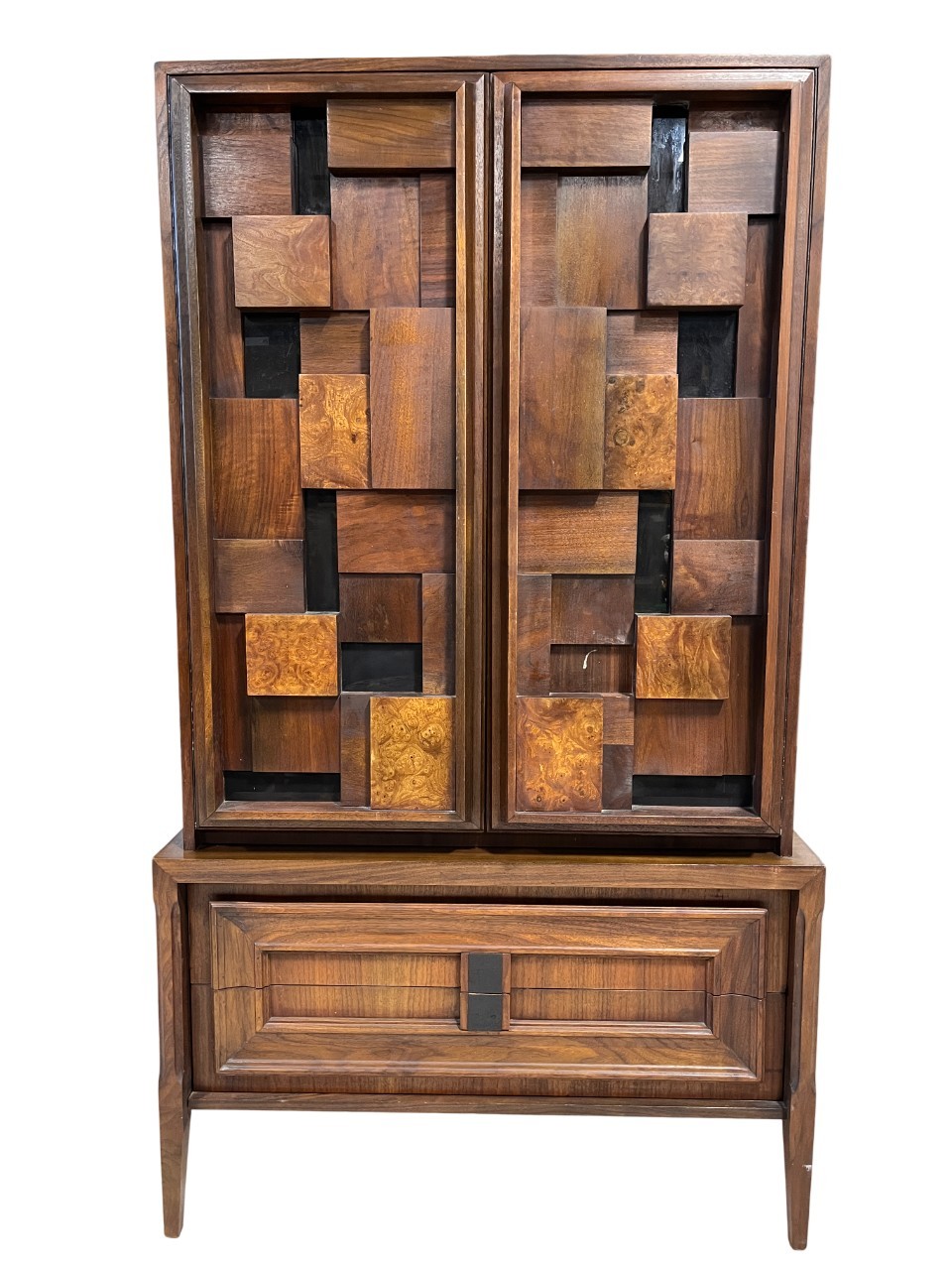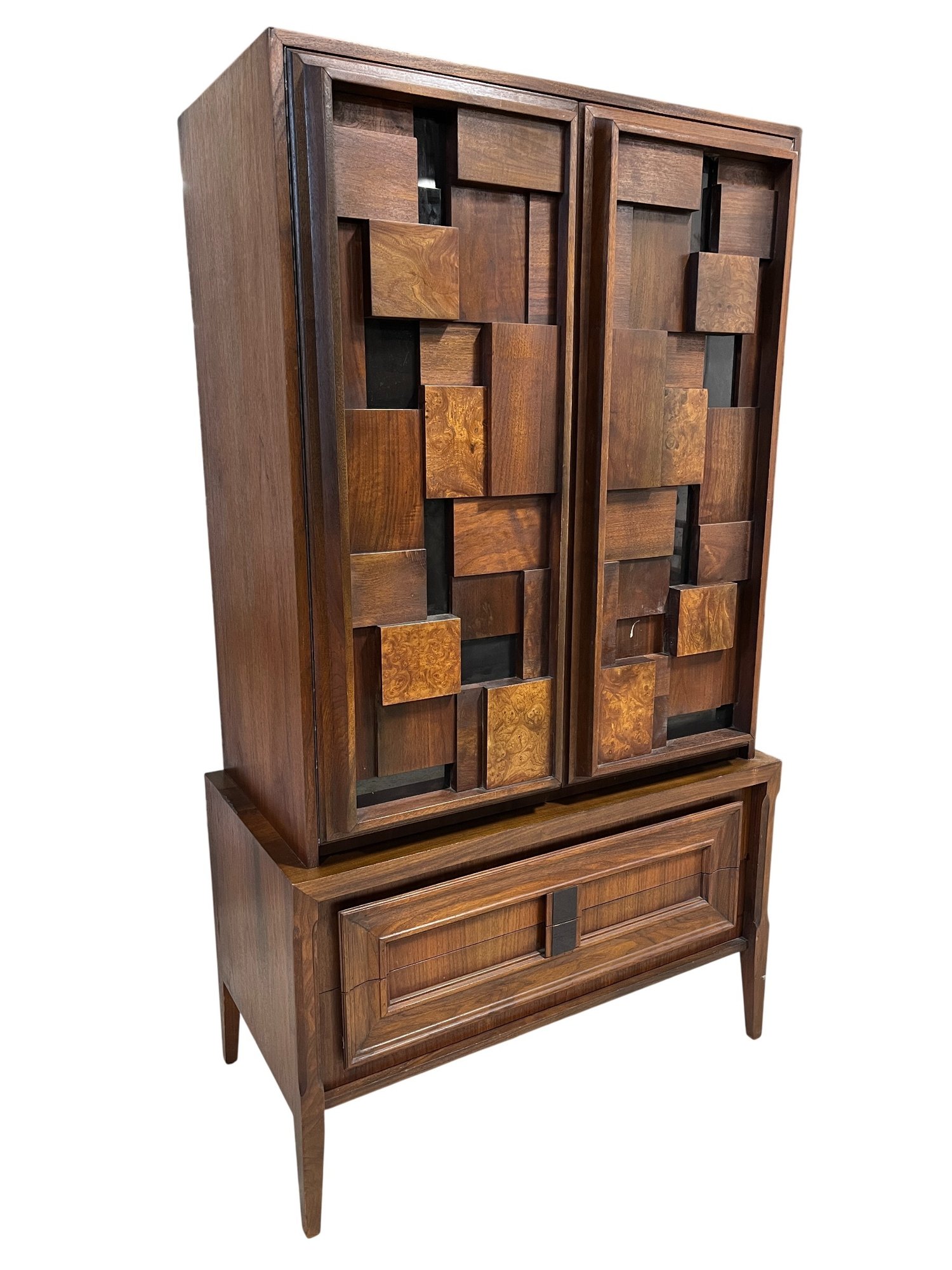 This monumental armoire celebrates the design concepts central to the Brutalist movement. The focus of its design remains entirely on its sculptural facade, a rhythmic mosaic of hand-laid wood blocks that transforms a functional storage unit into a work of abstract art. The upper cabinet section rests securely on a lower dresser base, a common "Highboy" configuration of the era. The upper doors open to reveal a spacious interior, fitted with additional shelving and internal smaller drawers.
