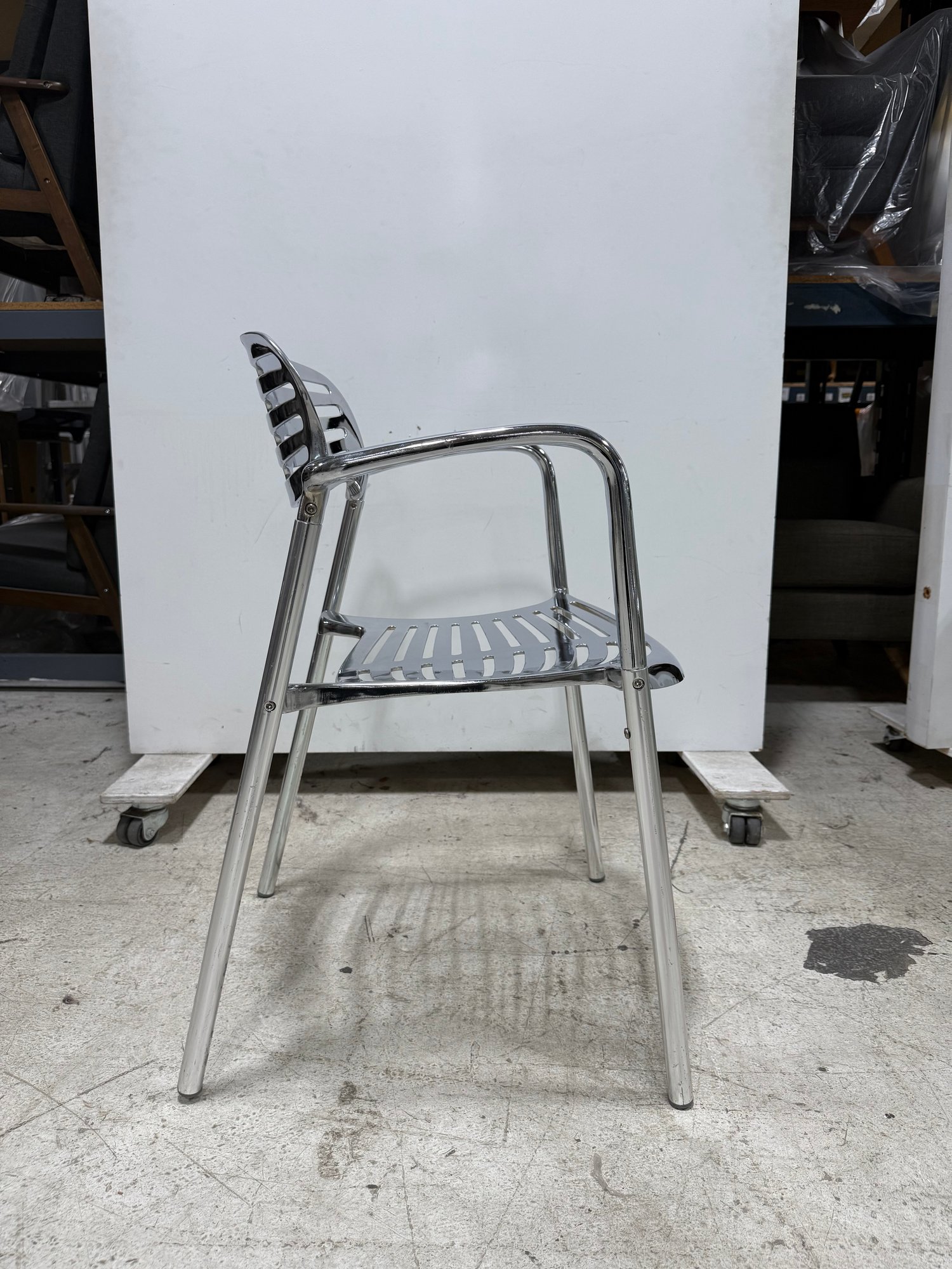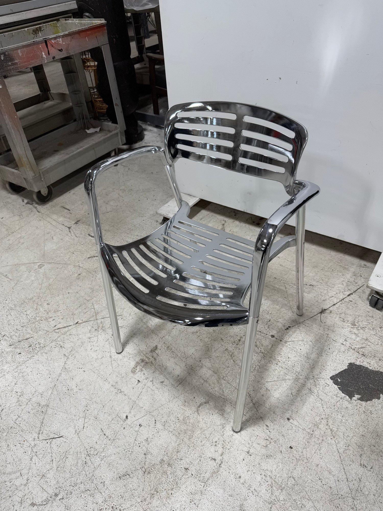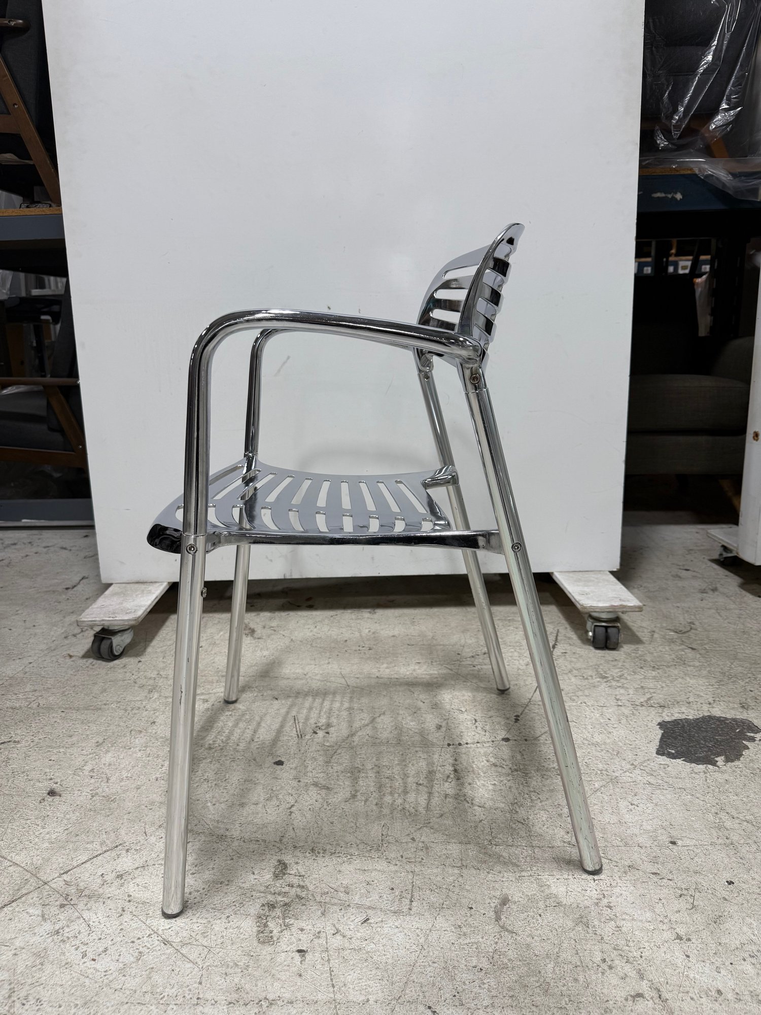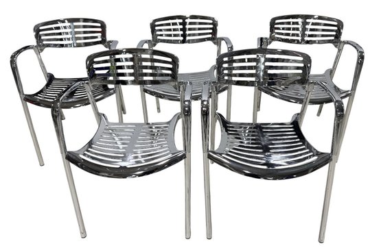 An icon of modern design, the Toledo chair is a reinterpretation of the classic cafe terrace chair, blending timeless aesthetics with robust, modern materials. It is recognized globally and featured in permanent museum collections. This reproduction boasts a fluid combination of sculptural elegance and organic lines.