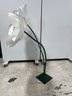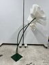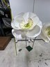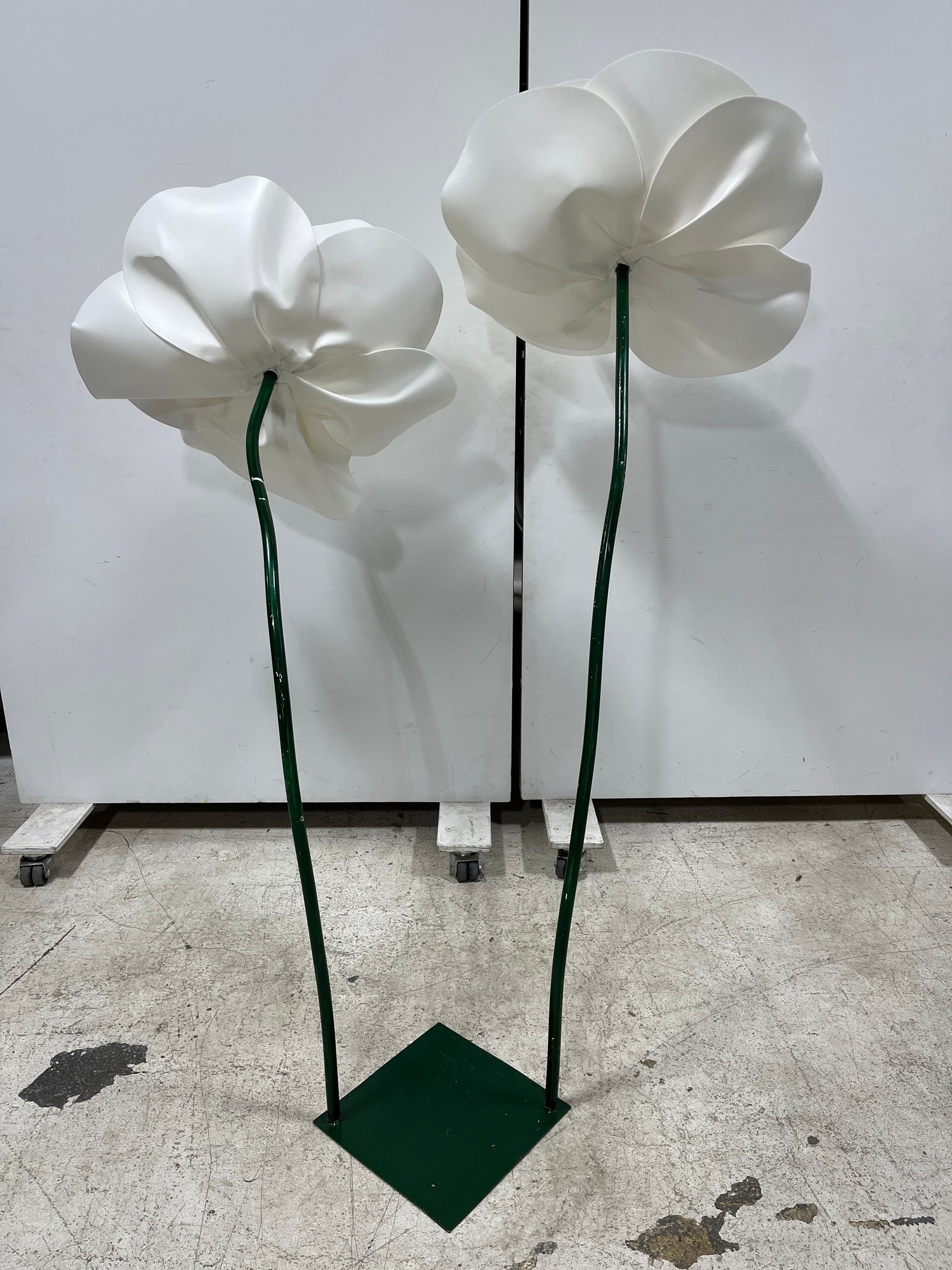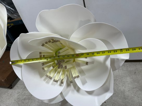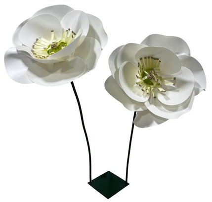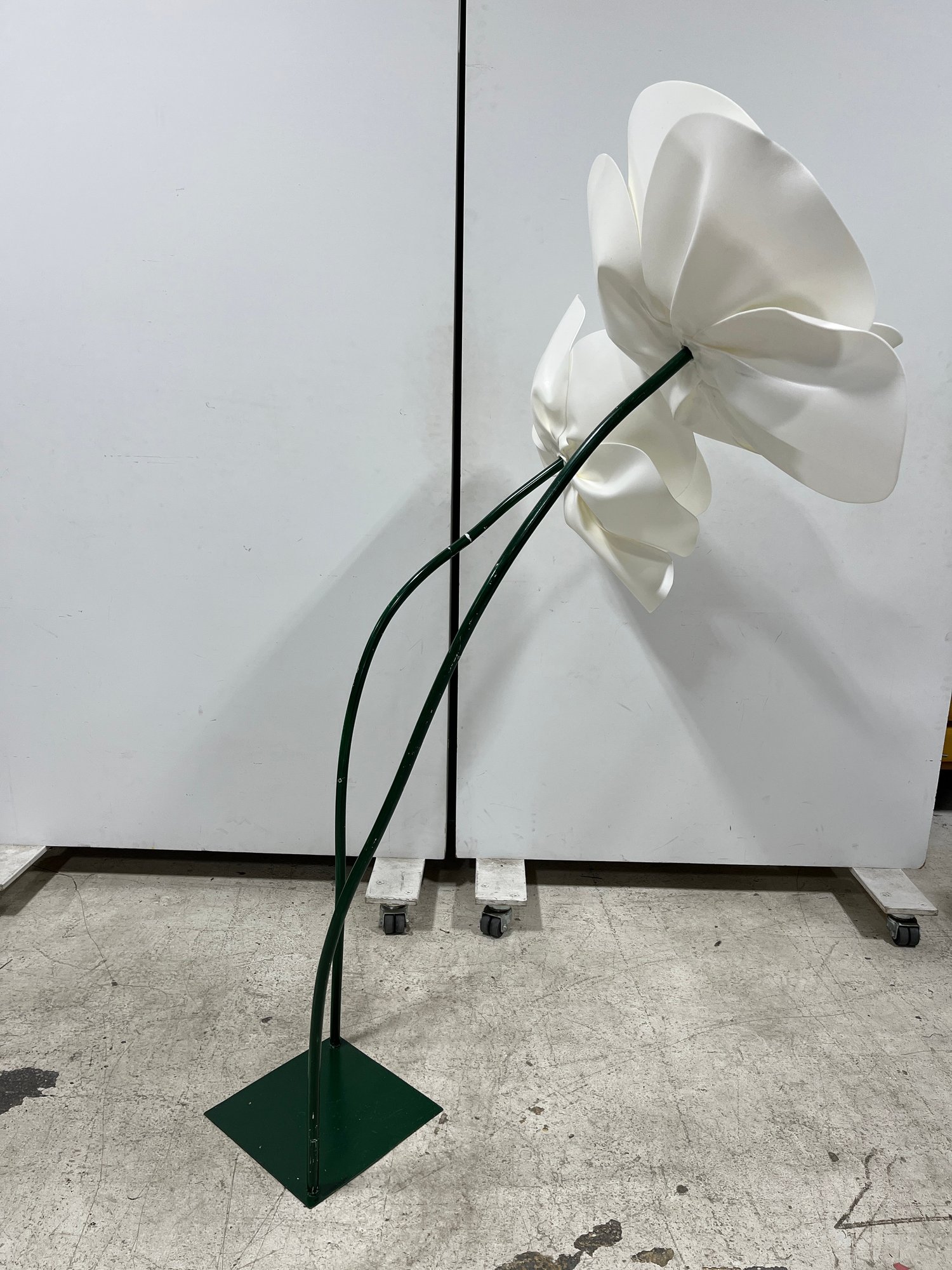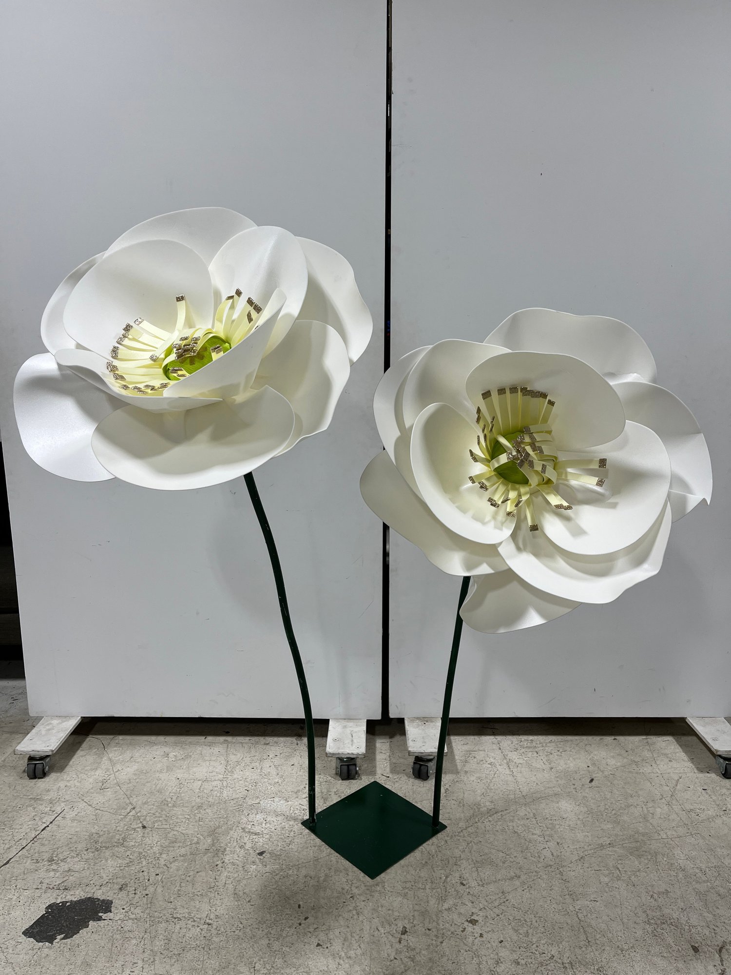 The actual flower and "petals" are constructed from soft foam. The flower head fits on the rods which can also be removed from their base. This entire arrangement can be deconstructed into three categories (flower head, stems, and base) for easy transport.