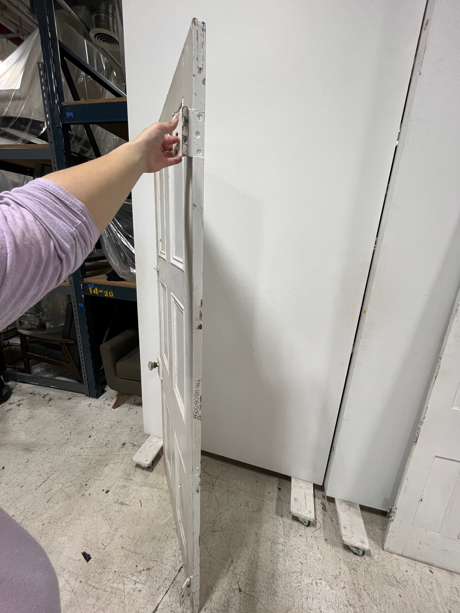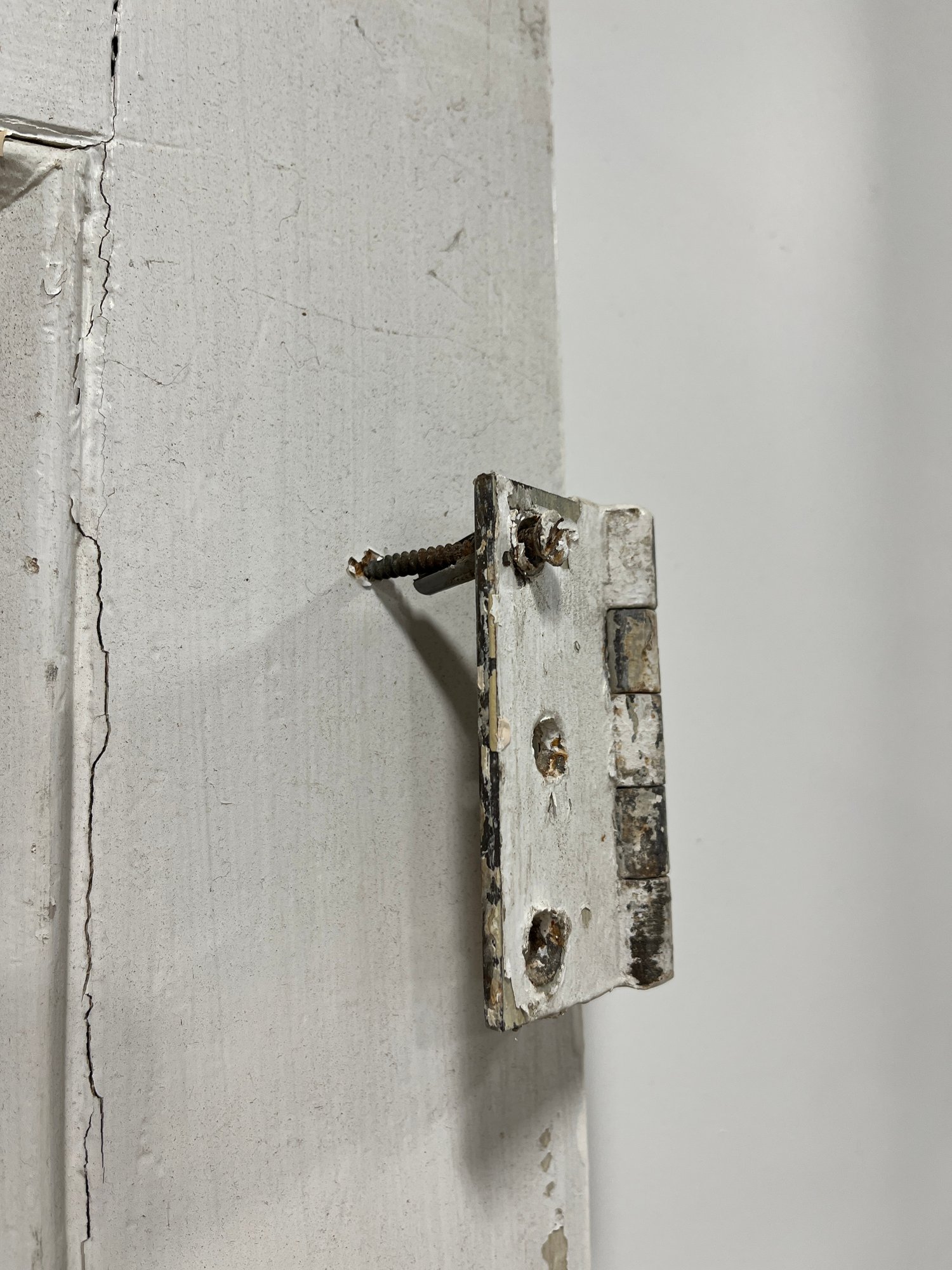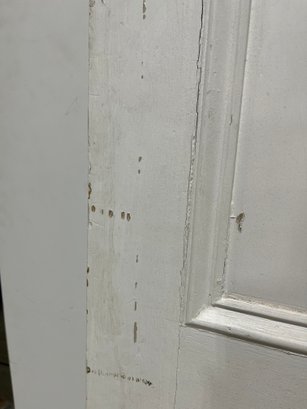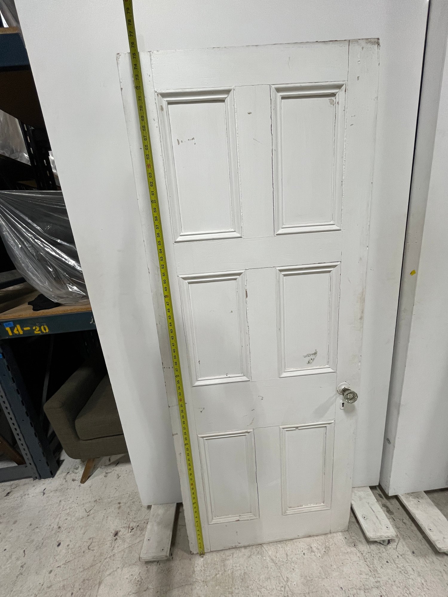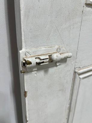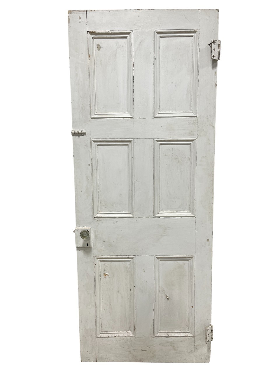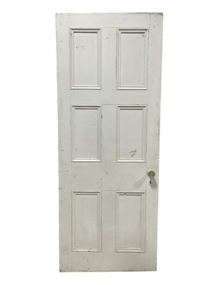 A standard interior passage door featuring a classic six-panel design. This door features two hinges and a sliding lock. Due to age and paint, the lock does not move.