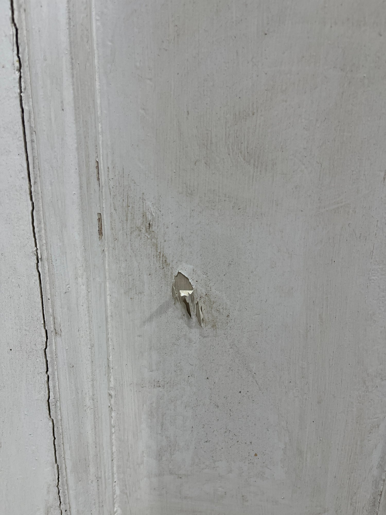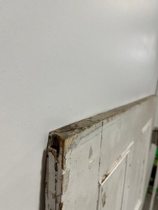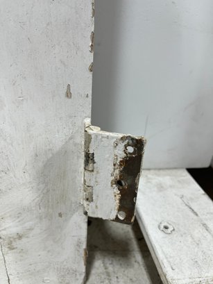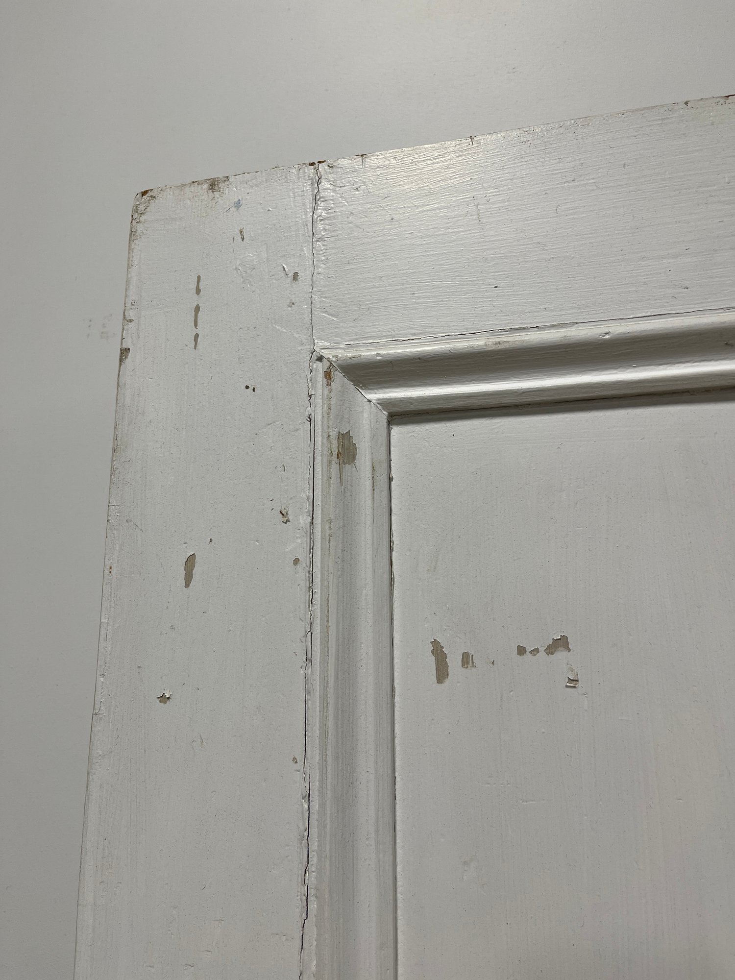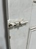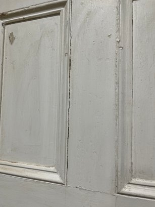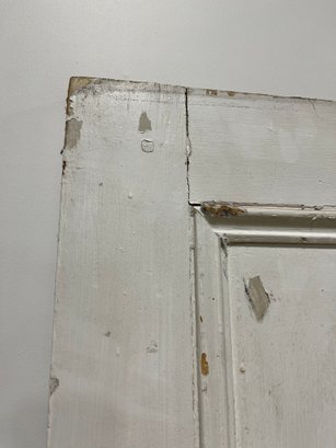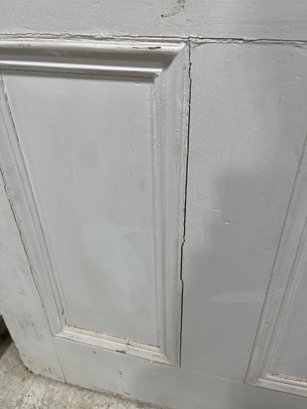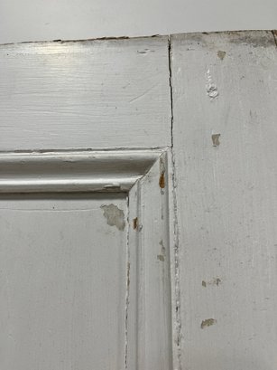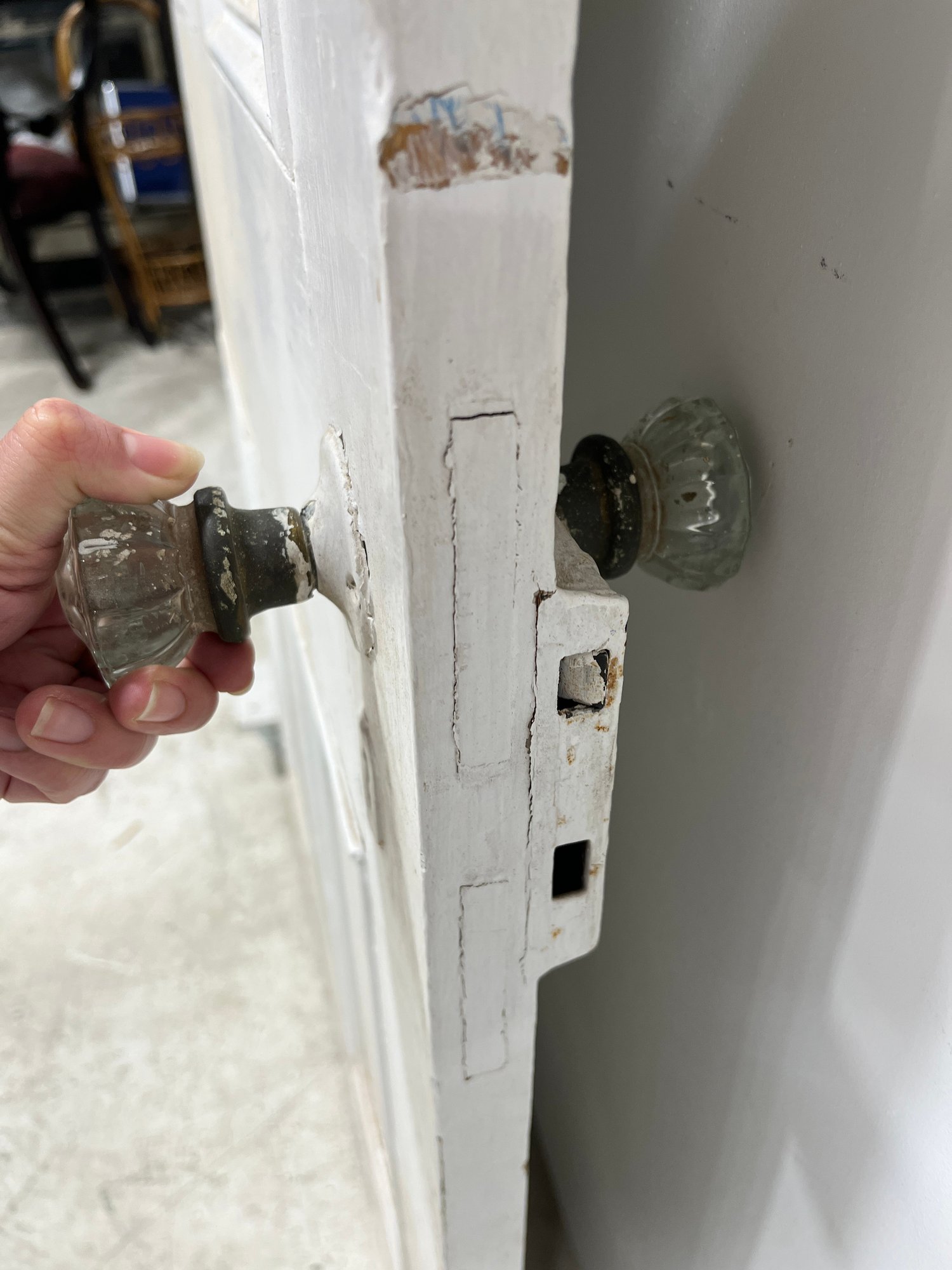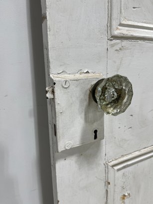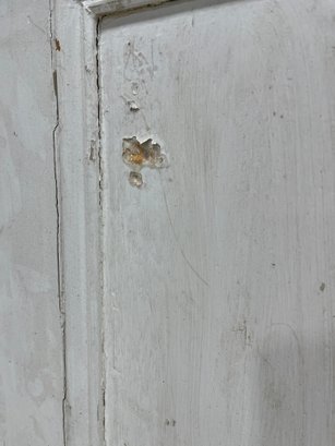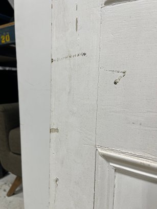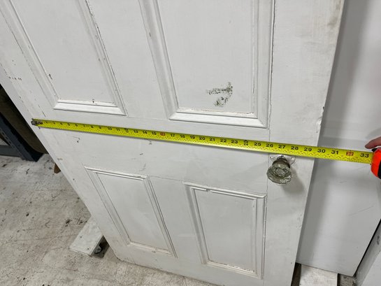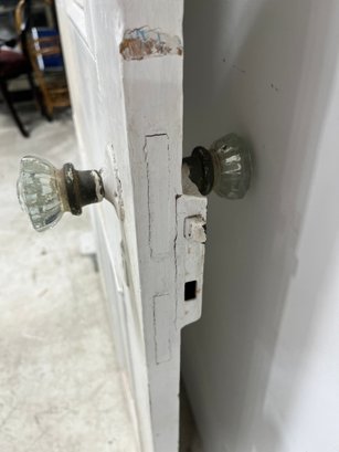A standard interior passage door featuring a classic six-panel design. This door features two hinges and a sliding lock. Due to age and paint, the lock does not move.