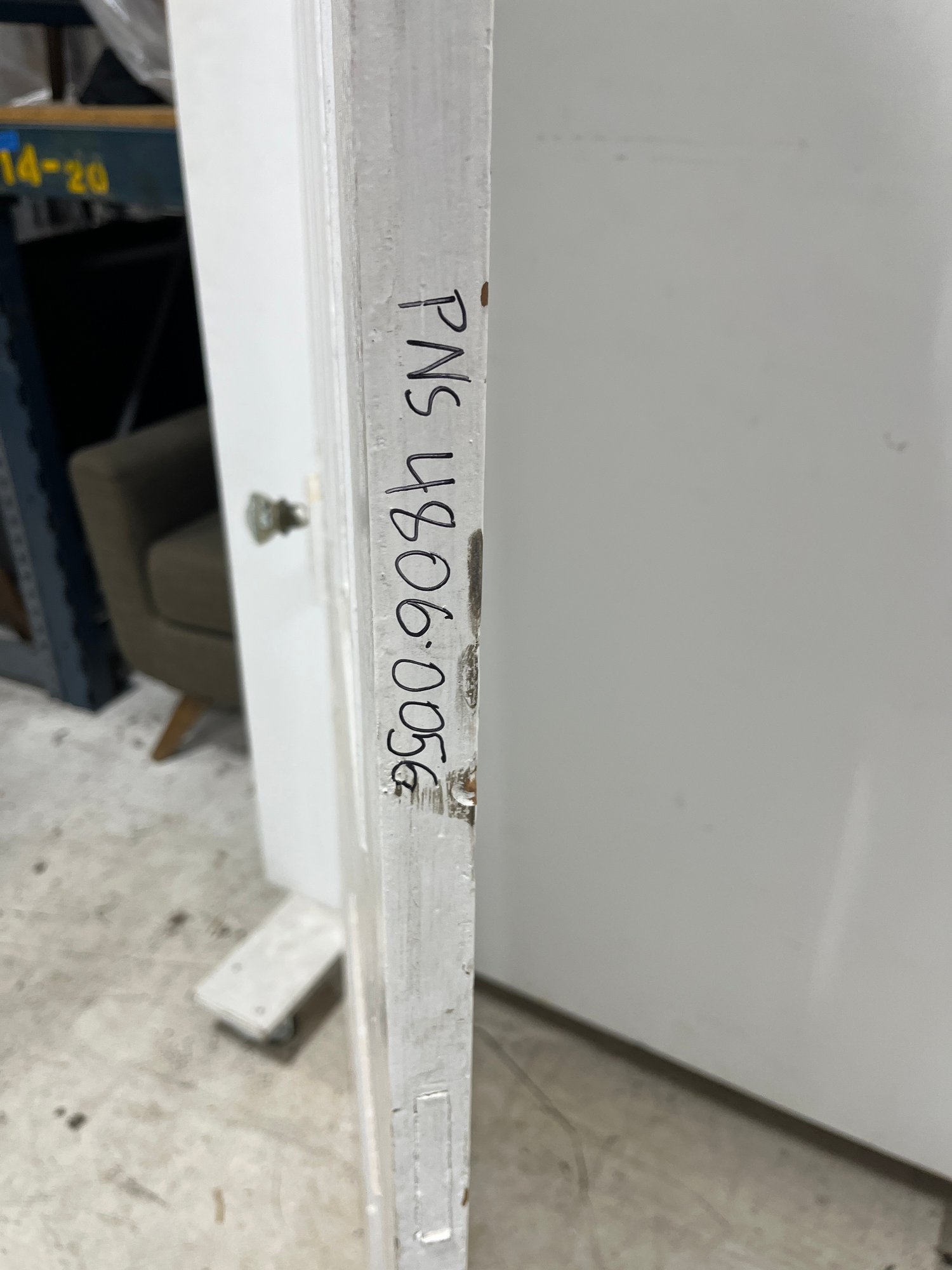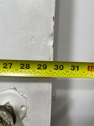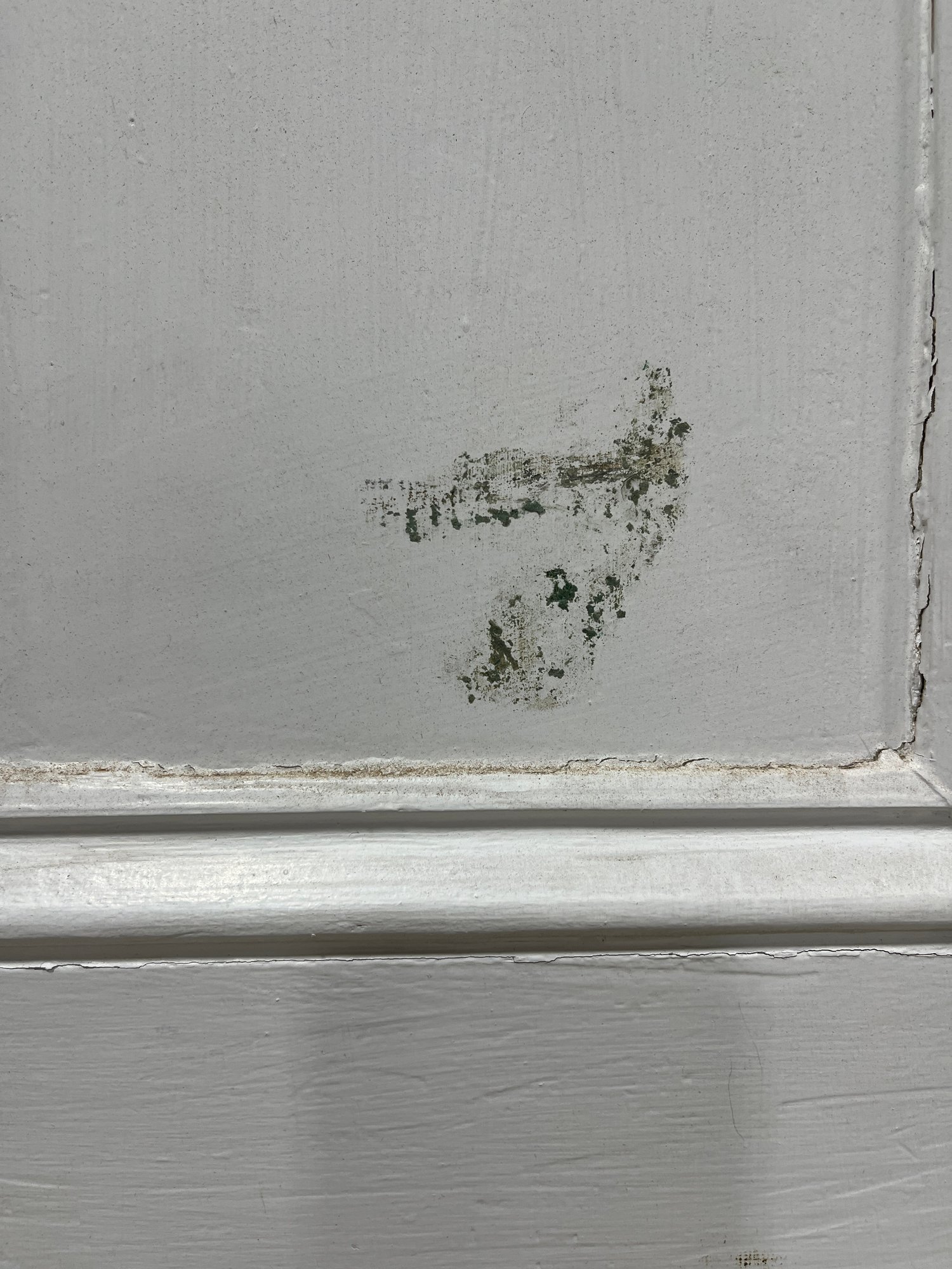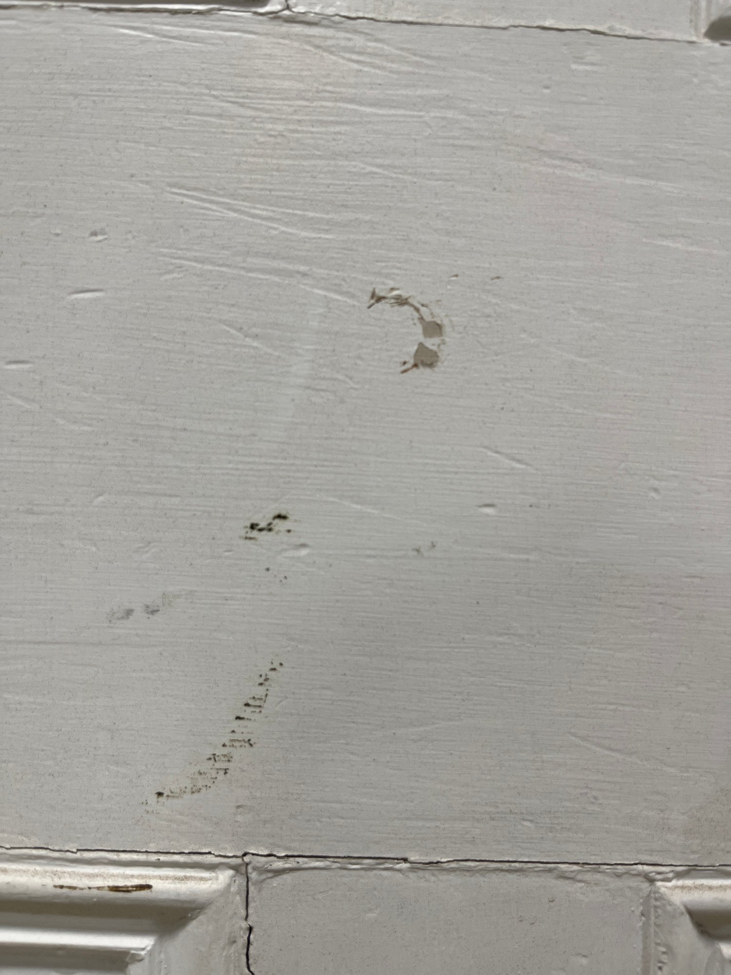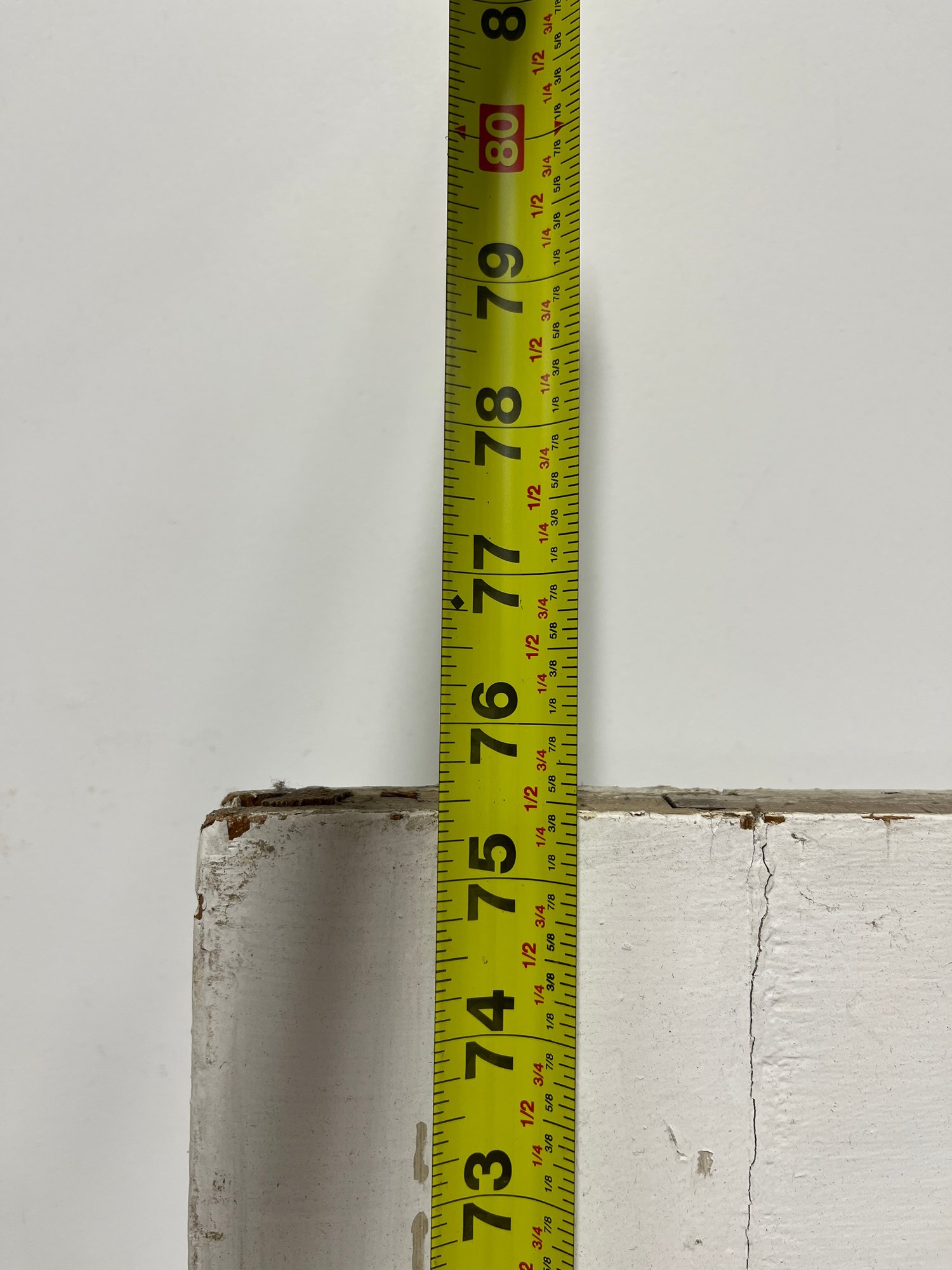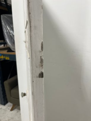 A standard interior passage door featuring a classic six-panel design. This door features two hinges and a sliding lock. Due to age and paint, the lock does not move.