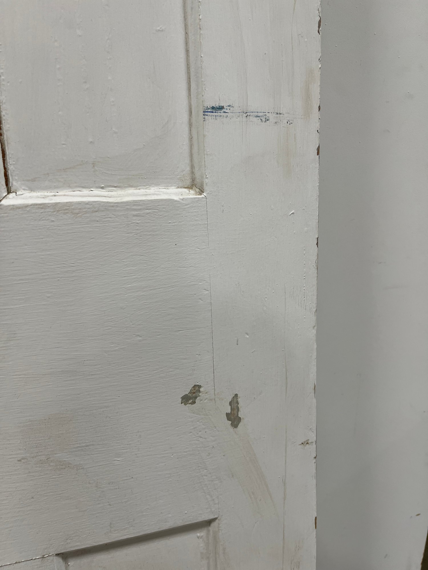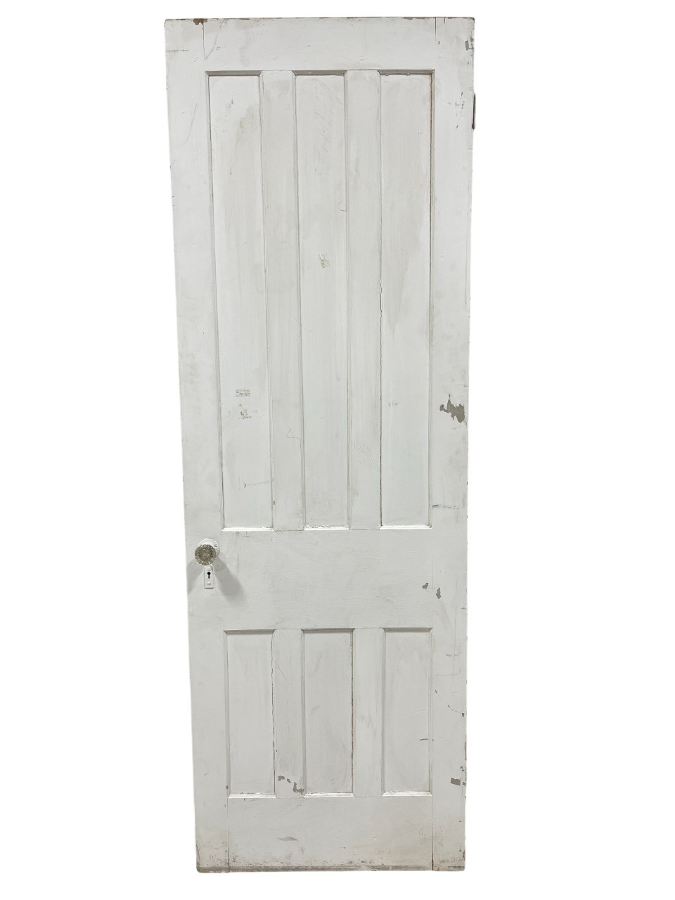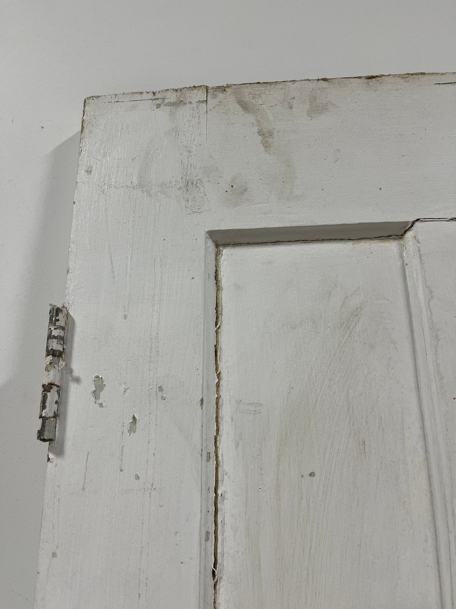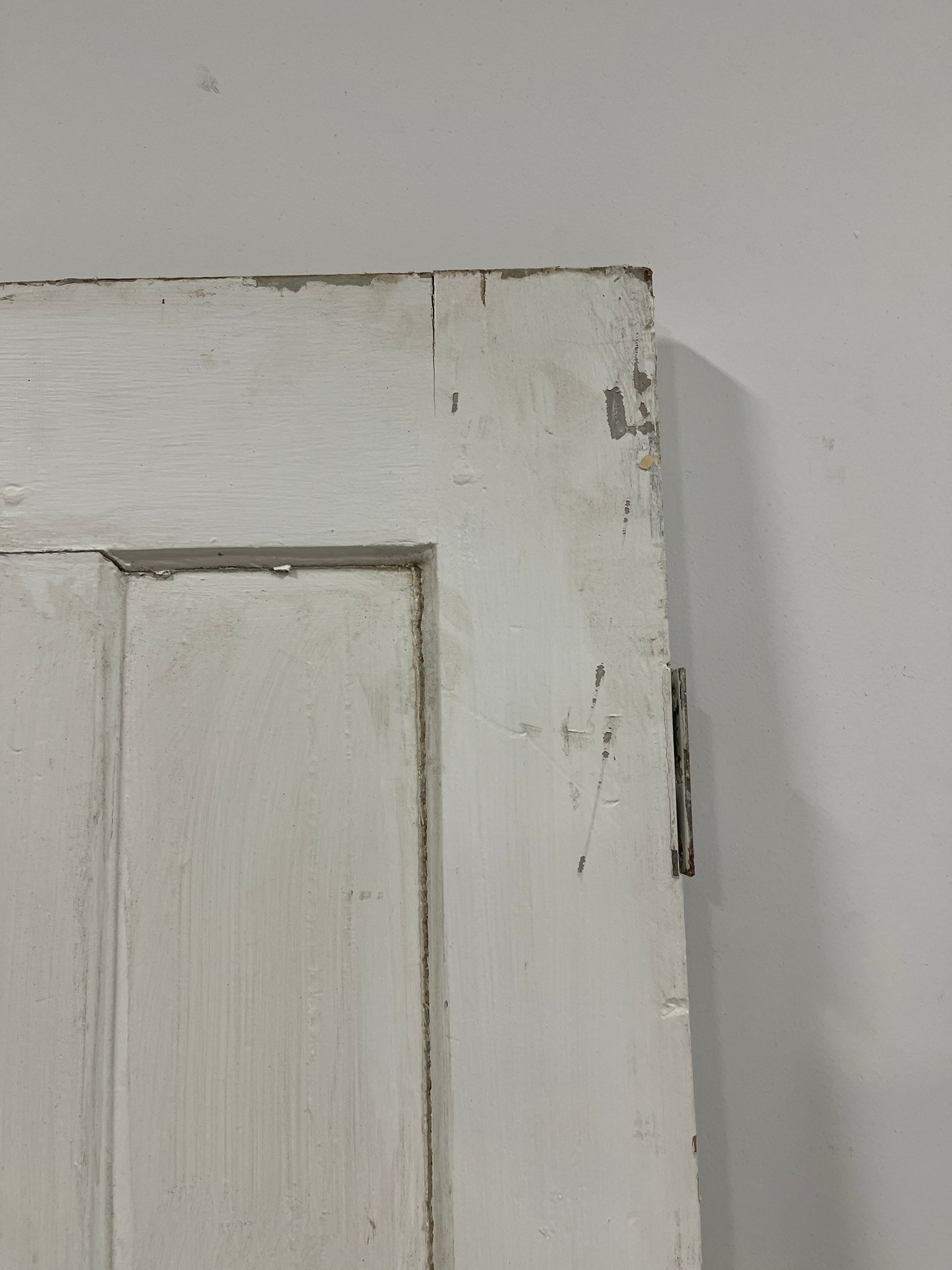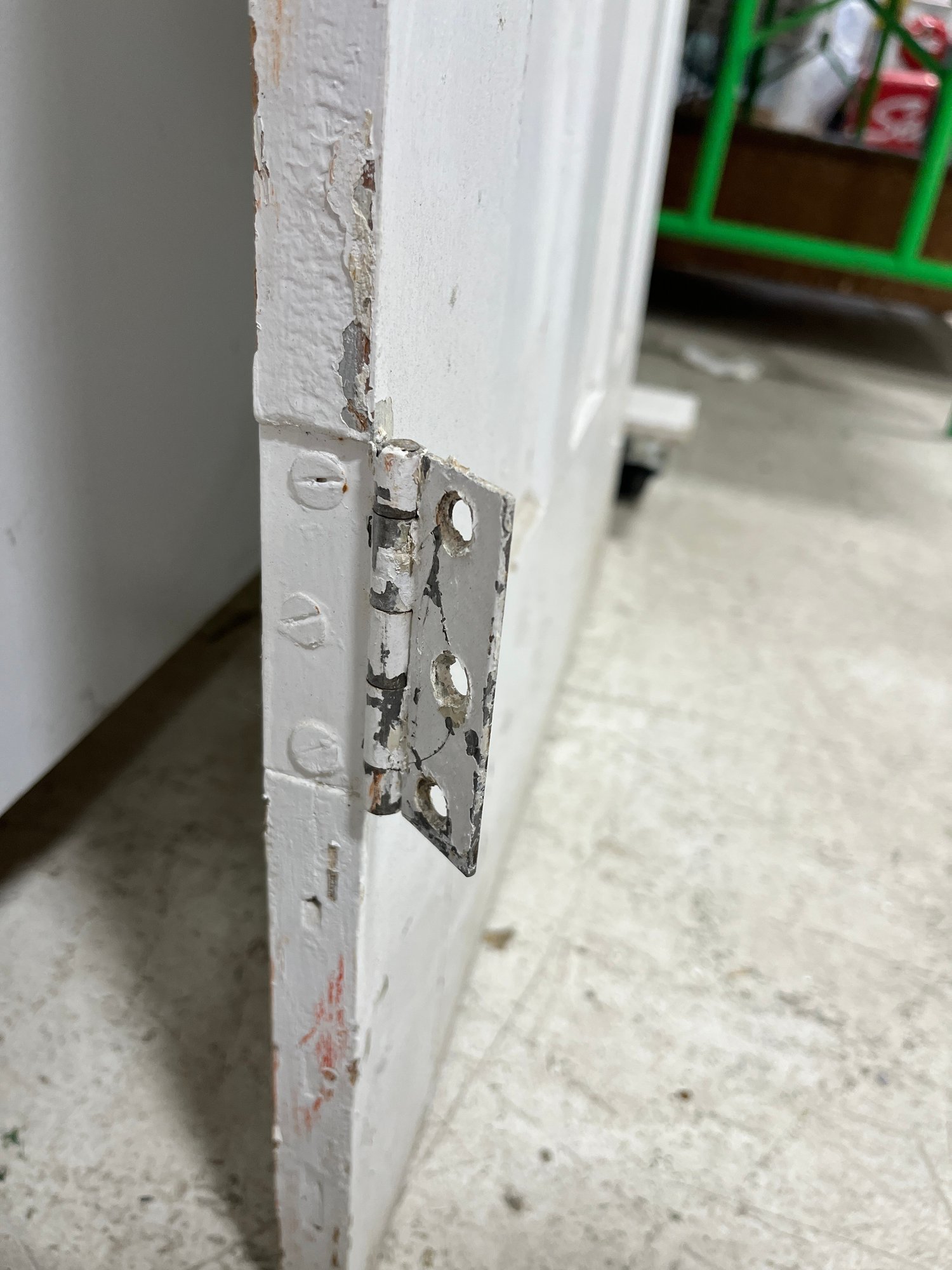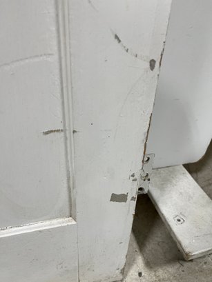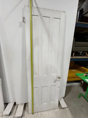 A standard interior passage door featuring a classic six-panel design. This door features two hinges. One hinge is missing the plate.