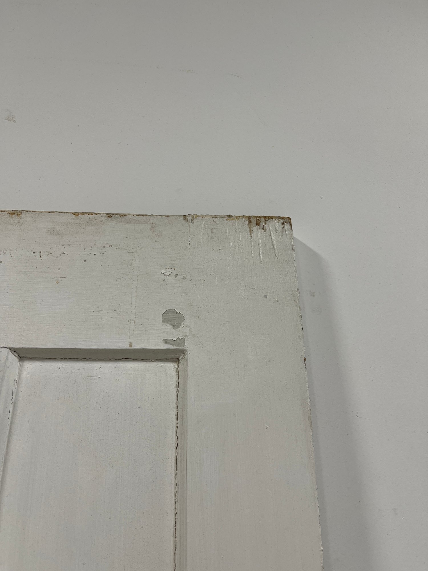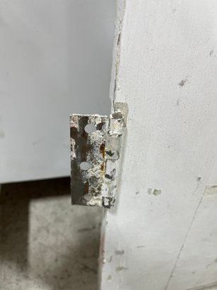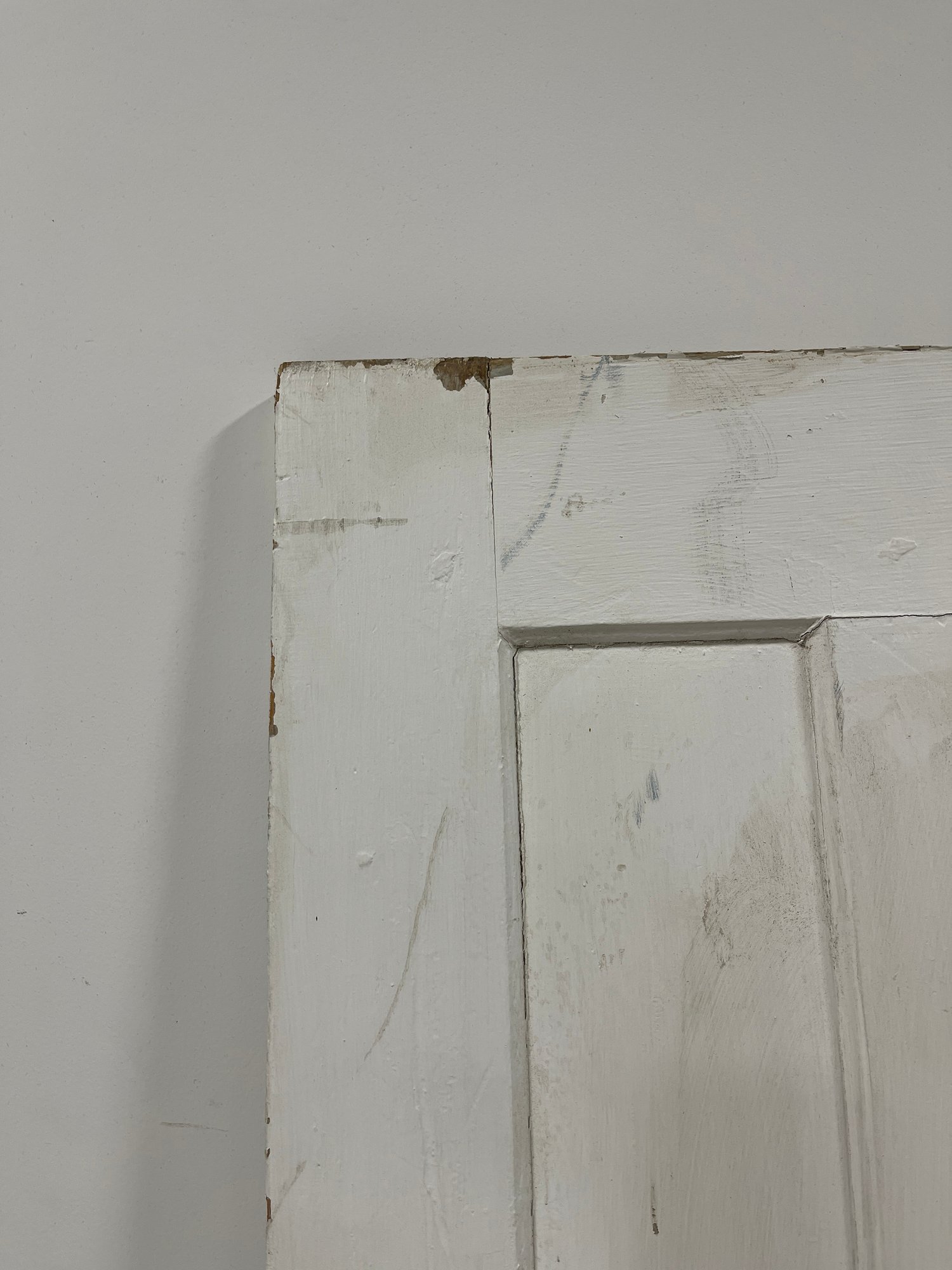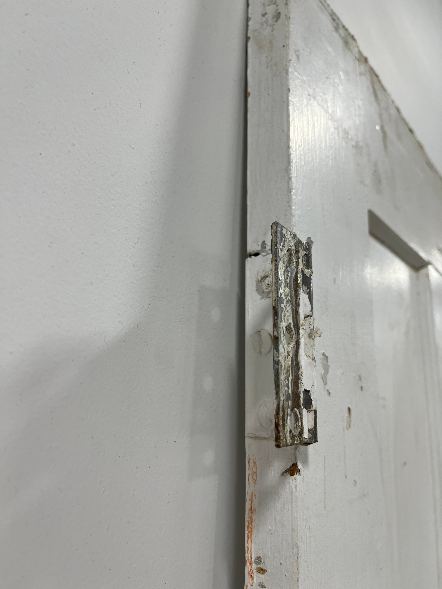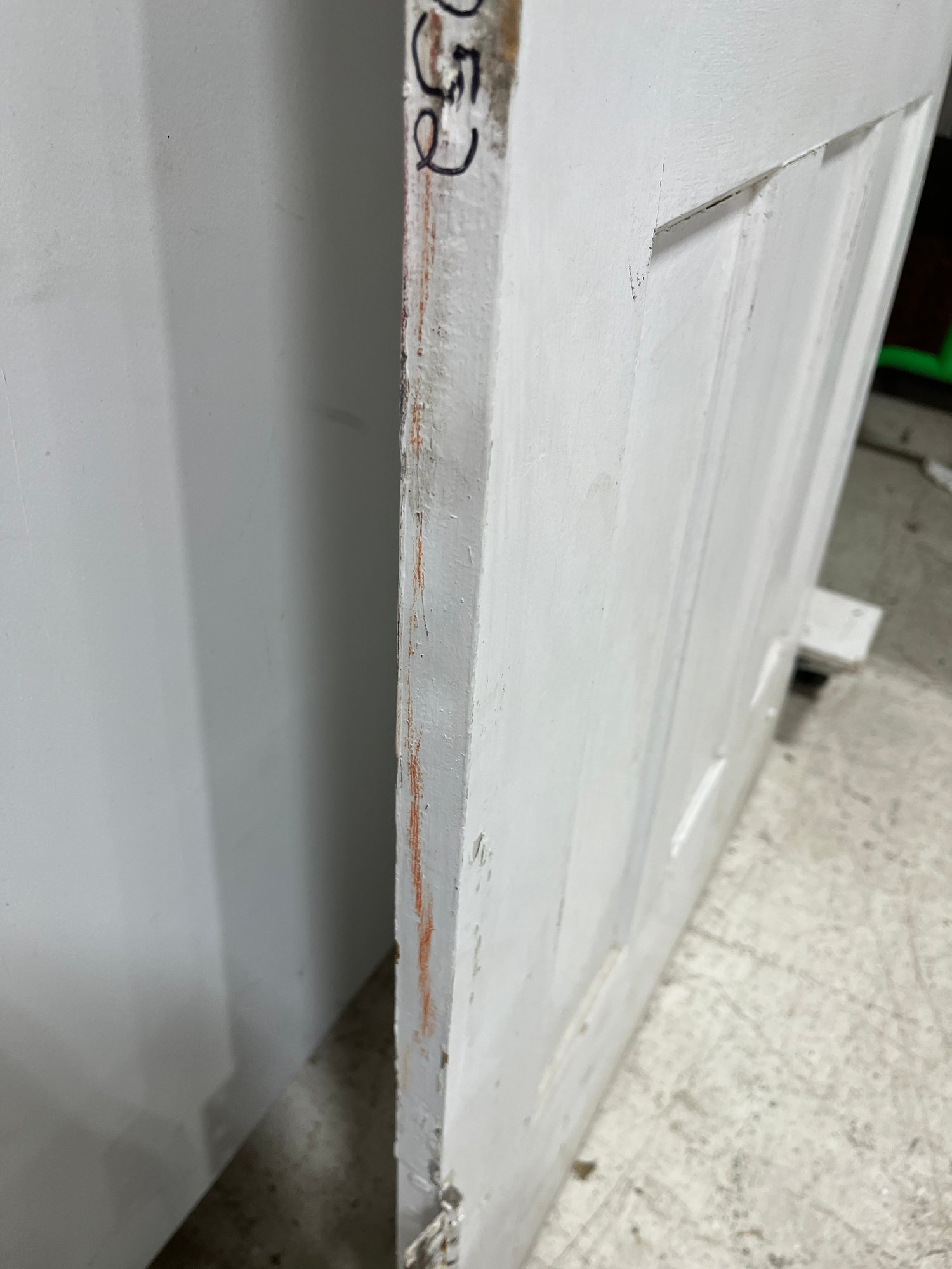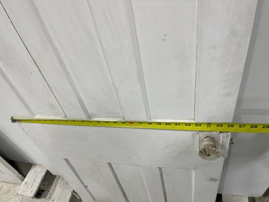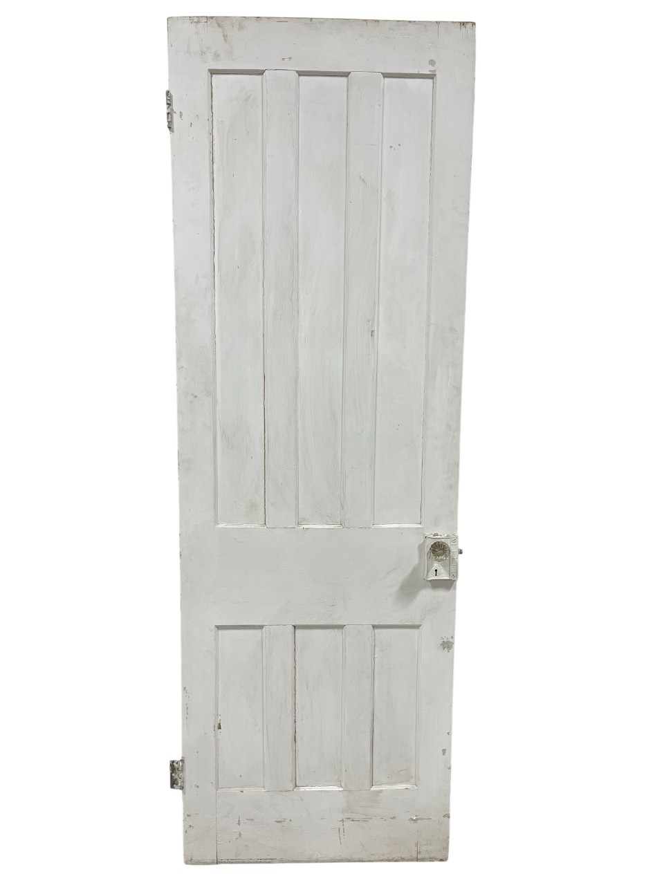 A standard interior passage door featuring a classic six-panel design. This door features two hinges. One hinge is missing the plate.