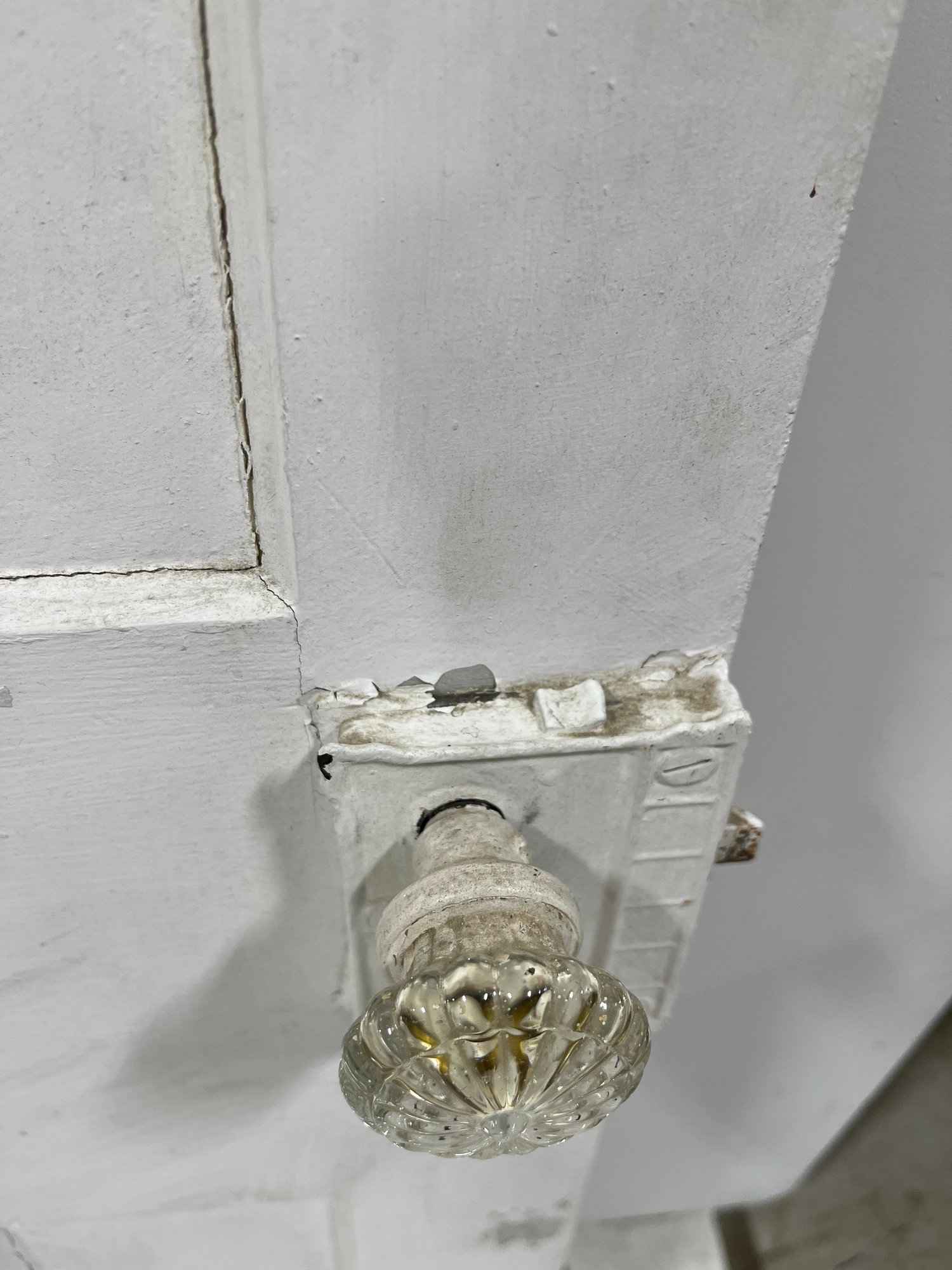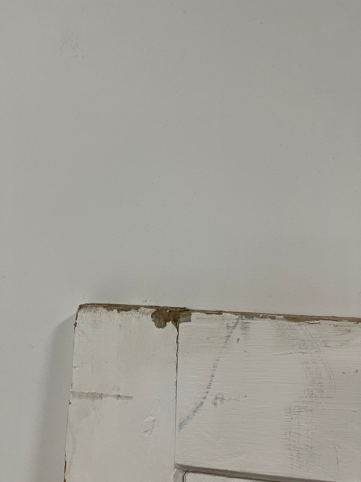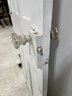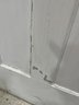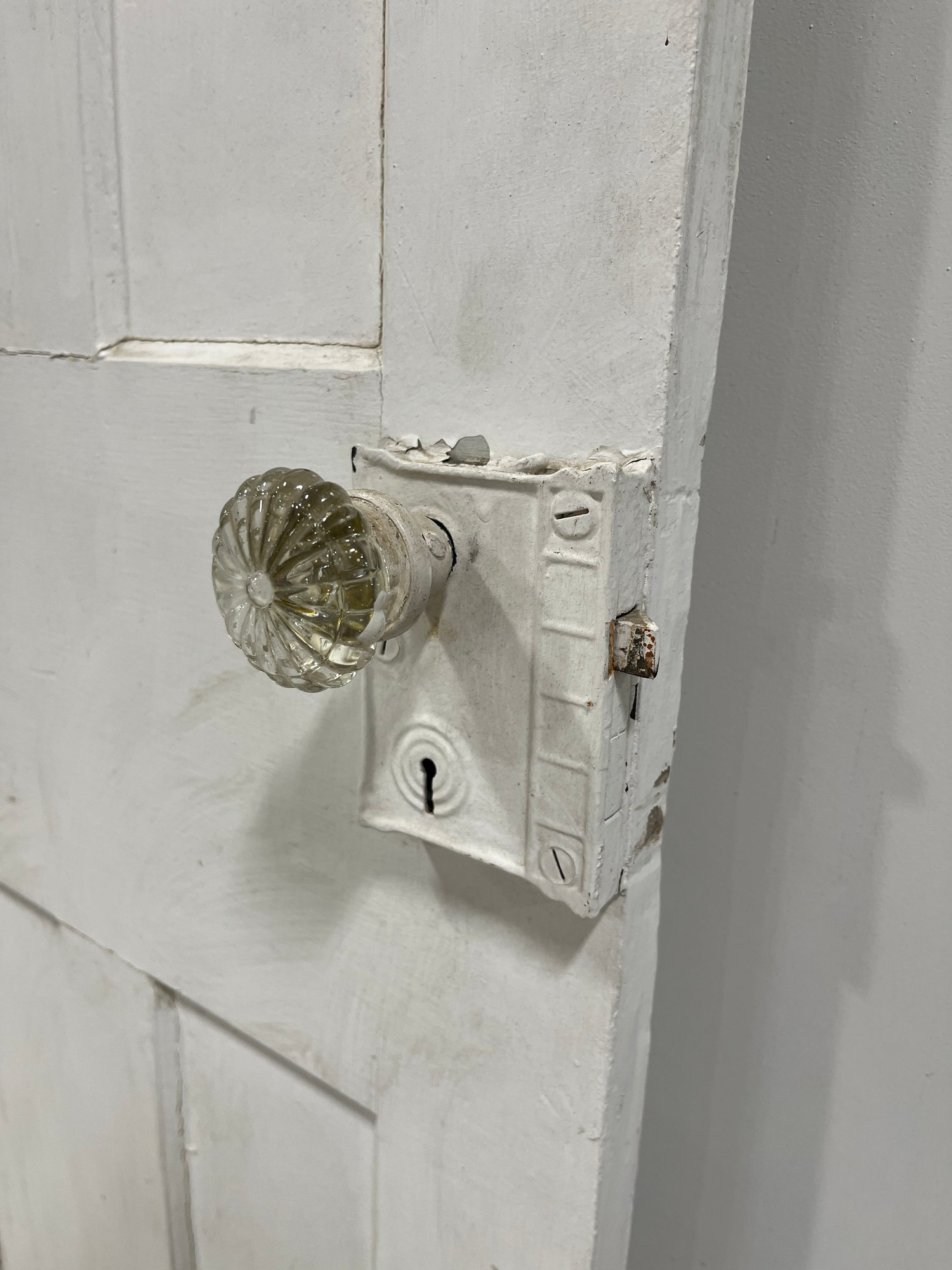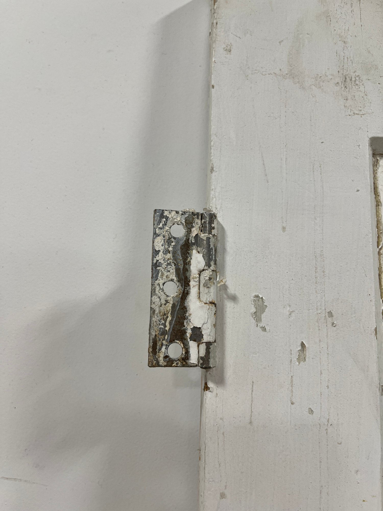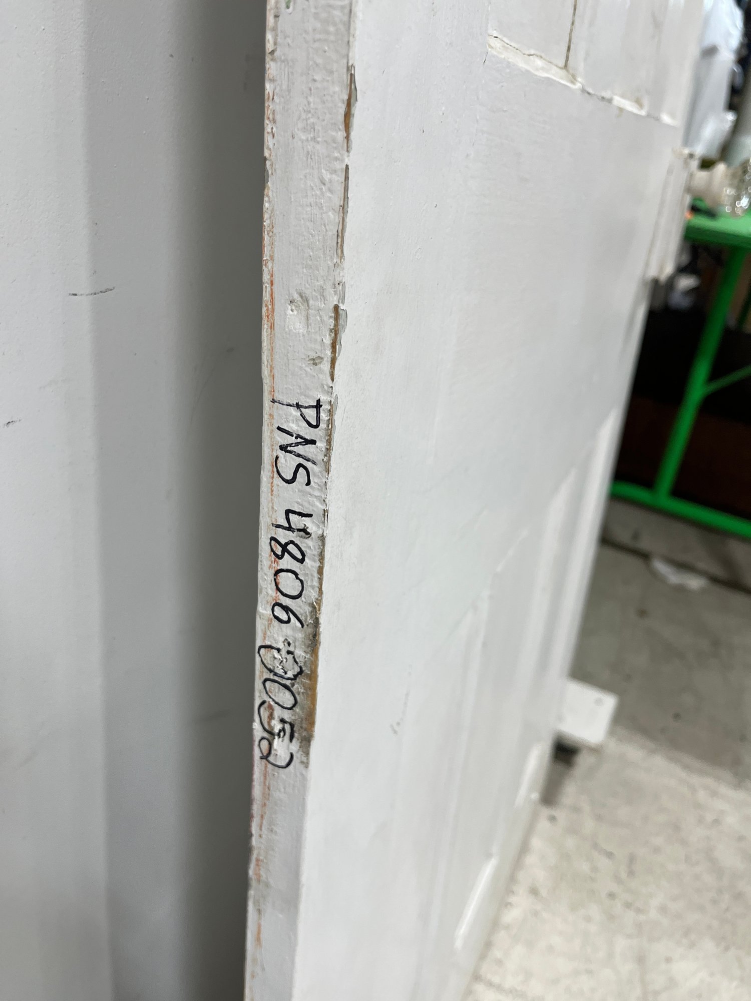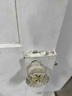 A standard interior passage door featuring a classic six-panel design. This door features two hinges. One hinge is missing the plate.