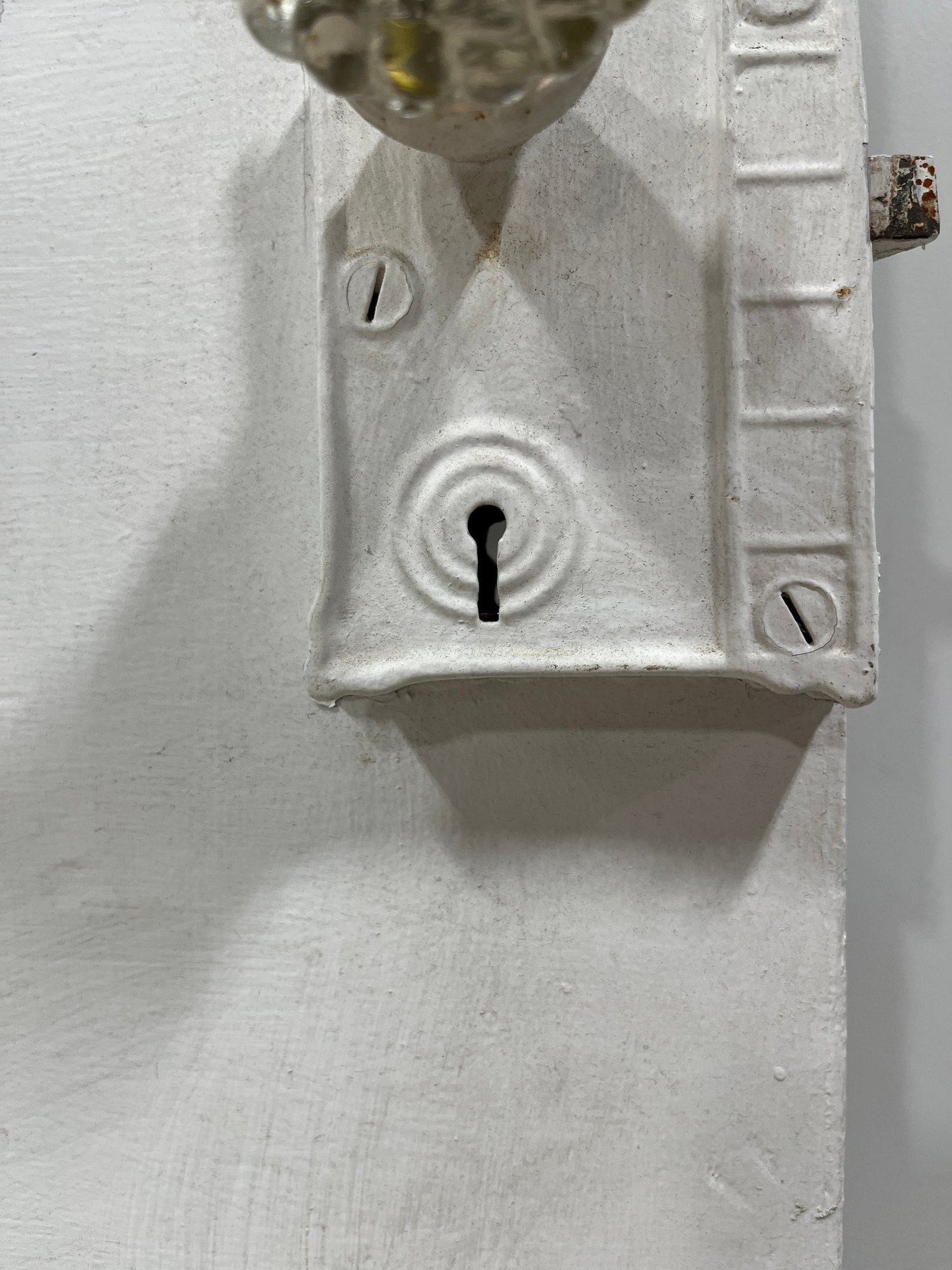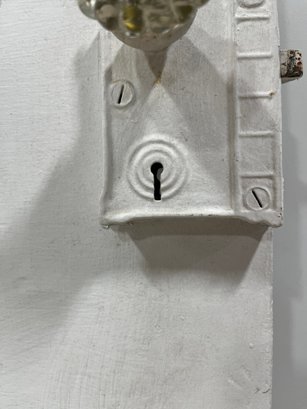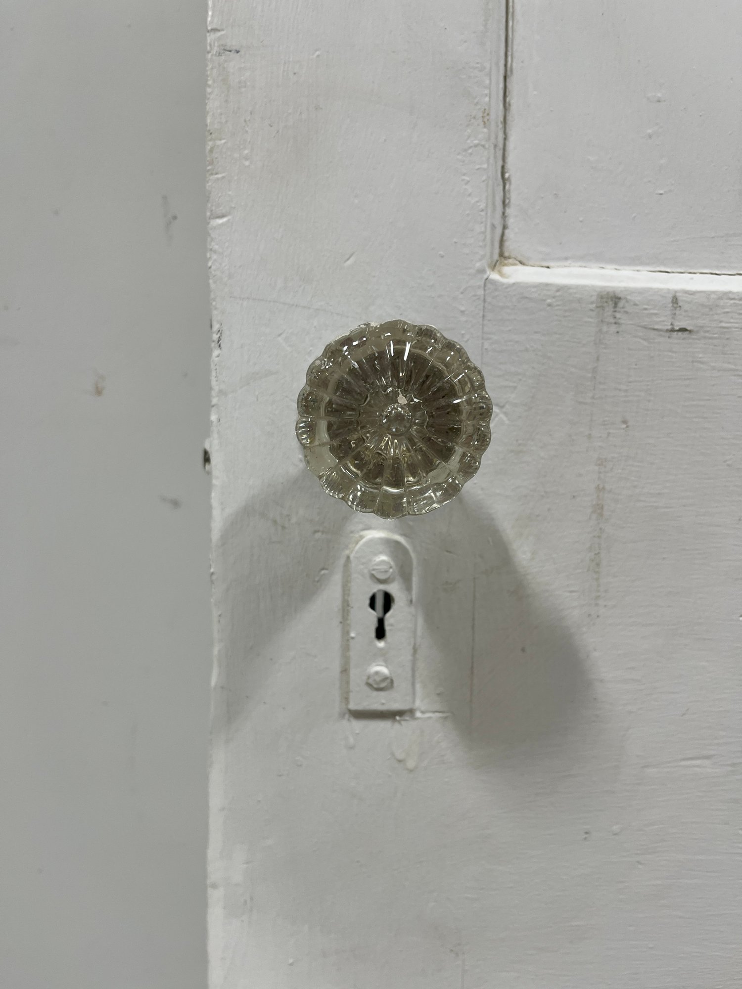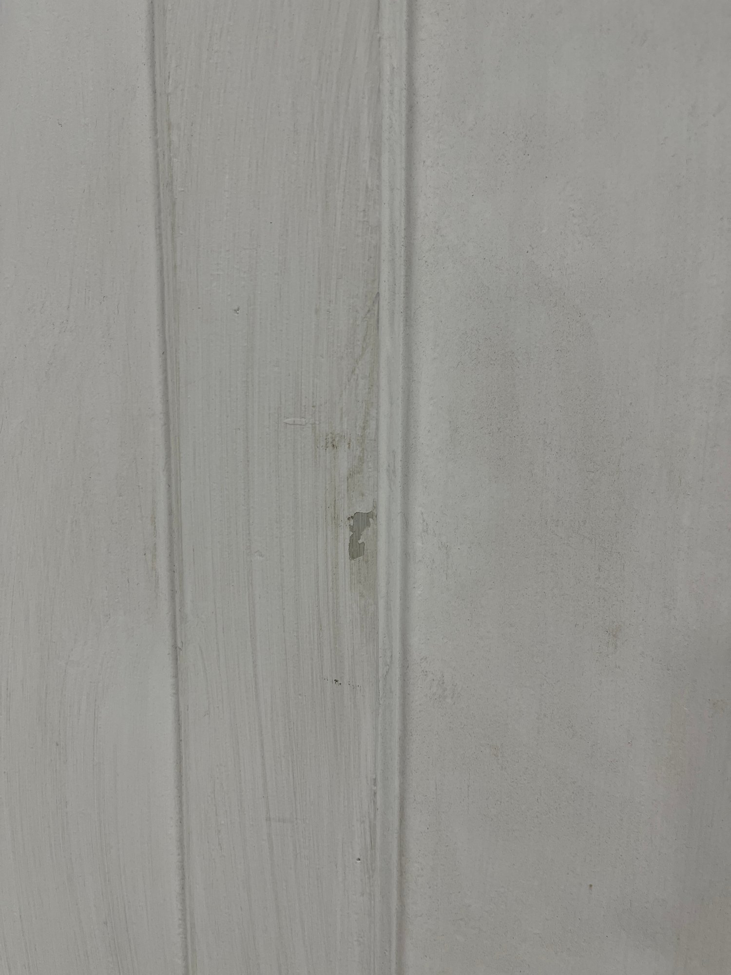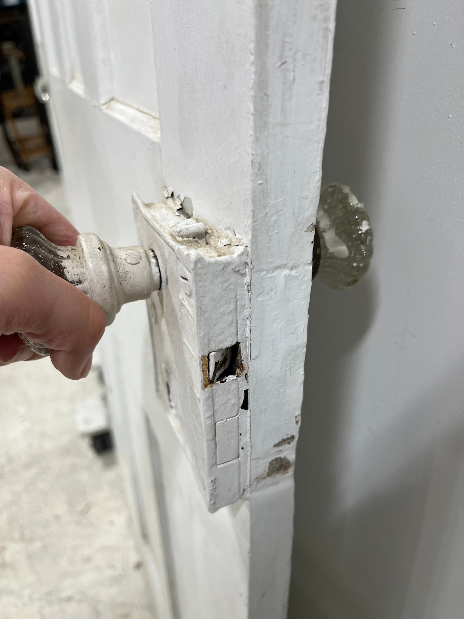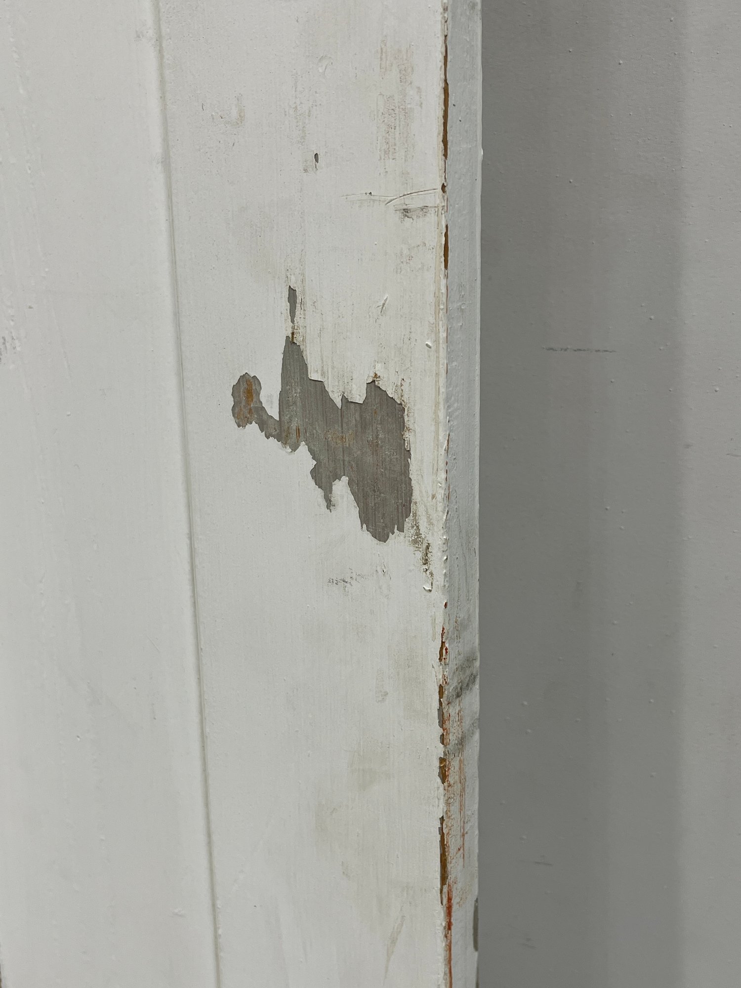 A standard interior passage door featuring a classic six-panel design. This door features two hinges. One hinge is missing the plate.
