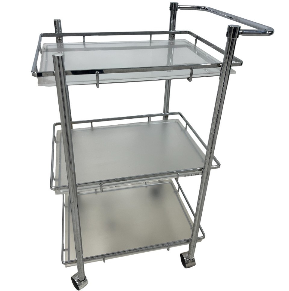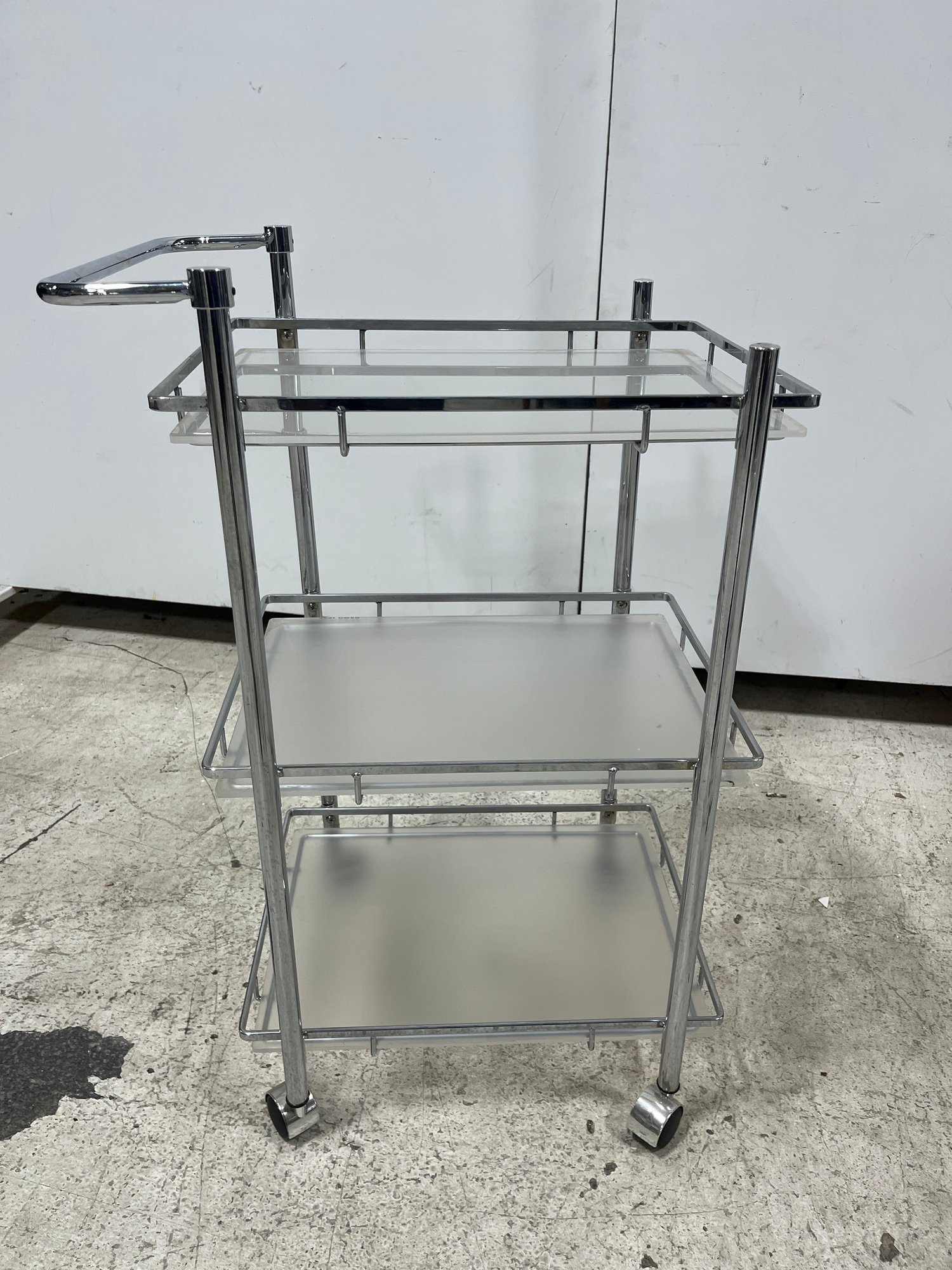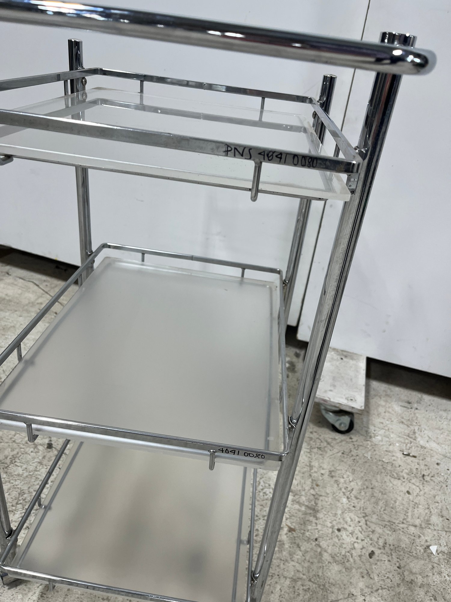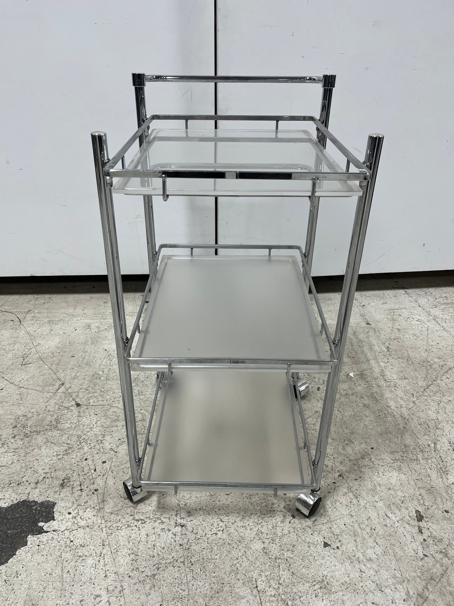 Elevate your hosting game with this sleek, Mid-Century inspired serving cart. Defined by its minimalist silhouette and industrial materials, this three-tier trolley seamlessly blends 1970s Italian modernism with contemporary utility. Each tier features a frosted plexiglass pane.