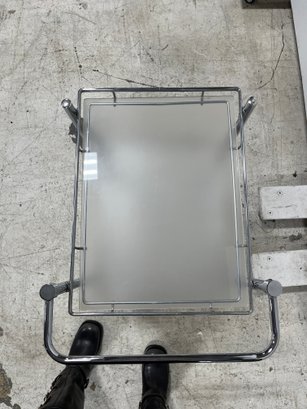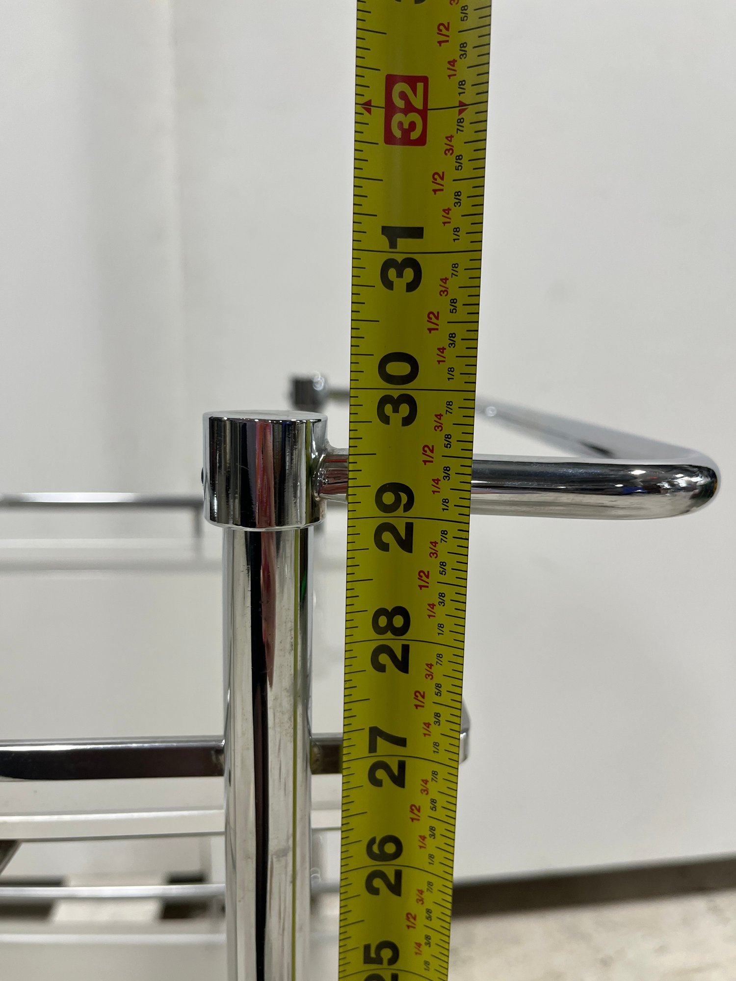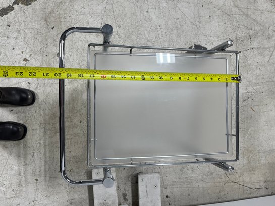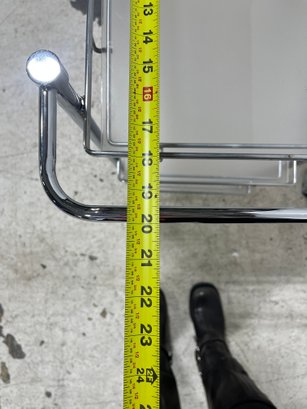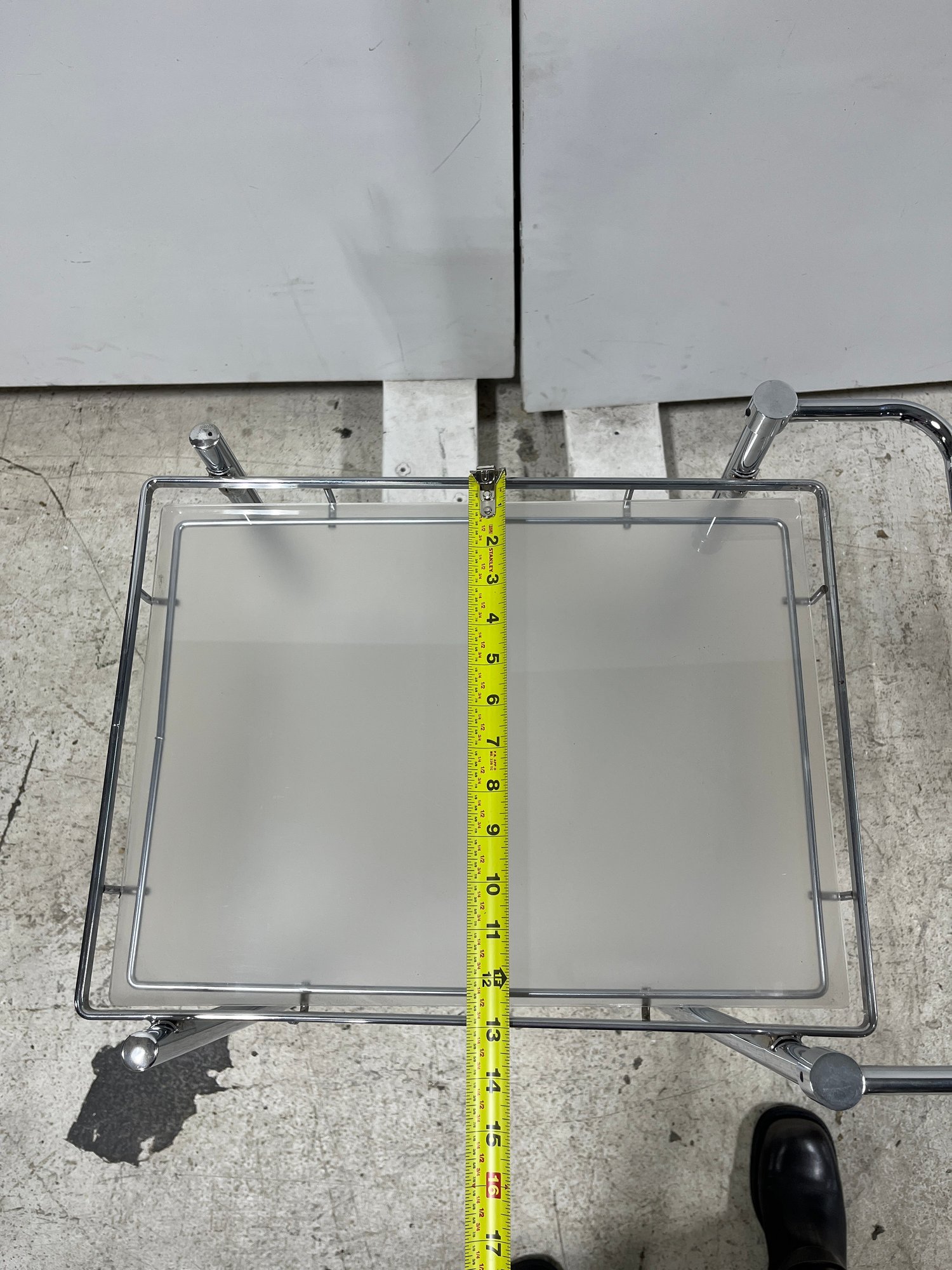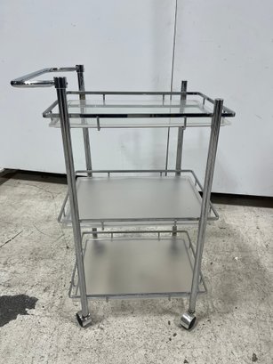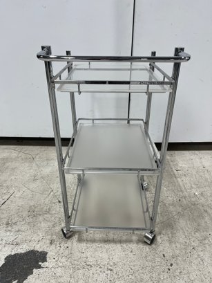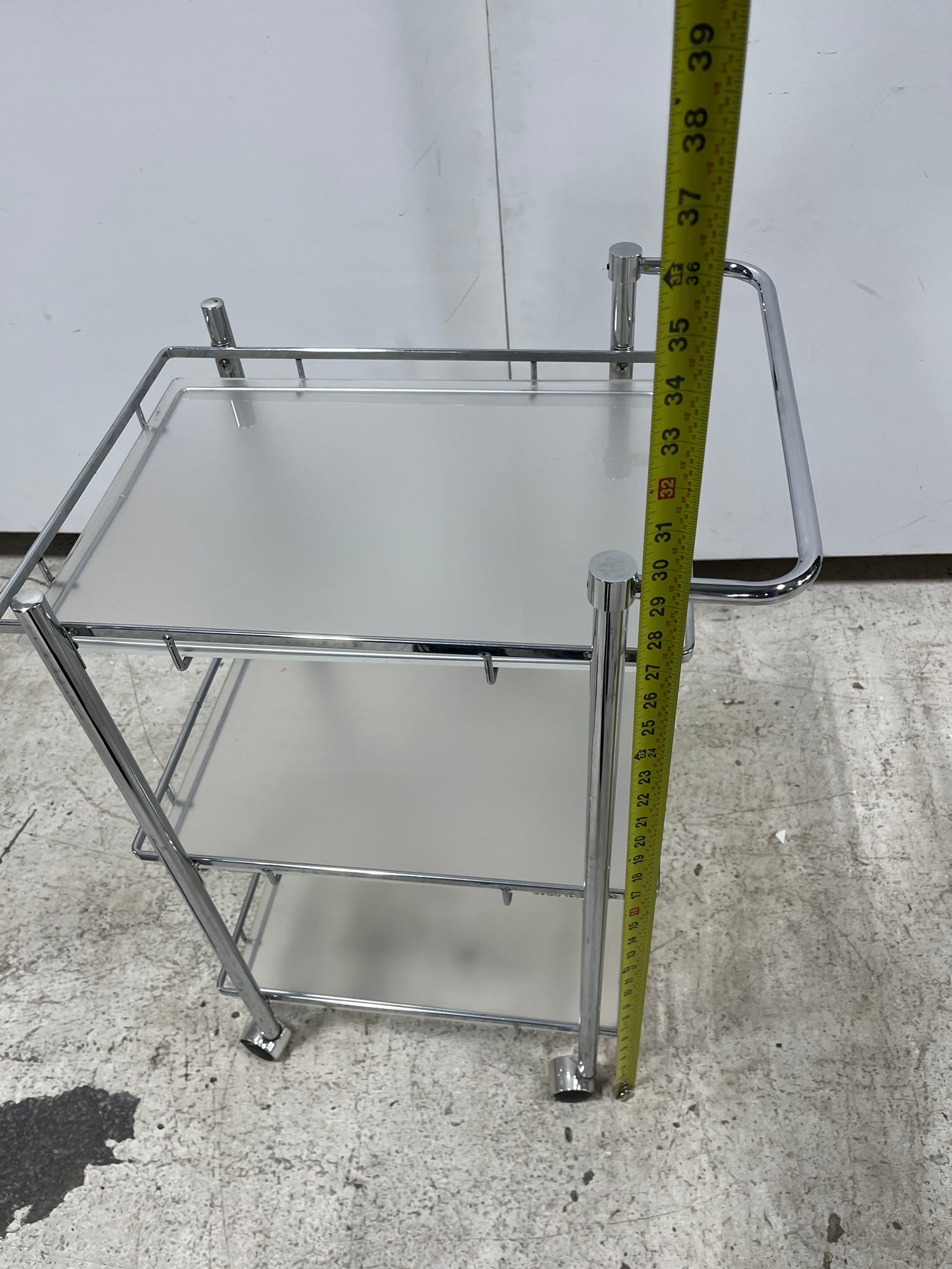 Elevate your hosting game with this sleek, Mid-Century inspired serving cart. Defined by its minimalist silhouette and industrial materials, this three-tier trolley seamlessly blends 1970s Italian modernism with contemporary utility. Each tier features a frosted plexiglass pane.