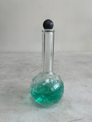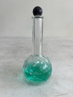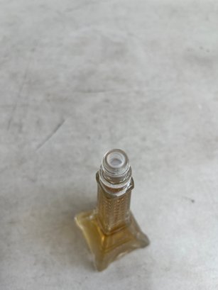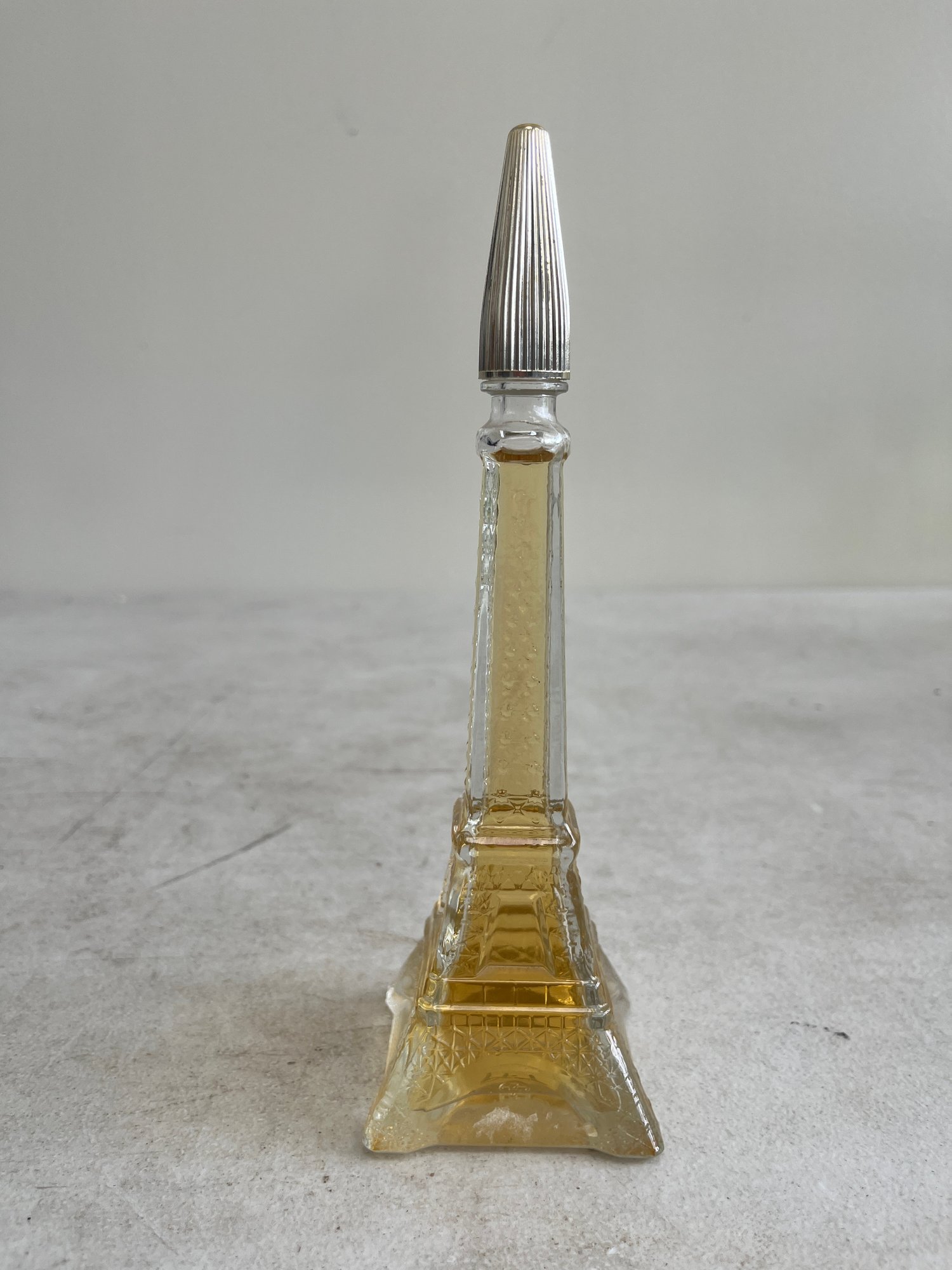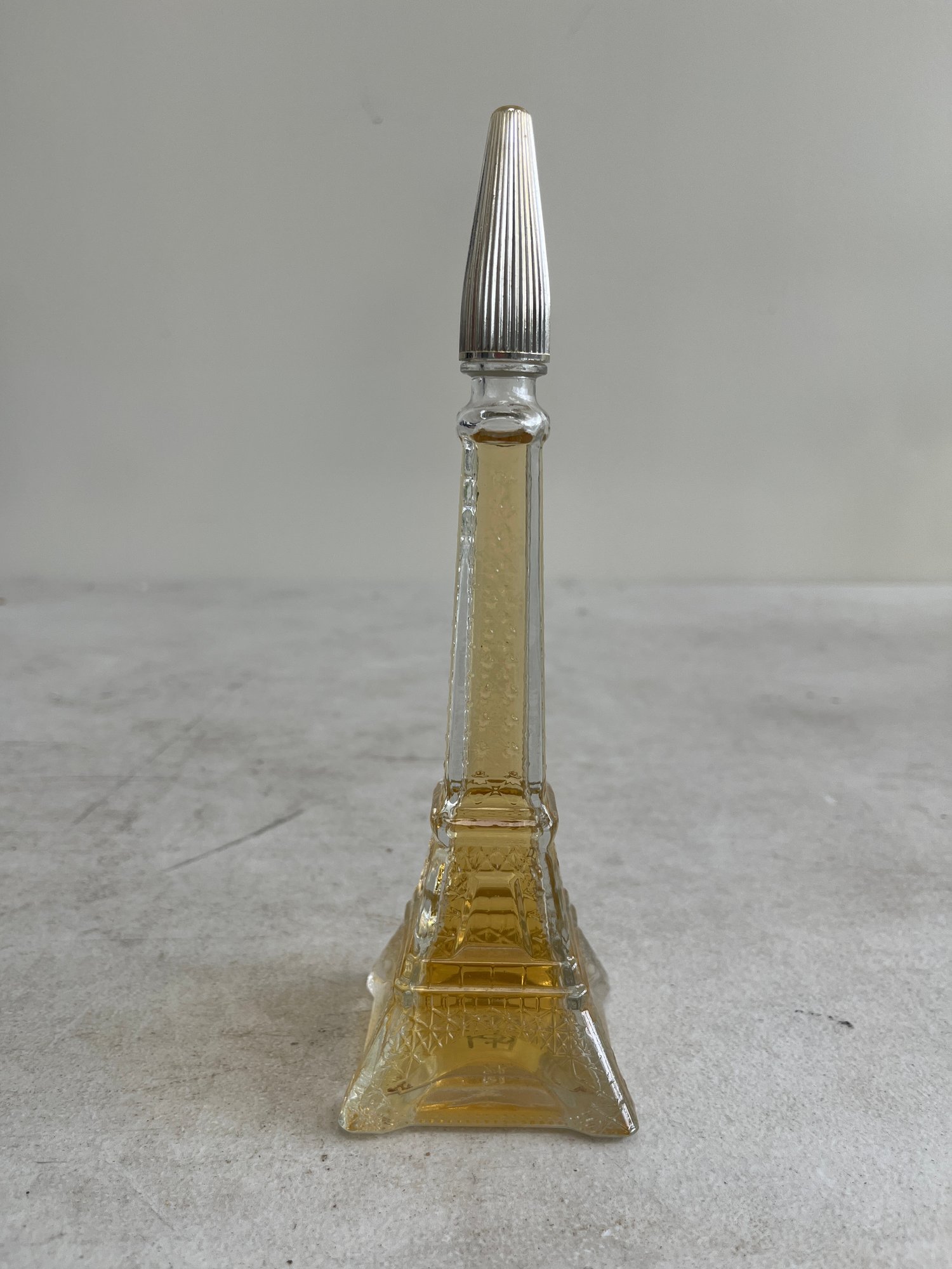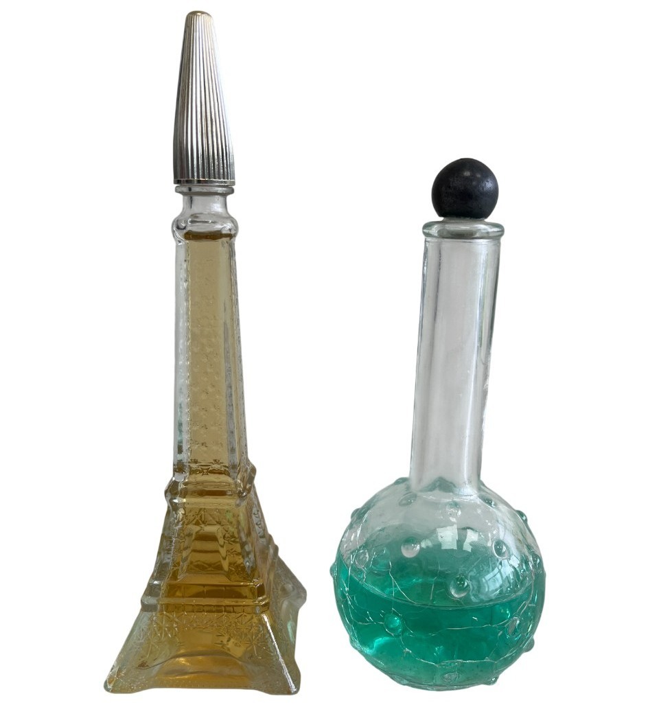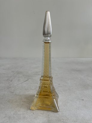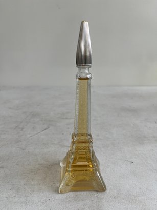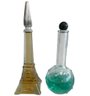This curated set features a figural bottle that is designed in the shape of the iconic Eiffel Tower, a classic piece of mid-20th-century vanity ware. Additionally, this lot includes a beautiful example of mid-century art glass, repurposed as an elegant perfume decanter.