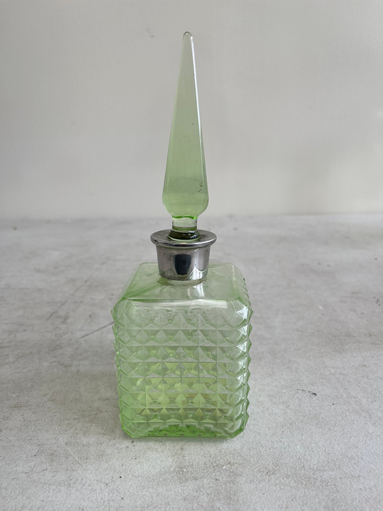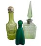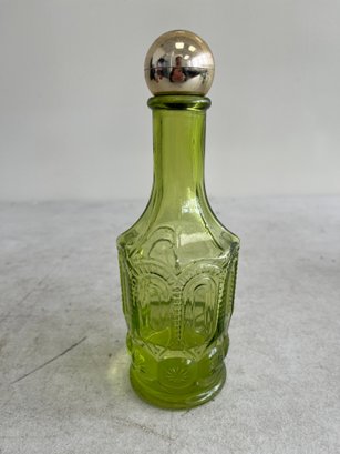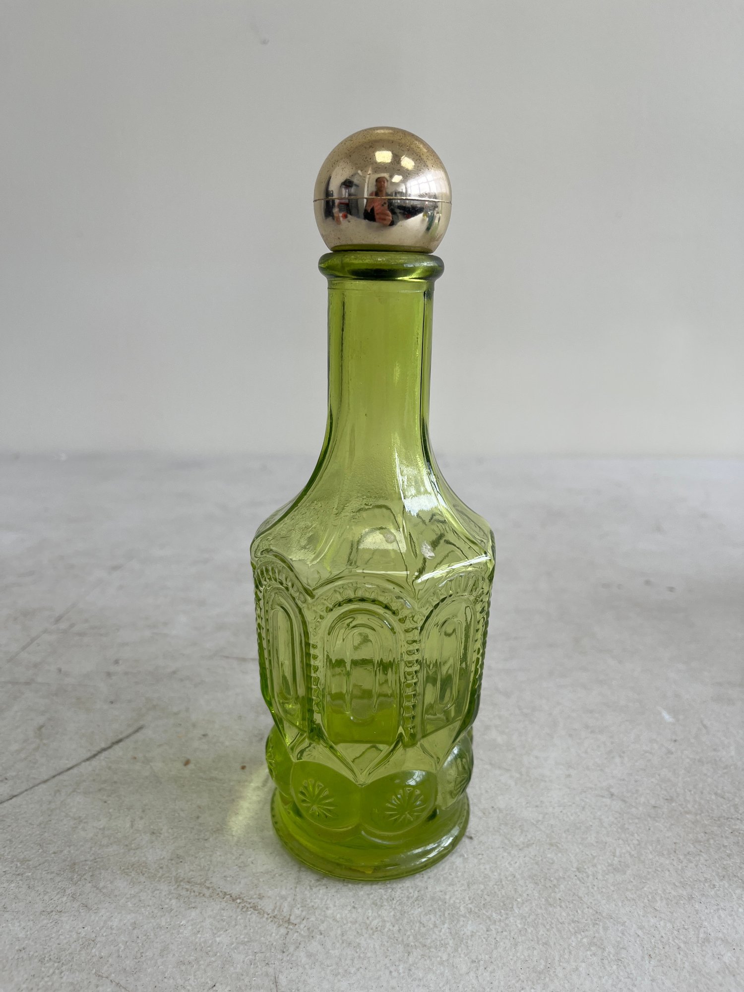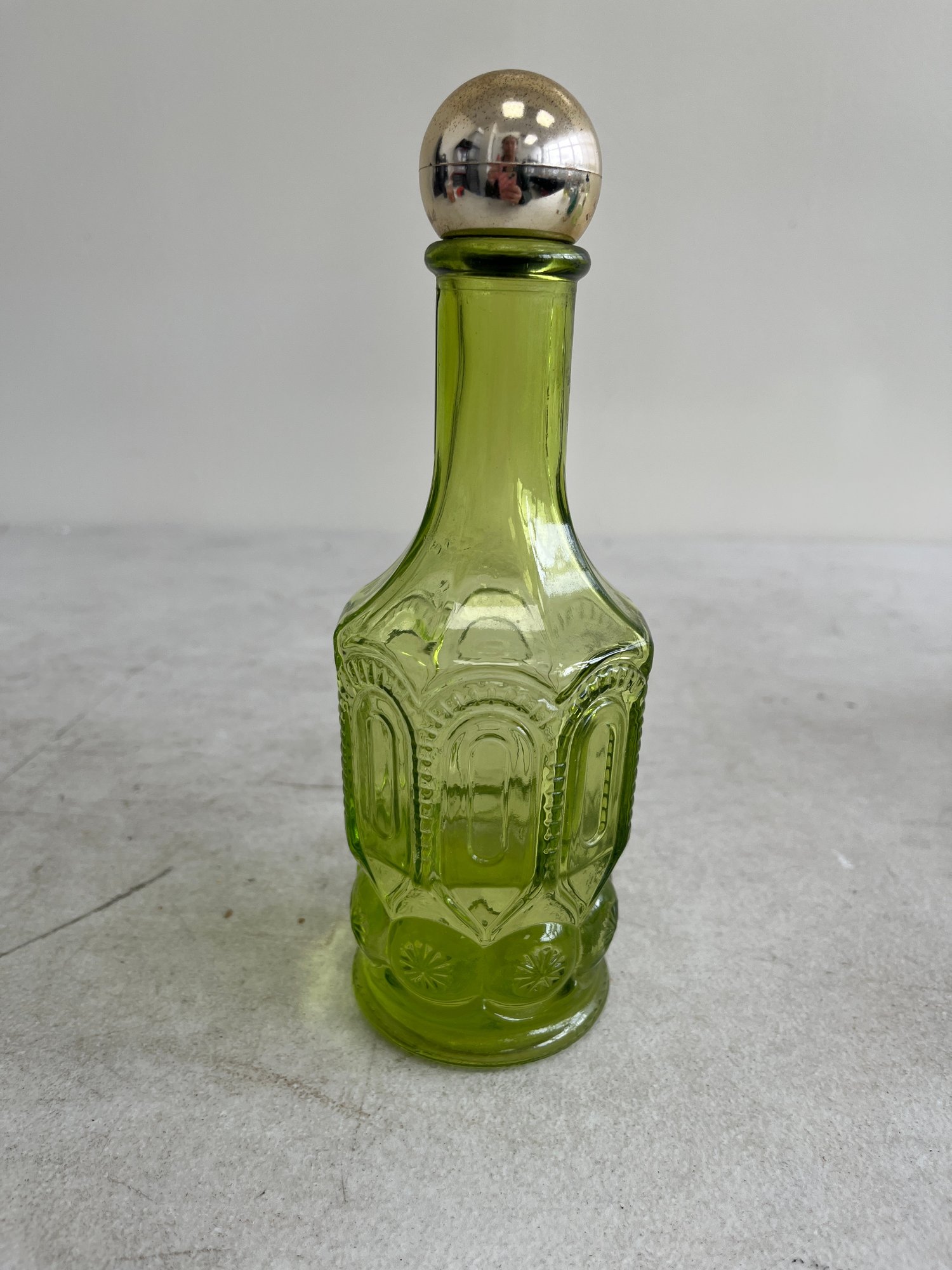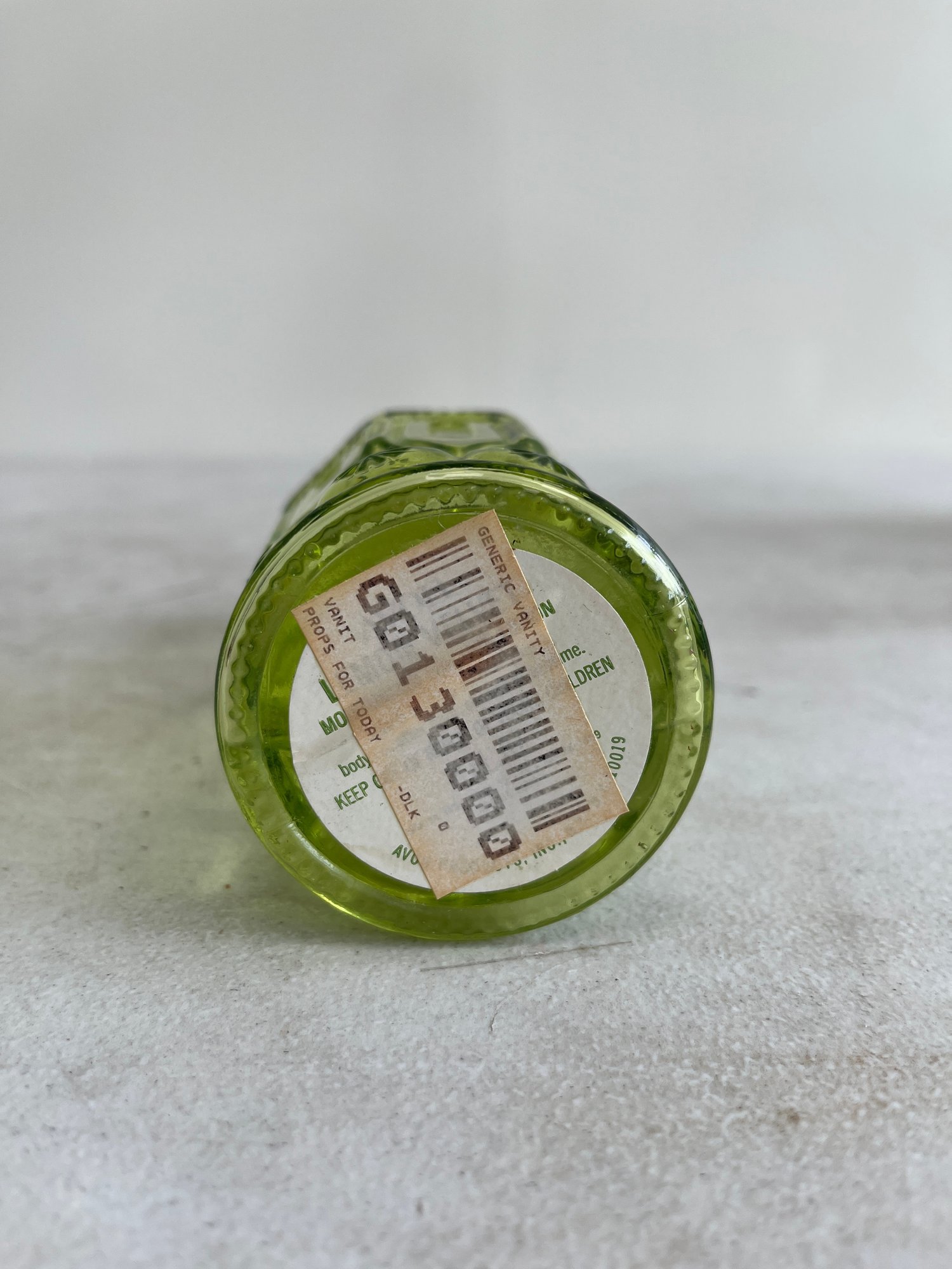 The ornate, lime-green bottle with a spherical cap is a vintage Avon Lemon Velvet Moisturized Friction Lotion Apothecary Decanter. It typically holds 8 fluid ounces and dates back to the 1970s. The minimalist, curved silhouette of the deep emerald-green glass with a luxurious satin finish captures the essence of mid-century design. Finally, the distinctive, square-shaped decanter in a pale green, features an eye-catching, all-over diamond-point pattern.