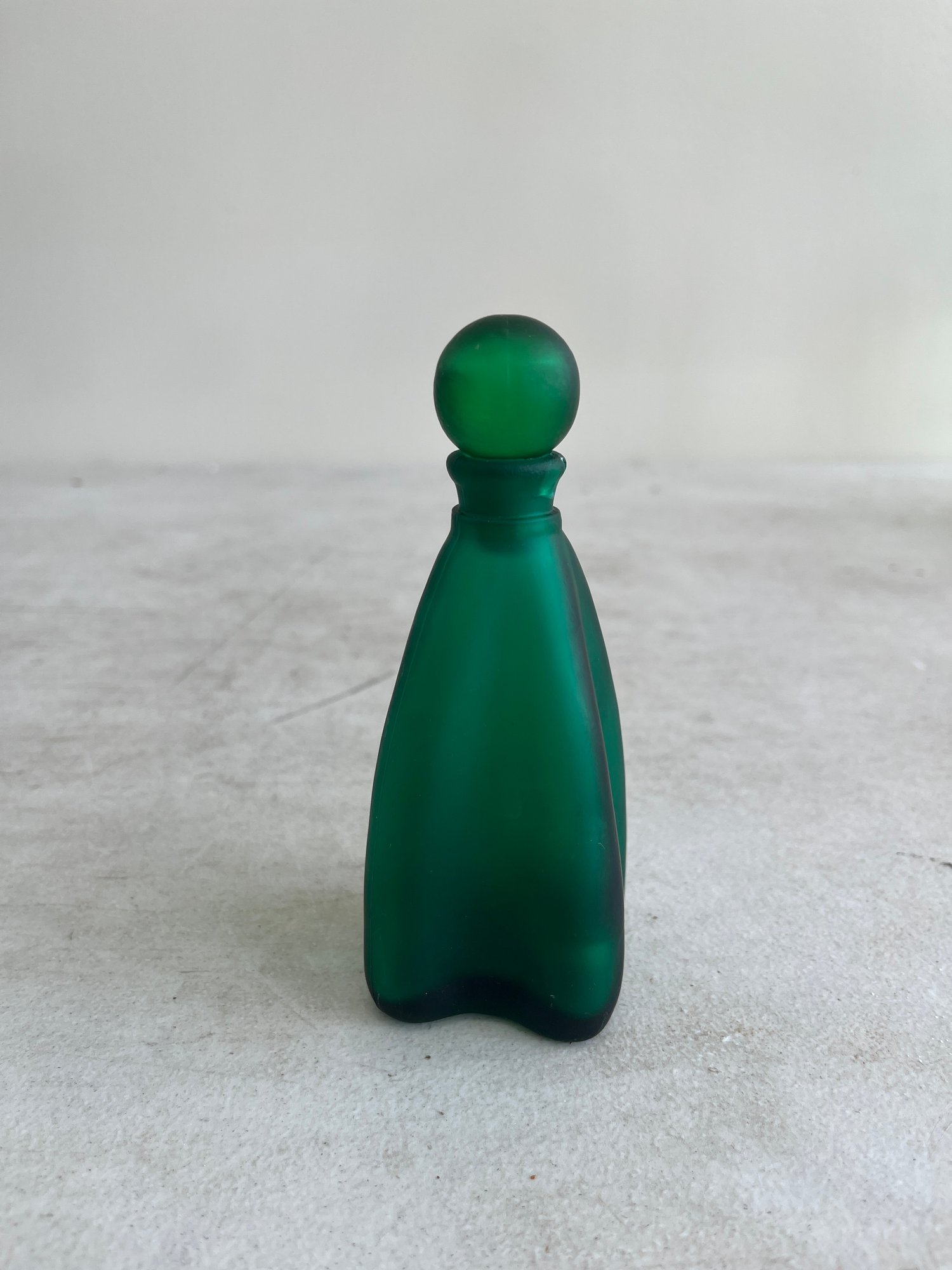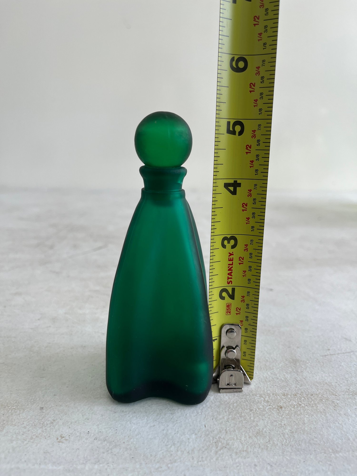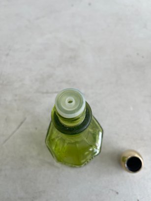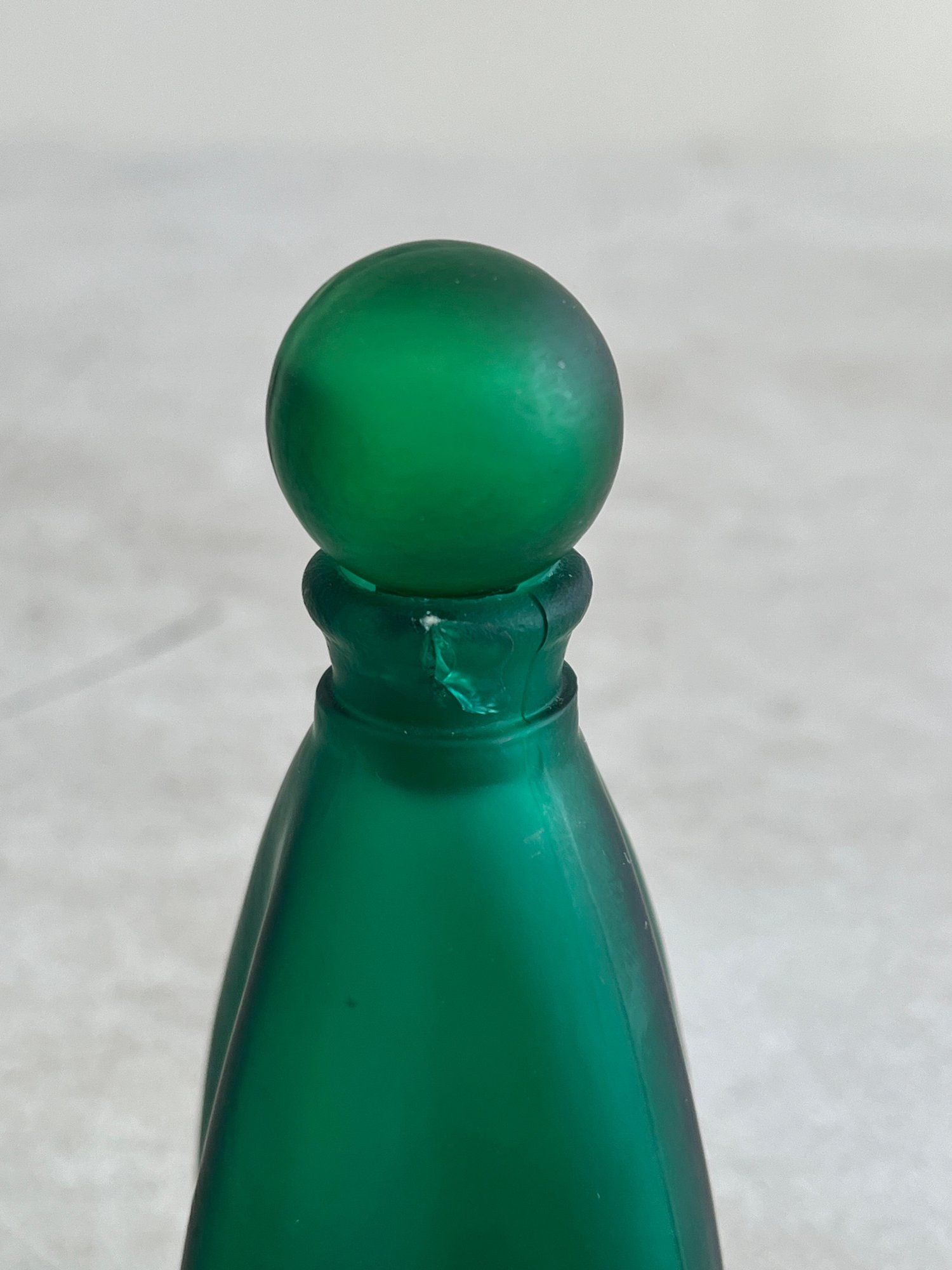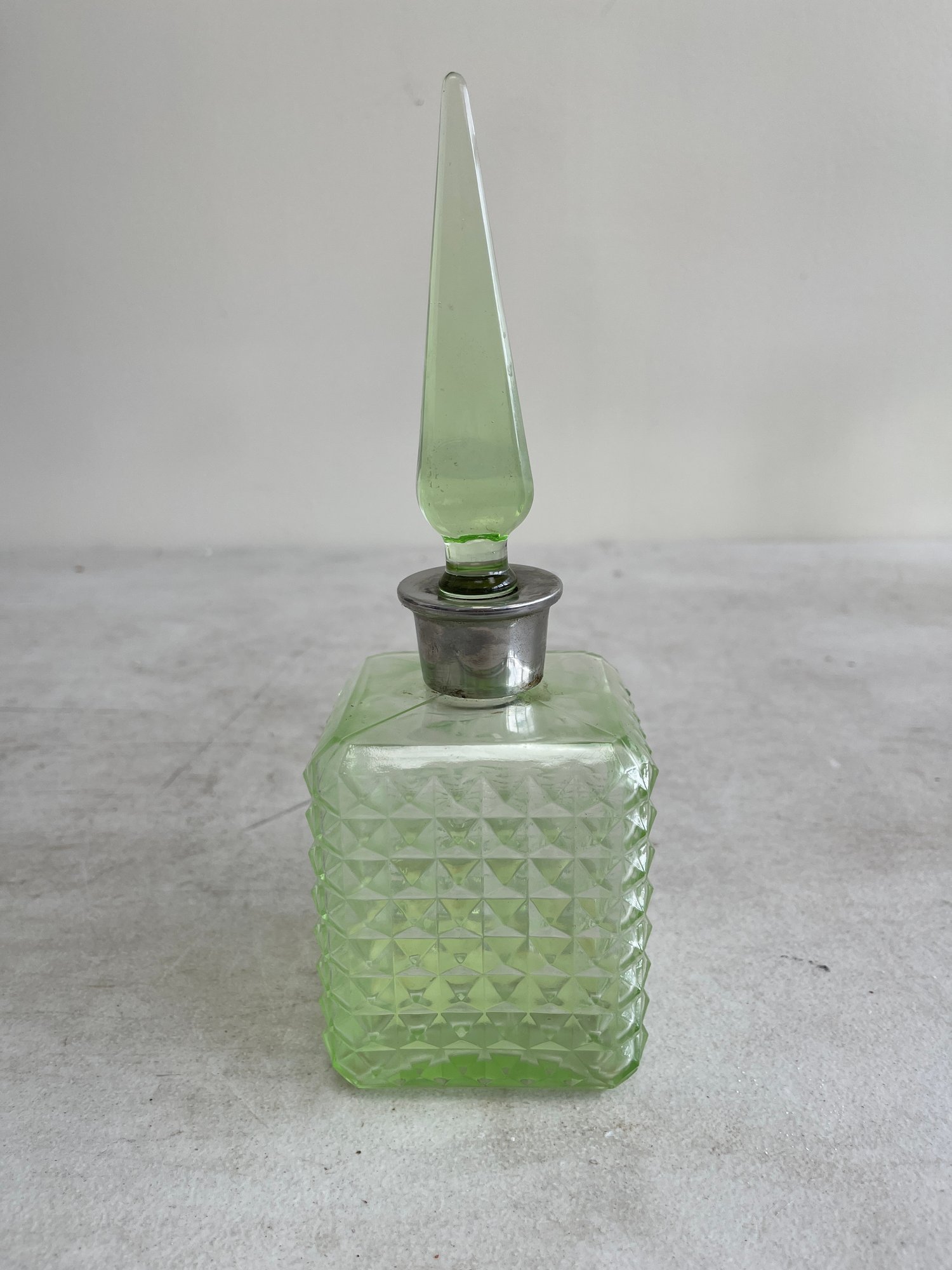 The ornate, lime-green bottle with a spherical cap is a vintage Avon Lemon Velvet Moisturized Friction Lotion Apothecary Decanter. It typically holds 8 fluid ounces and dates back to the 1970s. The minimalist, curved silhouette of the deep emerald-green glass with a luxurious satin finish captures the essence of mid-century design. Finally, the distinctive, square-shaped decanter in a pale green, features an eye-catching, all-over diamond-point pattern.