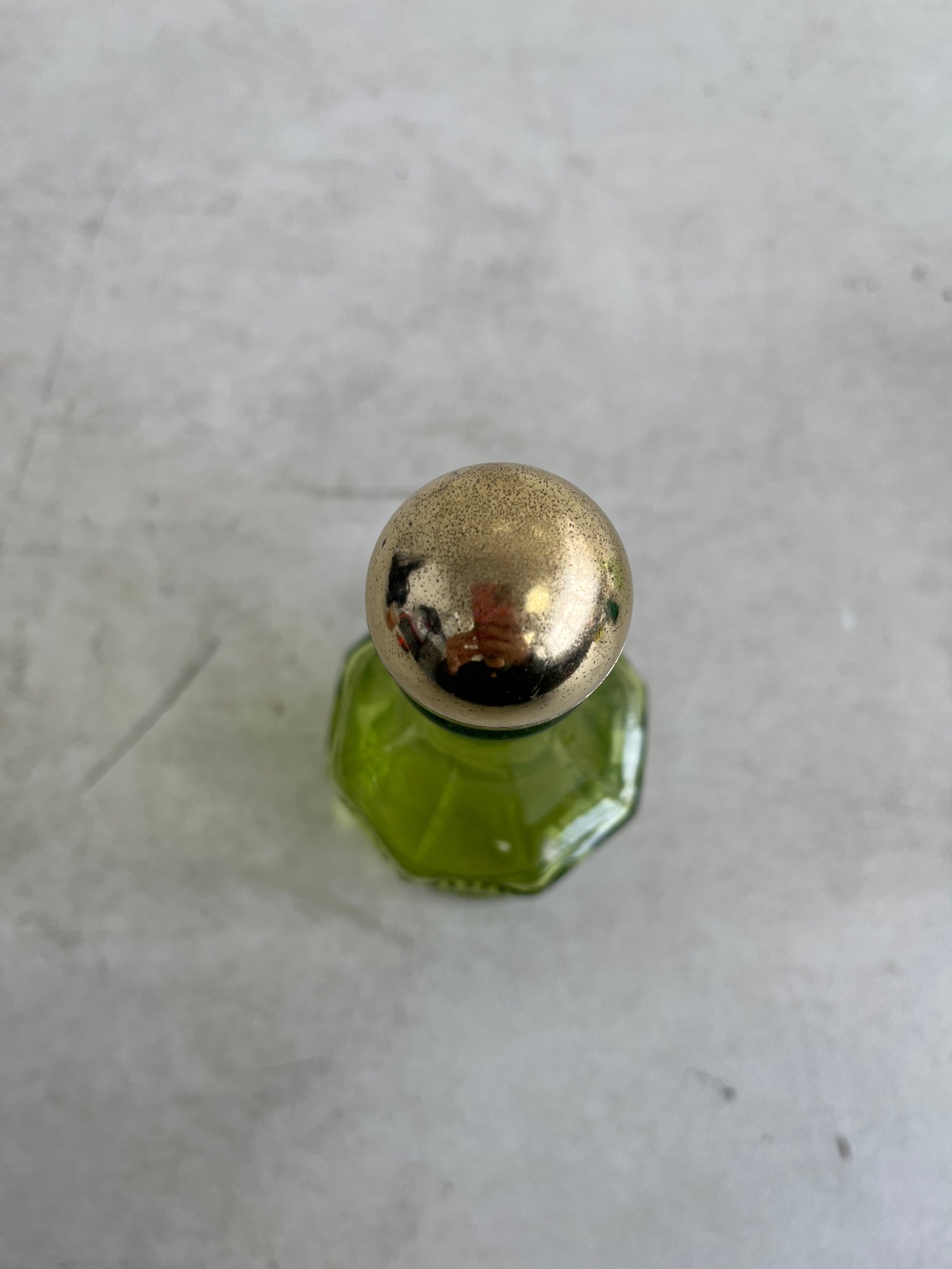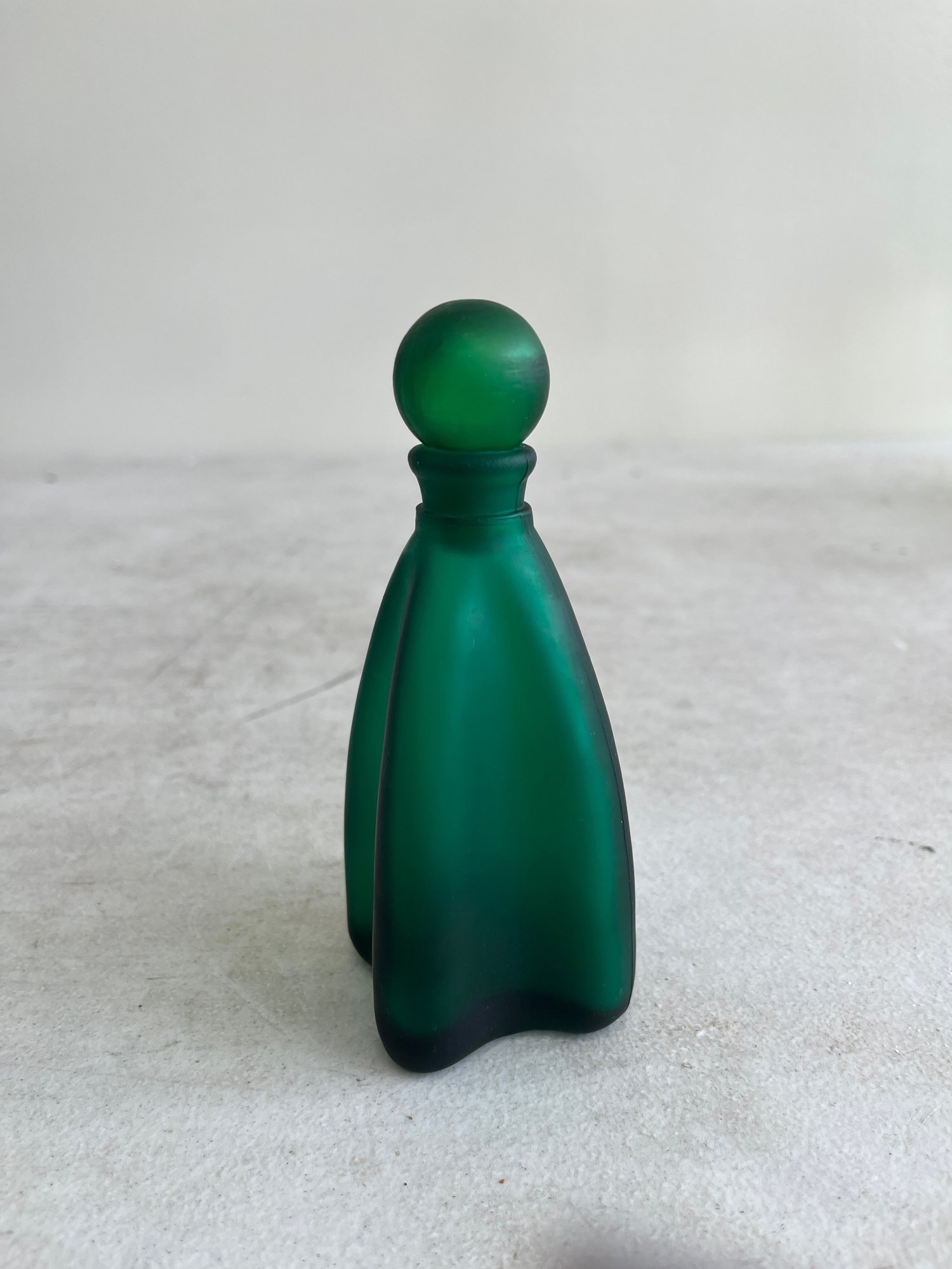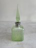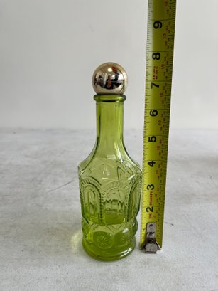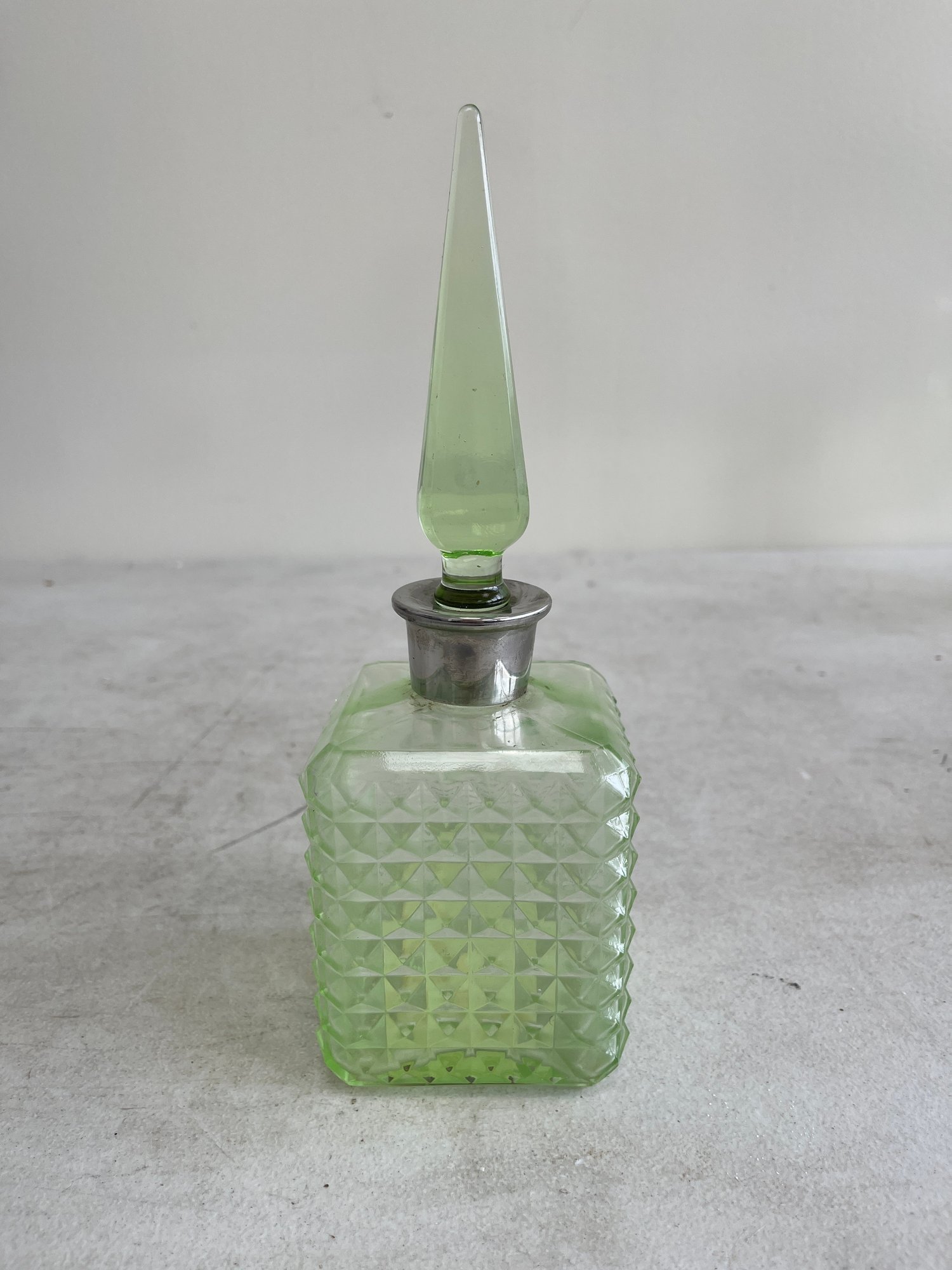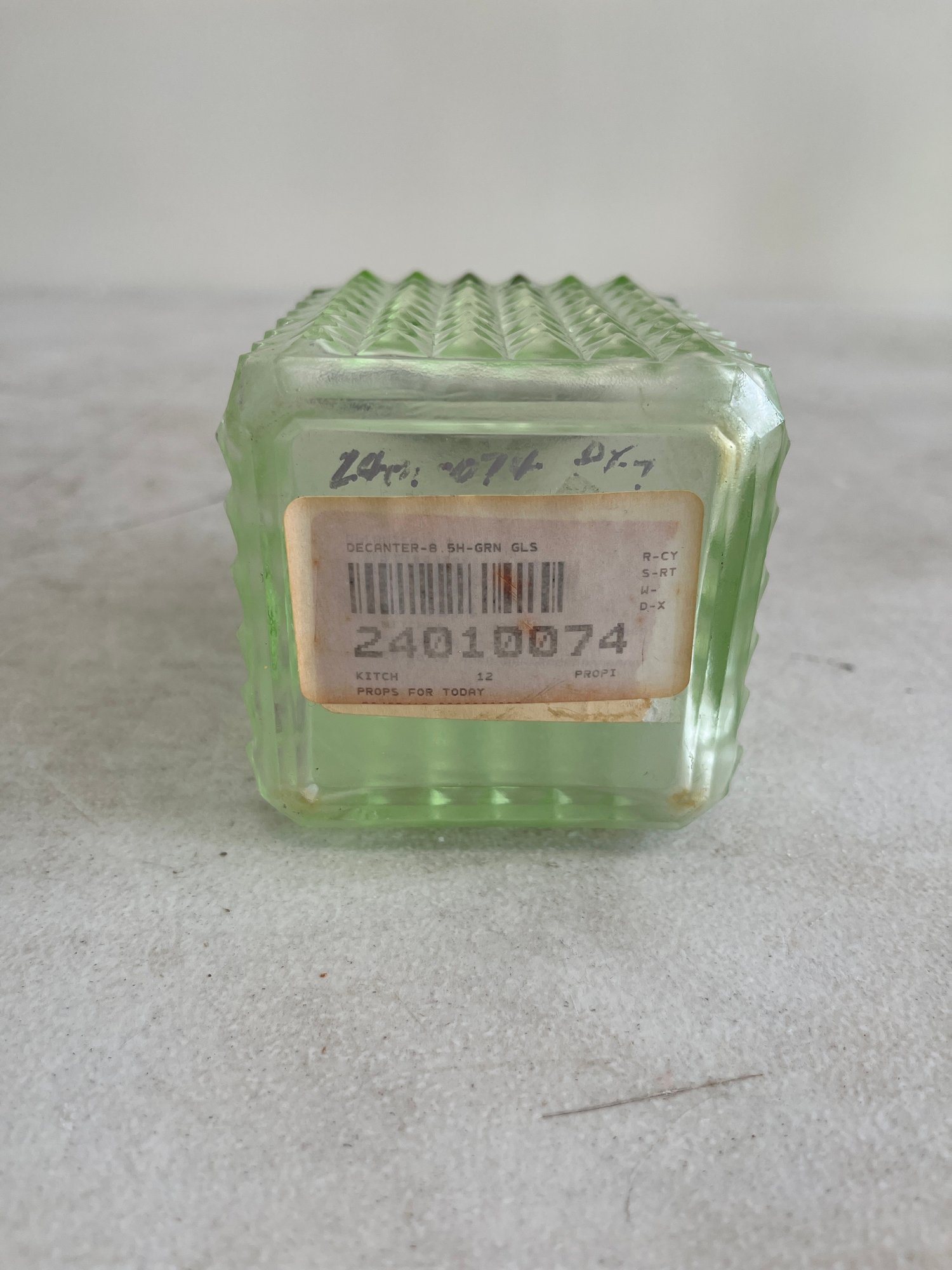 The ornate, lime-green bottle with a spherical cap is a vintage Avon Lemon Velvet Moisturized Friction Lotion Apothecary Decanter. It typically holds 8 fluid ounces and dates back to the 1970s. The minimalist, curved silhouette of the deep emerald-green glass with a luxurious satin finish captures the essence of mid-century design. Finally, the distinctive, square-shaped decanter in a pale green, features an eye-catching, all-over diamond-point pattern.