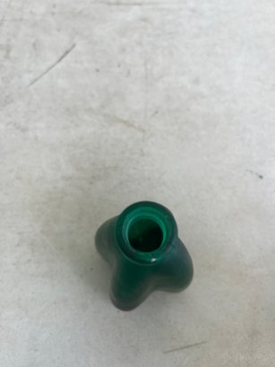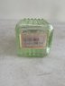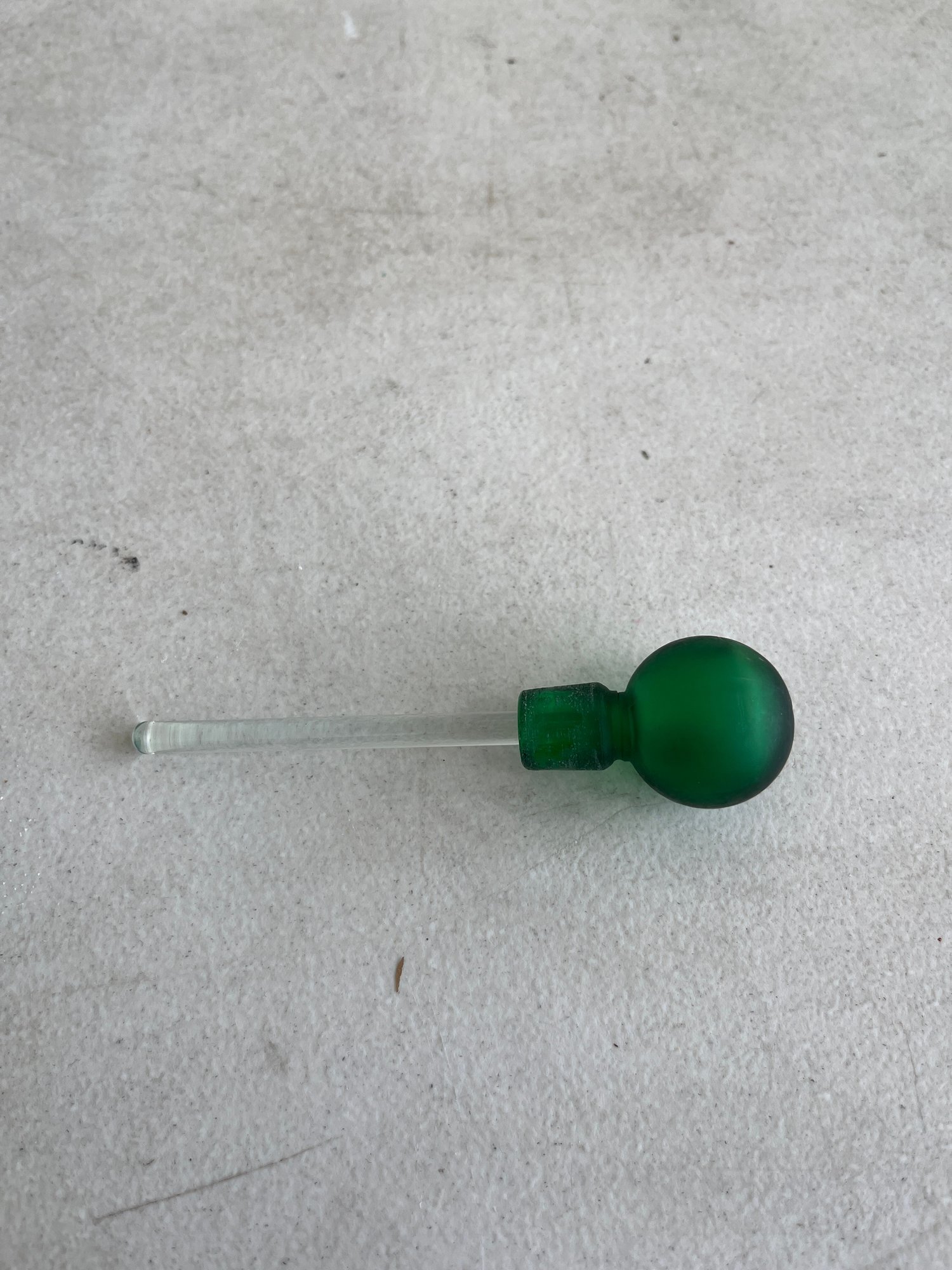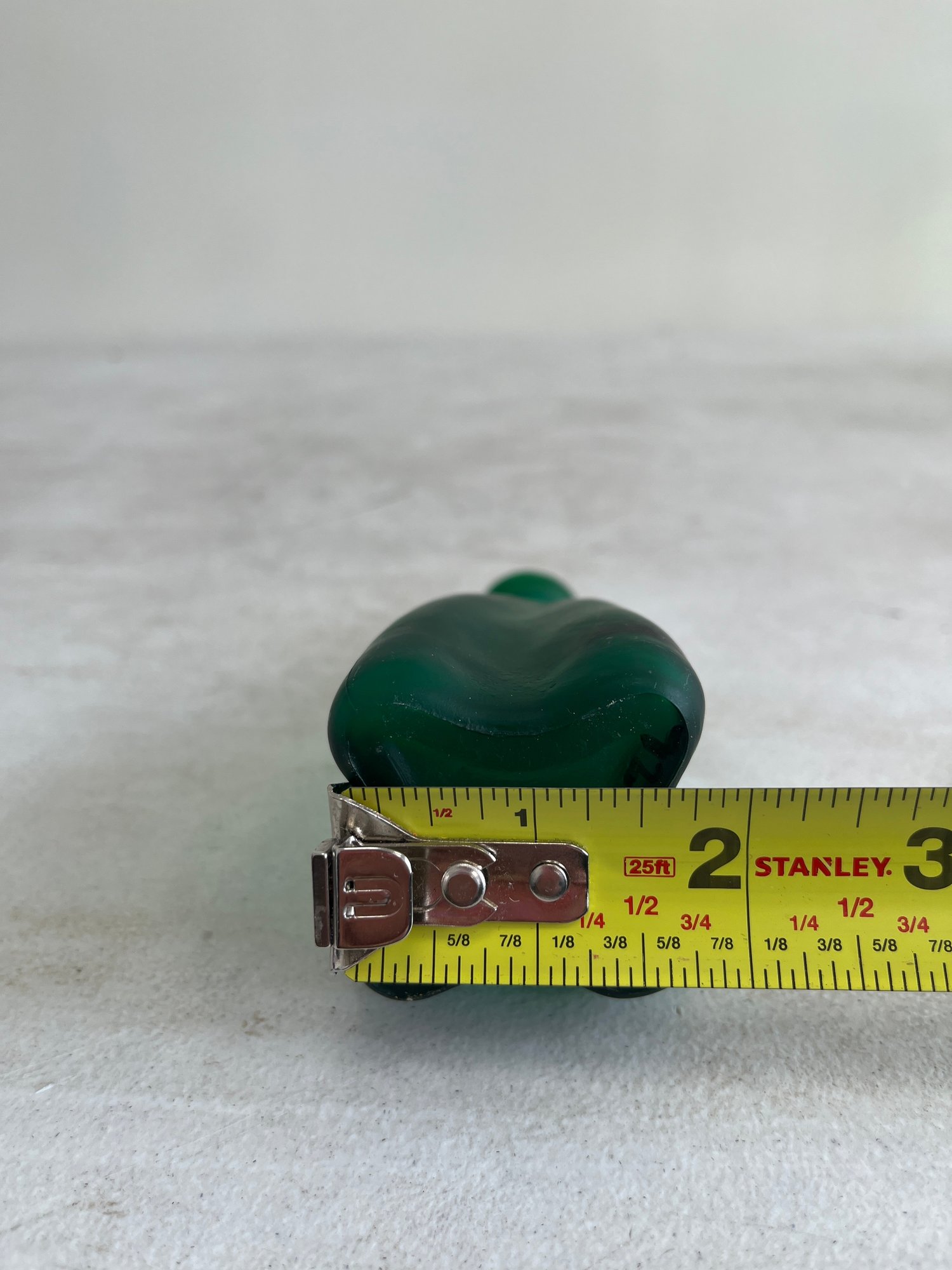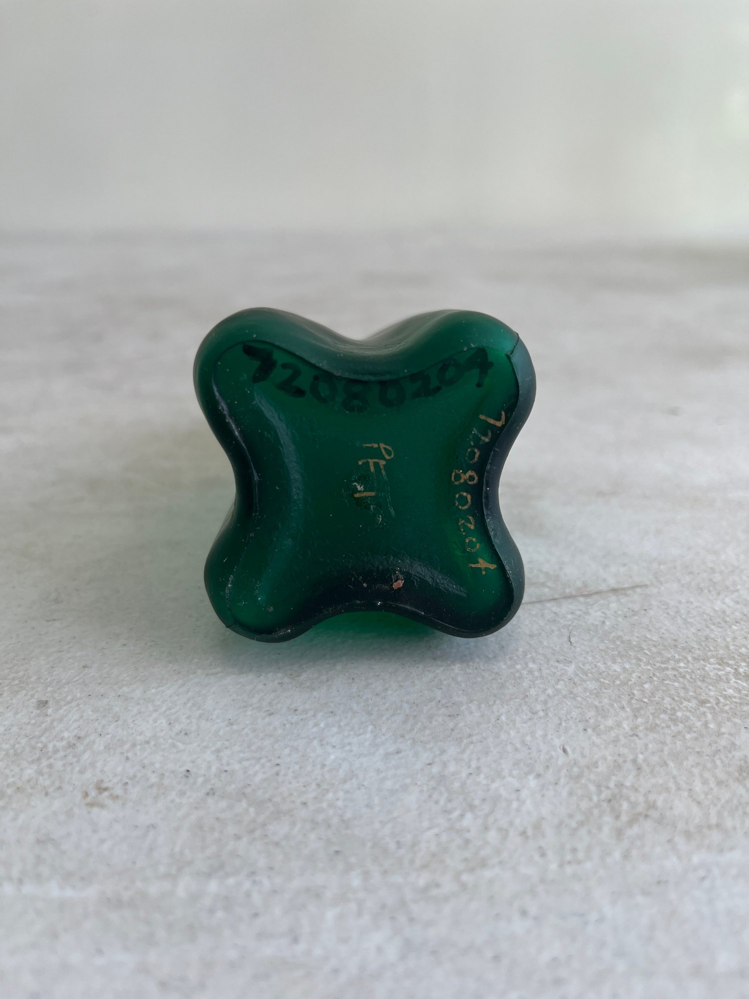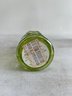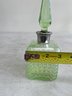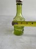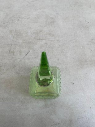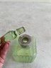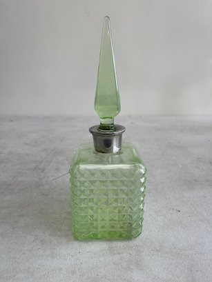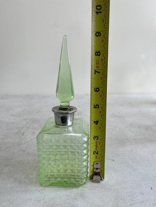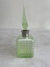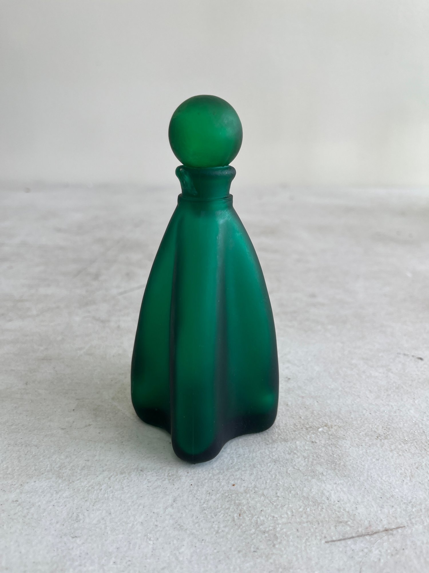 The ornate, lime-green bottle with a spherical cap is a vintage Avon Lemon Velvet Moisturized Friction Lotion Apothecary Decanter. It typically holds 8 fluid ounces and dates back to the 1970s. The minimalist, curved silhouette of the deep emerald-green glass with a luxurious satin finish captures the essence of mid-century design. Finally, the distinctive, square-shaped decanter in a pale green, features an eye-catching, all-over diamond-point pattern.