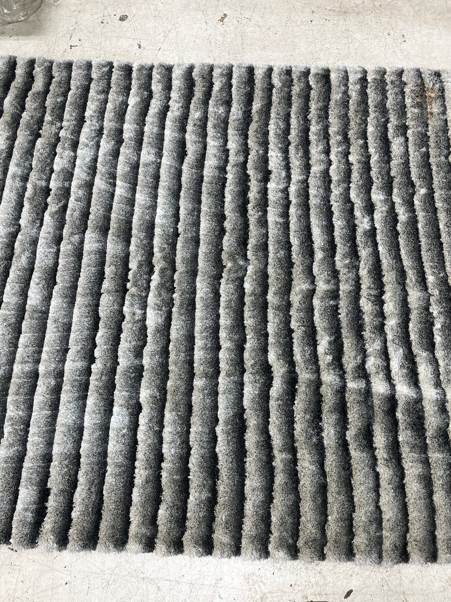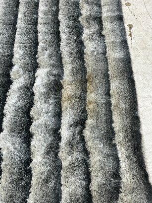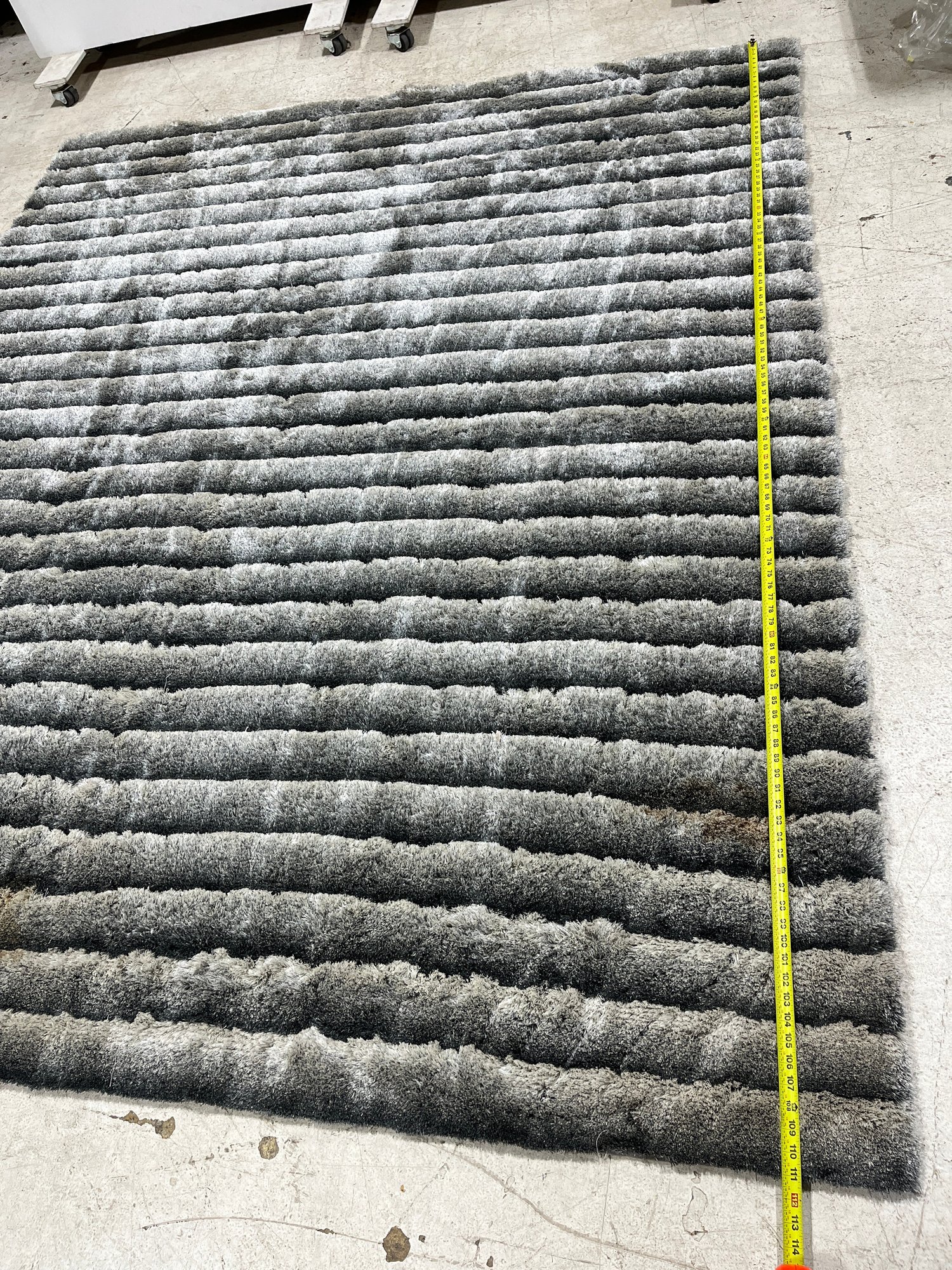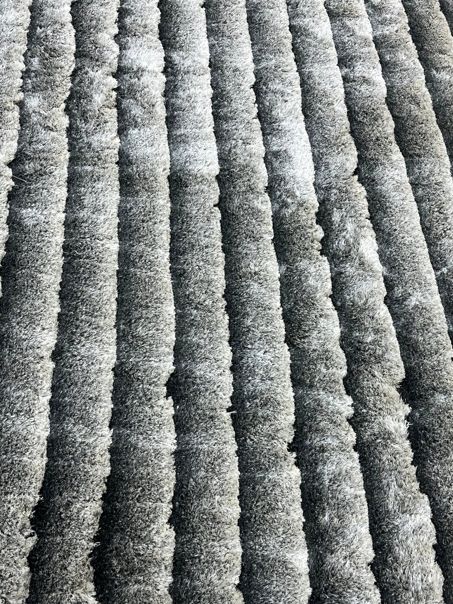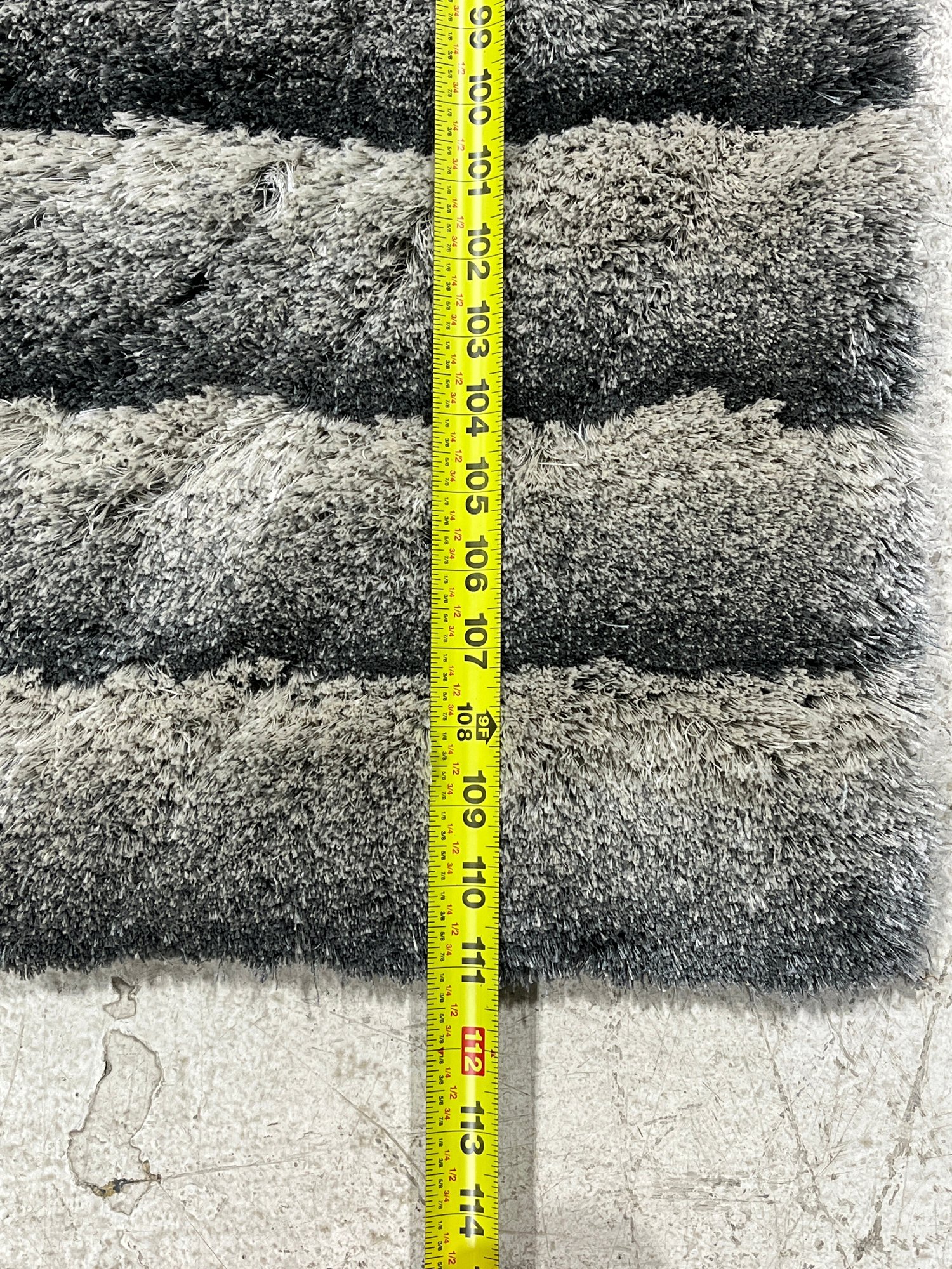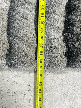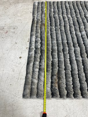 This shag area rug features a luxurious, high-pile surface crafted from plush synthetic fibers designed to mimic the softness of genuine fur. Its distinctive raked texture is defined by deep, horizontal channels that create a rhythmic, three-dimensional striped effect across the charcoal and silver-grey gradient. The thick pile offers an exceptionally soft underfoot experience, blending modern architectural lines with a cozy, organic aesthetic suitable for high-traffic living spaces or bedrooms.