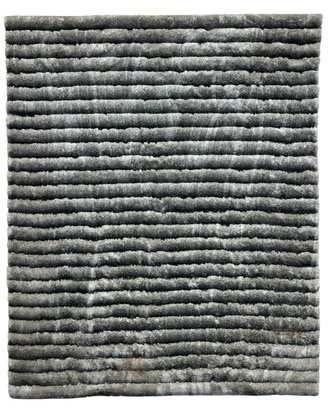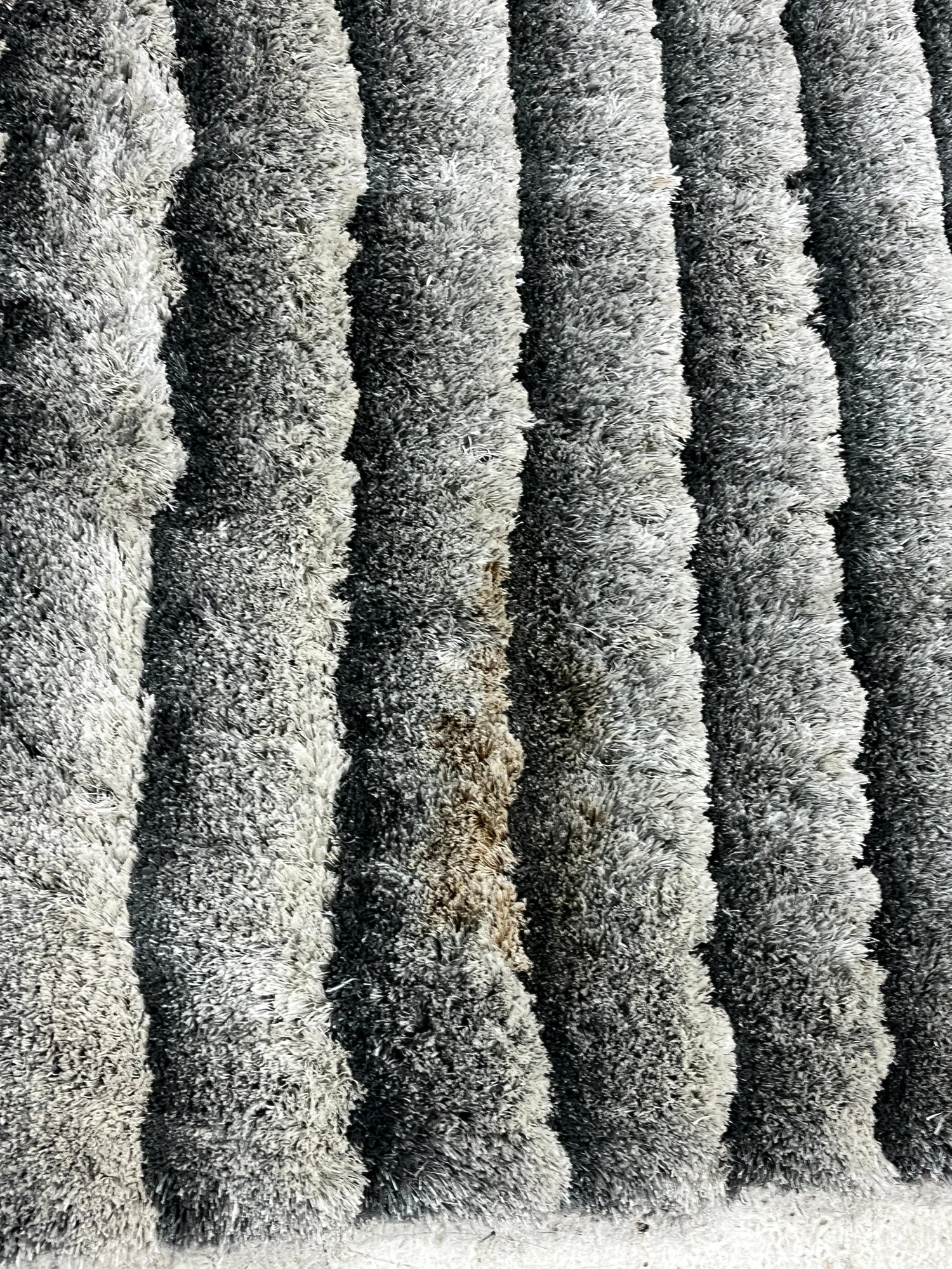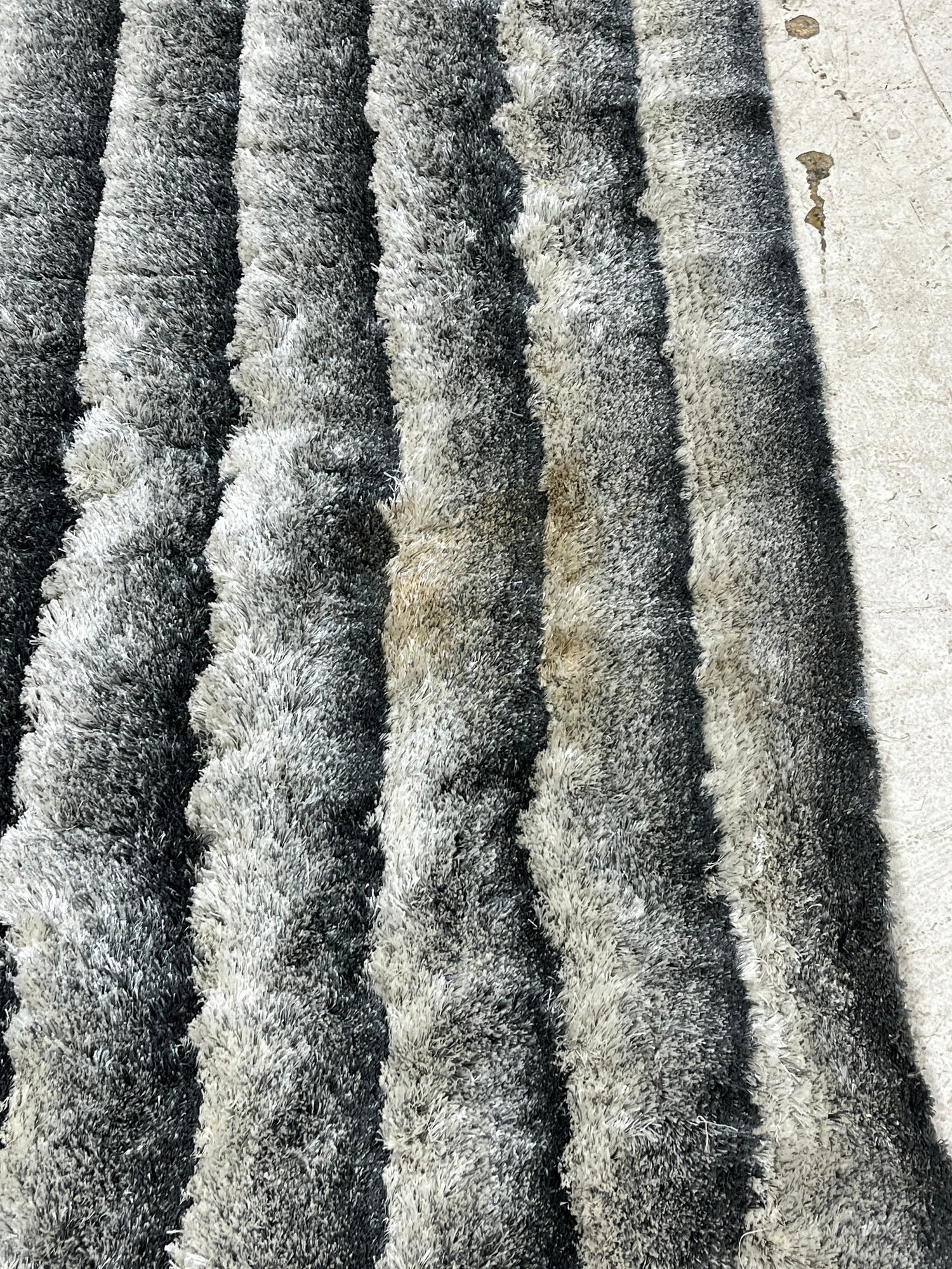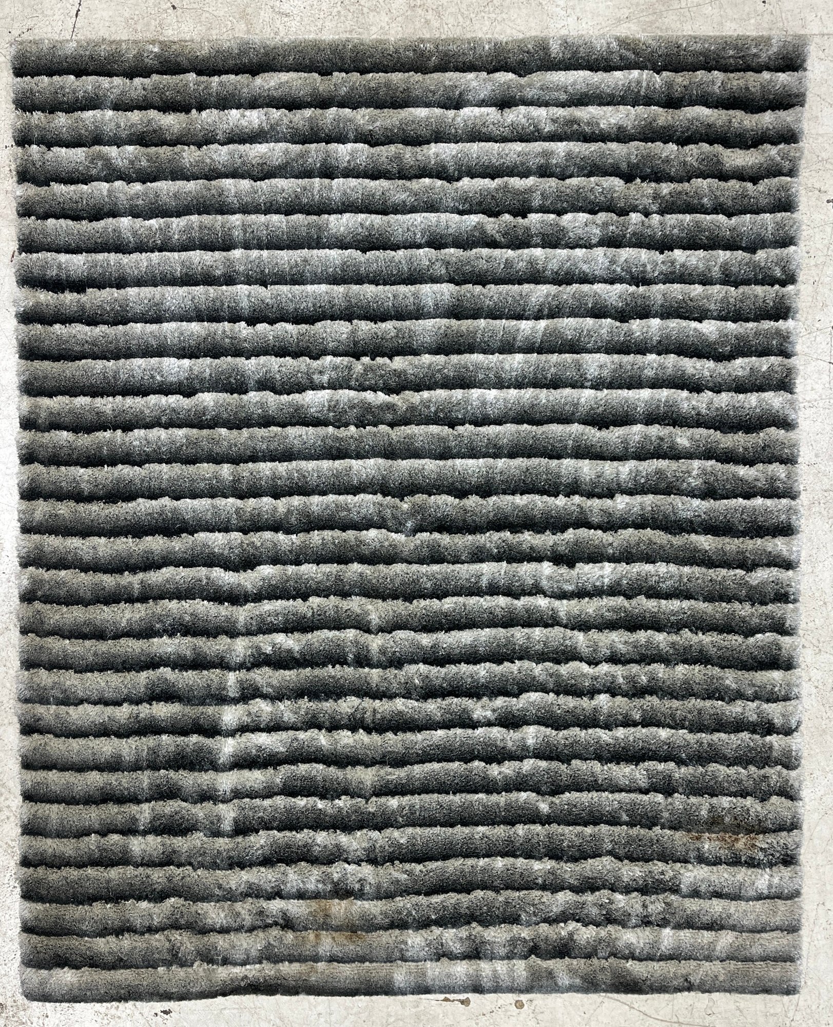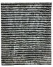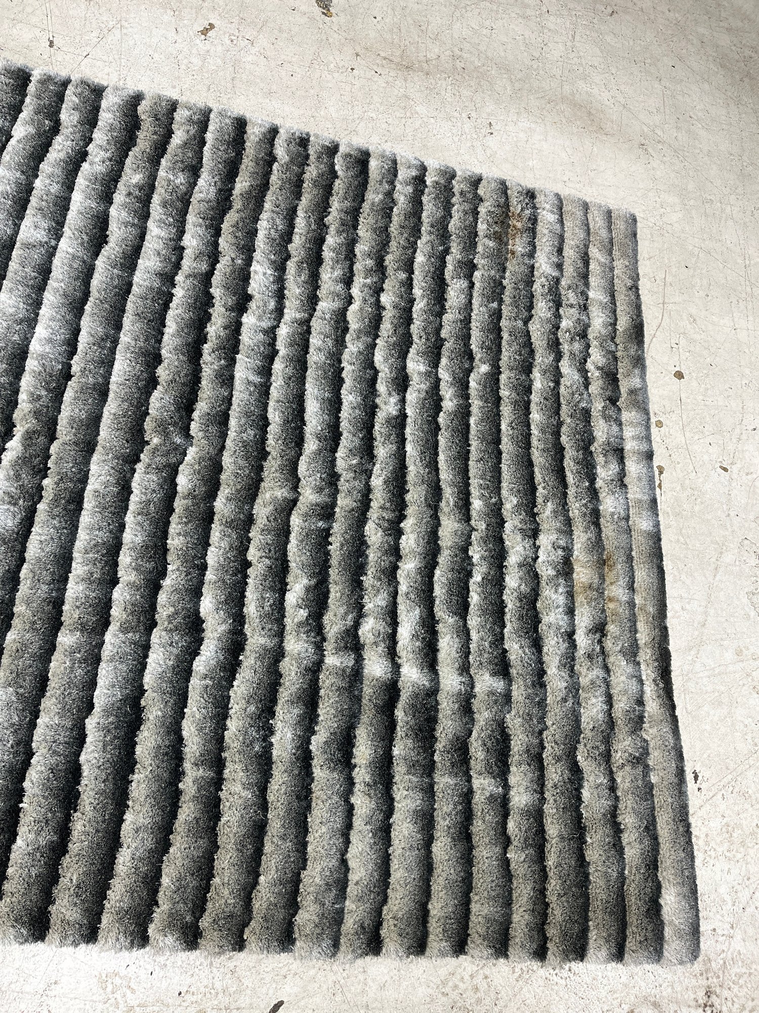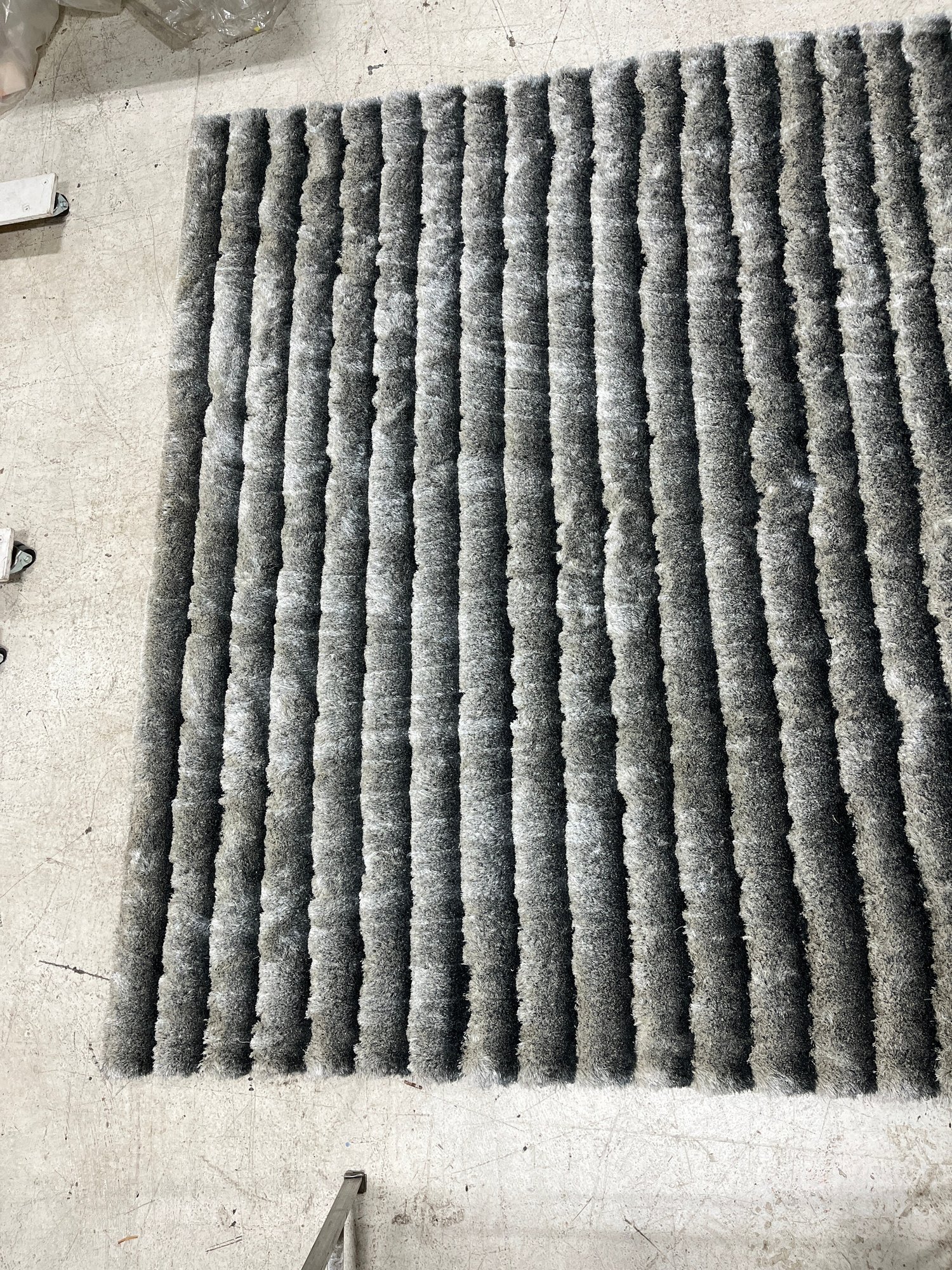 This shag area rug features a luxurious, high-pile surface crafted from plush synthetic fibers designed to mimic the softness of genuine fur. Its distinctive raked texture is defined by deep, horizontal channels that create a rhythmic, three-dimensional striped effect across the charcoal and silver-grey gradient. The thick pile offers an exceptionally soft underfoot experience, blending modern architectural lines with a cozy, organic aesthetic suitable for high-traffic living spaces or bedrooms.