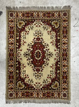 A beautiful example of traditional design, this rug balances a serene, neutral field with a vibrant, intricate centerpiece to create a focal point that is both sophisticated and inviting.