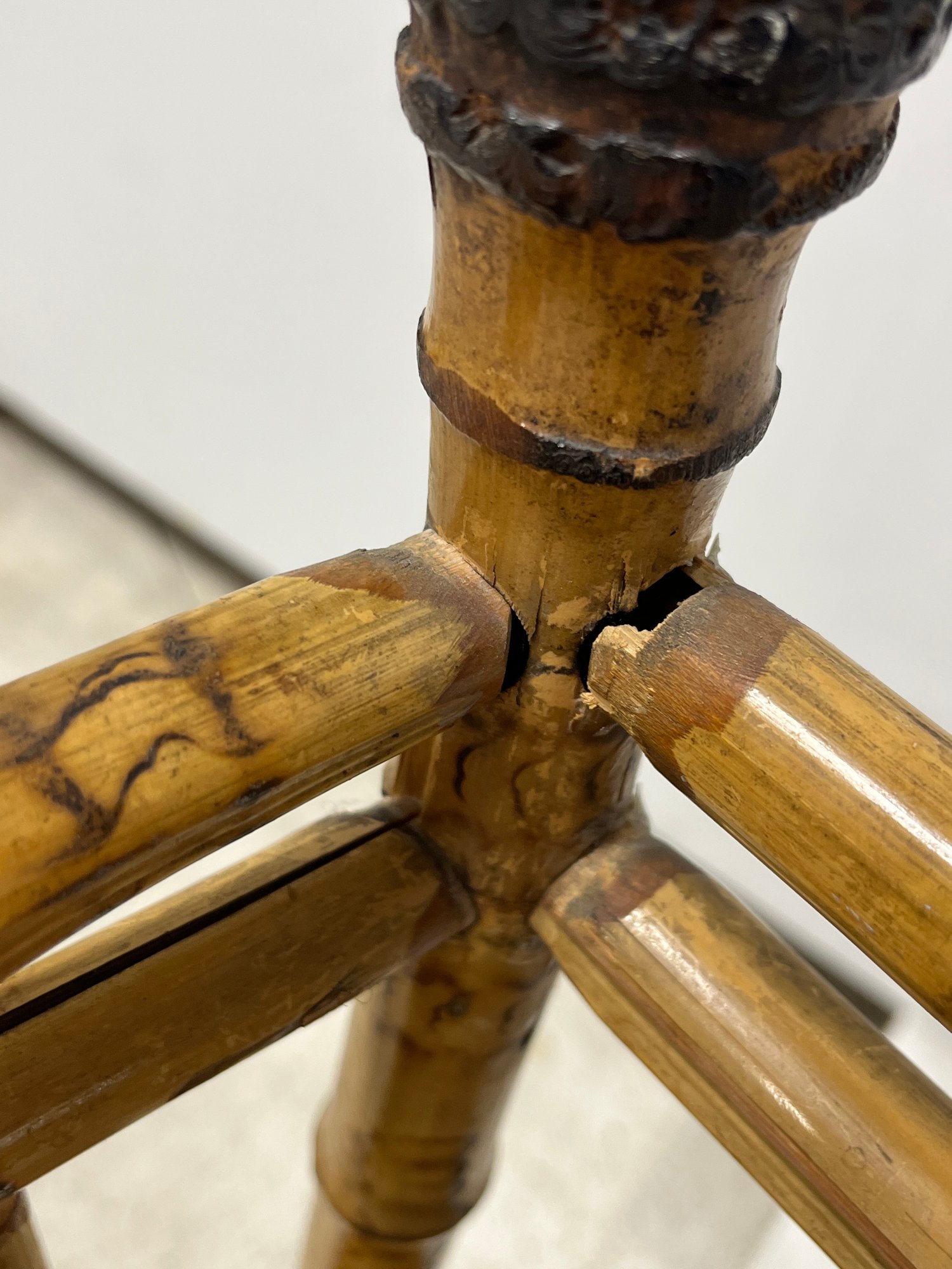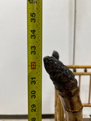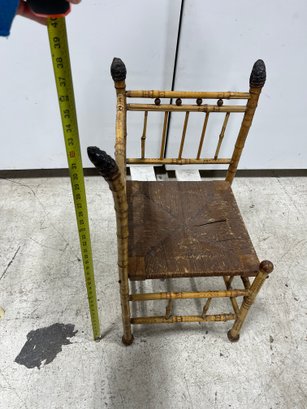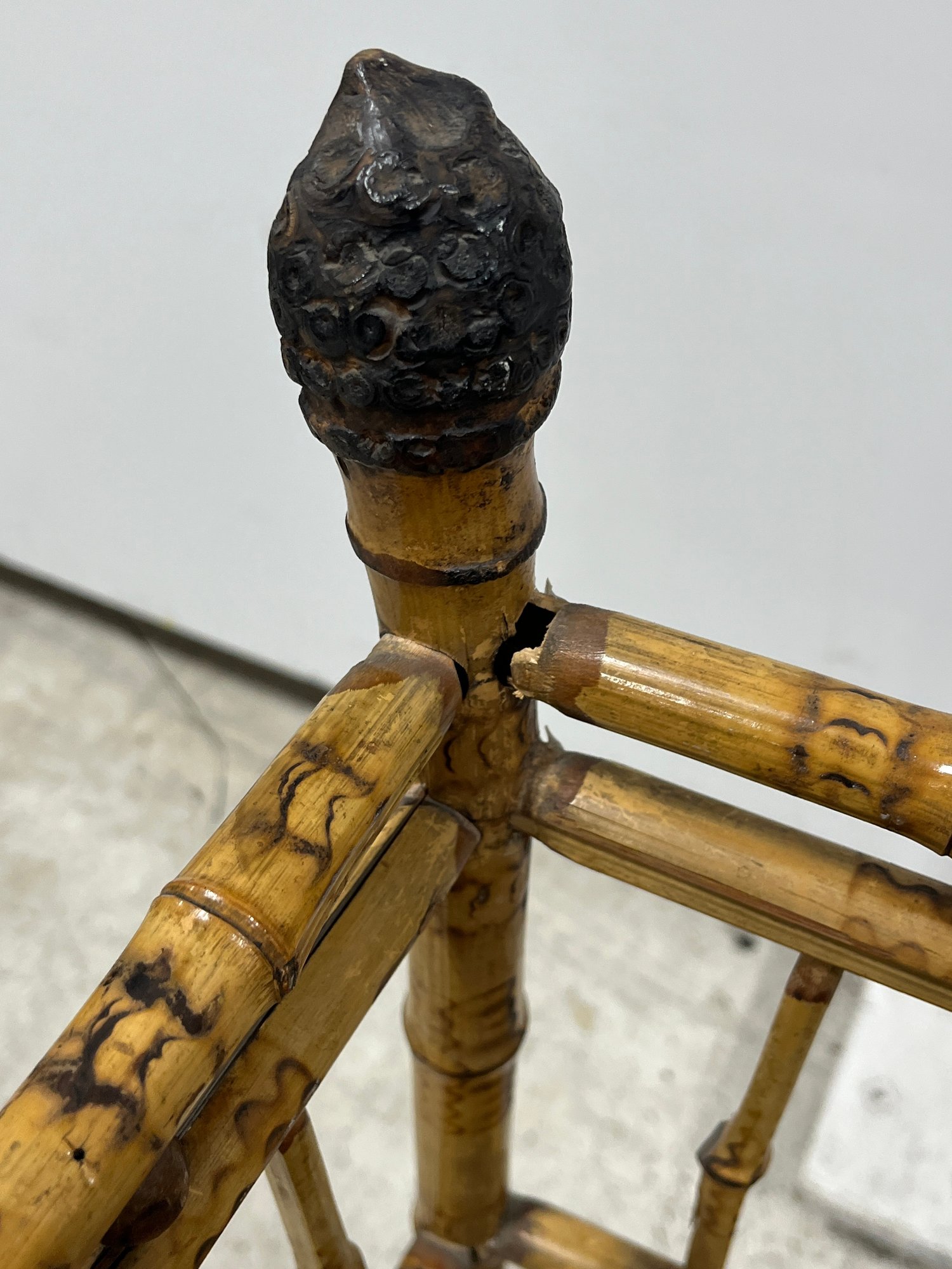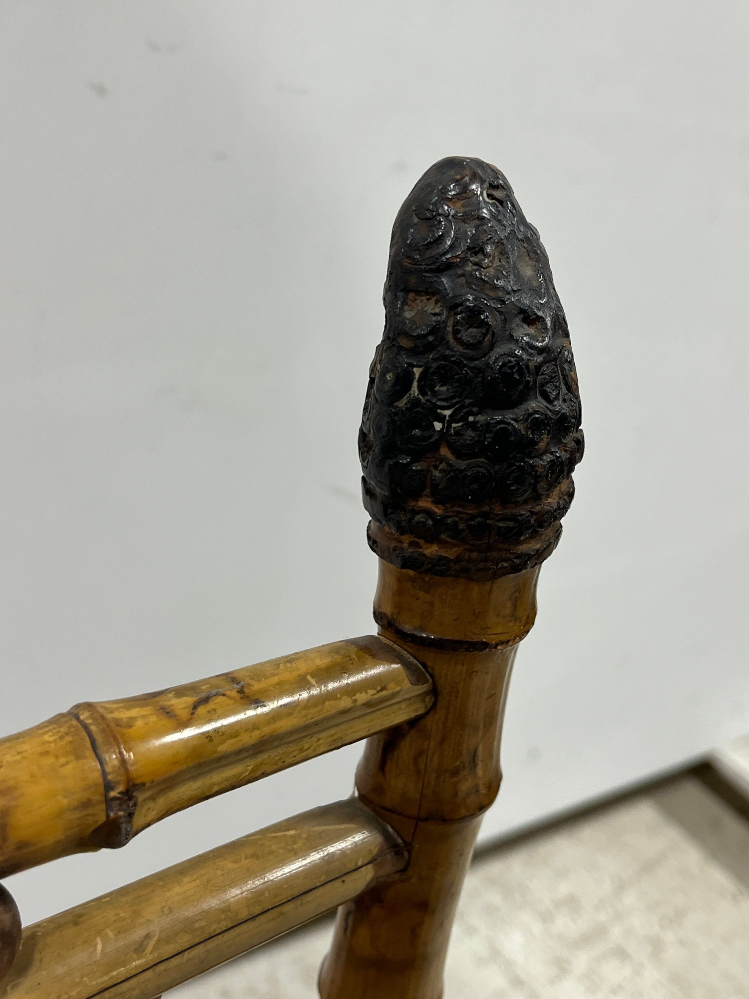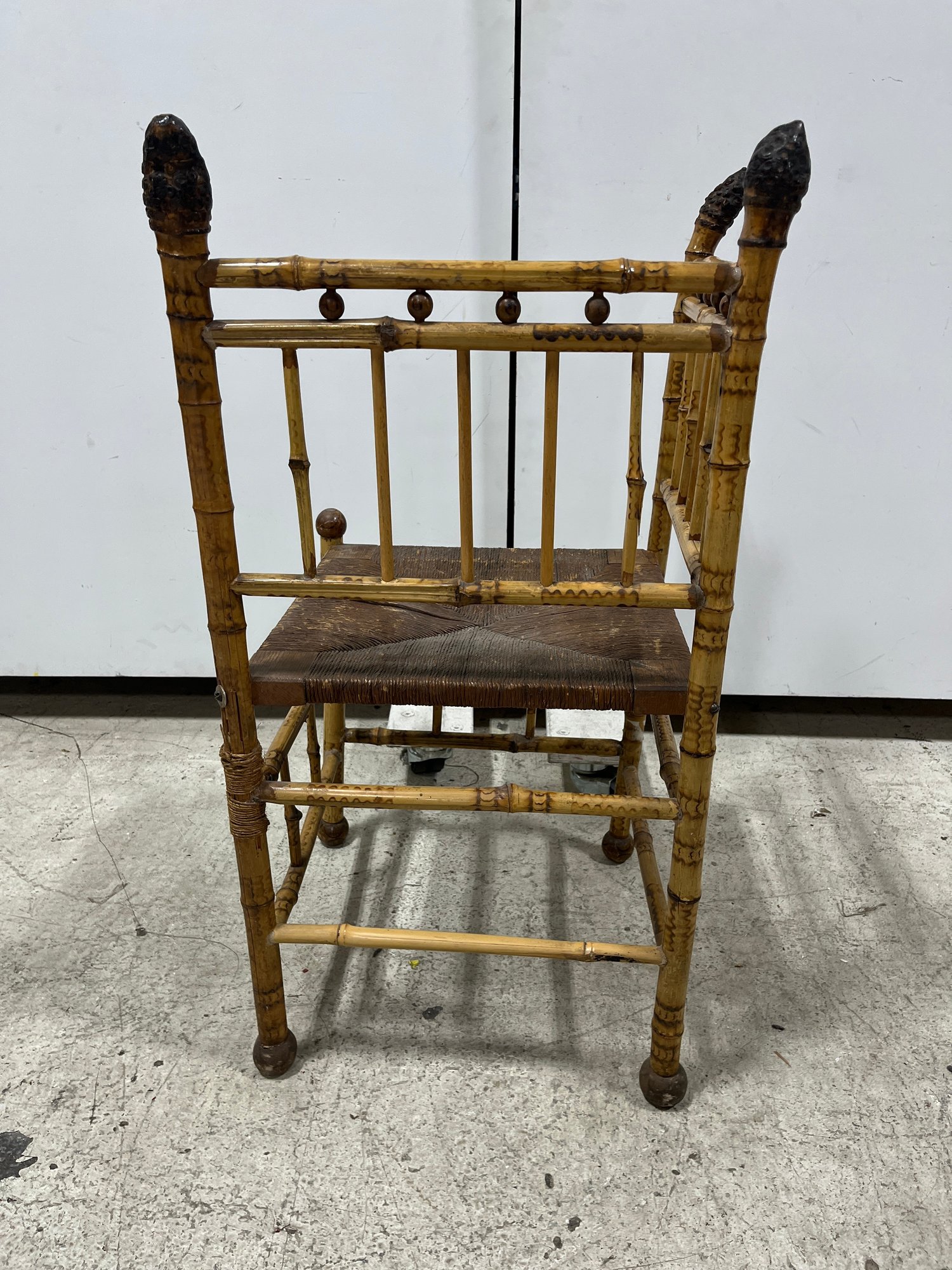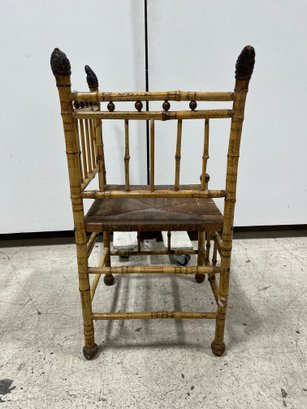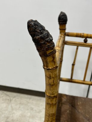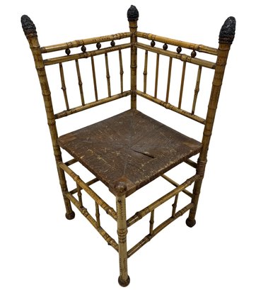A fine example of late 19th-century bamboo furniture, this corner-accent chair exemplifies the Victorian fascination with Exoticism and the Aesthetic Movement.