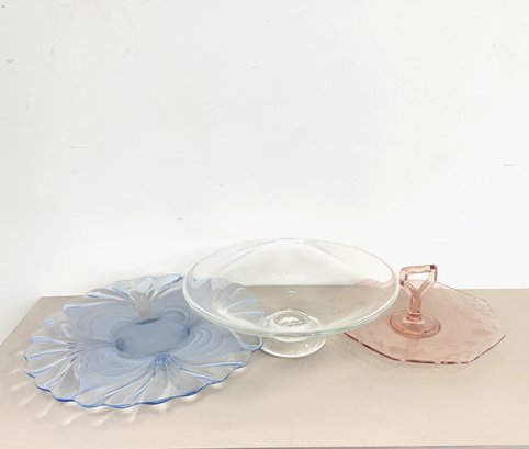 Vintage Cambridge Blue Footed Platter, Glass Pedestal Bowl & Pink Etched Platter (3-piece Set)