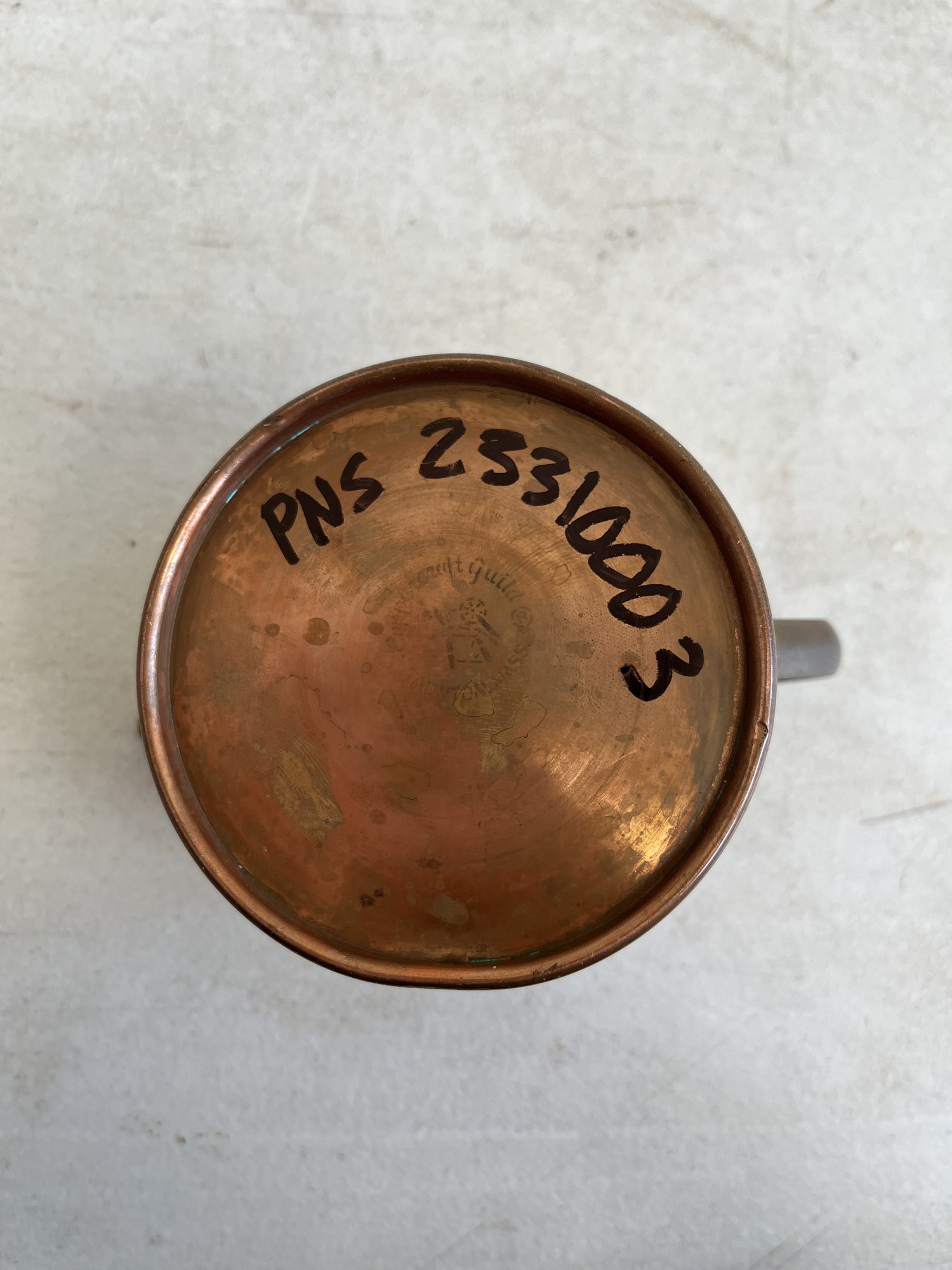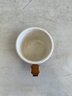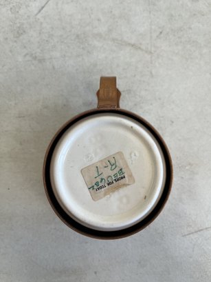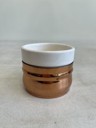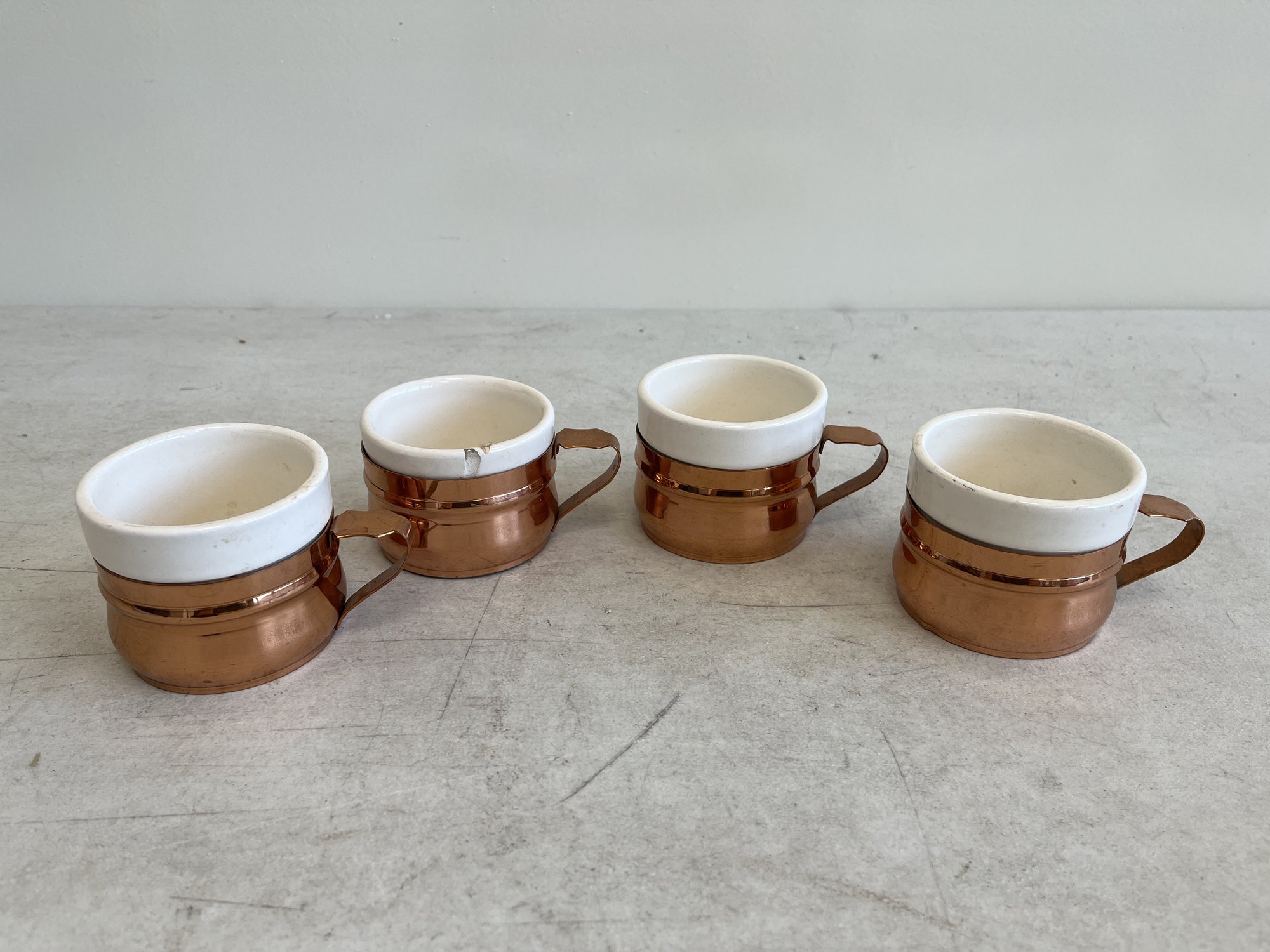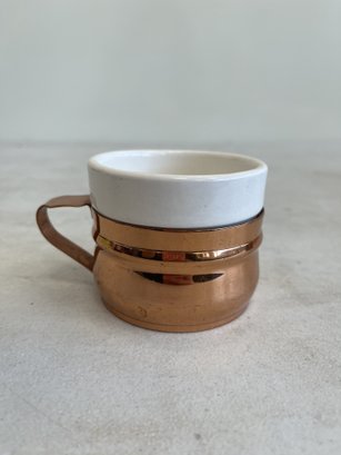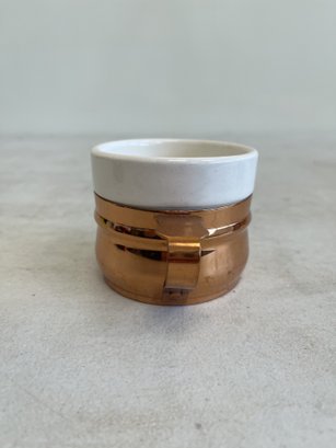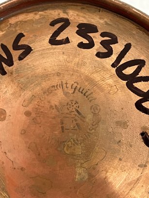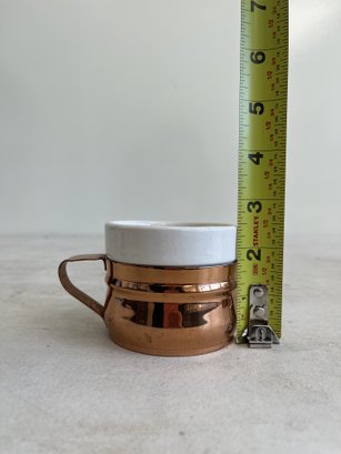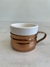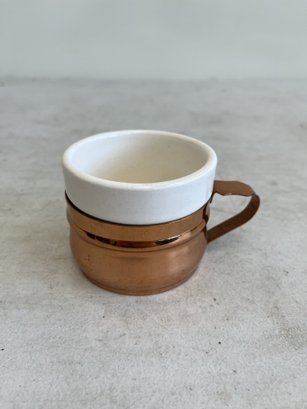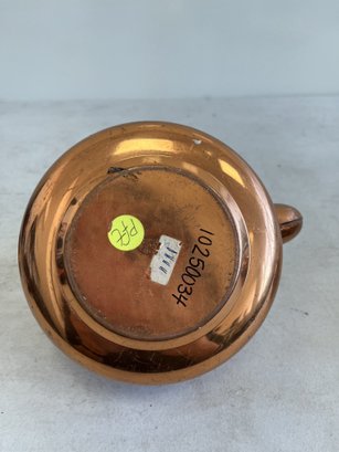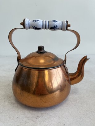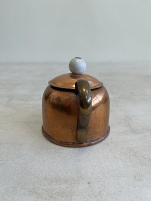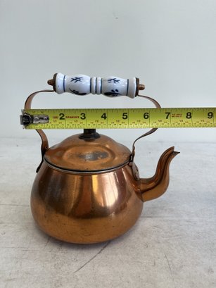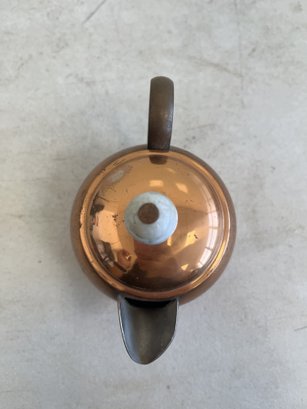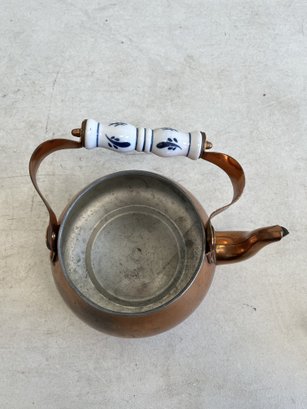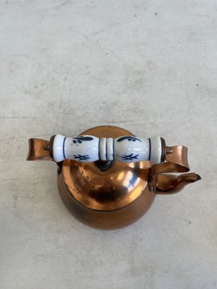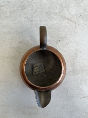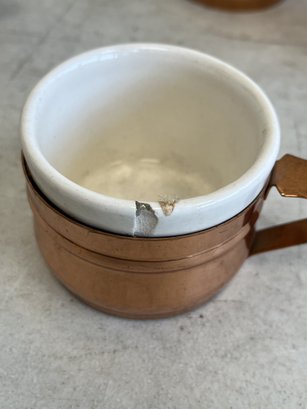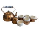 This lot includes (1) teapot, (4) cups with copper handles, (1) smaller cup with no copper handle, and (1) sugar bowl.