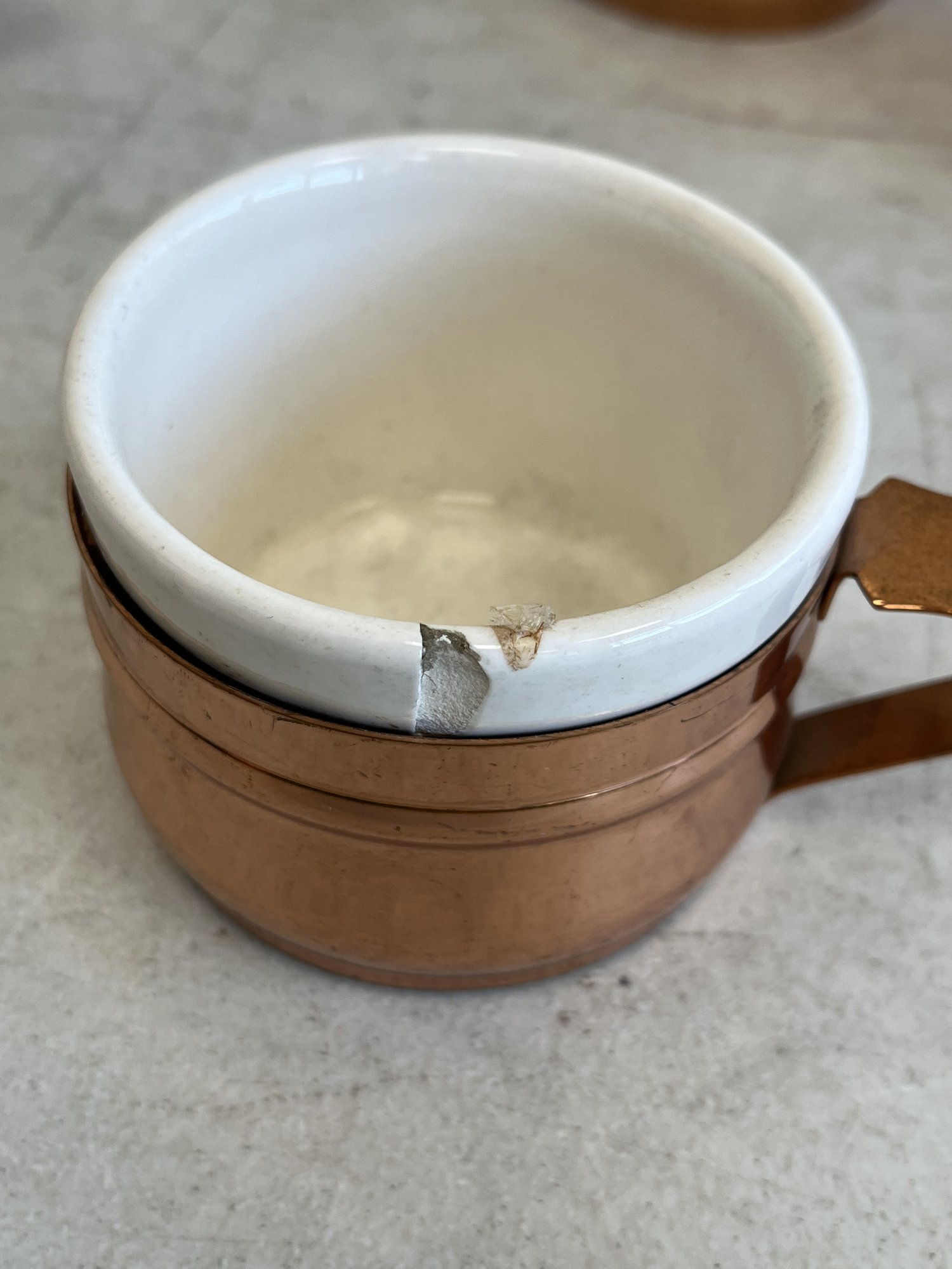 One of the cups is chipped on the rim.