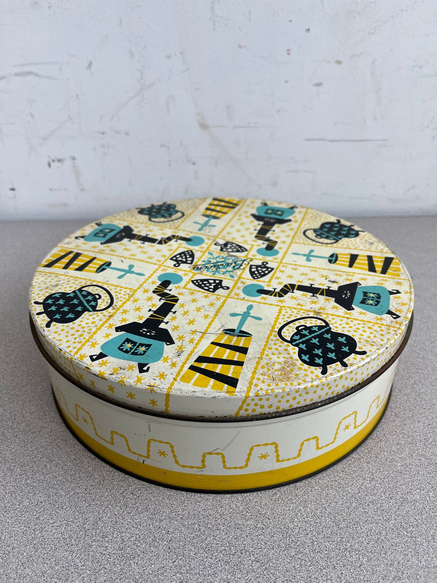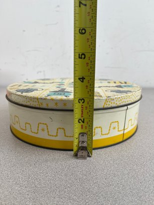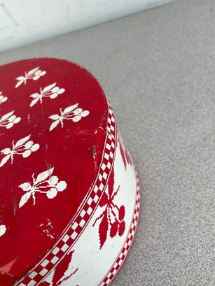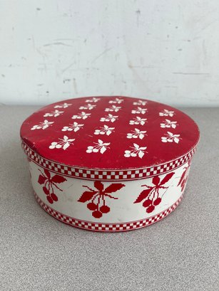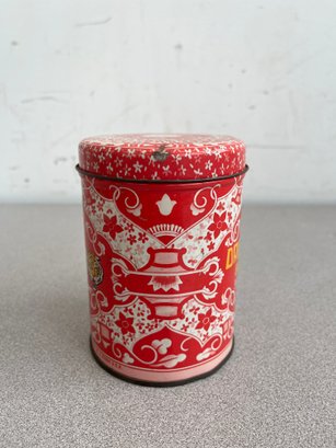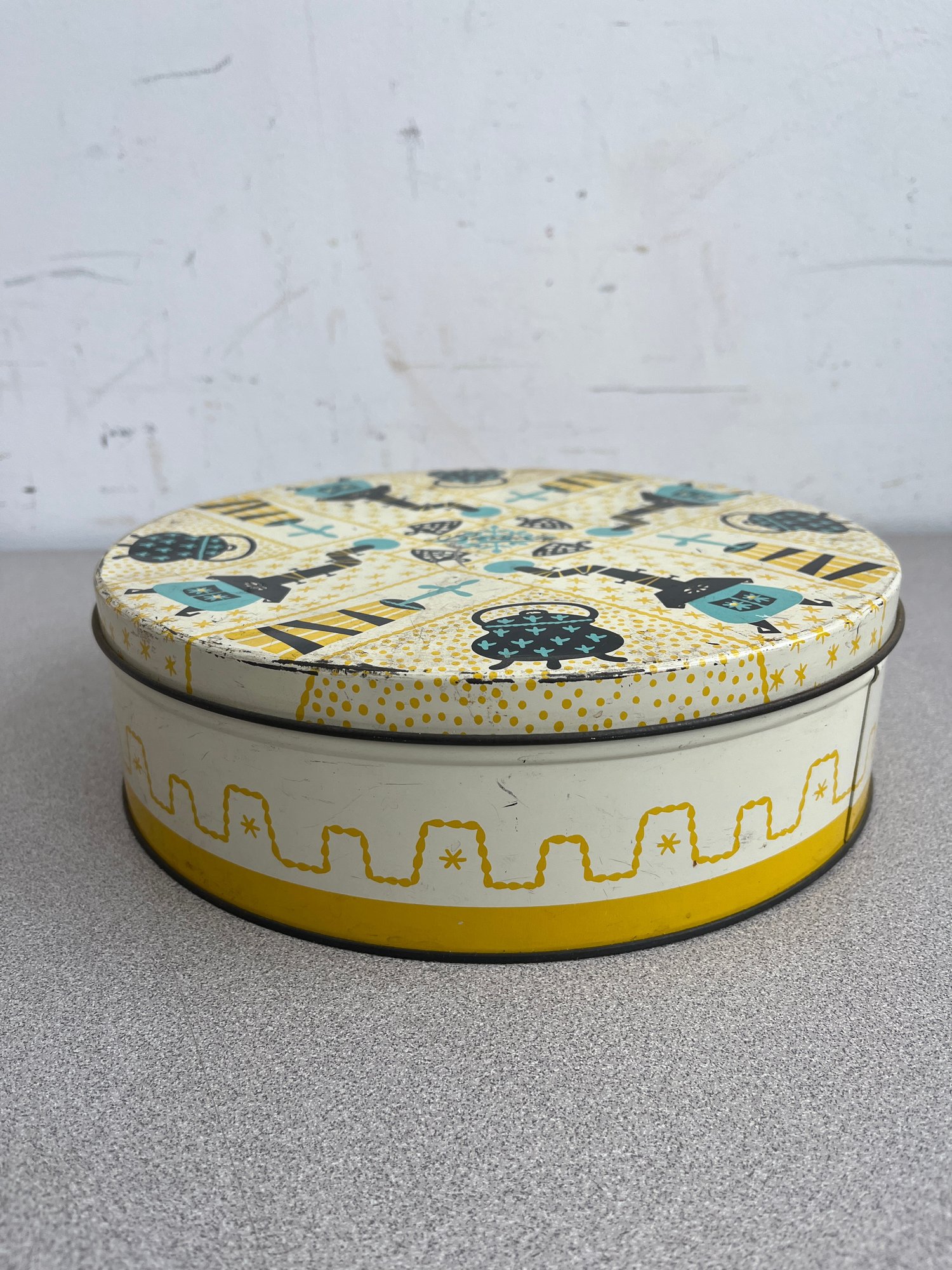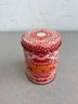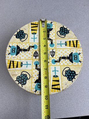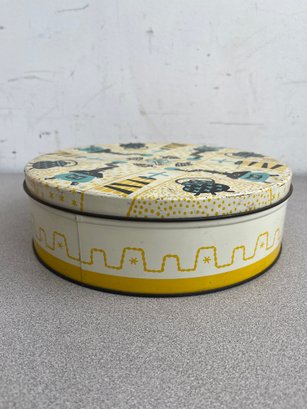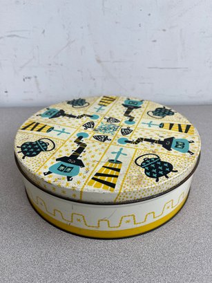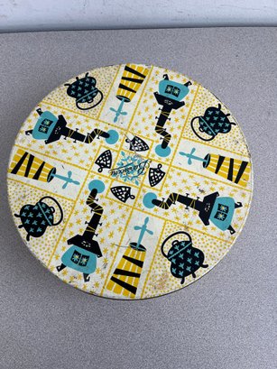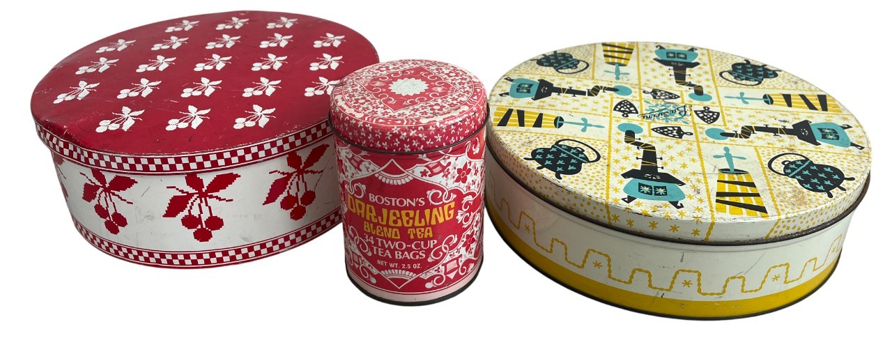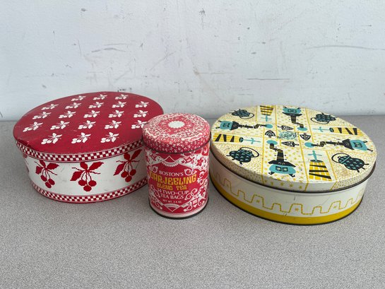 A vibrant three-piece assembly of mid-century lithographed metal tins, representing a cross-section of 1950s–1970s American kitchenware and "kitsch" branding. This lot features diverse geometries offering a cohesive yet varied display for collectors of vintage advertising or retro decor.