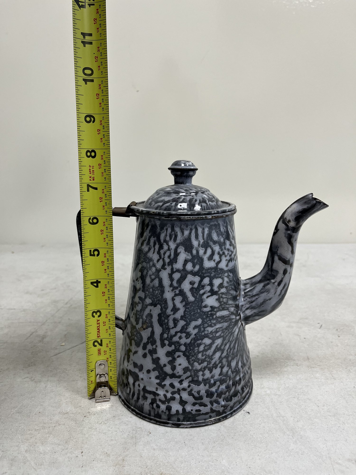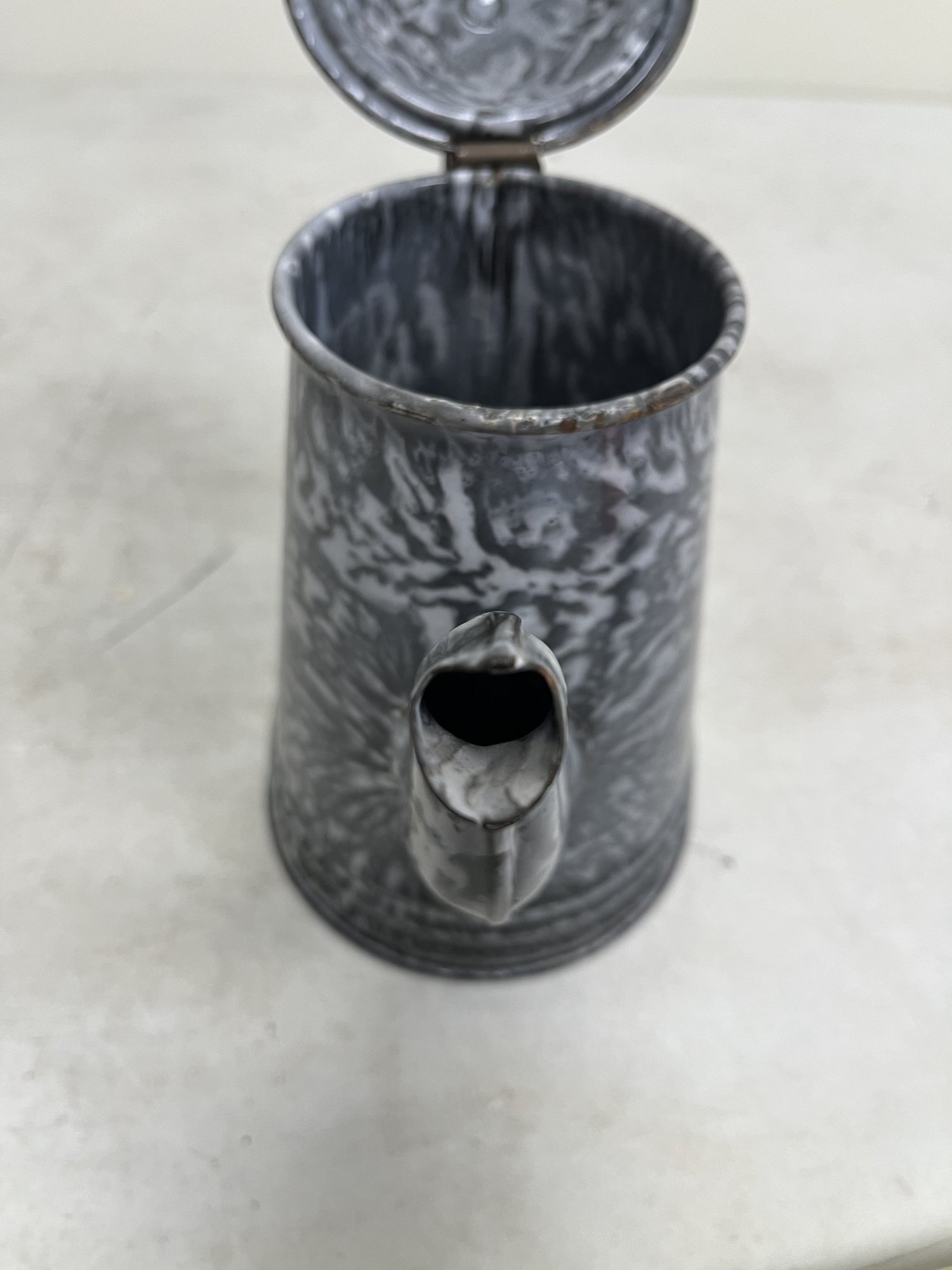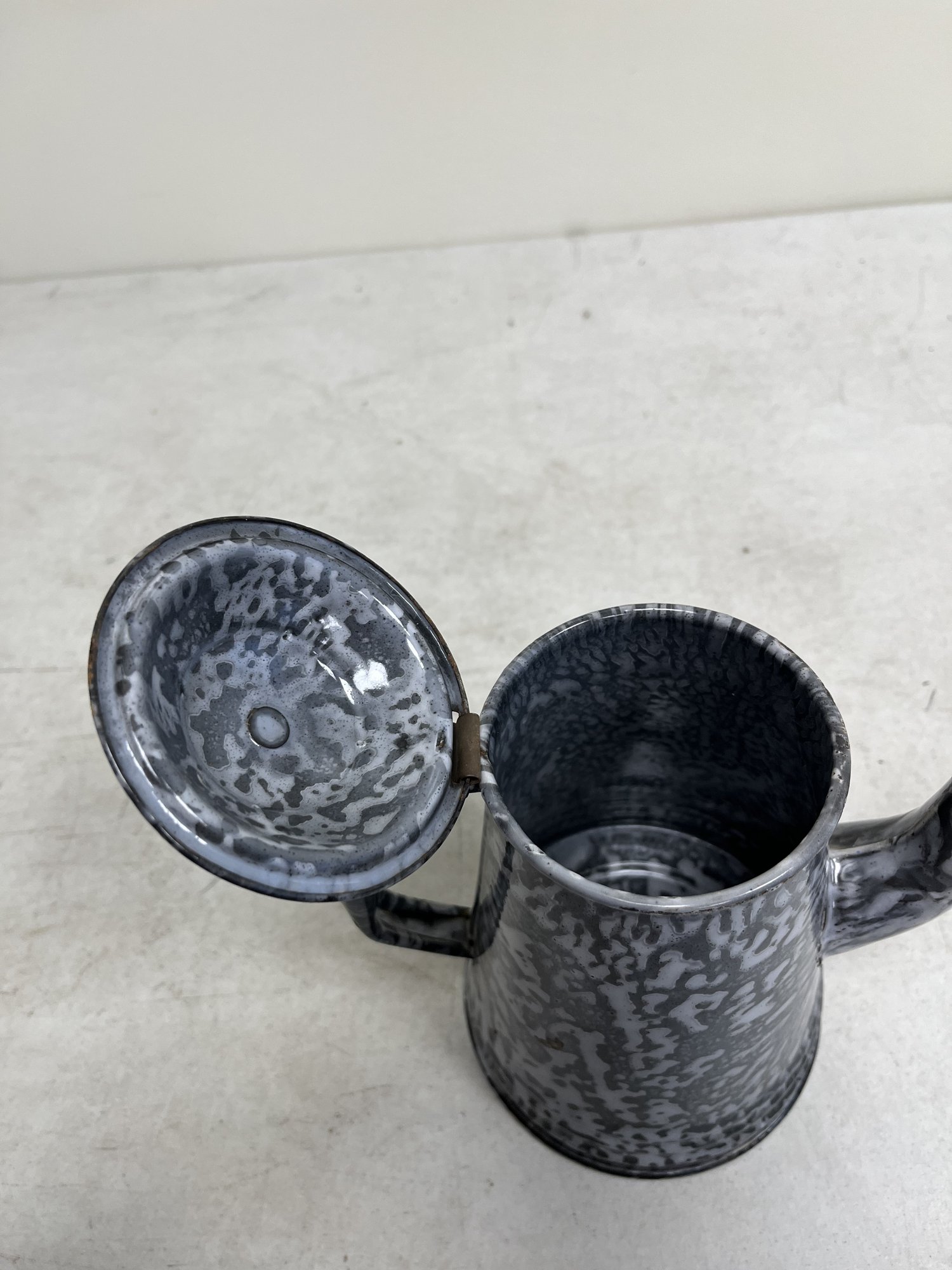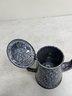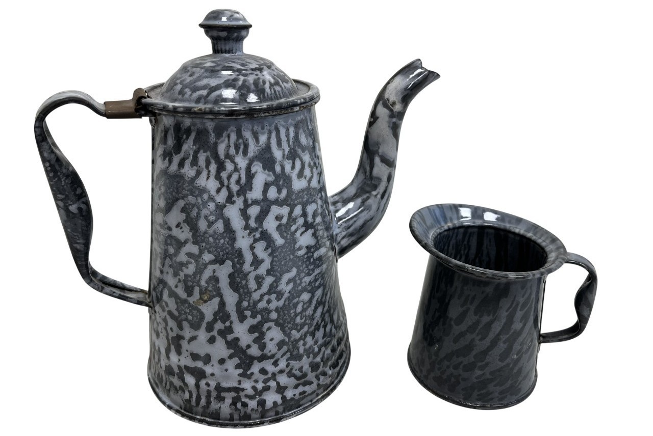 An elegant two-piece set of antique gray graniteware. This collection embodies rustic charm and historical utility, perfect for the discerning collector or as a distinctive accent for farmhouse-style decor.