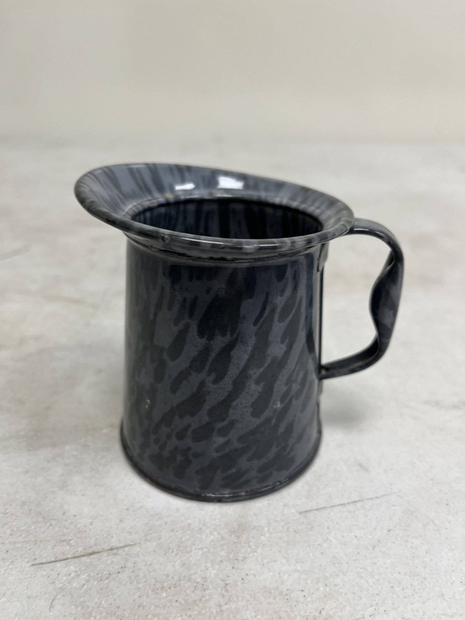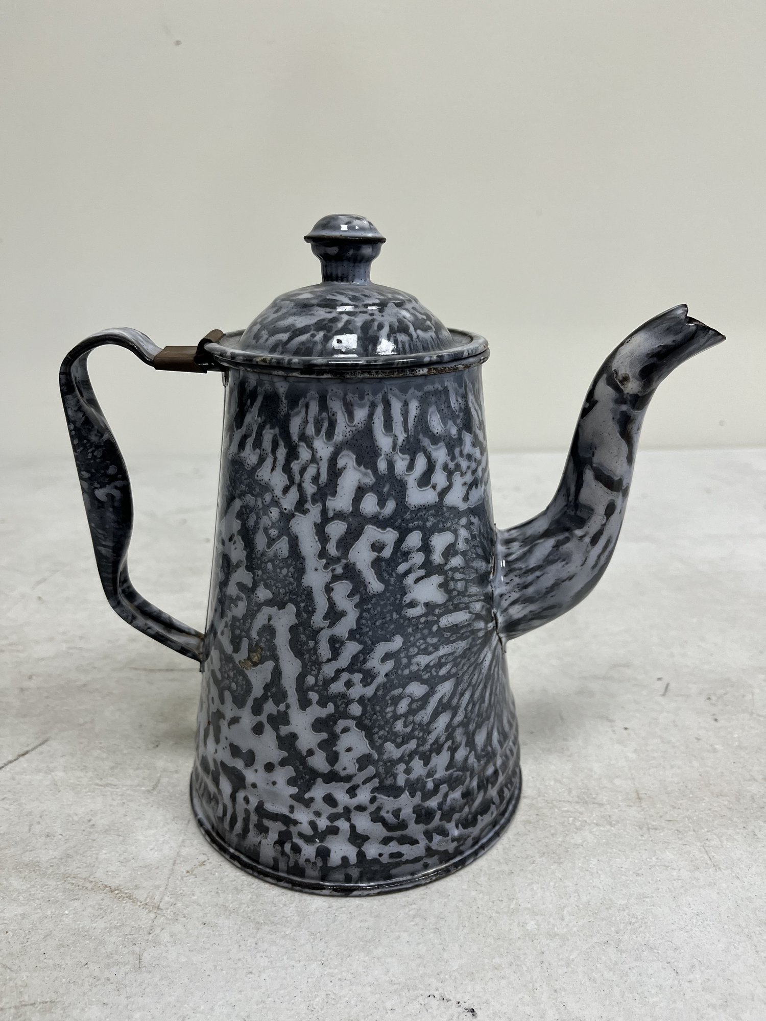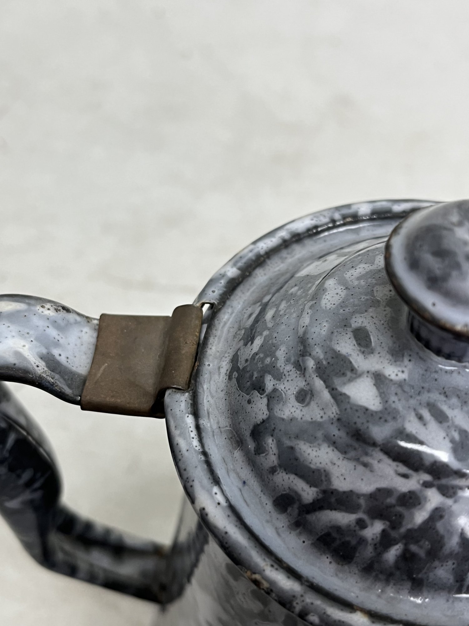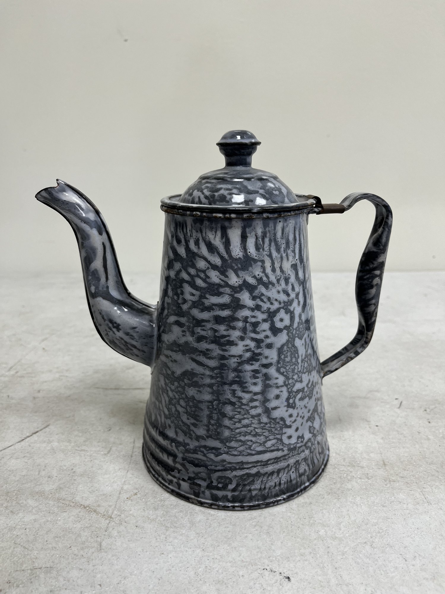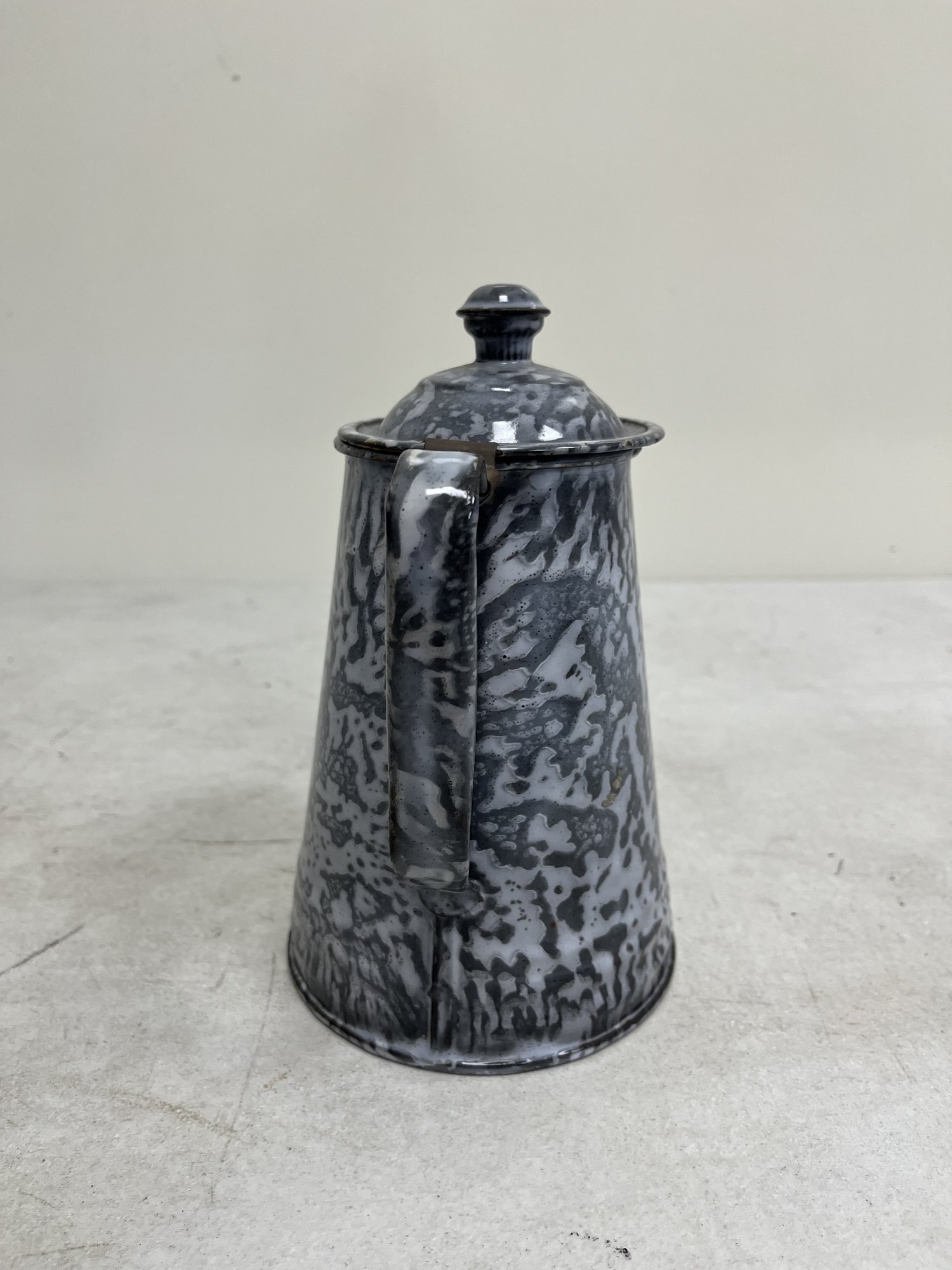 An elegant two-piece set of antique gray graniteware. This collection embodies rustic charm and historical utility, perfect for the discerning collector or as a distinctive accent for farmhouse-style decor.