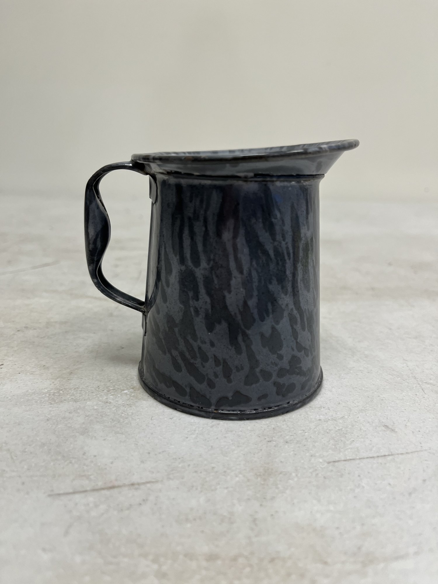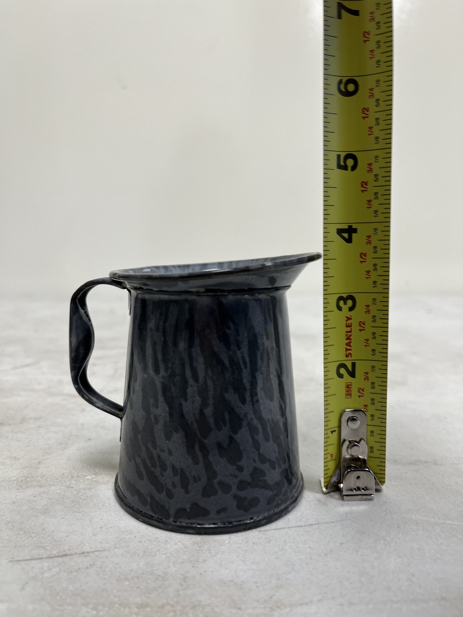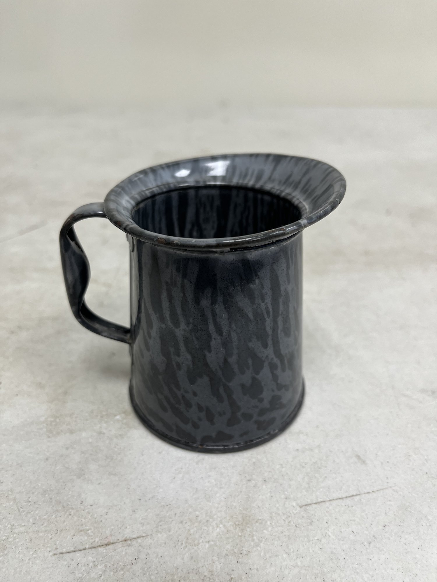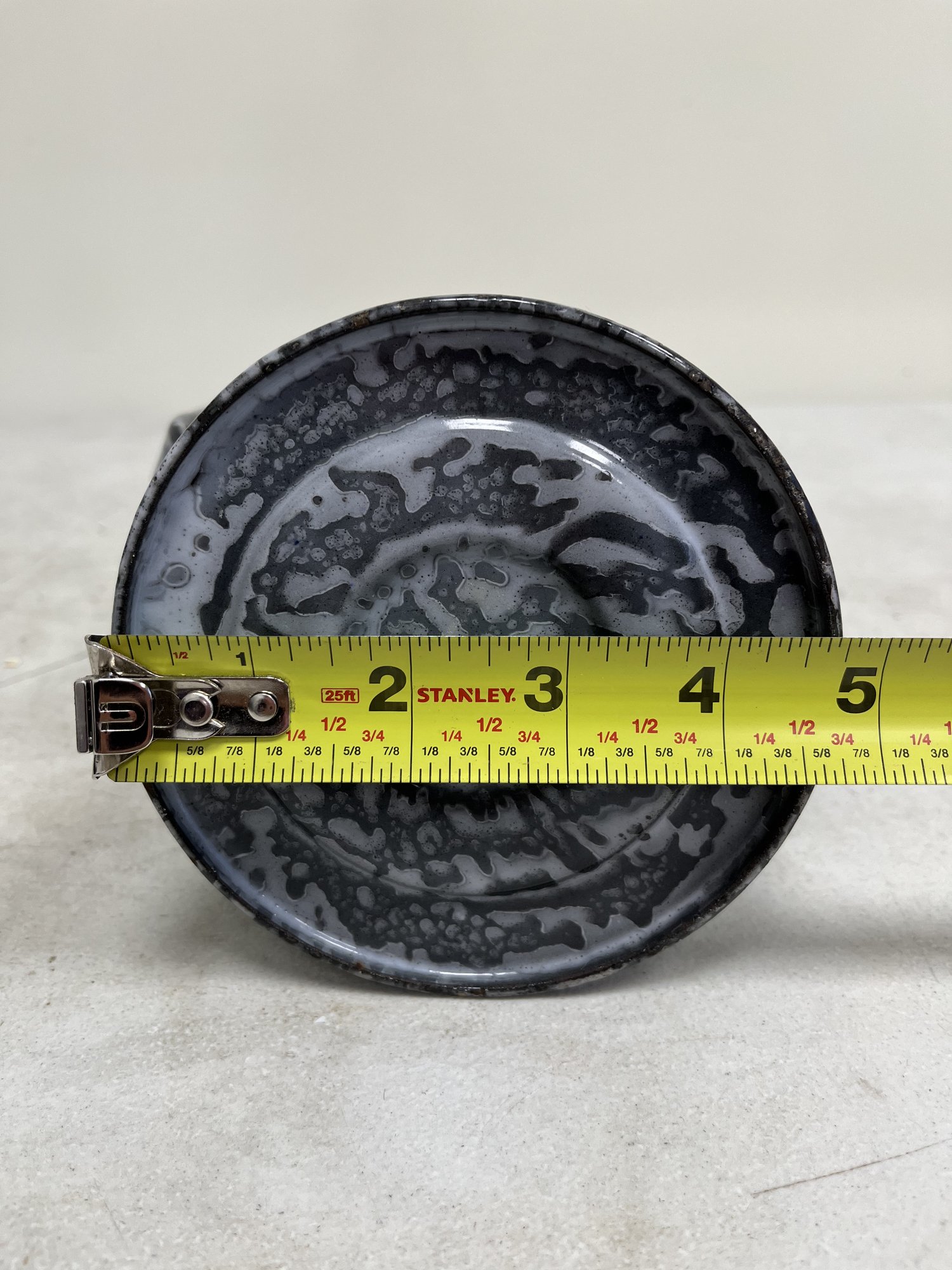 An elegant two-piece set of antique gray graniteware. This collection embodies rustic charm and historical utility, perfect for the discerning collector or as a distinctive accent for farmhouse-style decor.