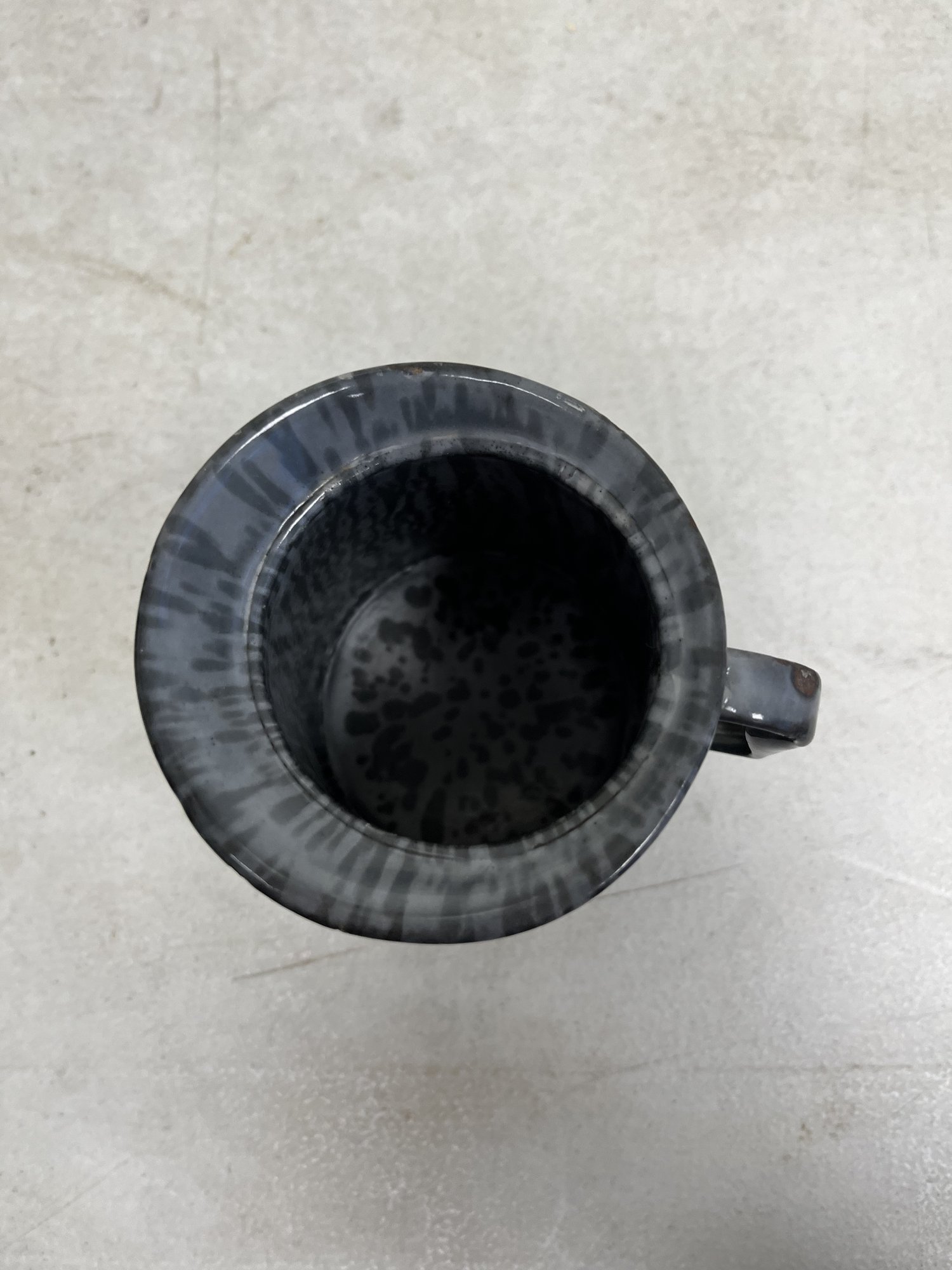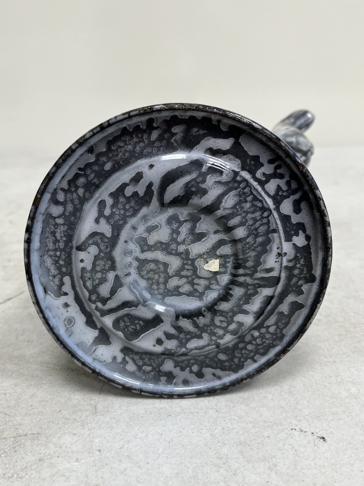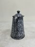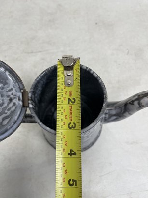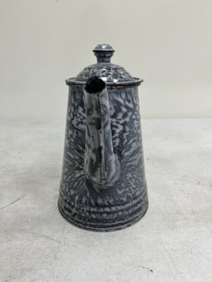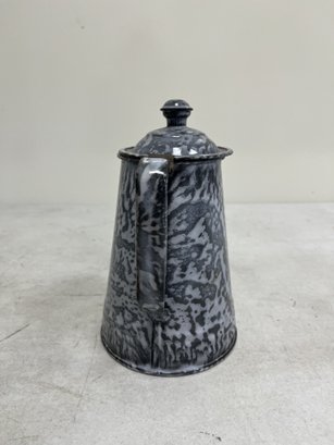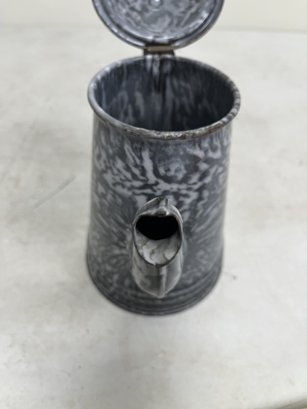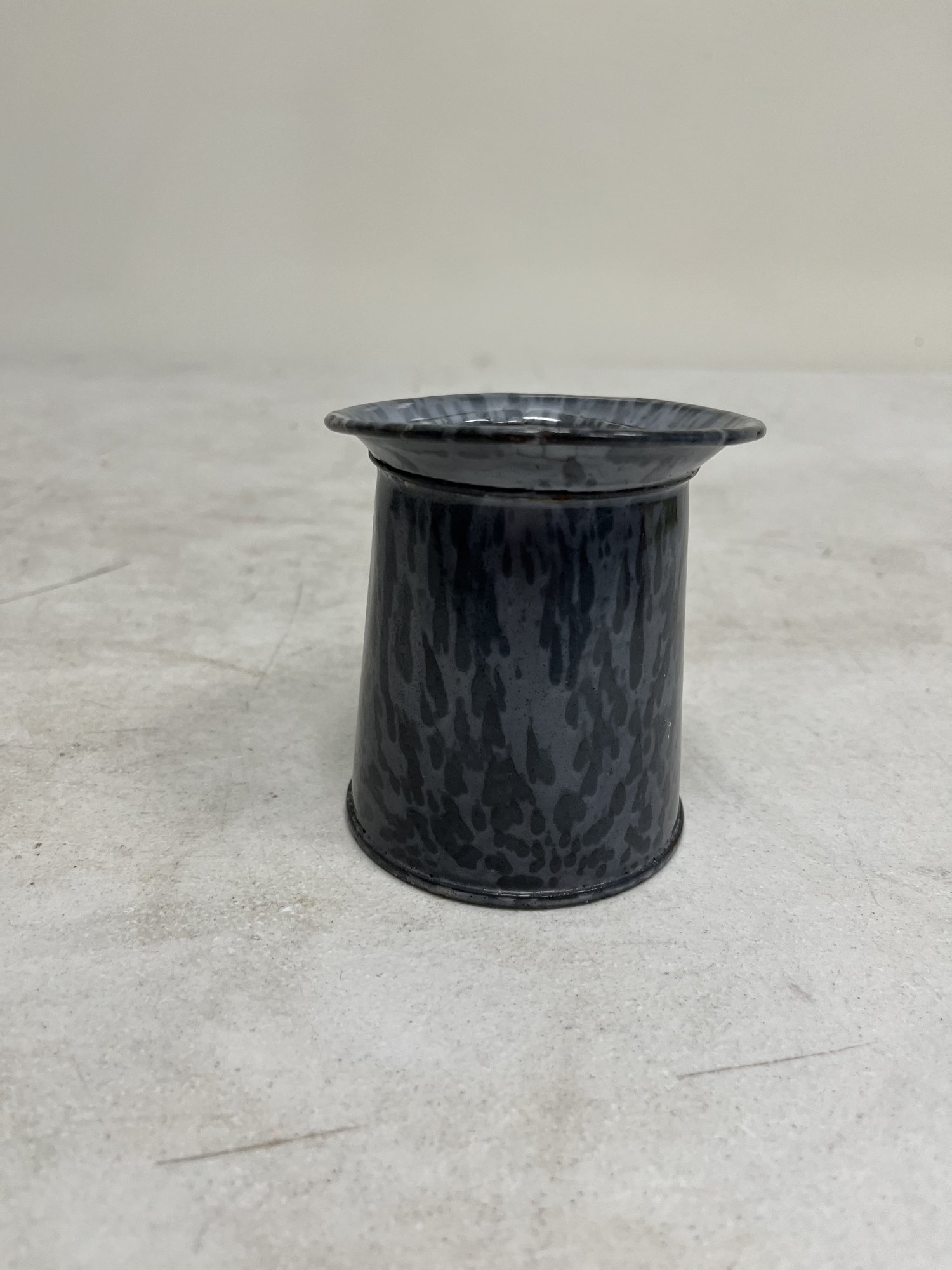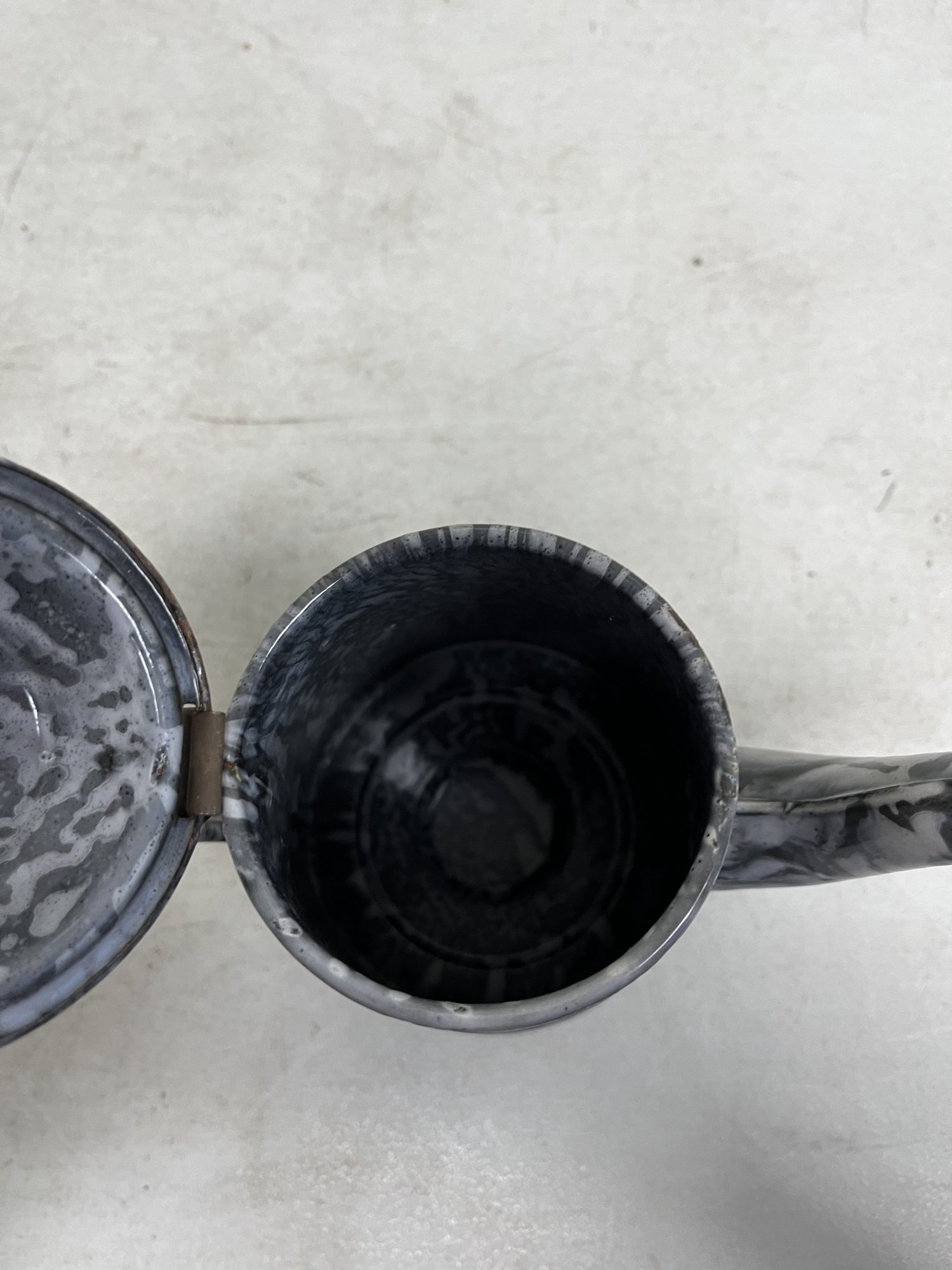 An elegant two-piece set of antique gray graniteware. This collection embodies rustic charm and historical utility, perfect for the discerning collector or as a distinctive accent for farmhouse-style decor.